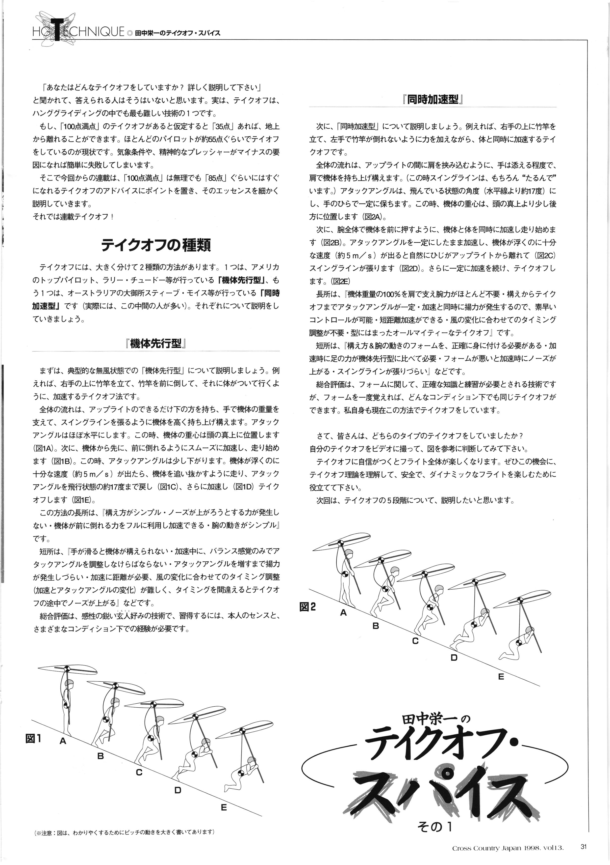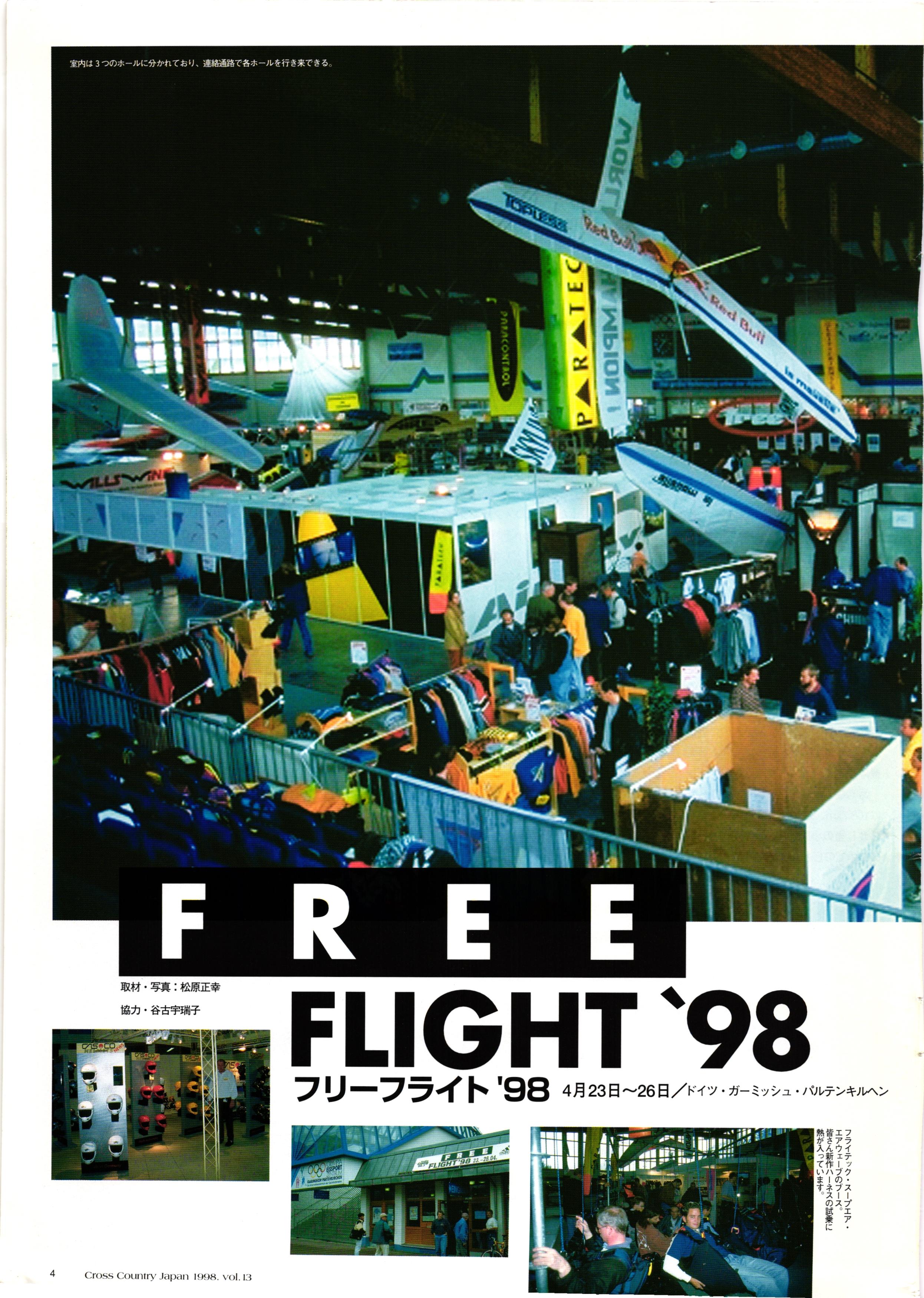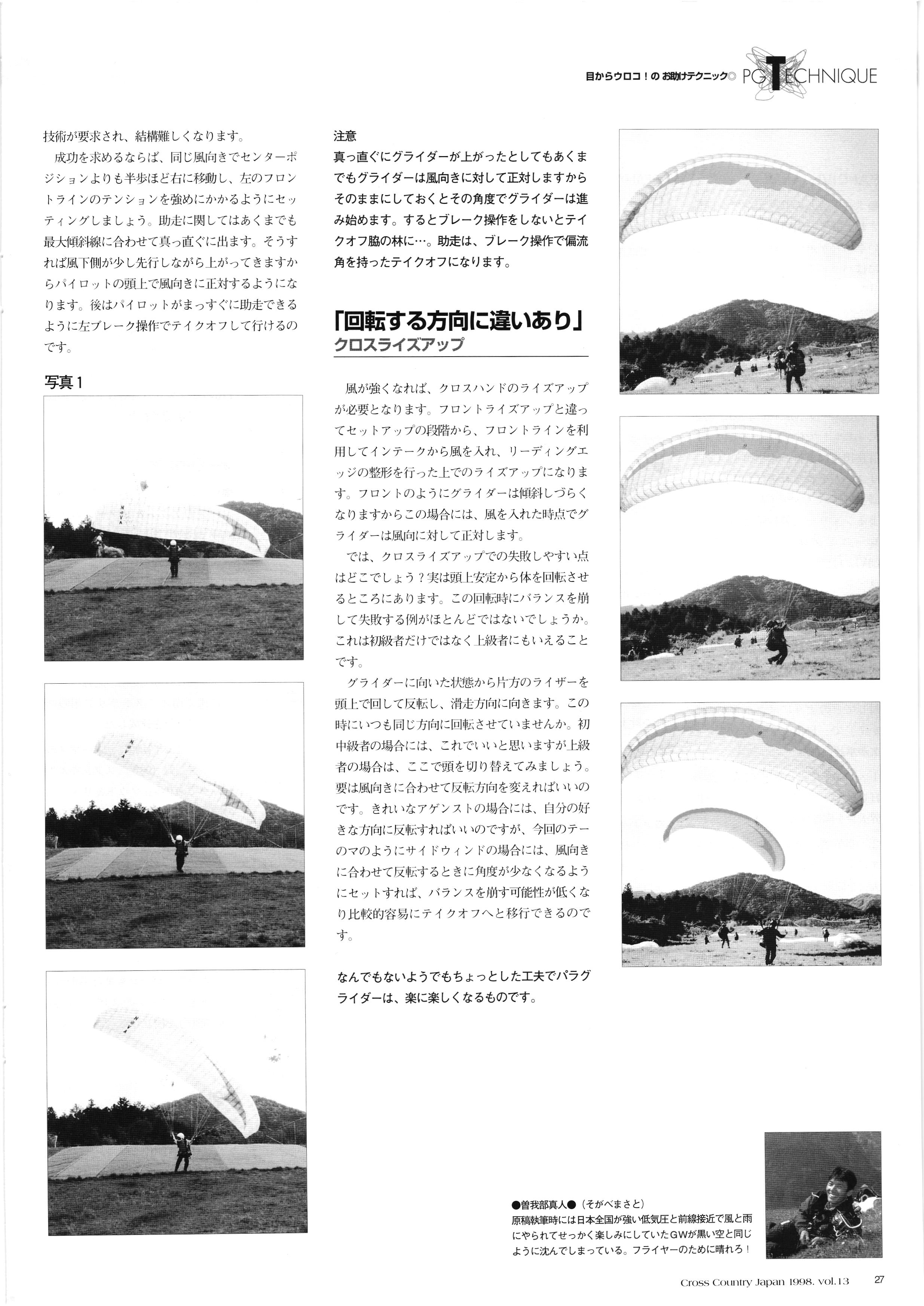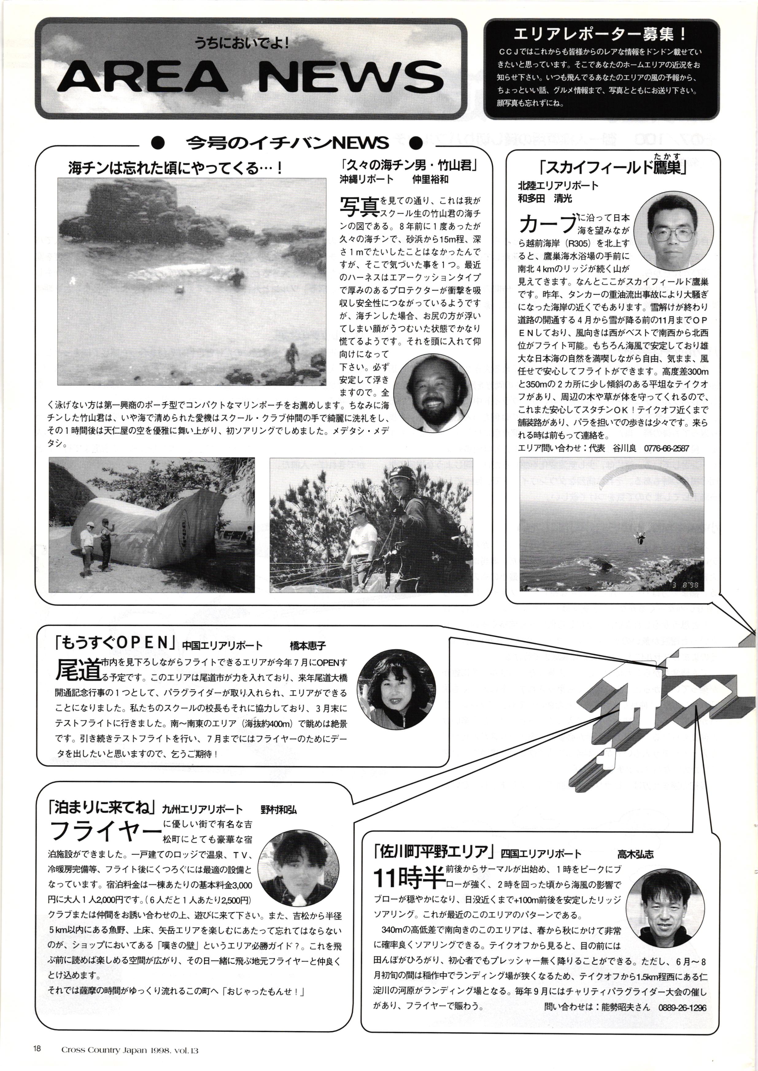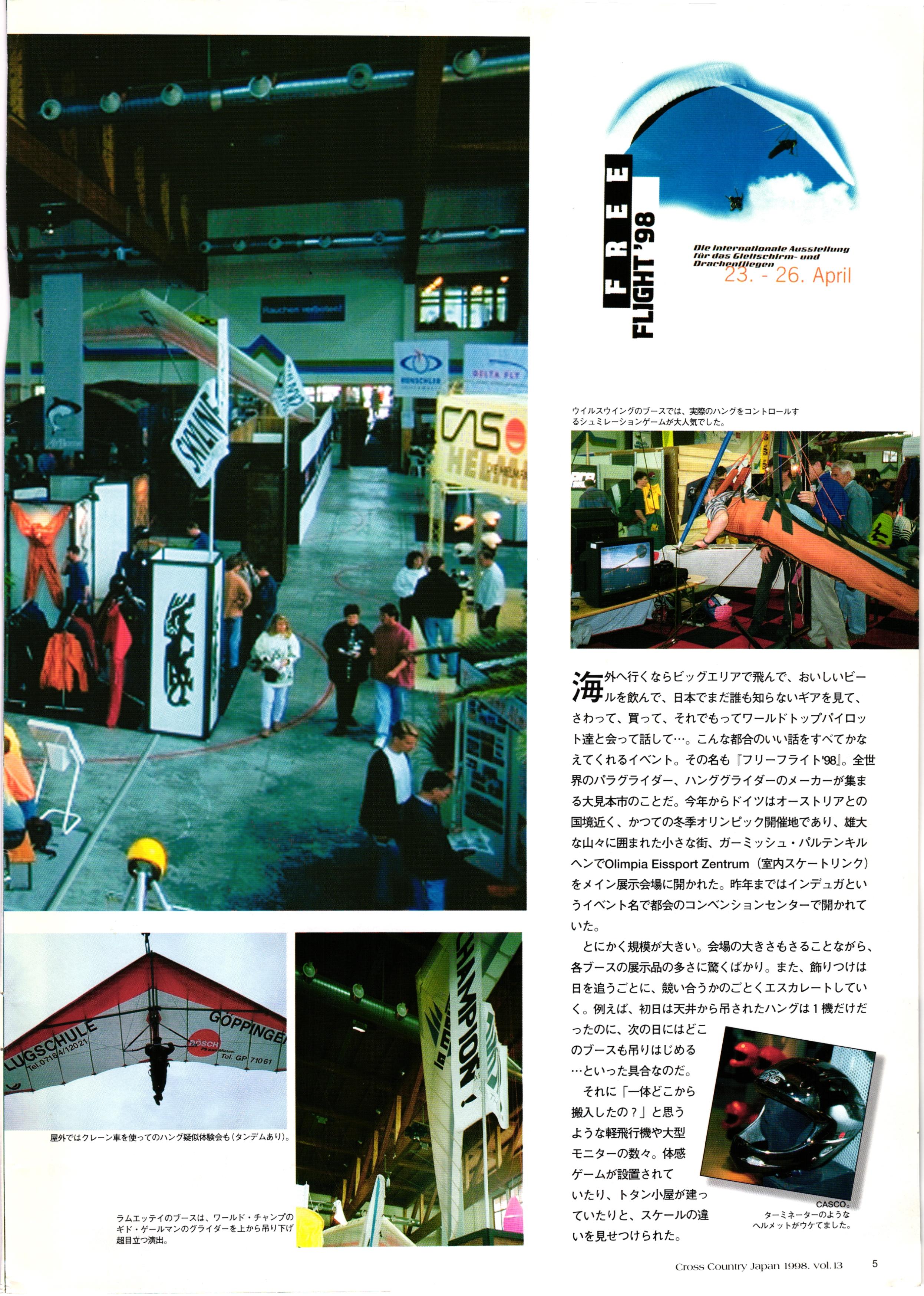 きれい CrOSS Country FREE FLIGHT MAGAZINE CONTENTS クロスカントリー日本版・13号 1998 MAY 25 Vol.13 2 あん リンク インター なんとか 4 ZOOM ...... FREE FLIGHT '98 .. ループ新記録 ... .. クロスカントリー・トロフィー ... 8 おまけ品 2017 0_ おきたいな ながる ..... I ............ 7 8 0 TO ITALIA .............. 雲底への道・ AREA NEWS 松ちゃんのお天気知恵袋 ............ 流行もの屋・べりぐっ堂 ファイナルグライド 新・PG TECHNIQUE 目からウロコのお助けテクニック...... WORLD NEWS .......... .. ...... 新・HG TECHNIQUE 田中栄一のテイクオフ・スパイス ....... .............. 4 % 3 ブルース・ゴールドスミス .............. .......... PG GLIDER TEST APCO SIERRA HG日本選手権 翼は語る・フライト史の証人 安次嶺 勉 HG GLIDER TEST La mouette TOPLESS ............. ........... ......... CALENDAR... DEVELOPMENT スピードメーター ..... 男・貢の正しいハング道 ............ INFORMATION. COMIC くろうすかにくり一 ... COMPETITION 大会結果 MEDIA MIX 空飛ぶWEB SITE 探検隊 ... FORUM 読者と編集部の愛の架け橋 ...... ... EVENT 業界初! クラシックグライダー・レースもありました .........65 パラグライダー・ウインターカップ IN 木島 平 .........................68 中国 ヒマラヤを越えて PART-3 . HI PERSPECTIVE ベイヤーの秘密 ..............71 BO ※ Kawa 雲は天才である ここで飛びたい・河口湖スカイリゾート・ NEW PRODUCTS ............ CCJ バックナンバーのご紹介... Ph; David Varilek Montage;Bowen Wei ●ランディングアプローチに入るオレッグ。 WHGSサンタンドレにて おい Cross Country Japan 1998. vol.13