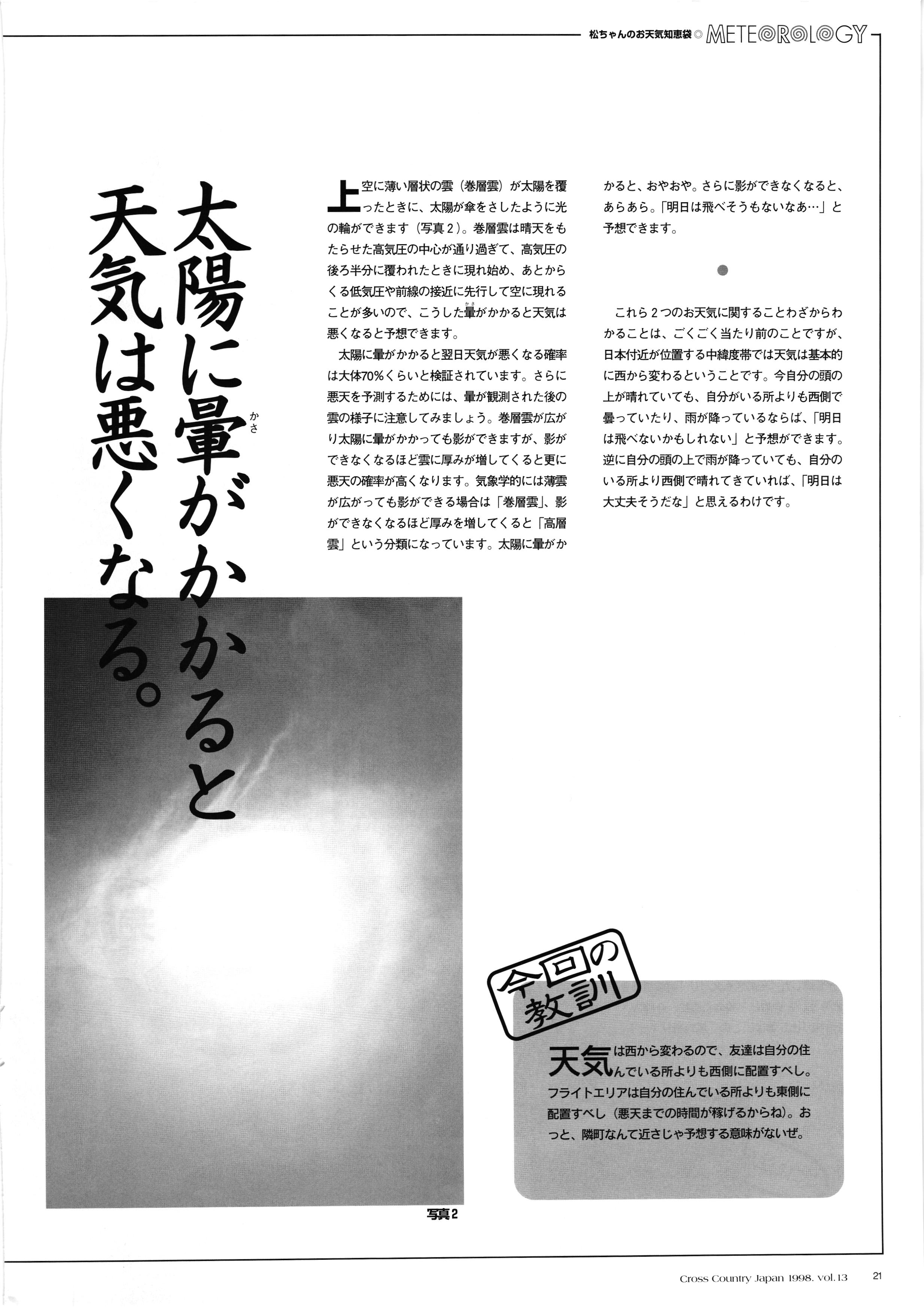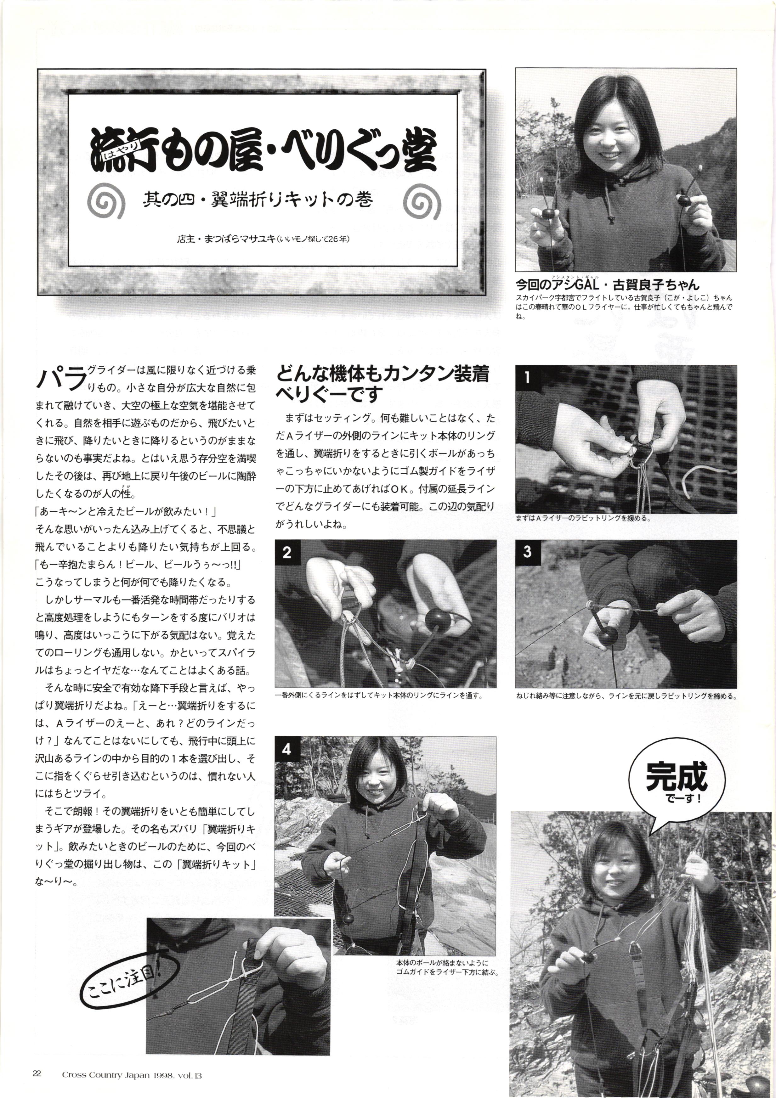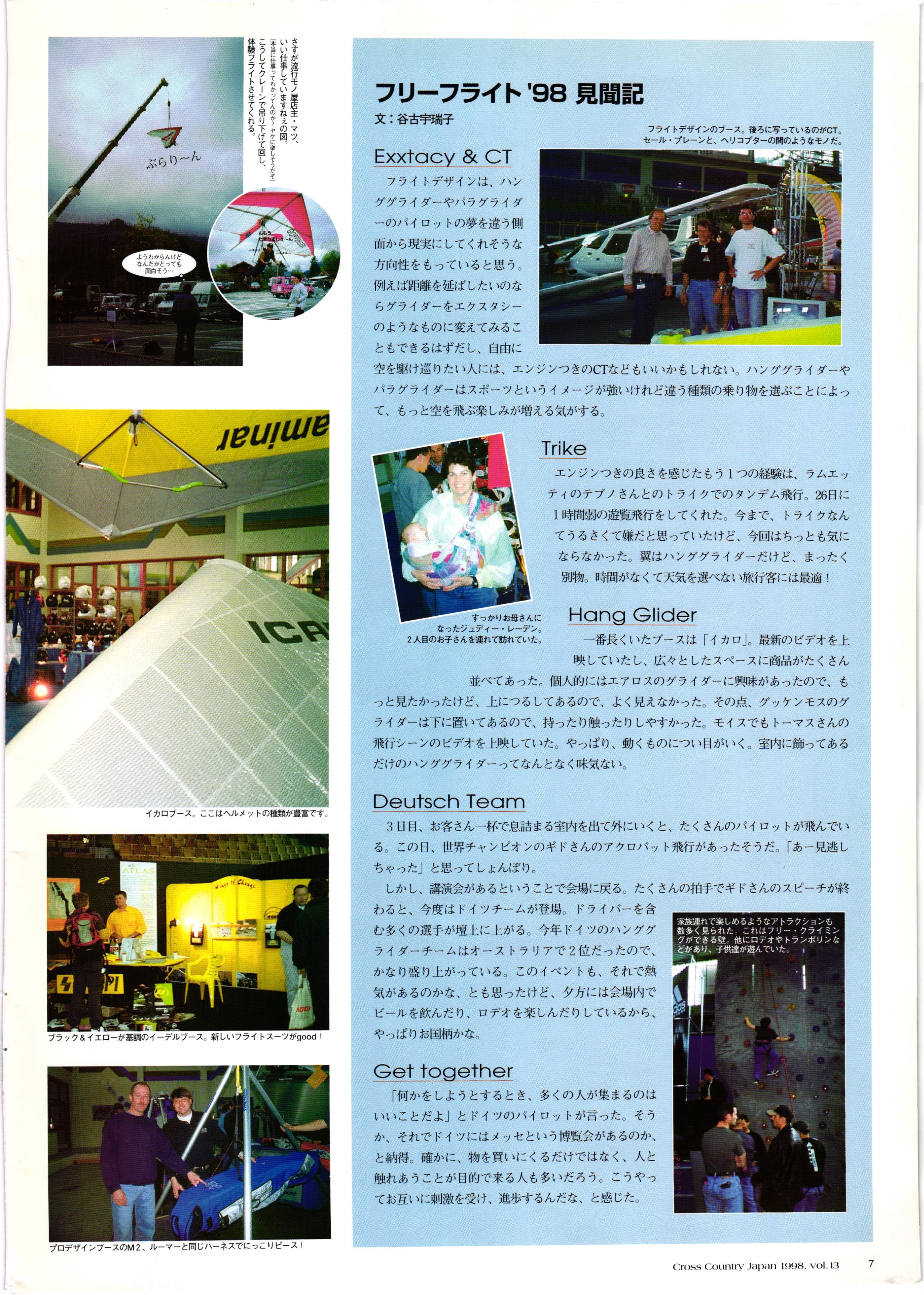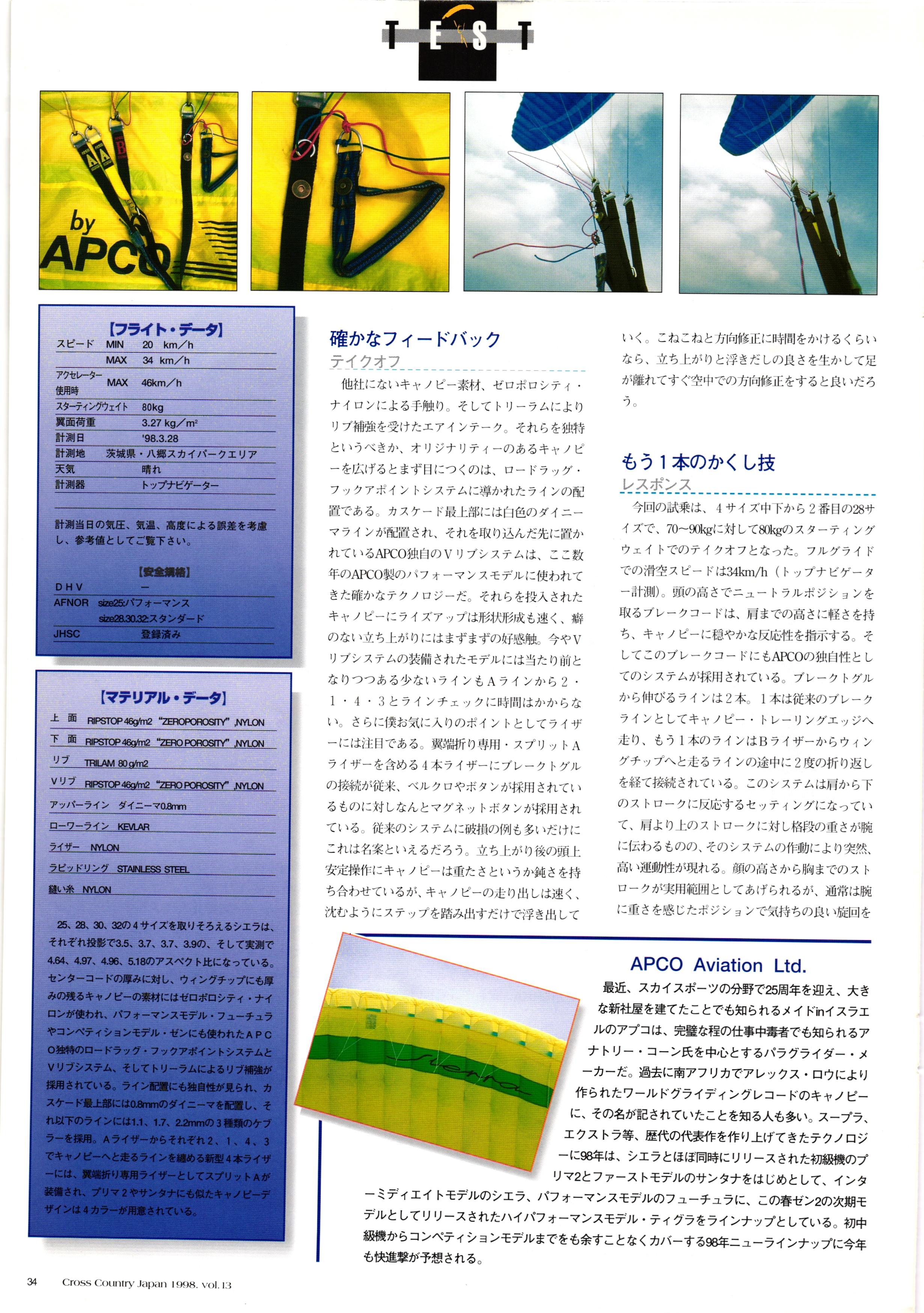 きれい CrOSS Country FREE FLIGHT MAGAZINE CONTENTS クロスカントリー日本版・13号 1998 MAY 25 Vol.13 2 あん リンク インター なんとか 4 ZOOM ...... FREE FLIGHT '98 .. ループ新記録 ... .. クロスカントリー・トロフィー ... 8 おまけ品 2017 0_ おきたいな ながる ..... I ............ 7 8 0 TO ITALIA .............. 雲底への道・ AREA NEWS 松ちゃんのお天気知恵袋 ............ 流行もの屋・べりぐっ堂 ファイナルグライド 新・PG TECHNIQUE 目からウロコのお助けテクニック...... WORLD NEWS .......... .. ...... 新・HG TECHNIQUE 田中栄一のテイクオフ・スパイス ....... .............. 4 % 3 ブルース・ゴールドスミス .............. .......... PG GLIDER TEST APCO SIERRA HG日本選手権 翼は語る・フライト史の証人 安次嶺 勉 HG GLIDER TEST La mouette TOPLESS ............. ........... ......... CALENDAR... DEVELOPMENT スピードメーター ..... 男・貢の正しいハング道 ............ INFORMATION. COMIC くろうすかにくり一 ... COMPETITION 大会結果 MEDIA MIX 空飛ぶWEB SITE 探検隊 ... FORUM 読者と編集部の愛の架け橋 ...... ... EVENT 業界初! クラシックグライダー・レースもありました .........65 パラグライダー・ウインターカップ IN 木島 平 .........................68 中国 ヒマラヤを越えて PART-3 . HI PERSPECTIVE ベイヤーの秘密 ..............71 BO ※ Kawa 雲は天才である ここで飛びたい・河口湖スカイリゾート・ NEW PRODUCTS ............ CCJ バックナンバーのご紹介... Ph; David Varilek Montage;Bowen Wei ●ランディングアプローチに入るオレッグ。 WHGSサンタンドレにて おい Cross Country Japan 1998. vol.13
