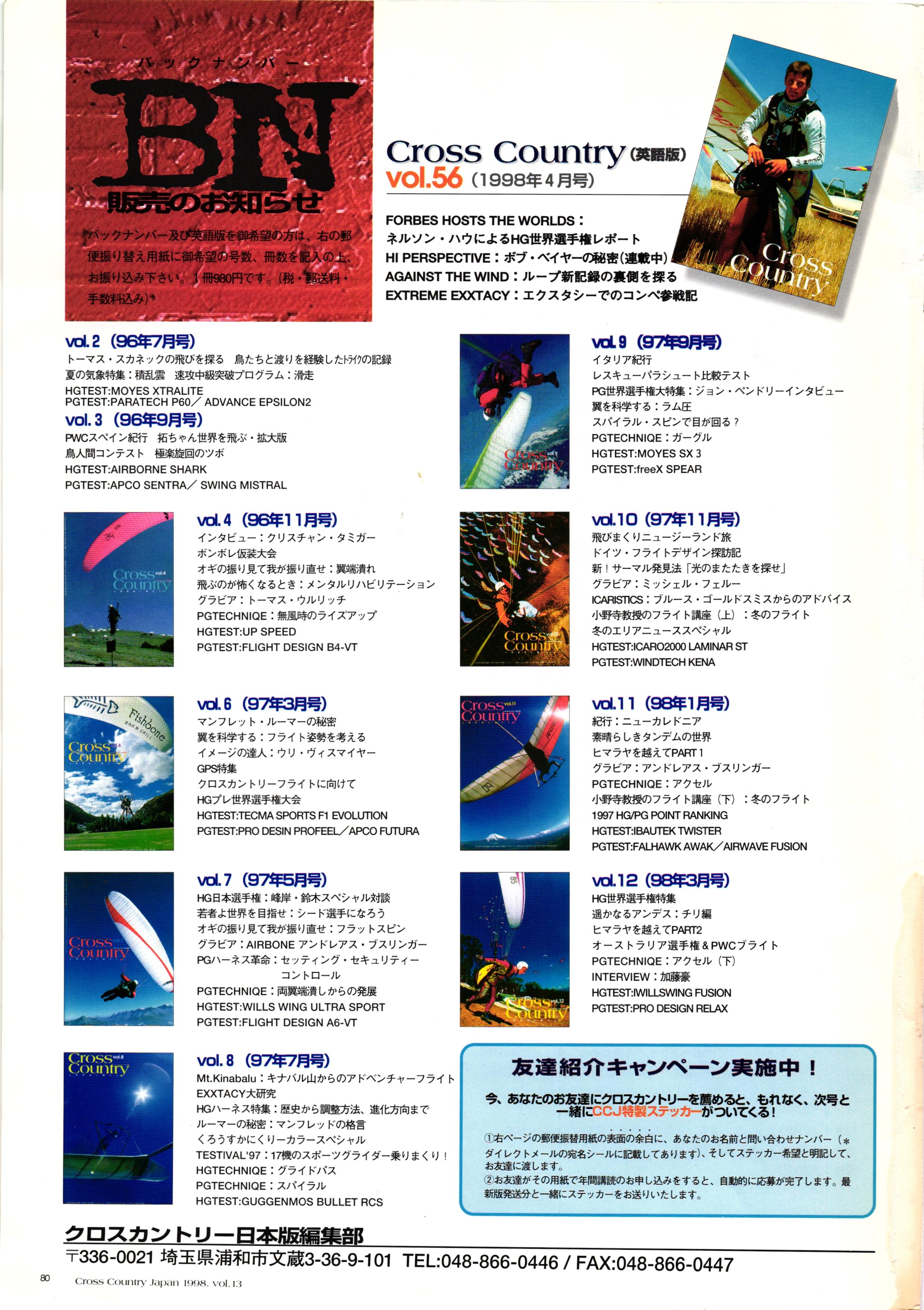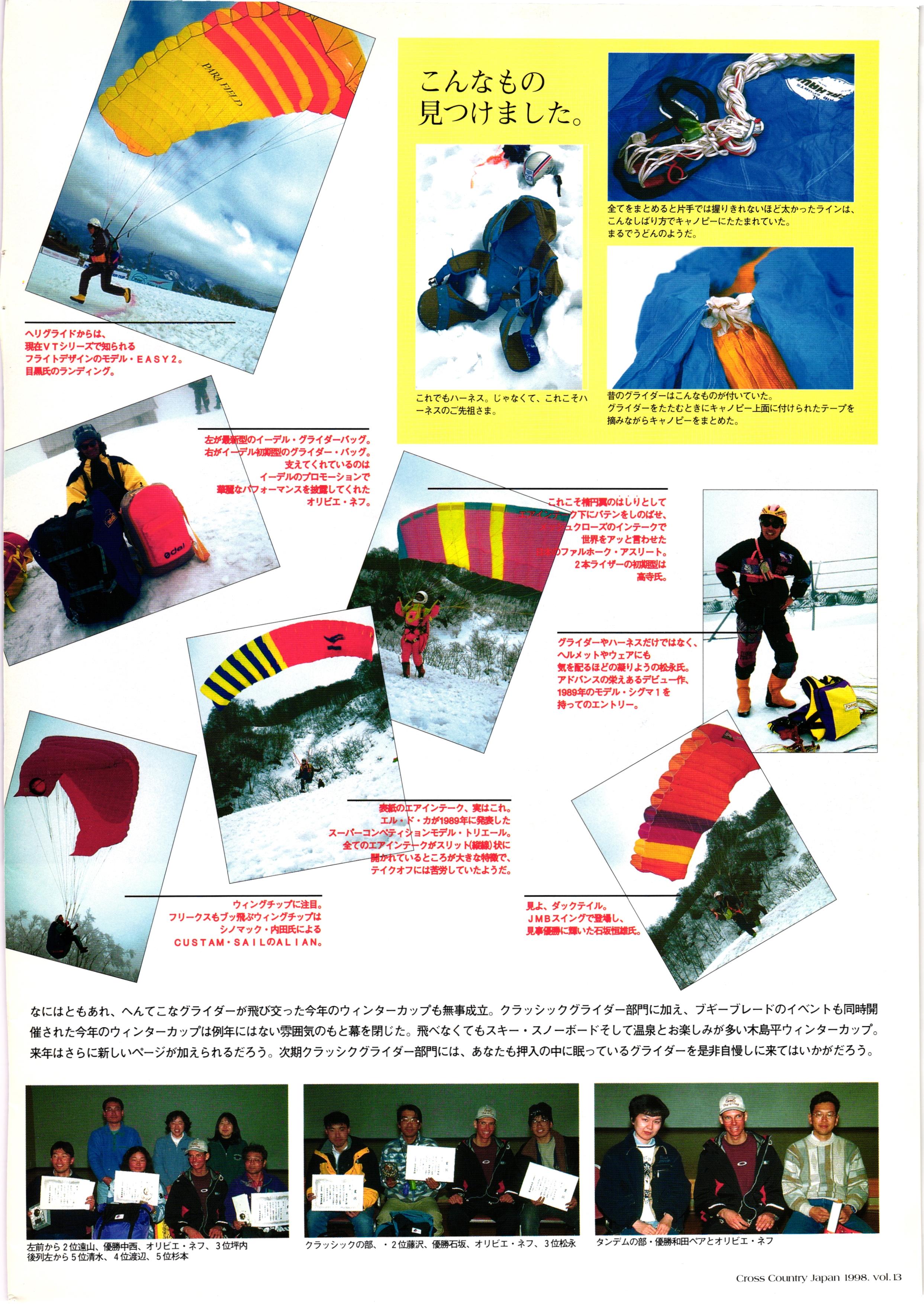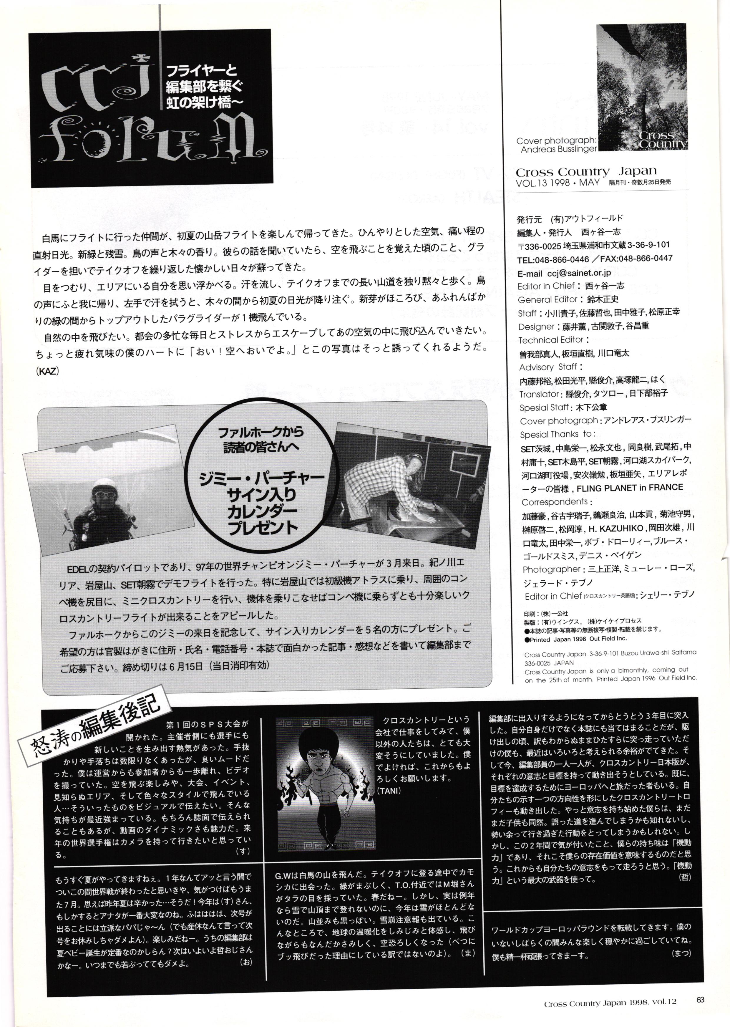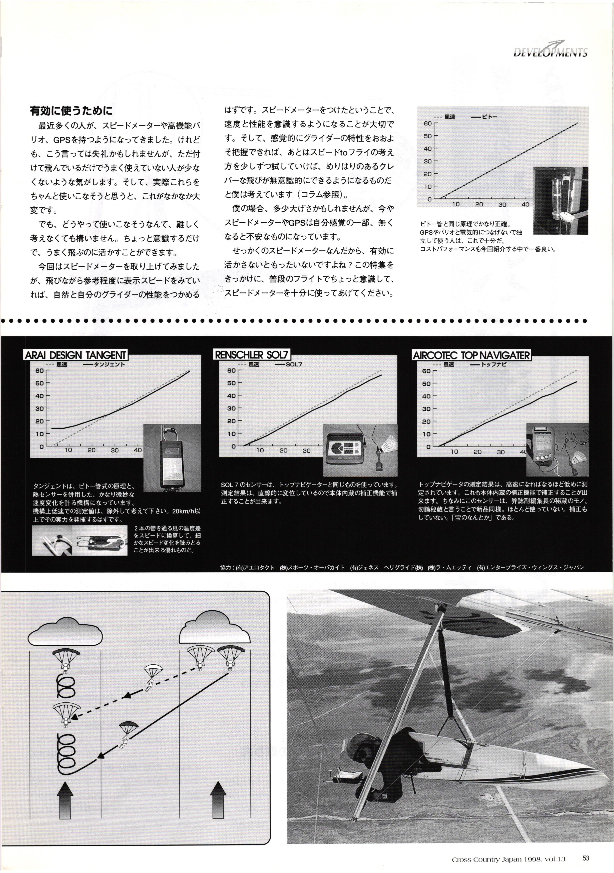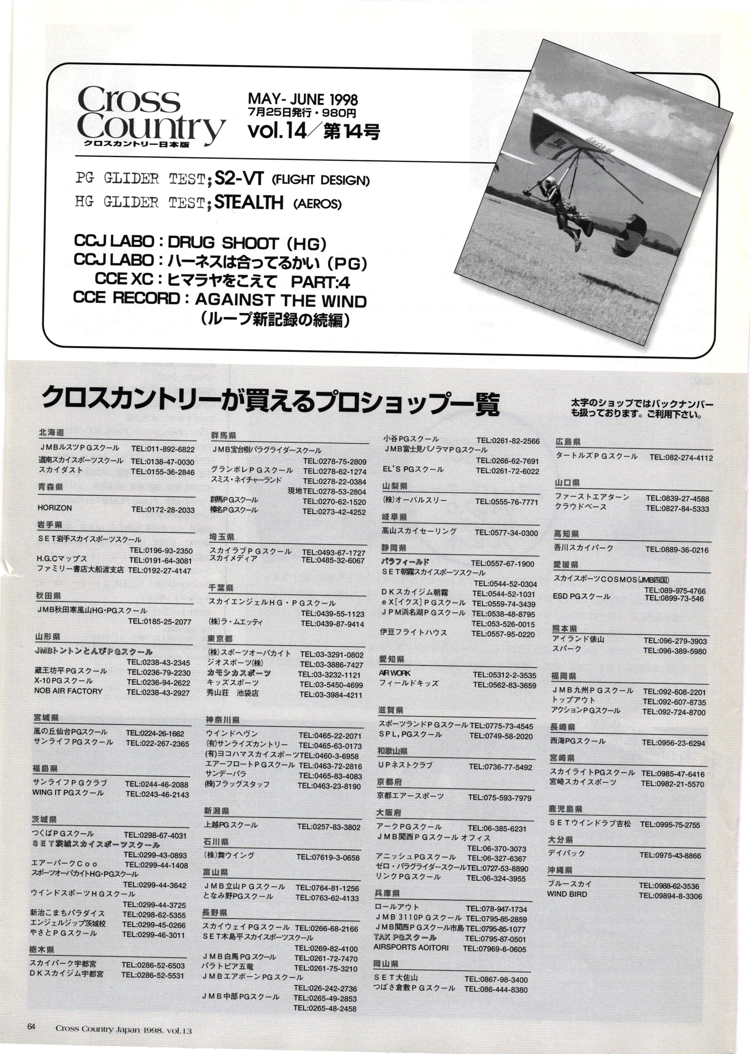 きれい CrOSS Country FREE FLIGHT MAGAZINE CONTENTS クロスカントリー日本版・13号 1998 MAY 25 Vol.13 2 あん リンク インター なんとか 4 ZOOM ...... FREE FLIGHT '98 .. ループ新記録 ... .. クロスカントリー・トロフィー ... 8 おまけ品 2017 0_ おきたいな ながる ..... I ............ 7 8 0 TO ITALIA .............. 雲底への道・ AREA NEWS 松ちゃんのお天気知恵袋 ............ 流行もの屋・べりぐっ堂 ファイナルグライド 新・PG TECHNIQUE 目からウロコのお助けテクニック...... WORLD NEWS .......... .. ...... 新・HG TECHNIQUE 田中栄一のテイクオフ・スパイス ....... .............. 4 % 3 ブルース・ゴールドスミス .............. .......... PG GLIDER TEST APCO SIERRA HG日本選手権 翼は語る・フライト史の証人 安次嶺 勉 HG GLIDER TEST La mouette TOPLESS ............. ........... ......... CALENDAR... DEVELOPMENT スピードメーター ..... 男・貢の正しいハング道 ............ INFORMATION. COMIC くろうすかにくり一 ... COMPETITION 大会結果 MEDIA MIX 空飛ぶWEB SITE 探検隊 ... FORUM 読者と編集部の愛の架け橋 ...... ... EVENT 業界初! クラシックグライダー・レースもありました .........65 パラグライダー・ウインターカップ IN 木島 平 .........................68 中国 ヒマラヤを越えて PART-3 . HI PERSPECTIVE ベイヤーの秘密 ..............71 BO ※ Kawa 雲は天才である ここで飛びたい・河口湖スカイリゾート・ NEW PRODUCTS ............ CCJ バックナンバーのご紹介... Ph; David Varilek Montage;Bowen Wei ●ランディングアプローチに入るオレッグ。 WHGSサンタンドレにて おい Cross Country Japan 1998. vol.13