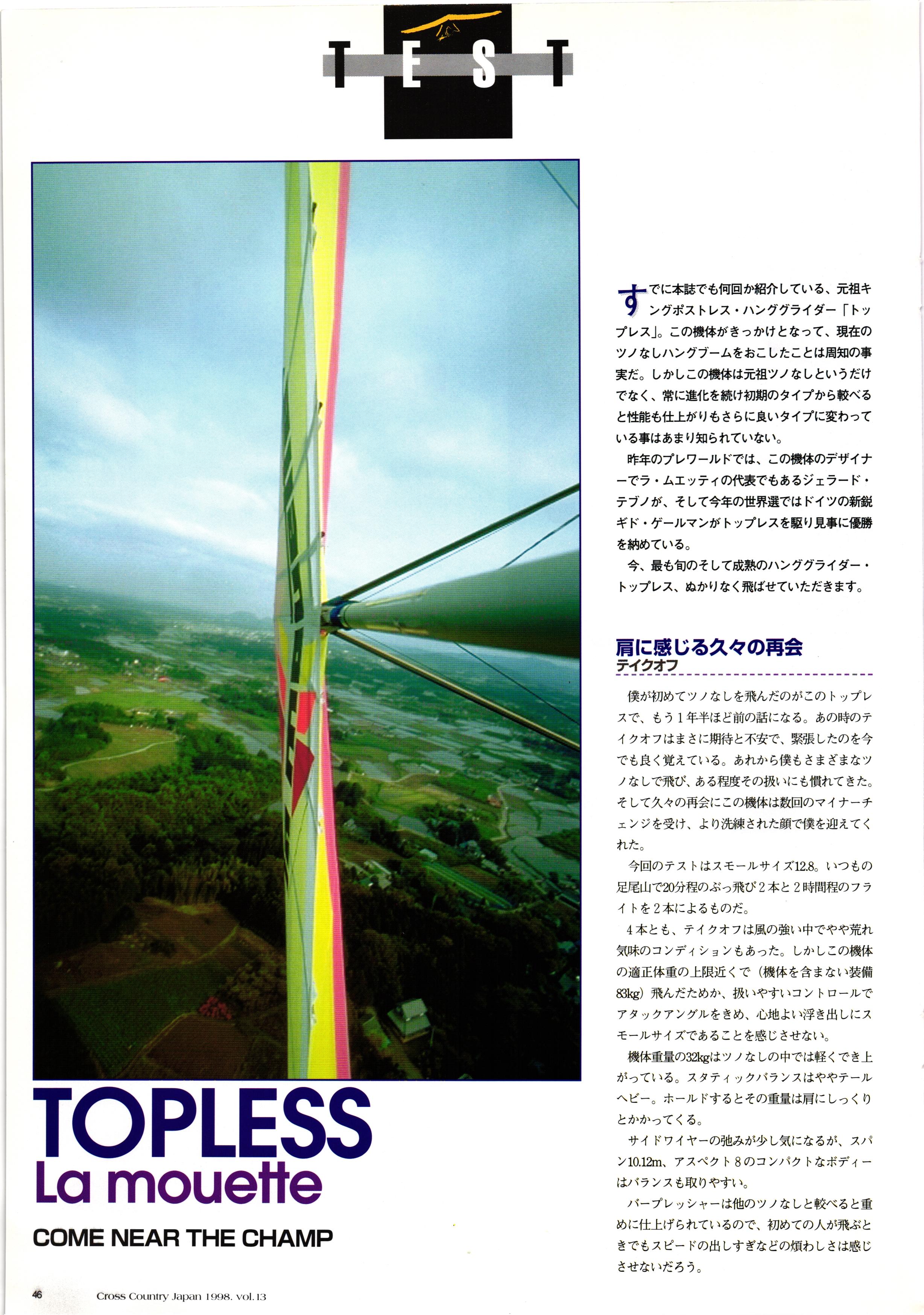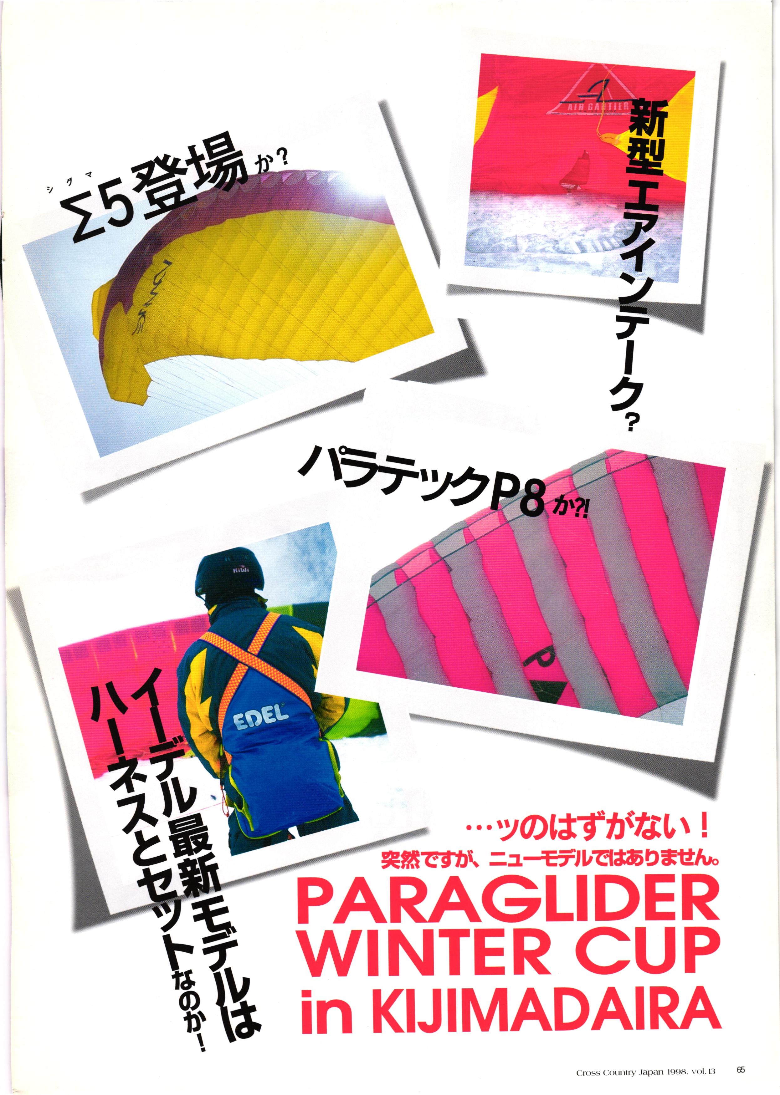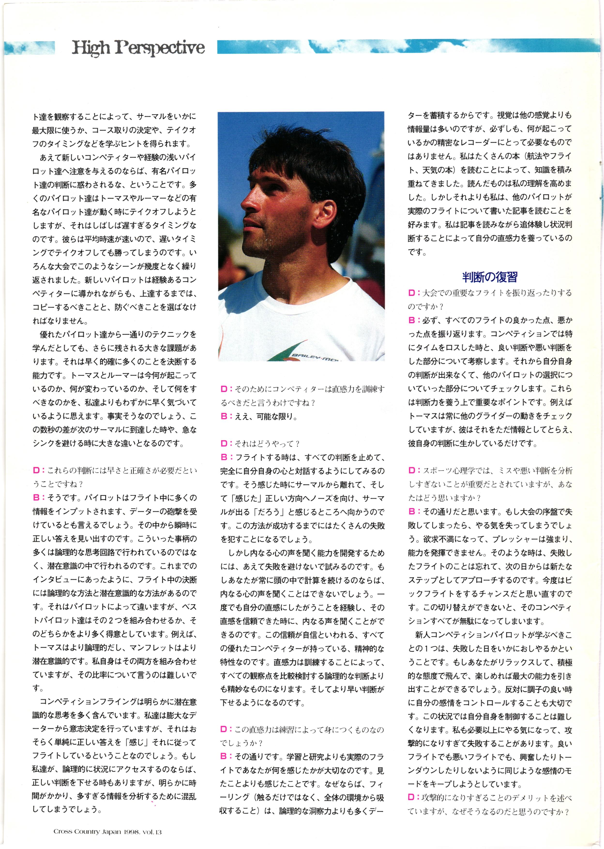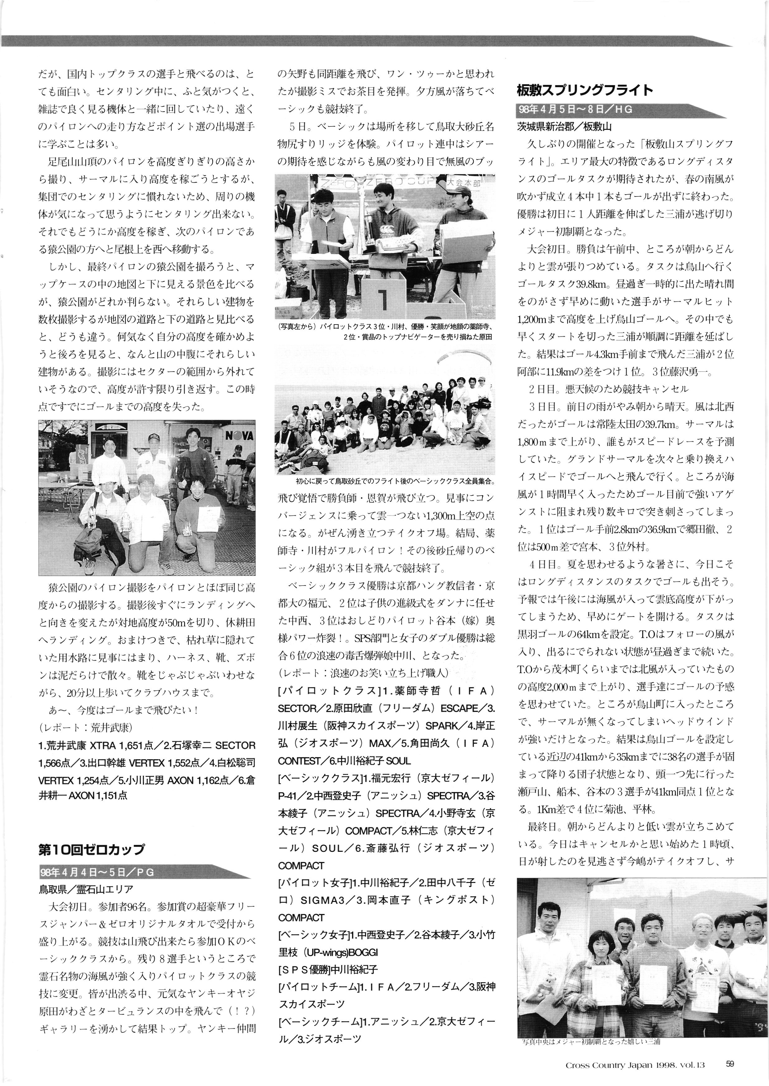 きれい CrOSS Country FREE FLIGHT MAGAZINE CONTENTS クロスカントリー日本版・13号 1998 MAY 25 Vol.13 2 あん リンク インター なんとか 4 ZOOM ...... FREE FLIGHT '98 .. ループ新記録 ... .. クロスカントリー・トロフィー ... 8 おまけ品 2017 0_ おきたいな ながる ..... I ............ 7 8 0 TO ITALIA .............. 雲底への道・ AREA NEWS 松ちゃんのお天気知恵袋 ............ 流行もの屋・べりぐっ堂 ファイナルグライド 新・PG TECHNIQUE 目からウロコのお助けテクニック...... WORLD NEWS .......... .. ...... 新・HG TECHNIQUE 田中栄一のテイクオフ・スパイス ....... .............. 4 % 3 ブルース・ゴールドスミス .............. .......... PG GLIDER TEST APCO SIERRA HG日本選手権 翼は語る・フライト史の証人 安次嶺 勉 HG GLIDER TEST La mouette TOPLESS ............. ........... ......... CALENDAR... DEVELOPMENT スピードメーター ..... 男・貢の正しいハング道 ............ INFORMATION. COMIC くろうすかにくり一 ... COMPETITION 大会結果 MEDIA MIX 空飛ぶWEB SITE 探検隊 ... FORUM 読者と編集部の愛の架け橋 ...... ... EVENT 業界初! クラシックグライダー・レースもありました .........65 パラグライダー・ウインターカップ IN 木島 平 .........................68 中国 ヒマラヤを越えて PART-3 . HI PERSPECTIVE ベイヤーの秘密 ..............71 BO ※ Kawa 雲は天才である ここで飛びたい・河口湖スカイリゾート・ NEW PRODUCTS ............ CCJ バックナンバーのご紹介... Ph; David Varilek Montage;Bowen Wei ●ランディングアプローチに入るオレッグ。 WHGSサンタンドレにて おい Cross Country Japan 1998. vol.13