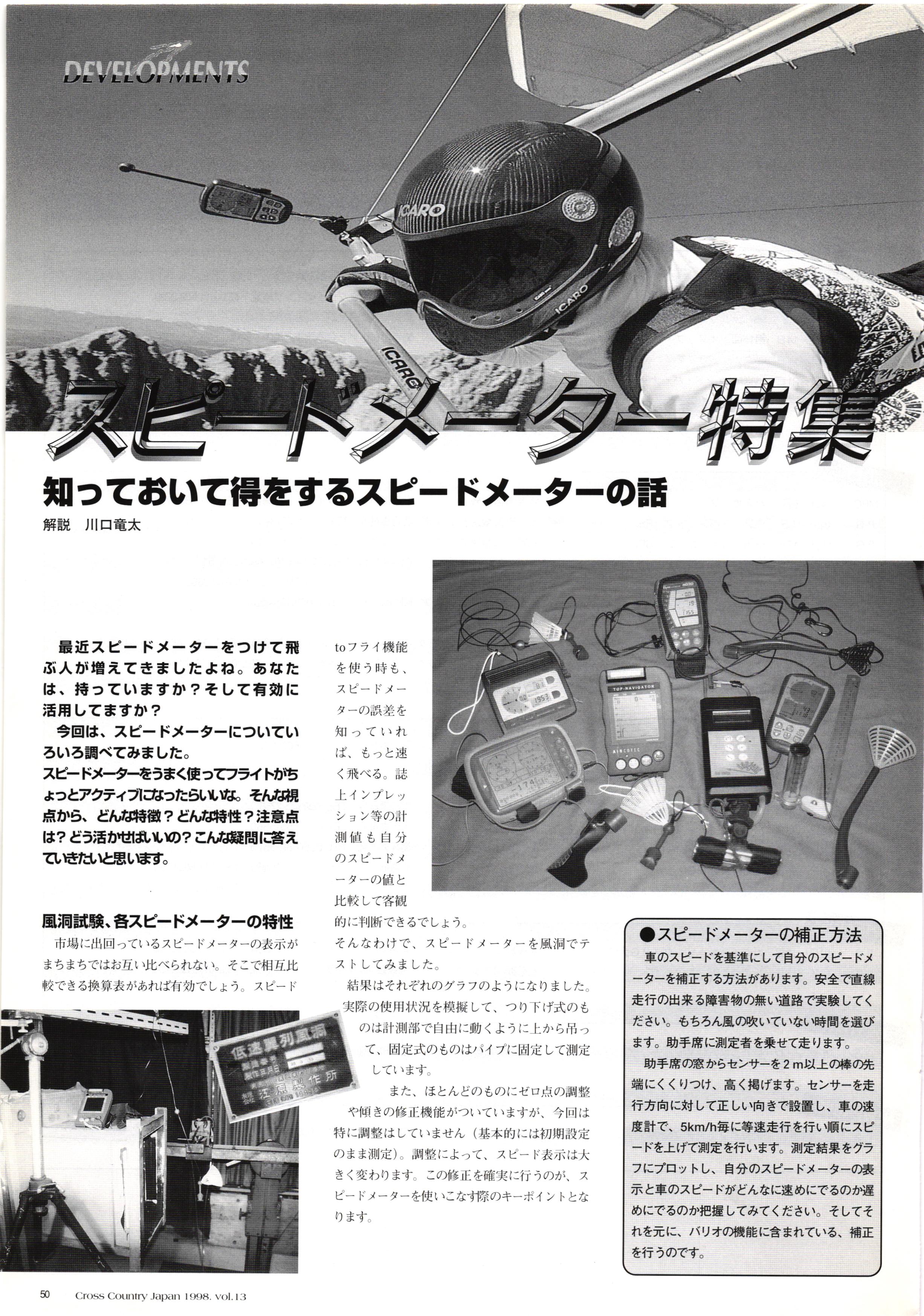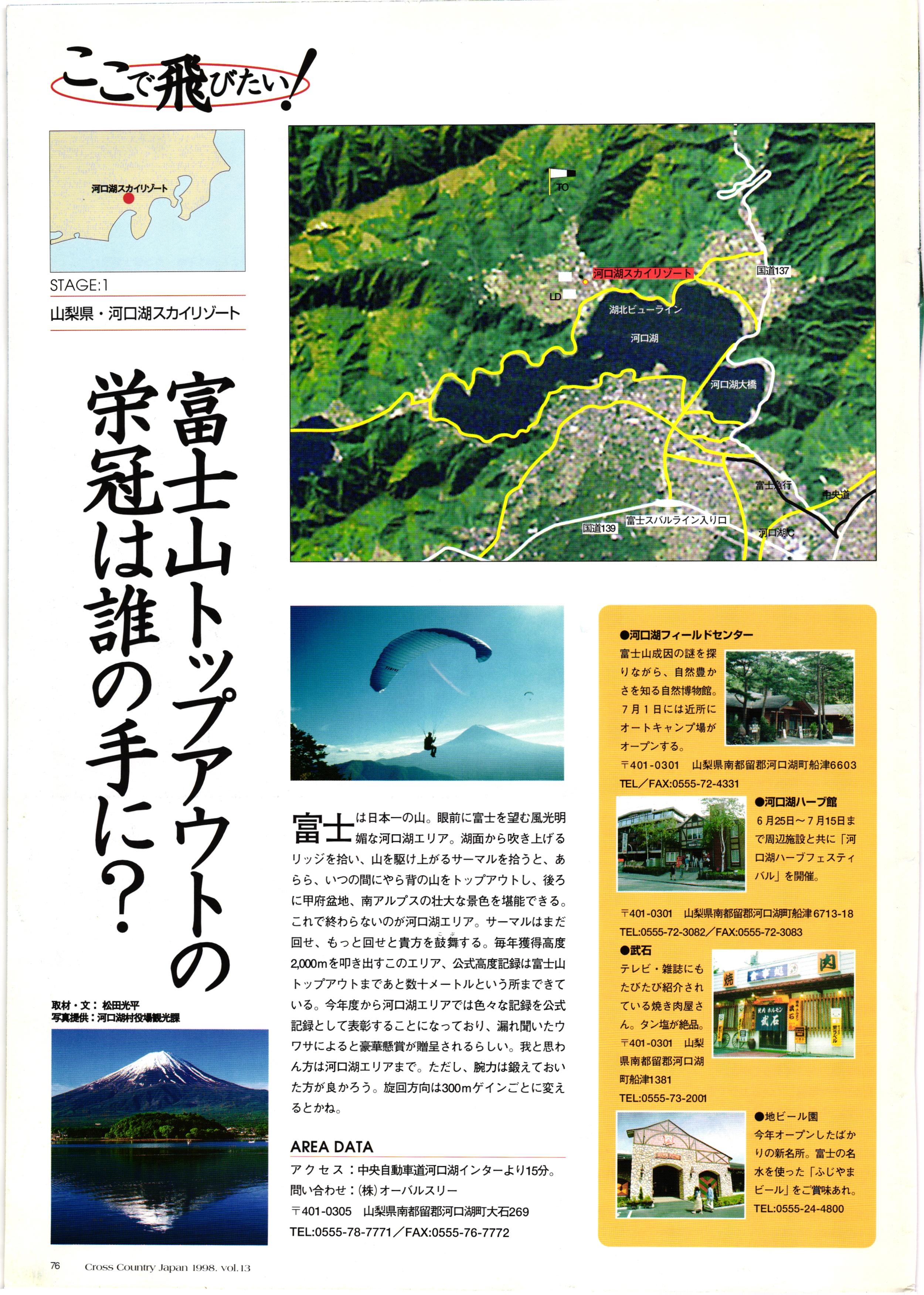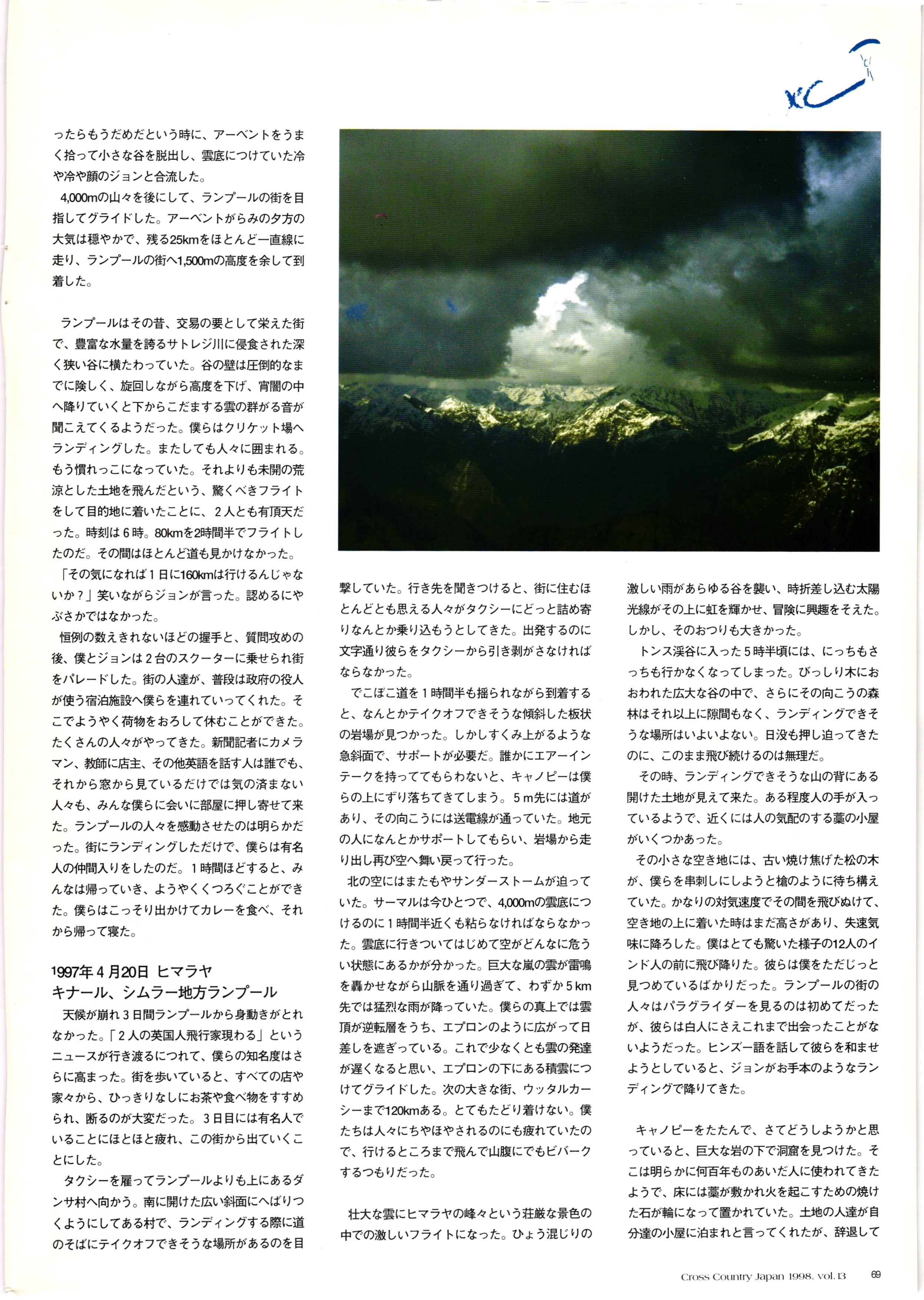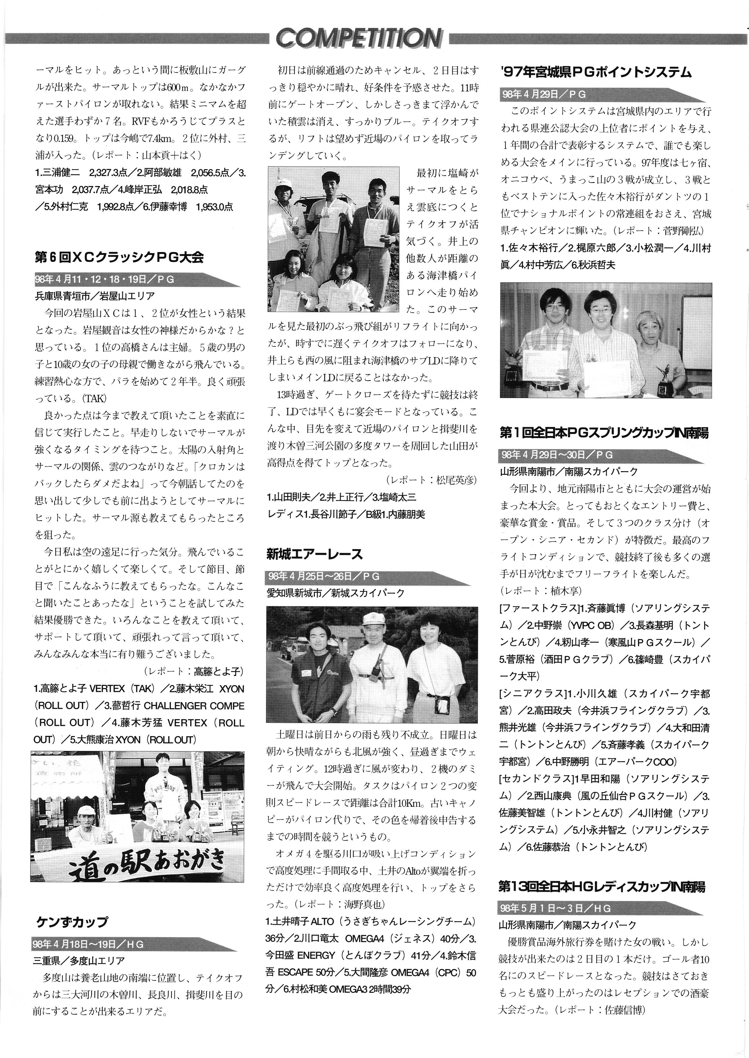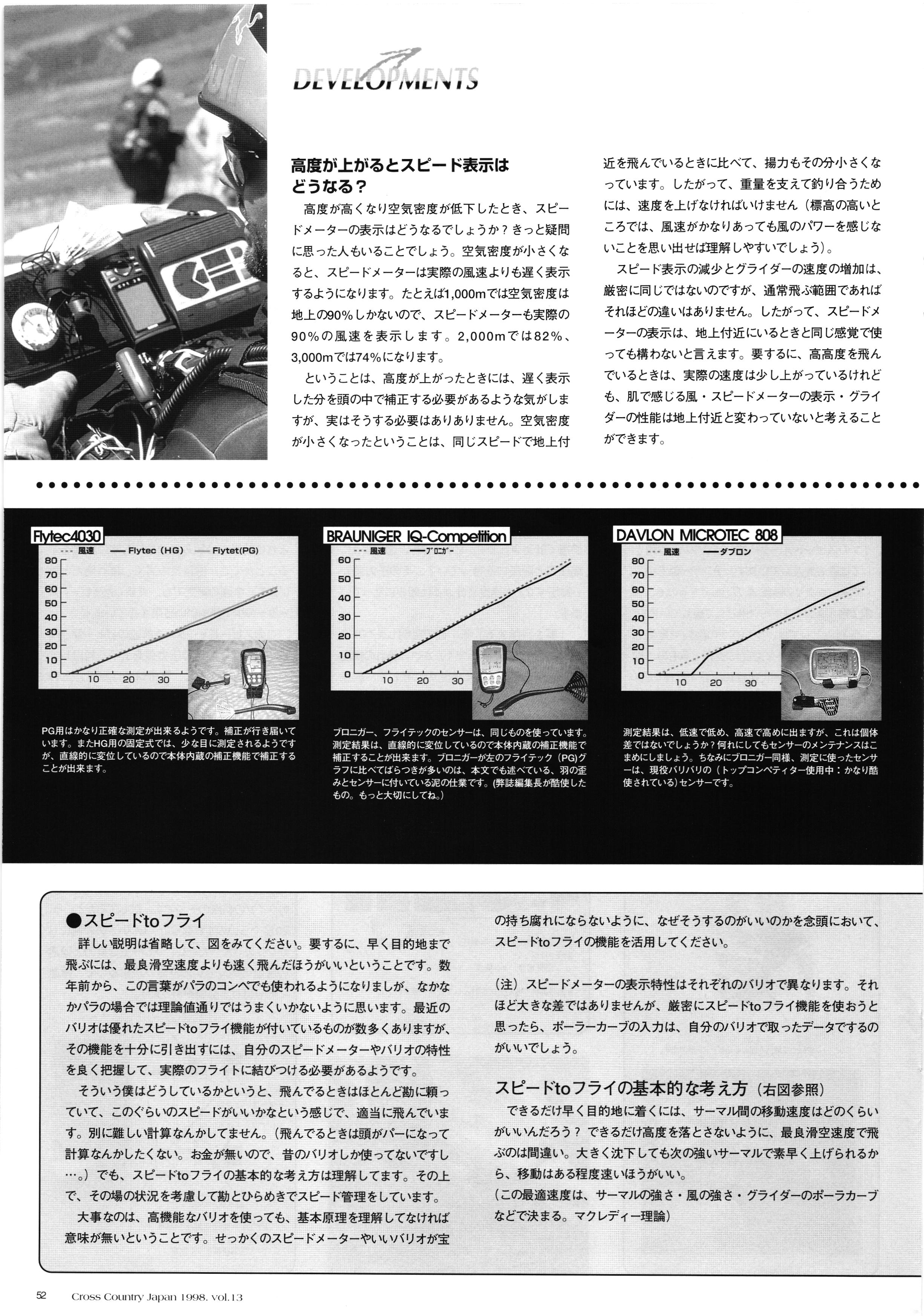 きれい CrOSS Country FREE FLIGHT MAGAZINE CONTENTS クロスカントリー日本版・13号 1998 MAY 25 Vol.13 2 あん リンク インター なんとか 4 ZOOM ...... FREE FLIGHT '98 .. ループ新記録 ... .. クロスカントリー・トロフィー ... 8 おまけ品 2017 0_ おきたいな ながる ..... I ............ 7 8 0 TO ITALIA .............. 雲底への道・ AREA NEWS 松ちゃんのお天気知恵袋 ............ 流行もの屋・べりぐっ堂 ファイナルグライド 新・PG TECHNIQUE 目からウロコのお助けテクニック...... WORLD NEWS .......... .. ...... 新・HG TECHNIQUE 田中栄一のテイクオフ・スパイス ....... .............. 4 % 3 ブルース・ゴールドスミス .............. .......... PG GLIDER TEST APCO SIERRA HG日本選手権 翼は語る・フライト史の証人 安次嶺 勉 HG GLIDER TEST La mouette TOPLESS ............. ........... ......... CALENDAR... DEVELOPMENT スピードメーター ..... 男・貢の正しいハング道 ............ INFORMATION. COMIC くろうすかにくり一 ... COMPETITION 大会結果 MEDIA MIX 空飛ぶWEB SITE 探検隊 ... FORUM 読者と編集部の愛の架け橋 ...... ... EVENT 業界初! クラシックグライダー・レースもありました .........65 パラグライダー・ウインターカップ IN 木島 平 .........................68 中国 ヒマラヤを越えて PART-3 . HI PERSPECTIVE ベイヤーの秘密 ..............71 BO ※ Kawa 雲は天才である ここで飛びたい・河口湖スカイリゾート・ NEW PRODUCTS ............ CCJ バックナンバーのご紹介... Ph; David Varilek Montage;Bowen Wei ●ランディングアプローチに入るオレッグ。 WHGSサンタンドレにて おい Cross Country Japan 1998. vol.13