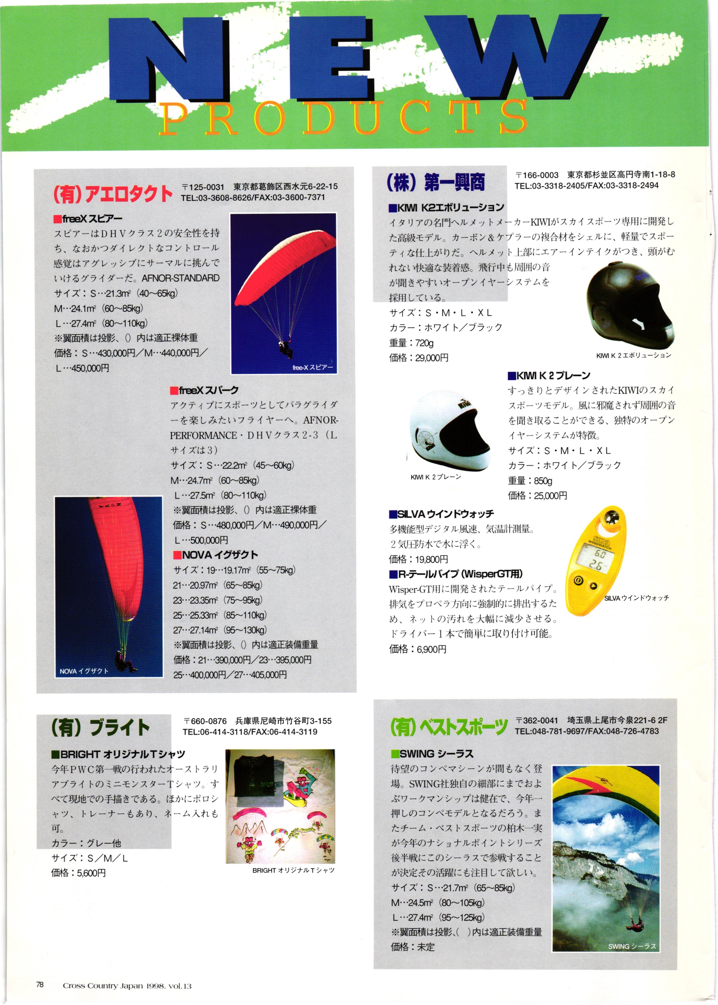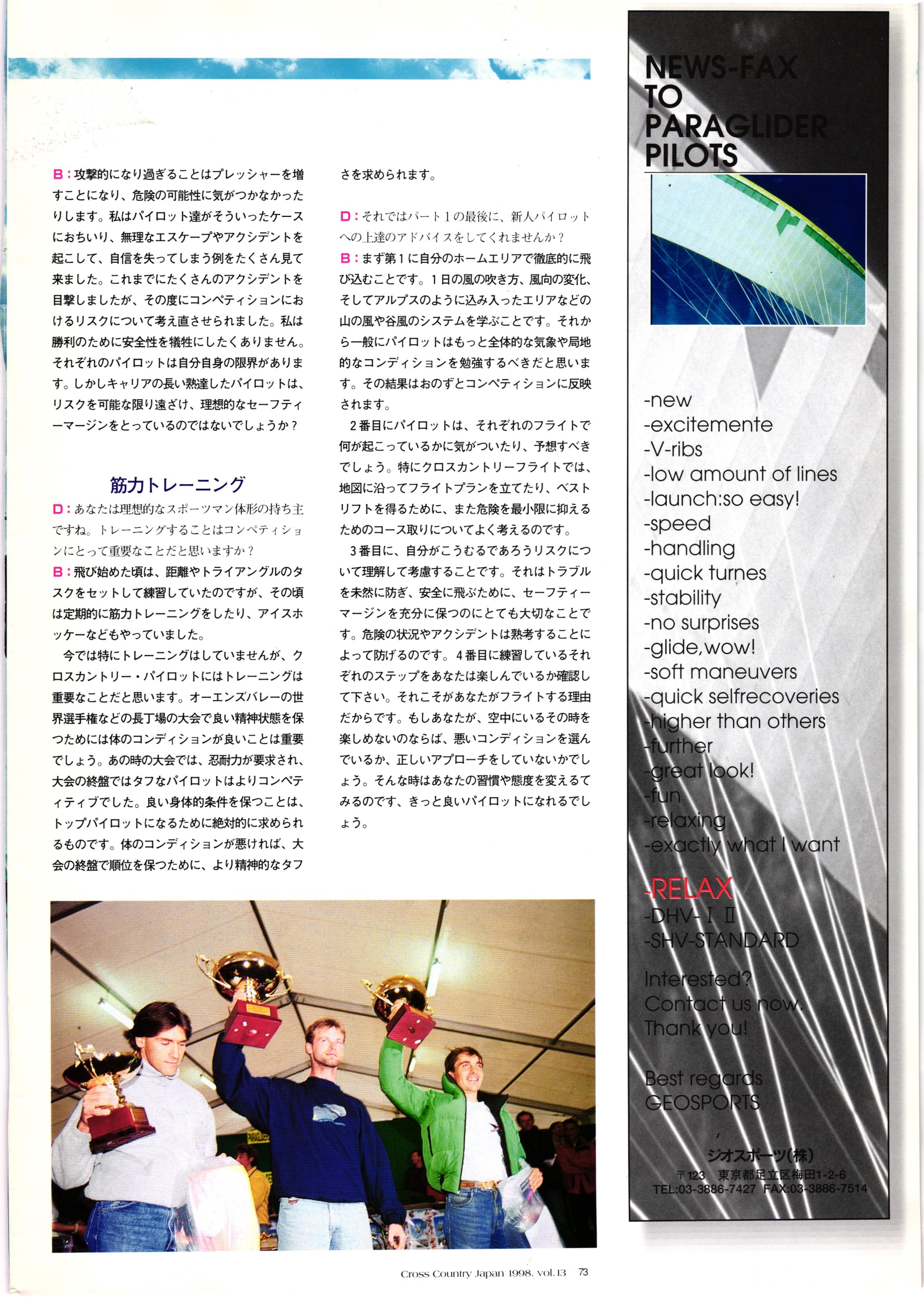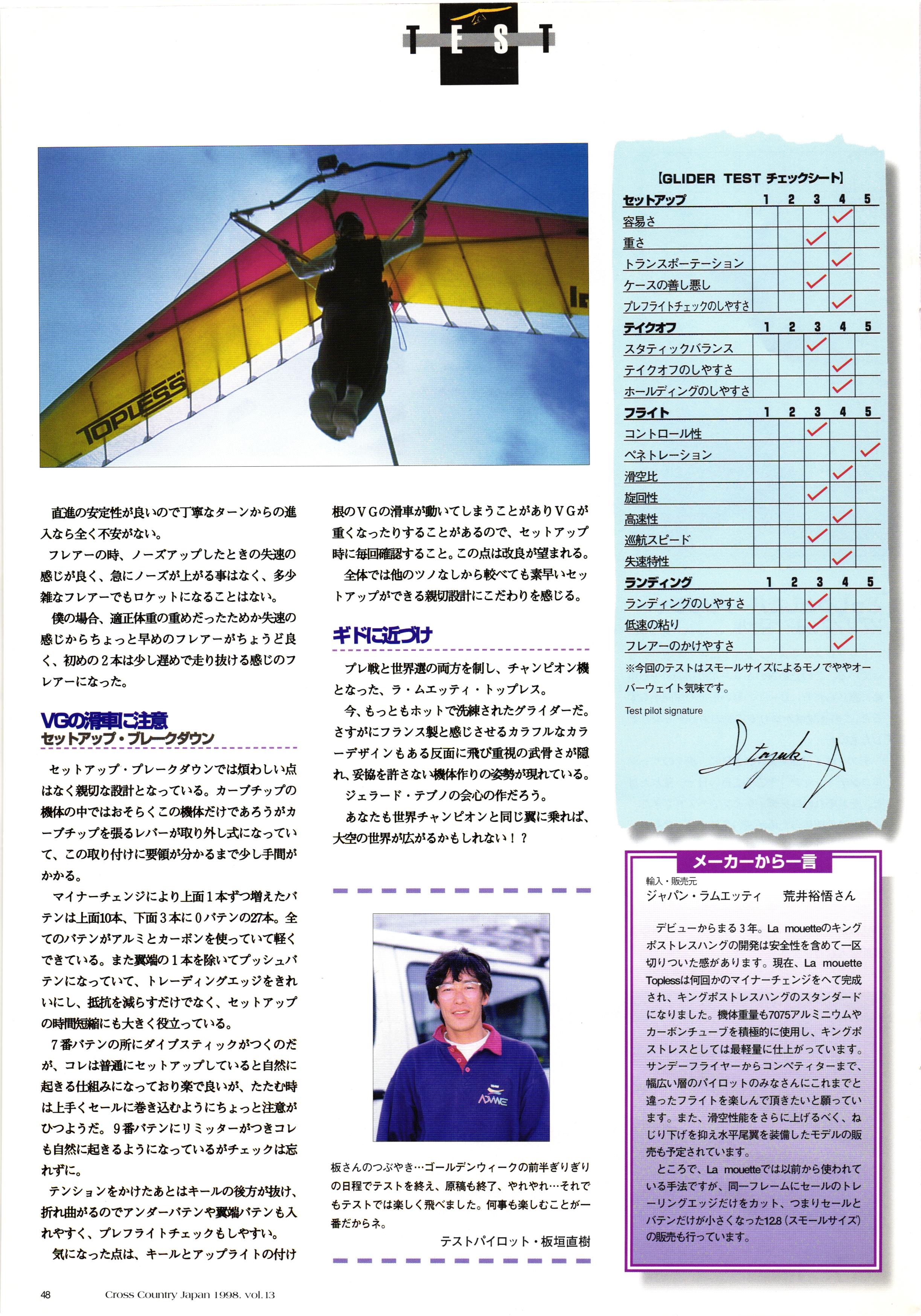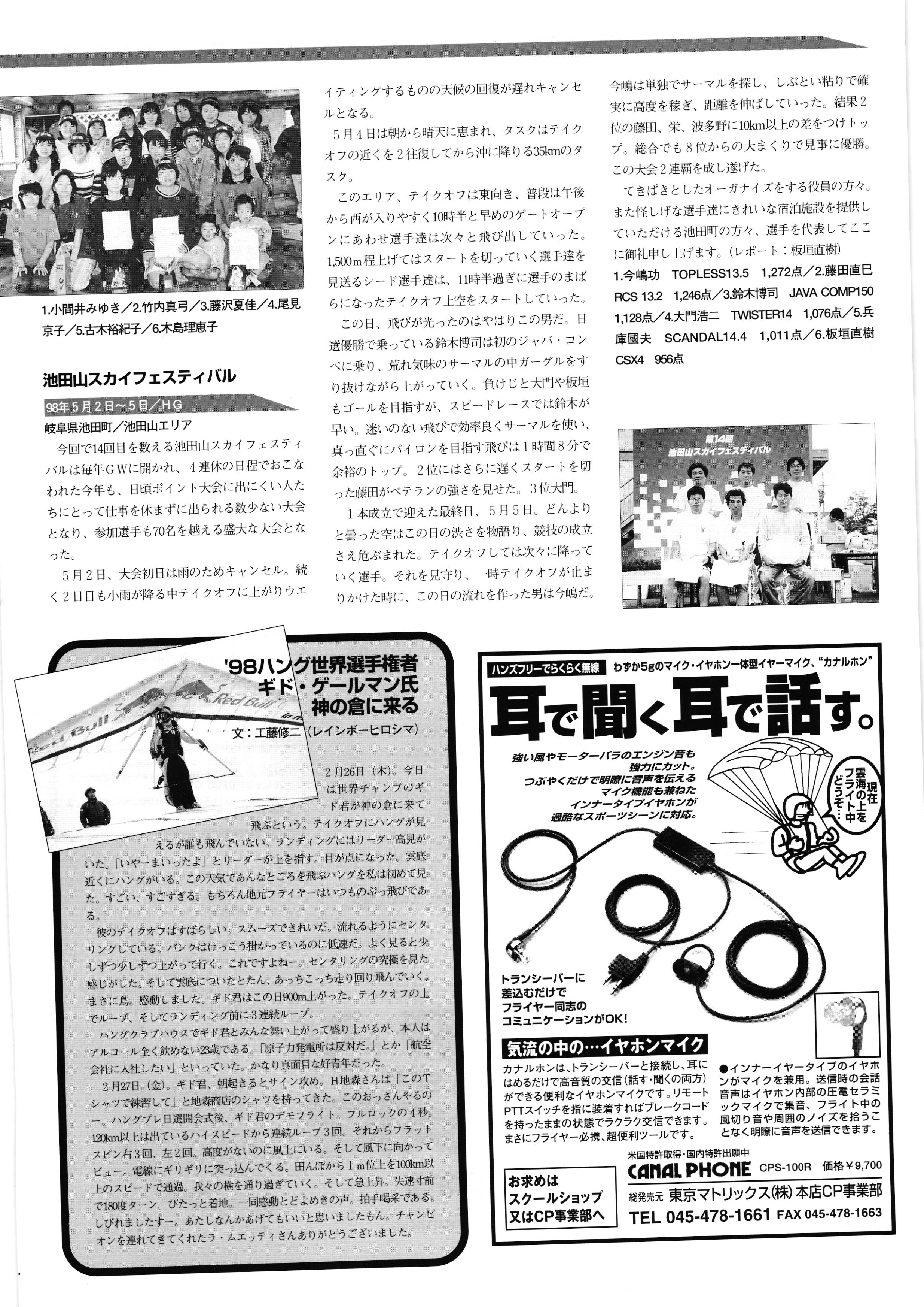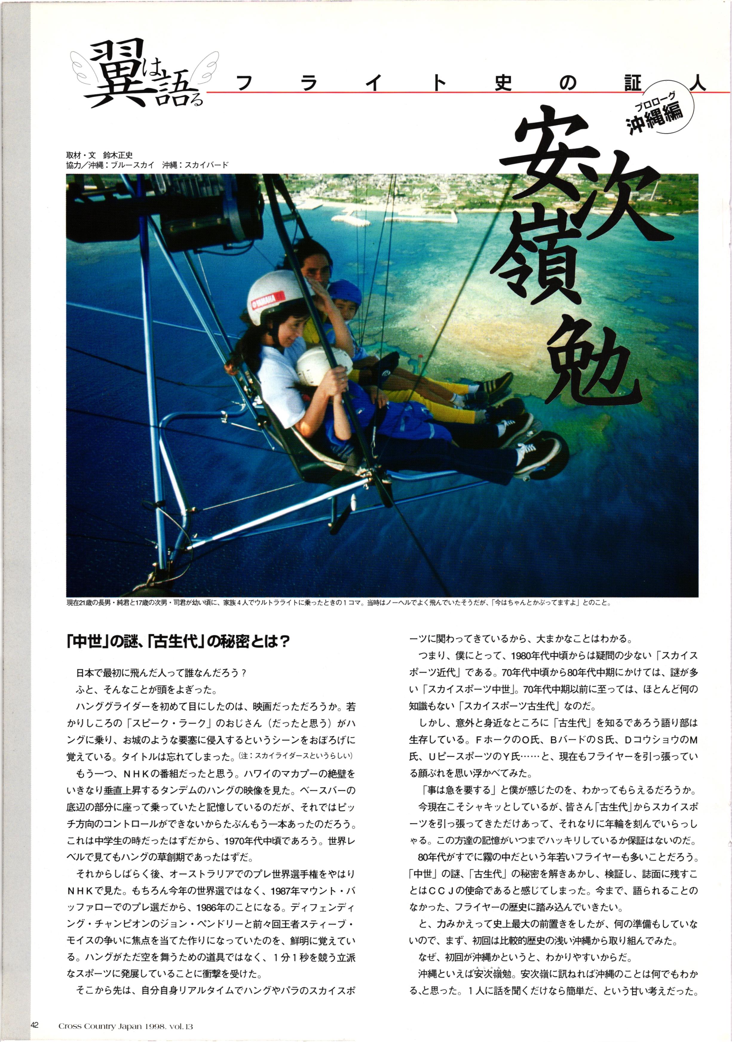 きれい CrOSS Country FREE FLIGHT MAGAZINE CONTENTS クロスカントリー日本版・13号 1998 MAY 25 Vol.13 2 あん リンク インター なんとか 4 ZOOM ...... FREE FLIGHT '98 .. ループ新記録 ... .. クロスカントリー・トロフィー ... 8 おまけ品 2017 0_ おきたいな ながる ..... I ............ 7 8 0 TO ITALIA .............. 雲底への道・ AREA NEWS 松ちゃんのお天気知恵袋 ............ 流行もの屋・べりぐっ堂 ファイナルグライド 新・PG TECHNIQUE 目からウロコのお助けテクニック...... WORLD NEWS .......... .. ...... 新・HG TECHNIQUE 田中栄一のテイクオフ・スパイス ....... .............. 4 % 3 ブルース・ゴールドスミス .............. .......... PG GLIDER TEST APCO SIERRA HG日本選手権 翼は語る・フライト史の証人 安次嶺 勉 HG GLIDER TEST La mouette TOPLESS ............. ........... ......... CALENDAR... DEVELOPMENT スピードメーター ..... 男・貢の正しいハング道 ............ INFORMATION. COMIC くろうすかにくり一 ... COMPETITION 大会結果 MEDIA MIX 空飛ぶWEB SITE 探検隊 ... FORUM 読者と編集部の愛の架け橋 ...... ... EVENT 業界初! クラシックグライダー・レースもありました .........65 パラグライダー・ウインターカップ IN 木島 平 .........................68 中国 ヒマラヤを越えて PART-3 . HI PERSPECTIVE ベイヤーの秘密 ..............71 BO ※ Kawa 雲は天才である ここで飛びたい・河口湖スカイリゾート・ NEW PRODUCTS ............ CCJ バックナンバーのご紹介... Ph; David Varilek Montage;Bowen Wei ●ランディングアプローチに入るオレッグ。 WHGSサンタンドレにて おい Cross Country Japan 1998. vol.13
