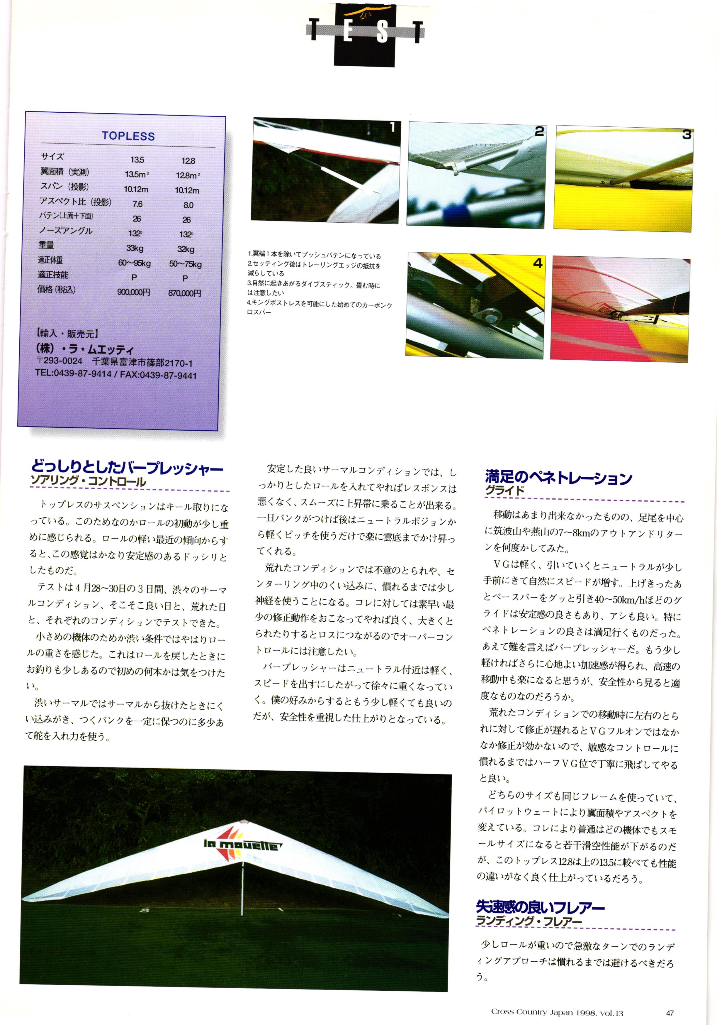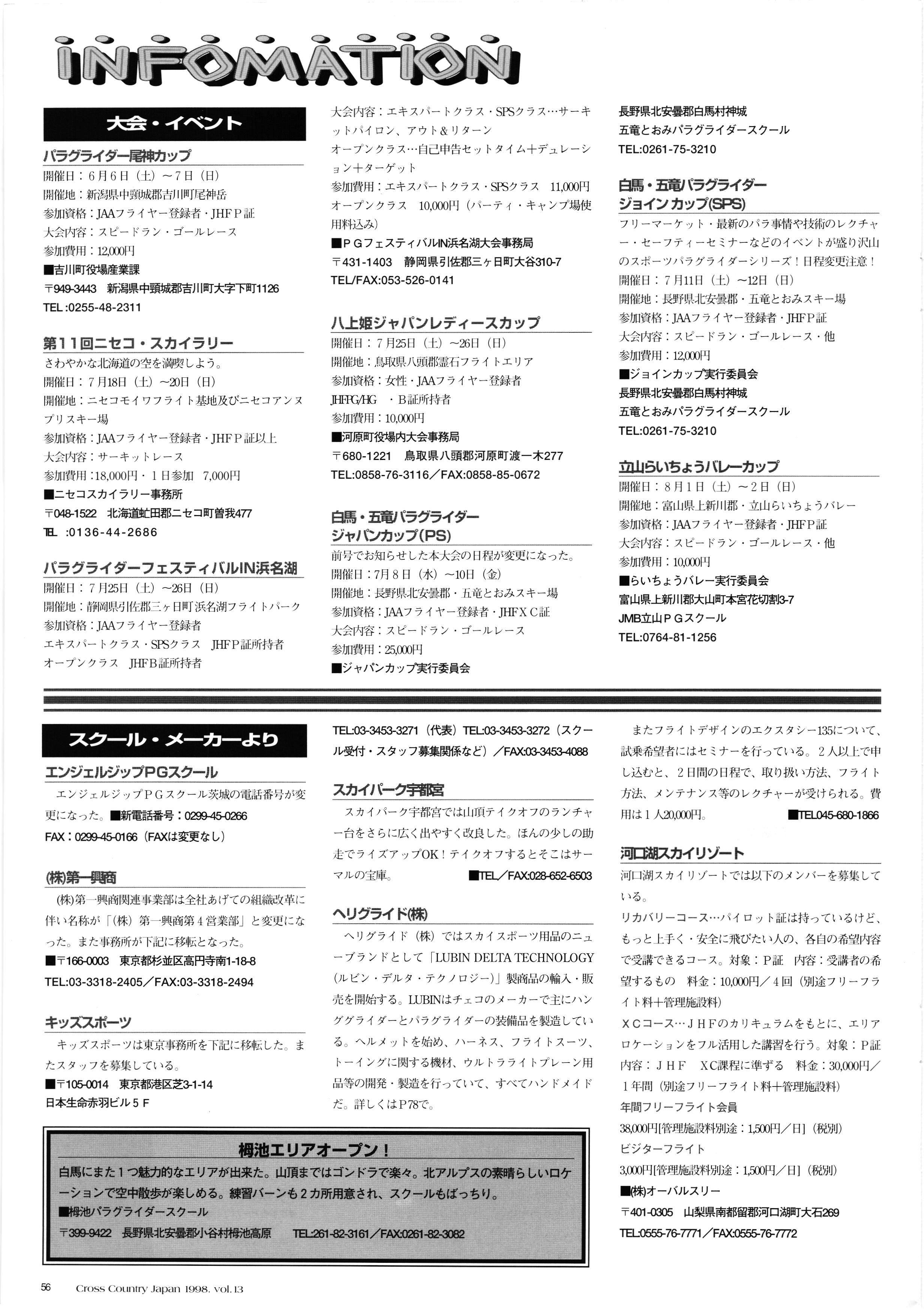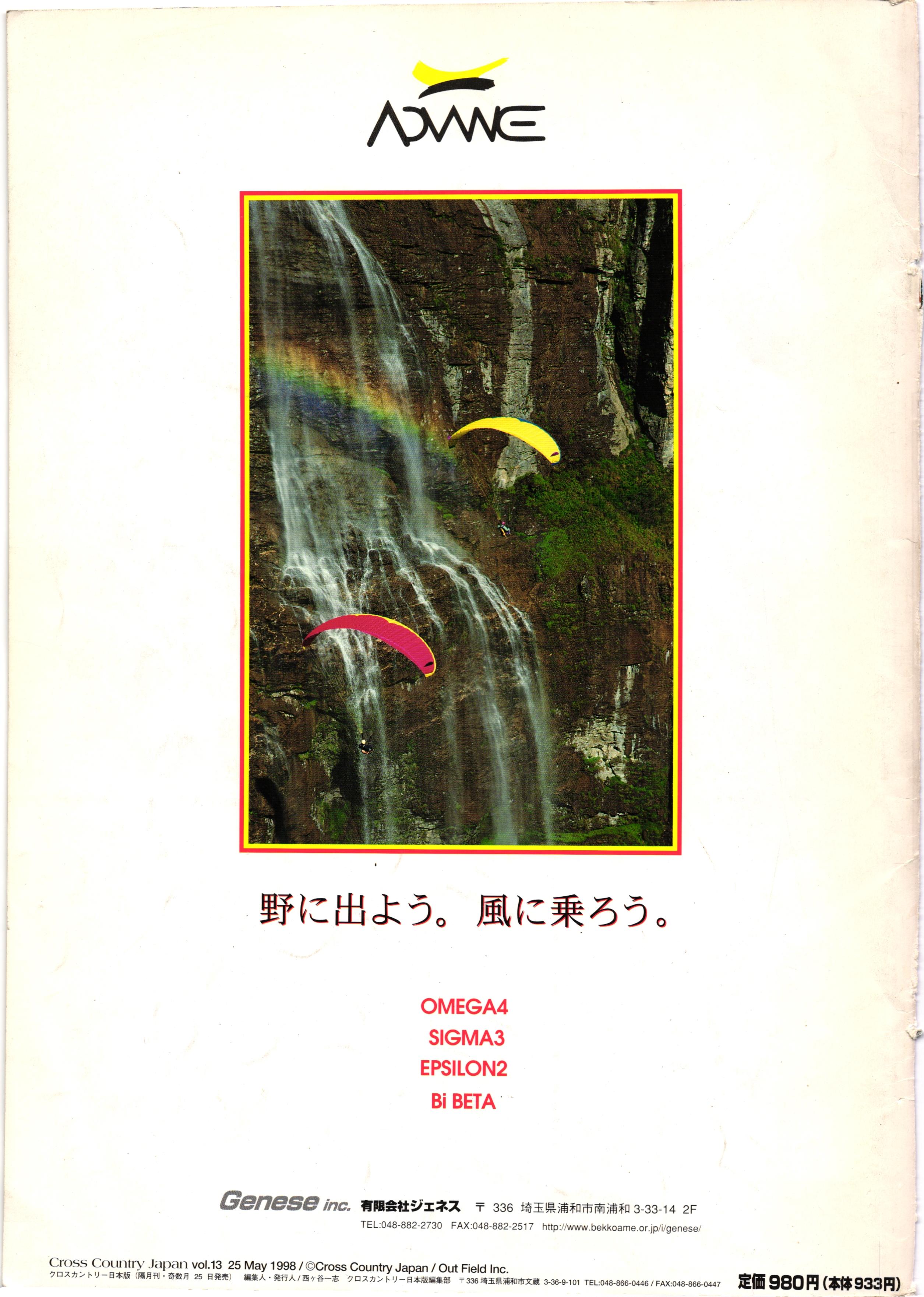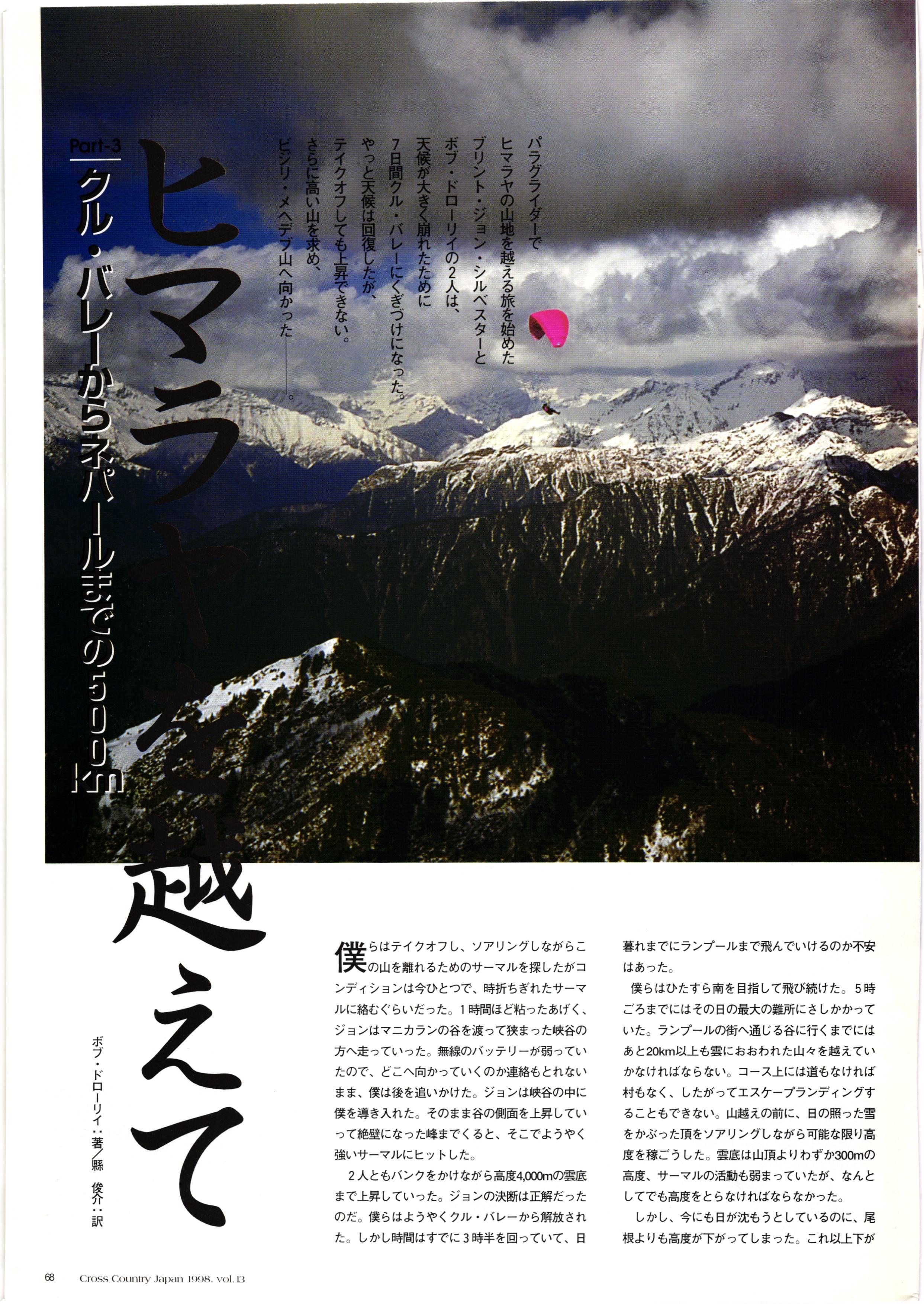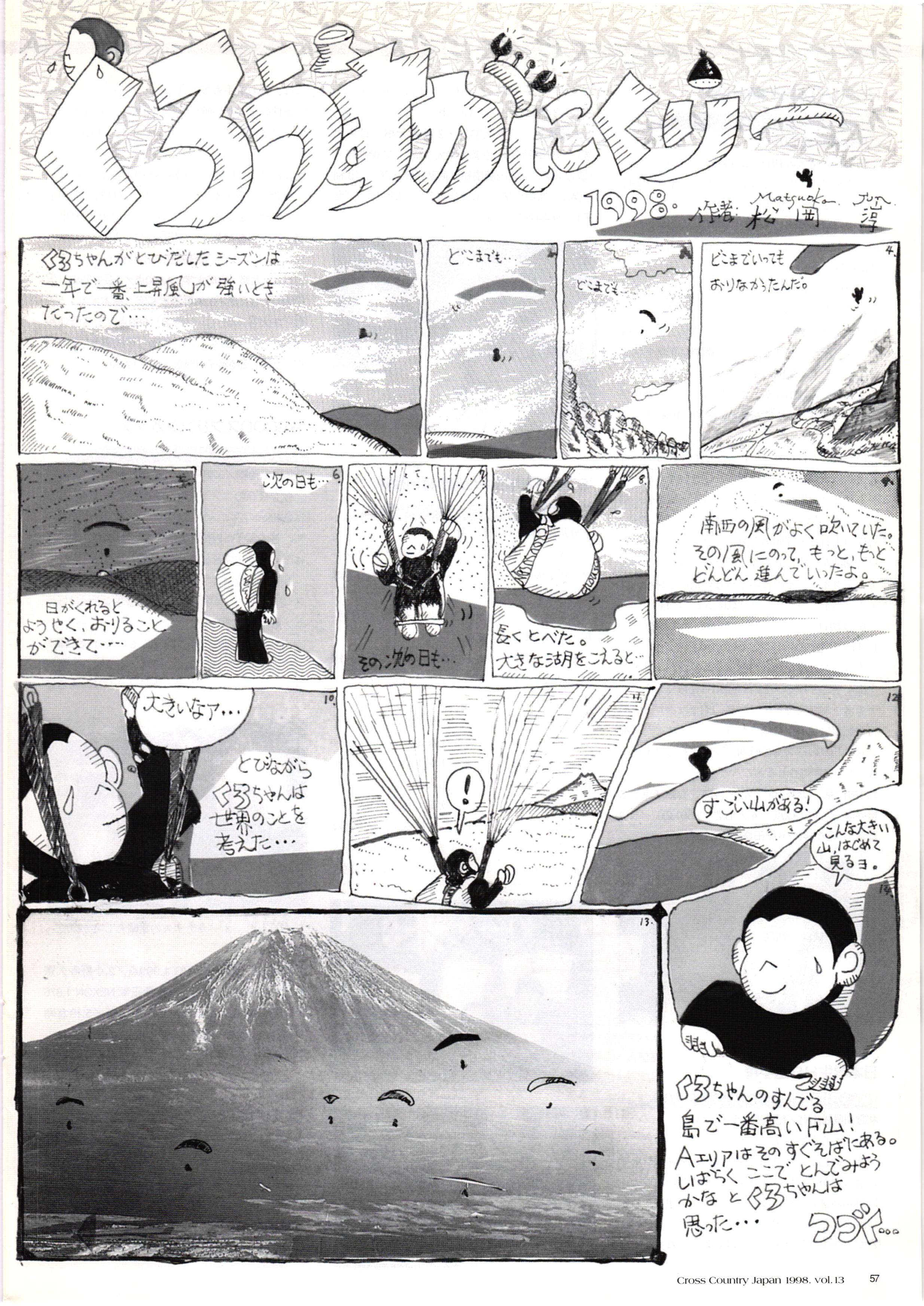 きれい CrOSS Country FREE FLIGHT MAGAZINE CONTENTS クロスカントリー日本版・13号 1998 MAY 25 Vol.13 2 あん リンク インター なんとか 4 ZOOM ...... FREE FLIGHT '98 .. ループ新記録 ... .. クロスカントリー・トロフィー ... 8 おまけ品 2017 0_ おきたいな ながる ..... I ............ 7 8 0 TO ITALIA .............. 雲底への道・ AREA NEWS 松ちゃんのお天気知恵袋 ............ 流行もの屋・べりぐっ堂 ファイナルグライド 新・PG TECHNIQUE 目からウロコのお助けテクニック...... WORLD NEWS .......... .. ...... 新・HG TECHNIQUE 田中栄一のテイクオフ・スパイス ....... .............. 4 % 3 ブルース・ゴールドスミス .............. .......... PG GLIDER TEST APCO SIERRA HG日本選手権 翼は語る・フライト史の証人 安次嶺 勉 HG GLIDER TEST La mouette TOPLESS ............. ........... ......... CALENDAR... DEVELOPMENT スピードメーター ..... 男・貢の正しいハング道 ............ INFORMATION. COMIC くろうすかにくり一 ... COMPETITION 大会結果 MEDIA MIX 空飛ぶWEB SITE 探検隊 ... FORUM 読者と編集部の愛の架け橋 ...... ... EVENT 業界初! クラシックグライダー・レースもありました .........65 パラグライダー・ウインターカップ IN 木島 平 .........................68 中国 ヒマラヤを越えて PART-3 . HI PERSPECTIVE ベイヤーの秘密 ..............71 BO ※ Kawa 雲は天才である ここで飛びたい・河口湖スカイリゾート・ NEW PRODUCTS ............ CCJ バックナンバーのご紹介... Ph; David Varilek Montage;Bowen Wei ●ランディングアプローチに入るオレッグ。 WHGSサンタンドレにて おい Cross Country Japan 1998. vol.13