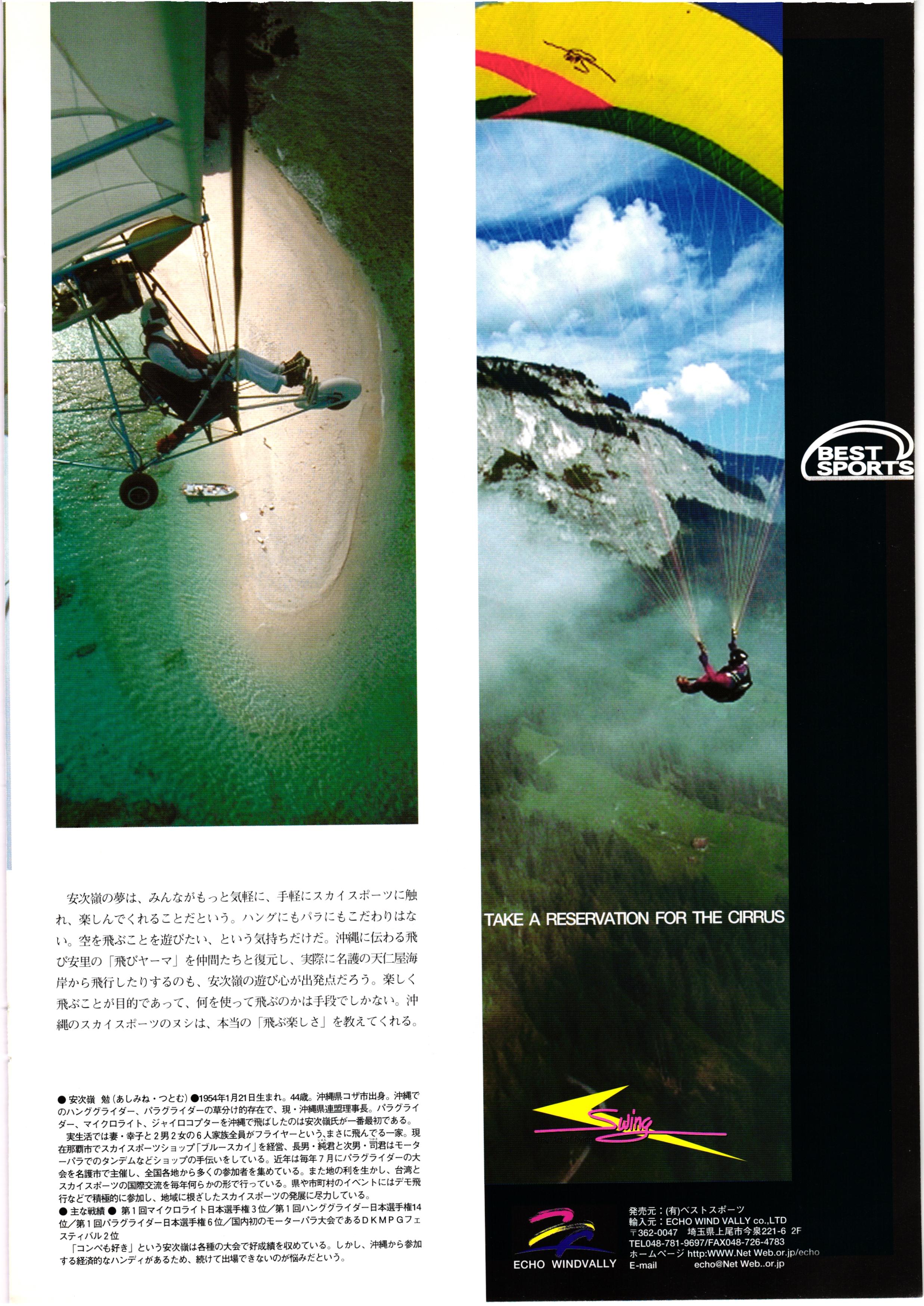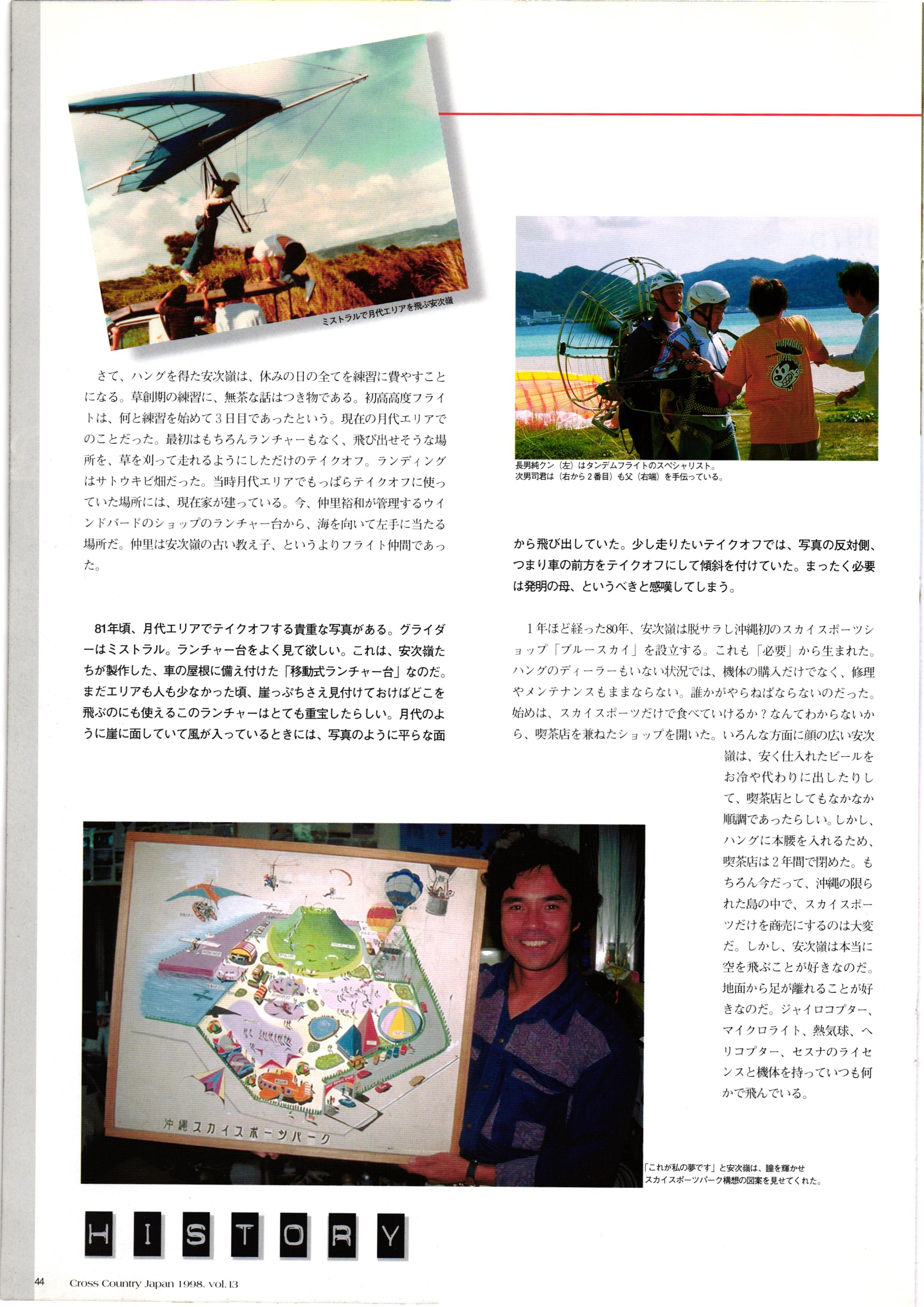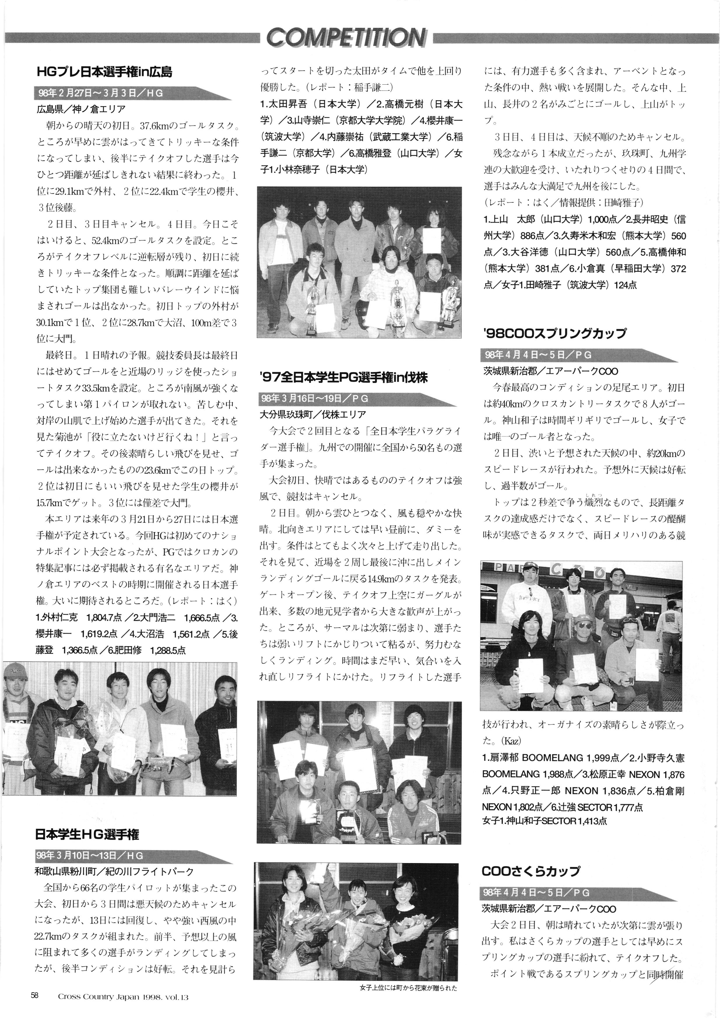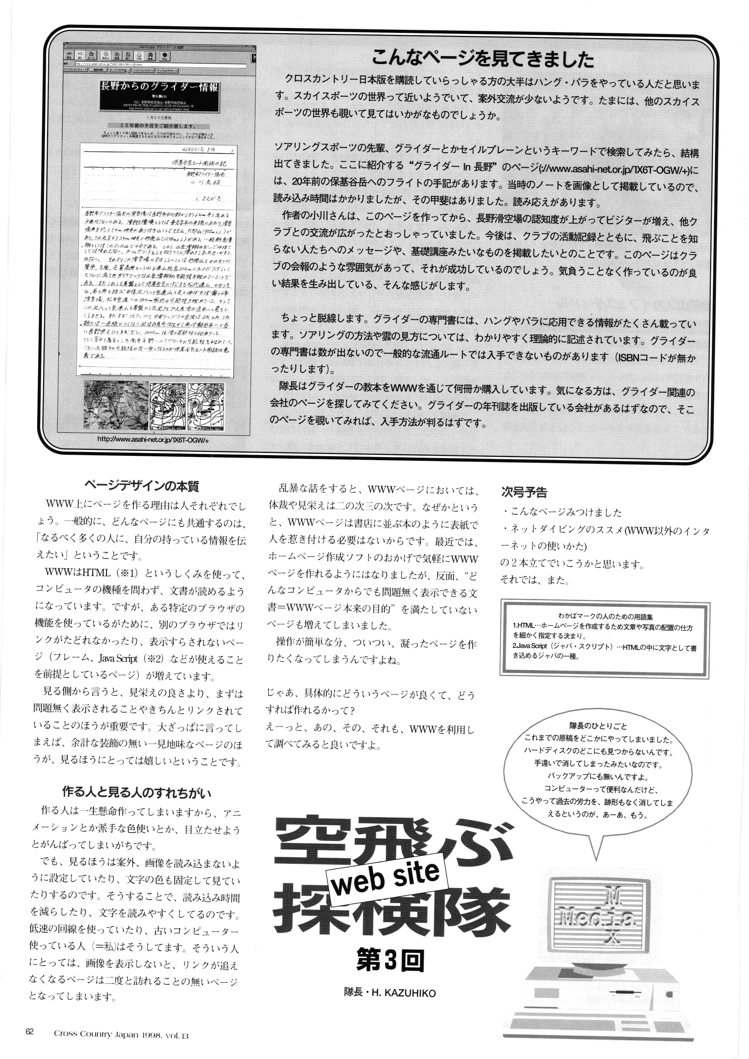 きれい CrOSS Country FREE FLIGHT MAGAZINE CONTENTS クロスカントリー日本版・13号 1998 MAY 25 Vol.13 2 あん リンク インター なんとか 4 ZOOM ...... FREE FLIGHT '98 .. ループ新記録 ... .. クロスカントリー・トロフィー ... 8 おまけ品 2017 0_ おきたいな ながる ..... I ............ 7 8 0 TO ITALIA .............. 雲底への道・ AREA NEWS 松ちゃんのお天気知恵袋 ............ 流行もの屋・べりぐっ堂 ファイナルグライド 新・PG TECHNIQUE 目からウロコのお助けテクニック...... WORLD NEWS .......... .. ...... 新・HG TECHNIQUE 田中栄一のテイクオフ・スパイス ....... .............. 4 % 3 ブルース・ゴールドスミス .............. .......... PG GLIDER TEST APCO SIERRA HG日本選手権 翼は語る・フライト史の証人 安次嶺 勉 HG GLIDER TEST La mouette TOPLESS ............. ........... ......... CALENDAR... DEVELOPMENT スピードメーター ..... 男・貢の正しいハング道 ............ INFORMATION. COMIC くろうすかにくり一 ... COMPETITION 大会結果 MEDIA MIX 空飛ぶWEB SITE 探検隊 ... FORUM 読者と編集部の愛の架け橋 ...... ... EVENT 業界初! クラシックグライダー・レースもありました .........65 パラグライダー・ウインターカップ IN 木島 平 .........................68 中国 ヒマラヤを越えて PART-3 . HI PERSPECTIVE ベイヤーの秘密 ..............71 BO ※ Kawa 雲は天才である ここで飛びたい・河口湖スカイリゾート・ NEW PRODUCTS ............ CCJ バックナンバーのご紹介... Ph; David Varilek Montage;Bowen Wei ●ランディングアプローチに入るオレッグ。 WHGSサンタンドレにて おい Cross Country Japan 1998. vol.13