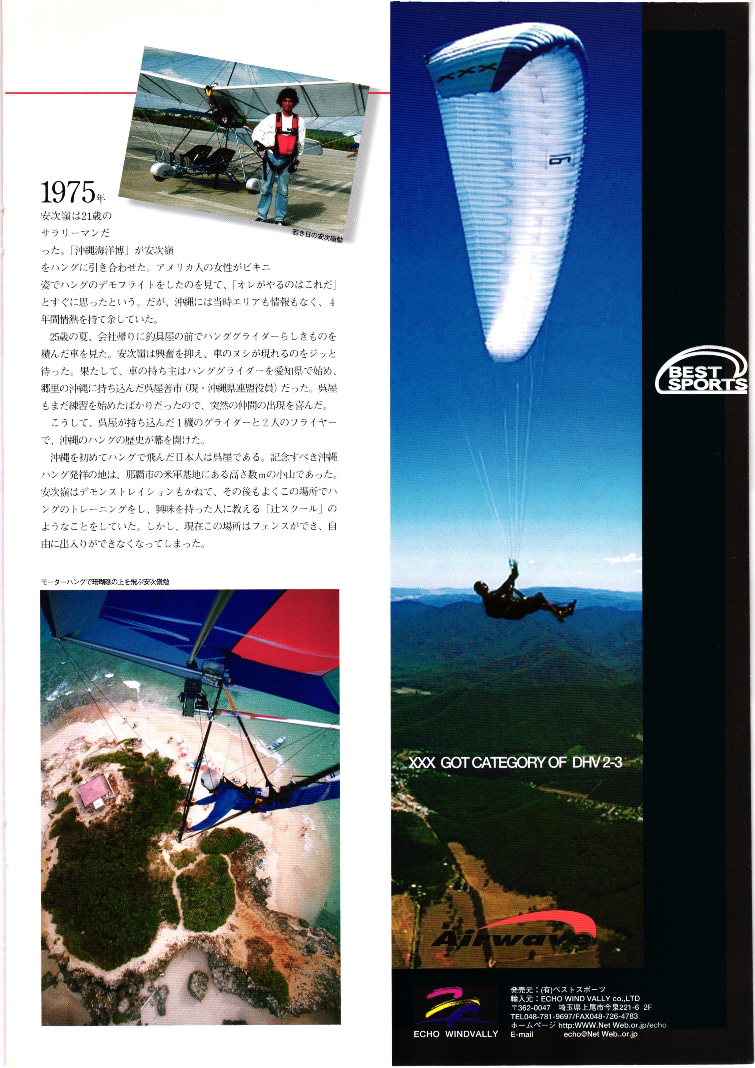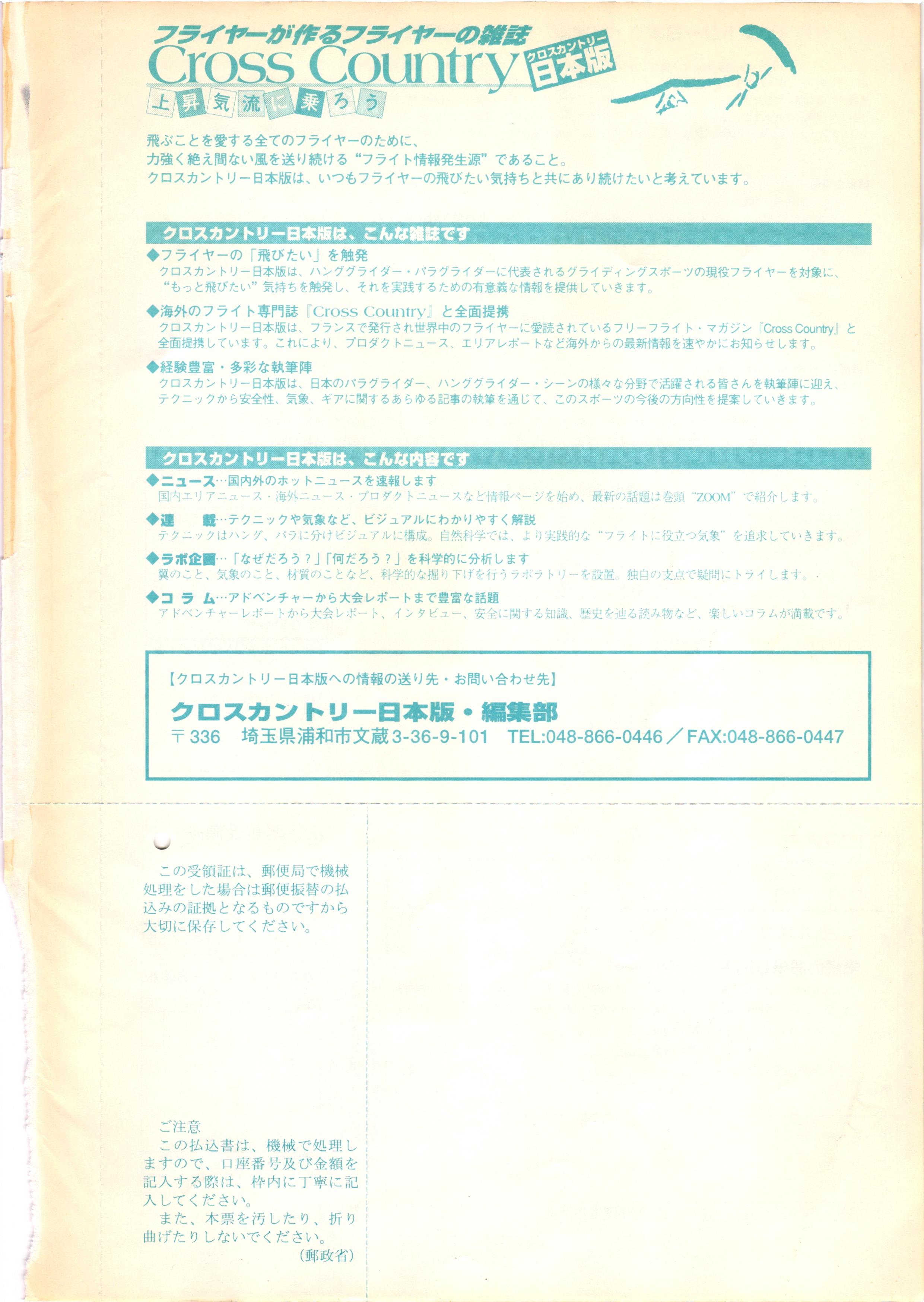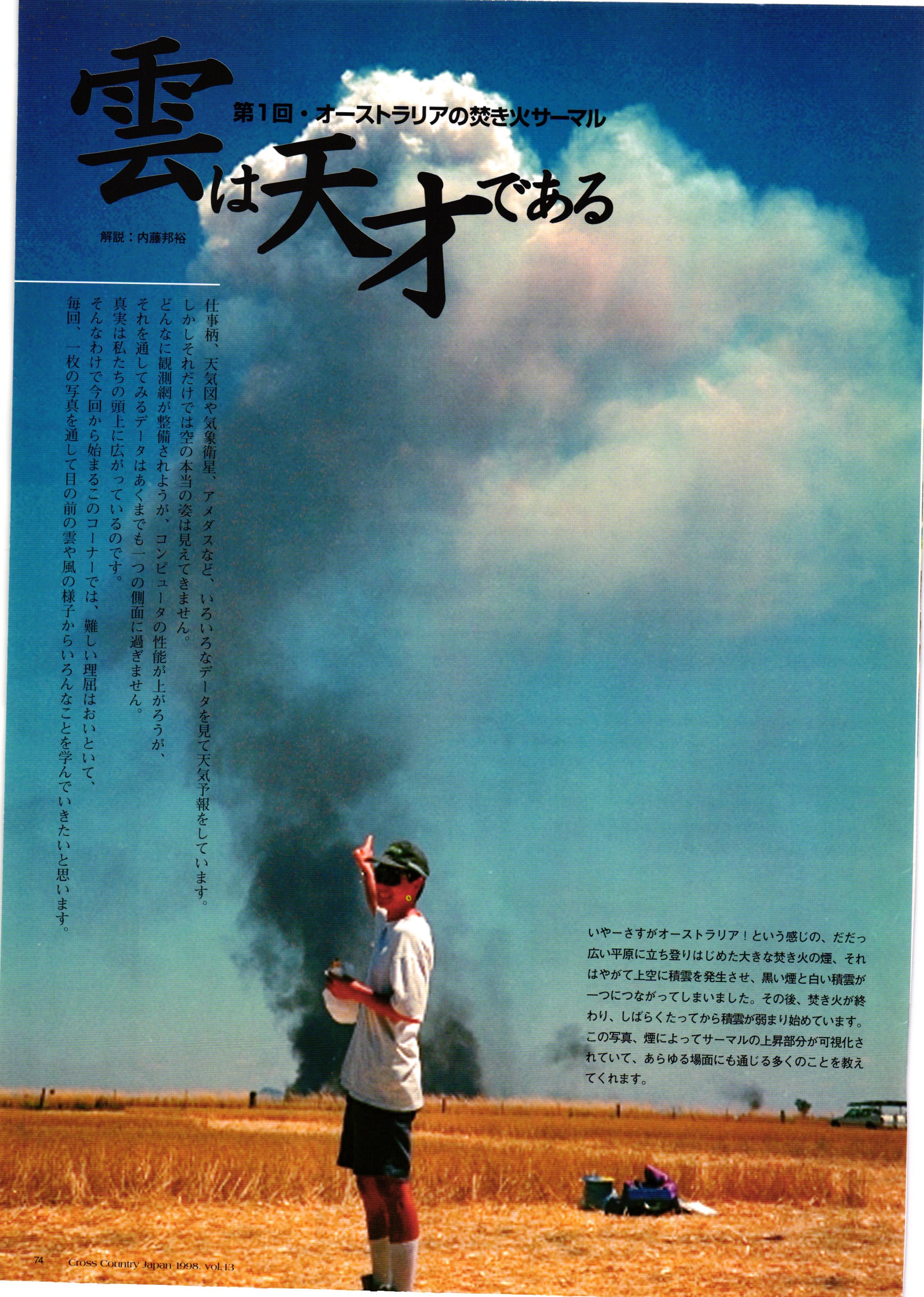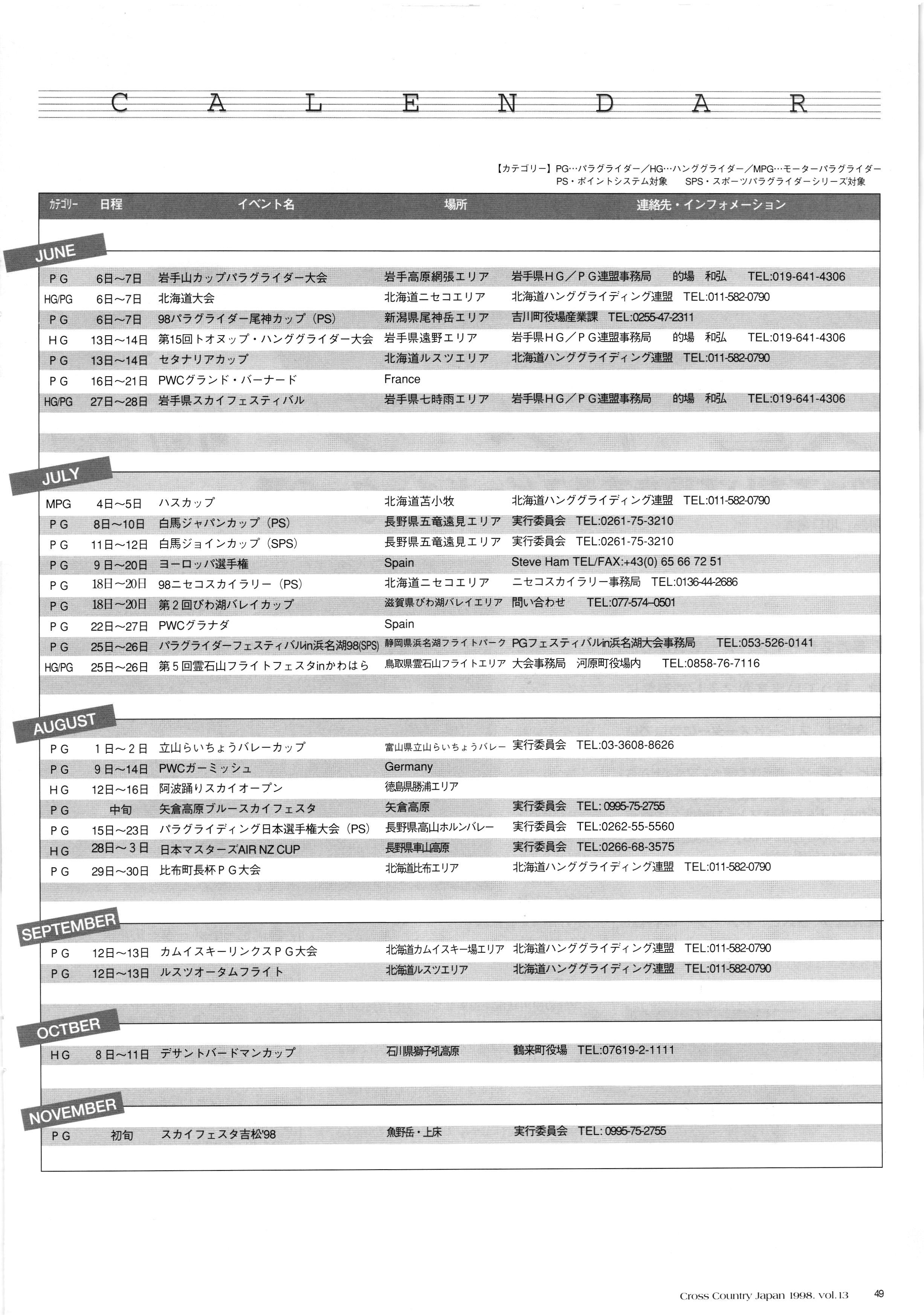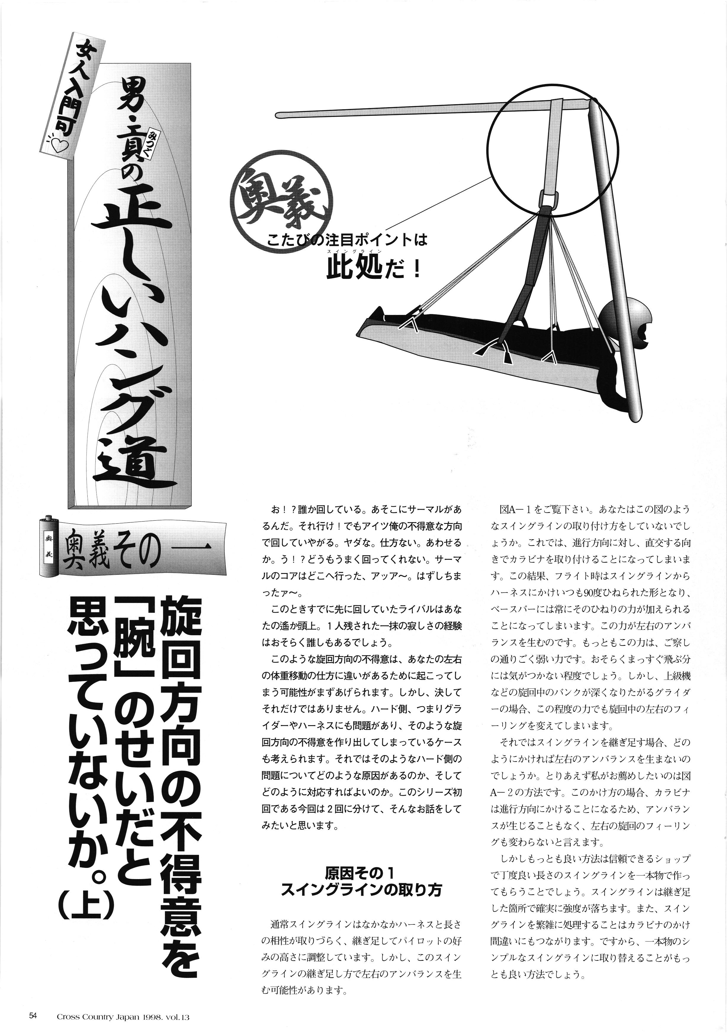 きれい CrOSS Country FREE FLIGHT MAGAZINE CONTENTS クロスカントリー日本版・13号 1998 MAY 25 Vol.13 2 あん リンク インター なんとか 4 ZOOM ...... FREE FLIGHT '98 .. ループ新記録 ... .. クロスカントリー・トロフィー ... 8 おまけ品 2017 0_ おきたいな ながる ..... I ............ 7 8 0 TO ITALIA .............. 雲底への道・ AREA NEWS 松ちゃんのお天気知恵袋 ............ 流行もの屋・べりぐっ堂 ファイナルグライド 新・PG TECHNIQUE 目からウロコのお助けテクニック...... WORLD NEWS .......... .. ...... 新・HG TECHNIQUE 田中栄一のテイクオフ・スパイス ....... .............. 4 % 3 ブルース・ゴールドスミス .............. .......... PG GLIDER TEST APCO SIERRA HG日本選手権 翼は語る・フライト史の証人 安次嶺 勉 HG GLIDER TEST La mouette TOPLESS ............. ........... ......... CALENDAR... DEVELOPMENT スピードメーター ..... 男・貢の正しいハング道 ............ INFORMATION. COMIC くろうすかにくり一 ... COMPETITION 大会結果 MEDIA MIX 空飛ぶWEB SITE 探検隊 ... FORUM 読者と編集部の愛の架け橋 ...... ... EVENT 業界初! クラシックグライダー・レースもありました .........65 パラグライダー・ウインターカップ IN 木島 平 .........................68 中国 ヒマラヤを越えて PART-3 . HI PERSPECTIVE ベイヤーの秘密 ..............71 BO ※ Kawa 雲は天才である ここで飛びたい・河口湖スカイリゾート・ NEW PRODUCTS ............ CCJ バックナンバーのご紹介... Ph; David Varilek Montage;Bowen Wei ●ランディングアプローチに入るオレッグ。 WHGSサンタンドレにて おい Cross Country Japan 1998. vol.13