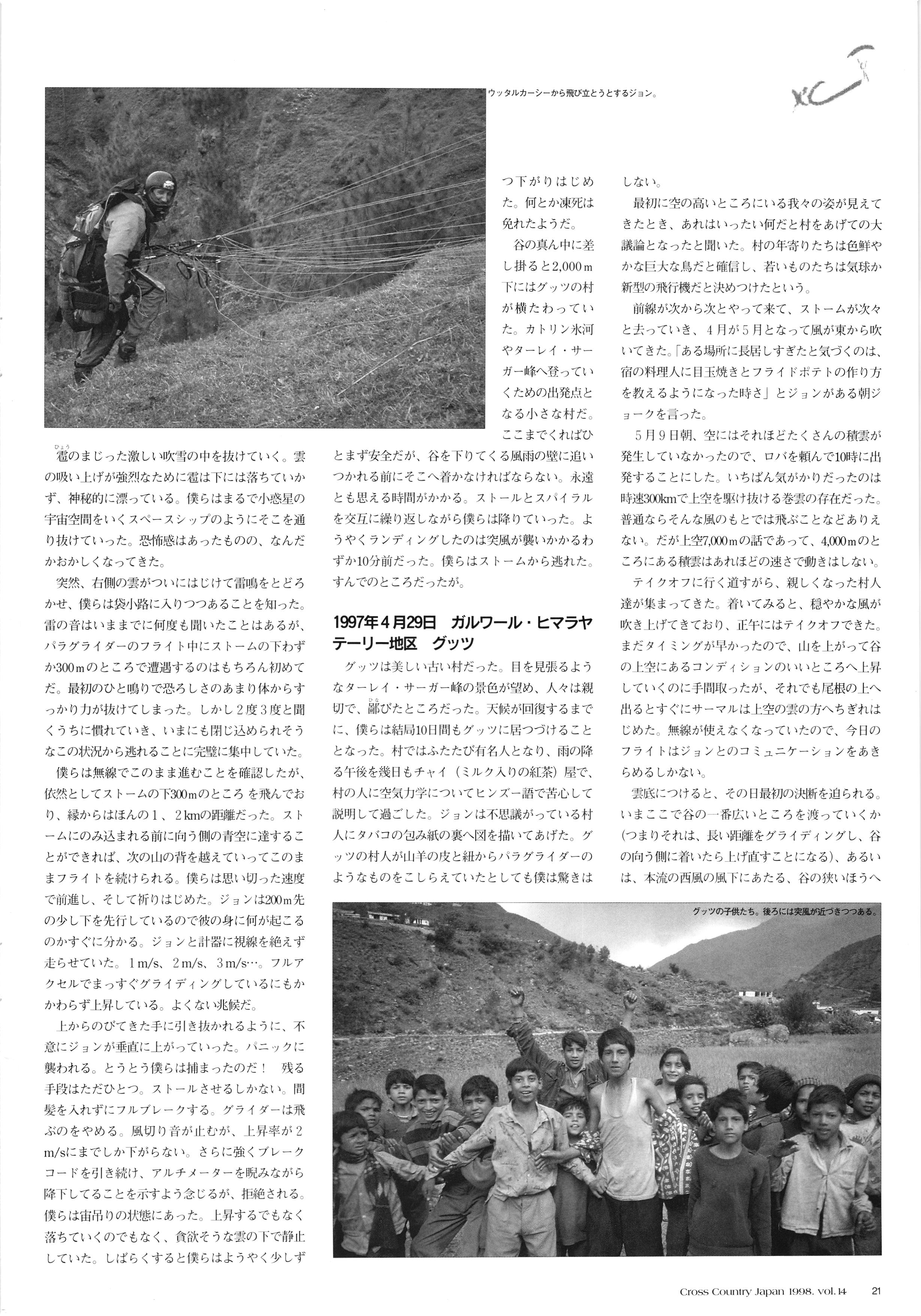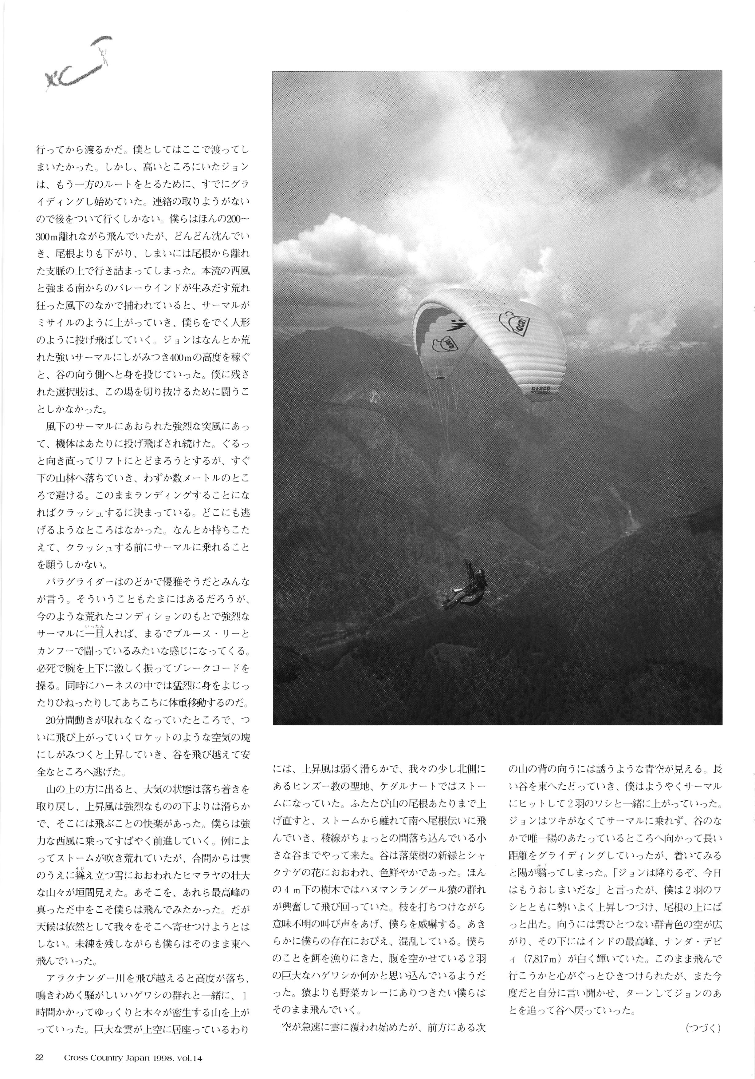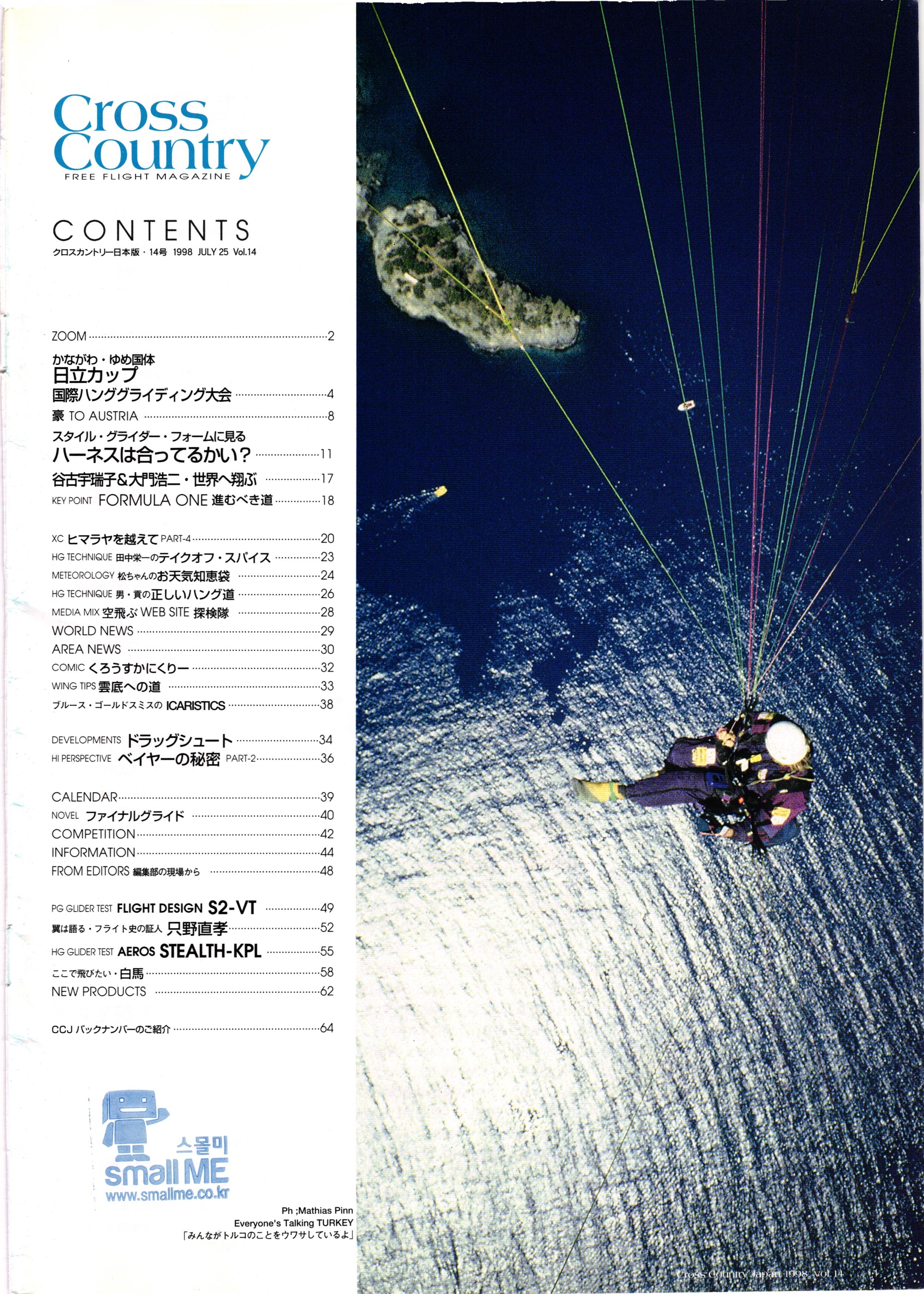 Cross Country FREE FLIGHT MAGAZINE CONTENTS クロスカントリー日本版・14号 1998 JULY 25 Vol.14 ZOOM かながわ・ゆめ国体、 日立カップ 国際ハンググライディング大会・ # TO AUSTRIA スタイル・グライダー・フォームに見る ハーネスは合ってるかい? 谷古宇瑞子&大浩二・世界へ翔ぶ... KEY POINT FORMULA ONE 進むべき道 .... .................8 ............... XC ヒマラヤを越えて PART-4...... HG TECHNIQUE 田中栄一のテイクオフ・スパイス ... METEOROLOGY 松ちゃんのお天気知恵袋 .......... HG TECHNIQUE 男・貢の正しいハング道 MEDIA MIX 空飛ぶ WEB SITE 探検隊 WORLD NEWS AREA NEWS ............. COMIC くろうすかにくりー... .............. WING TIPS 雲底への道 ............... ブルース・ゴールドスミスの ICARISTICS ...... ・ ・・・・・・・ ・・・・・・・ DEVELOPMENTS ドラッグシュート .... HI PERSPECTIVE ベイヤーの秘密 PART-2...... ...... CALENDAR NOVEL ファイナルグライド .... COMPETITION. INFORMATION... FROM EDITORS 編集部の現場から ....... ............. ........ ...... PG GLIDER TEST FLIGHT DESIGN S2-VT 翼は語る・フライト史の証人 只野直孝...... HG GLIDER TEST AEROS STEALTH-KPL ........... ここで飛びたい・白馬... NEW PRODUCTS CCJ バックナンバーのご紹介...... 口 Small ME www.smallme.co.kr Ph ;Mathias Pinn Everyone's Talking TURKEY 「みんながトルコのことをウワサしているよ」 45 ountry Japan 1998.VOL121