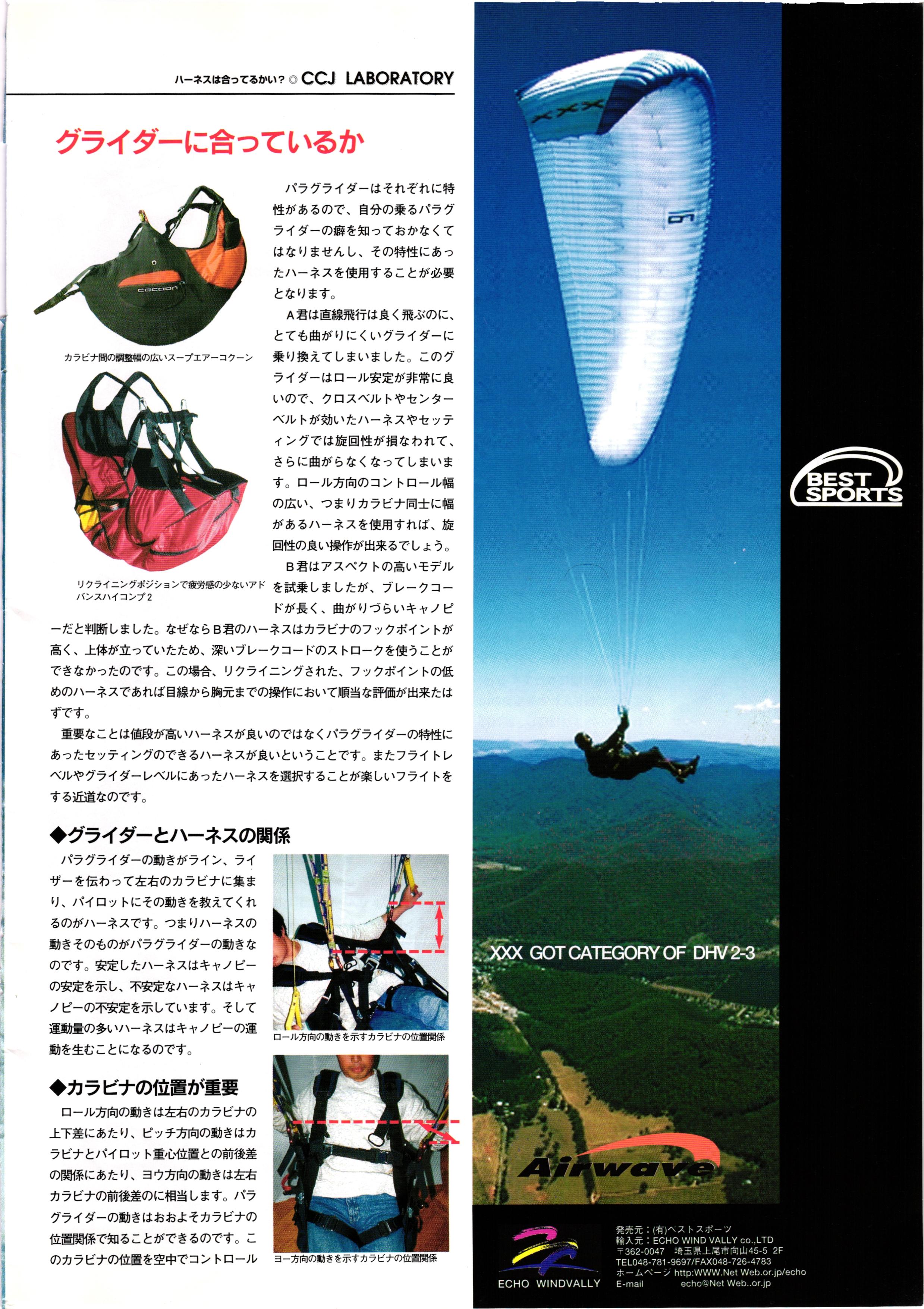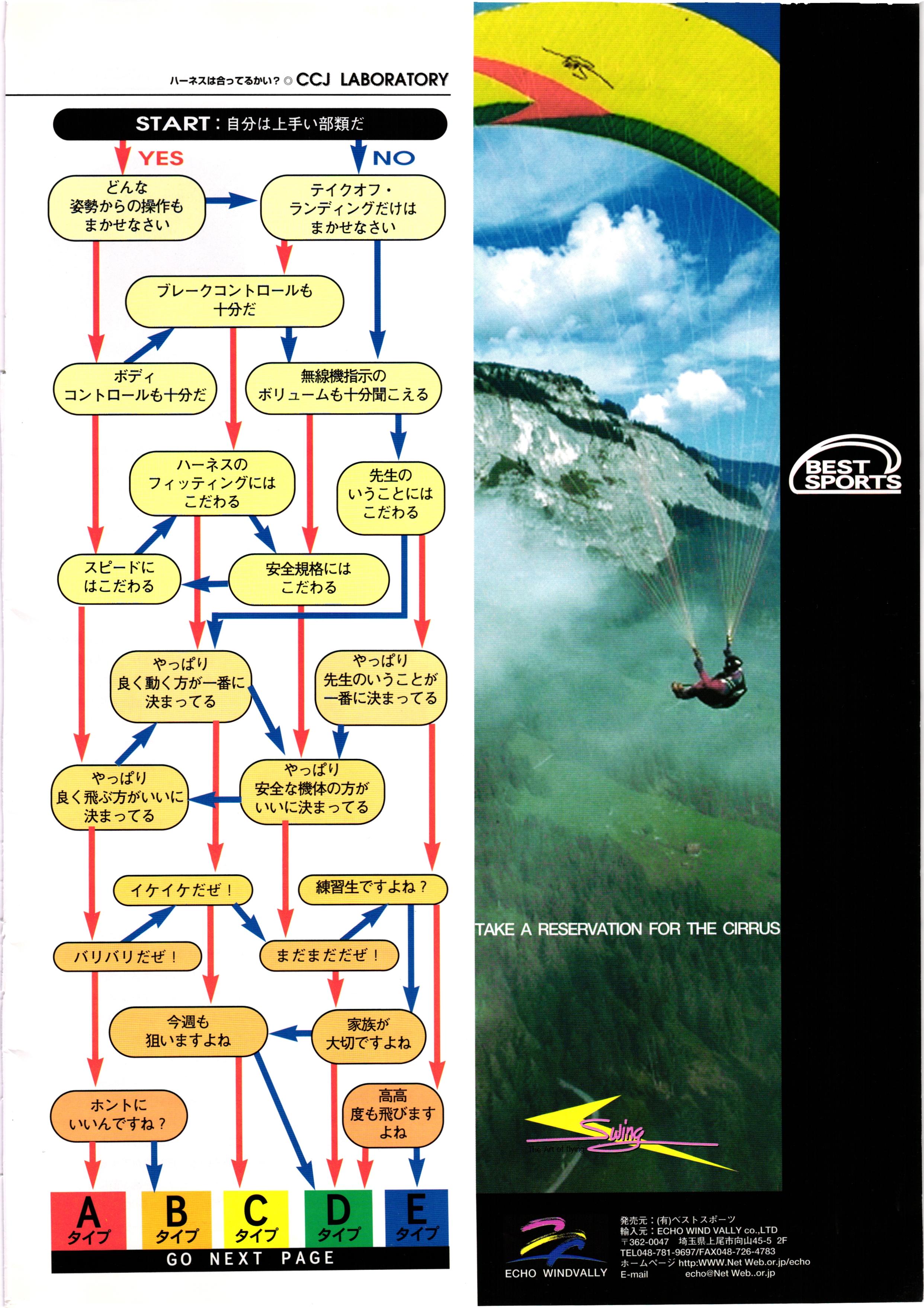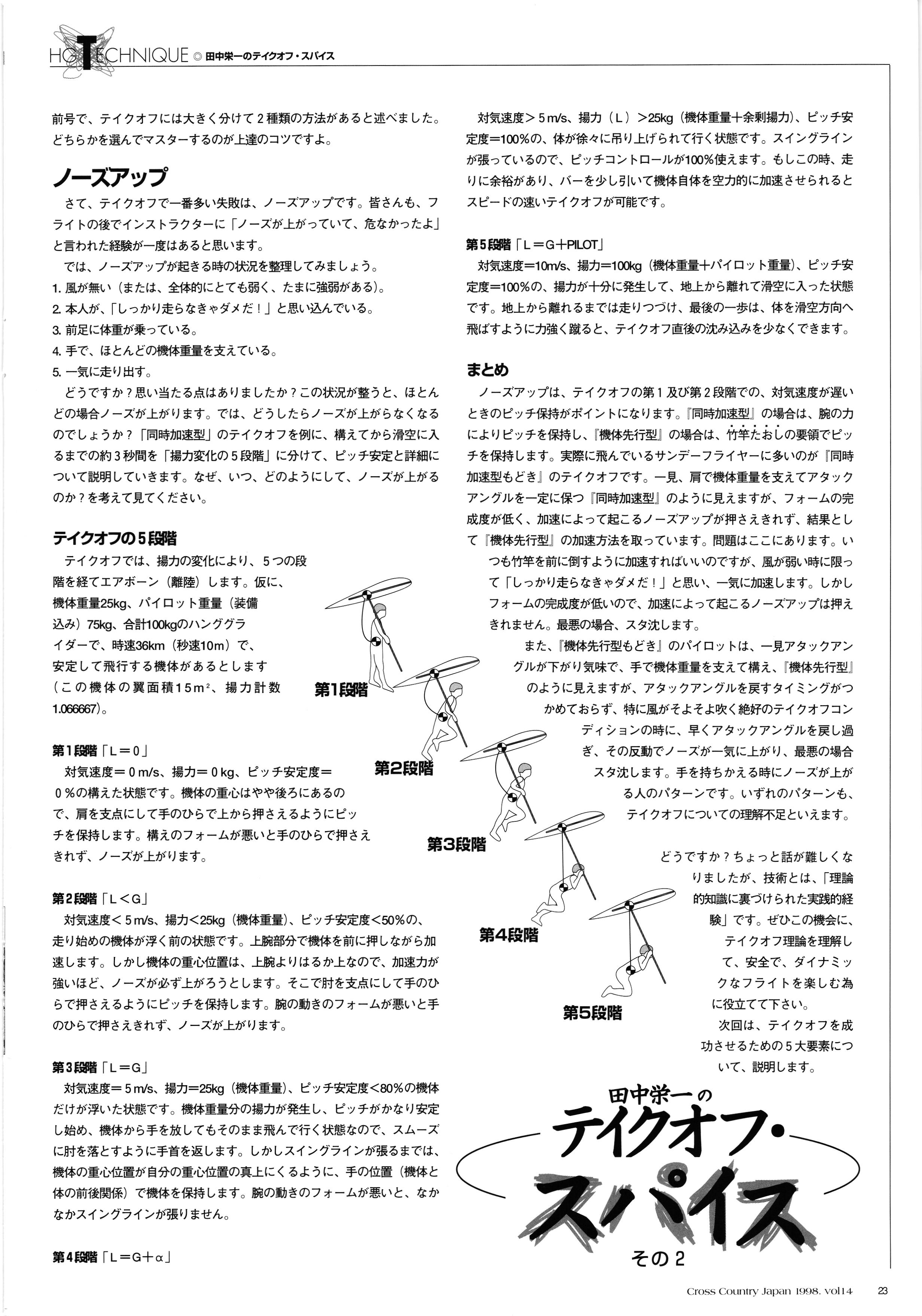 Cross Country FREE FLIGHT MAGAZINE CONTENTS クロスカントリー日本版・14号 1998 JULY 25 Vol.14 ZOOM かながわ・ゆめ国体、 日立カップ 国際ハンググライディング大会・ # TO AUSTRIA スタイル・グライダー・フォームに見る ハーネスは合ってるかい? 谷古宇瑞子&大浩二・世界へ翔ぶ... KEY POINT FORMULA ONE 進むべき道 .... .................8 ............... XC ヒマラヤを越えて PART-4...... HG TECHNIQUE 田中栄一のテイクオフ・スパイス ... METEOROLOGY 松ちゃんのお天気知恵袋 .......... HG TECHNIQUE 男・貢の正しいハング道 MEDIA MIX 空飛ぶ WEB SITE 探検隊 WORLD NEWS AREA NEWS ............. COMIC くろうすかにくりー... .............. WING TIPS 雲底への道 ............... ブルース・ゴールドスミスの ICARISTICS ...... ・ ・・・・・・・ ・・・・・・・ DEVELOPMENTS ドラッグシュート .... HI PERSPECTIVE ベイヤーの秘密 PART-2...... ...... CALENDAR NOVEL ファイナルグライド .... COMPETITION. INFORMATION... FROM EDITORS 編集部の現場から ....... ............. ........ ...... PG GLIDER TEST FLIGHT DESIGN S2-VT 翼は語る・フライト史の証人 只野直孝...... HG GLIDER TEST AEROS STEALTH-KPL ........... ここで飛びたい・白馬... NEW PRODUCTS CCJ バックナンバーのご紹介...... 口 Small ME www.smallme.co.kr Ph ;Mathias Pinn Everyone's Talking TURKEY 「みんながトルコのことをウワサしているよ」 45 ountry Japan 1998.VOL121