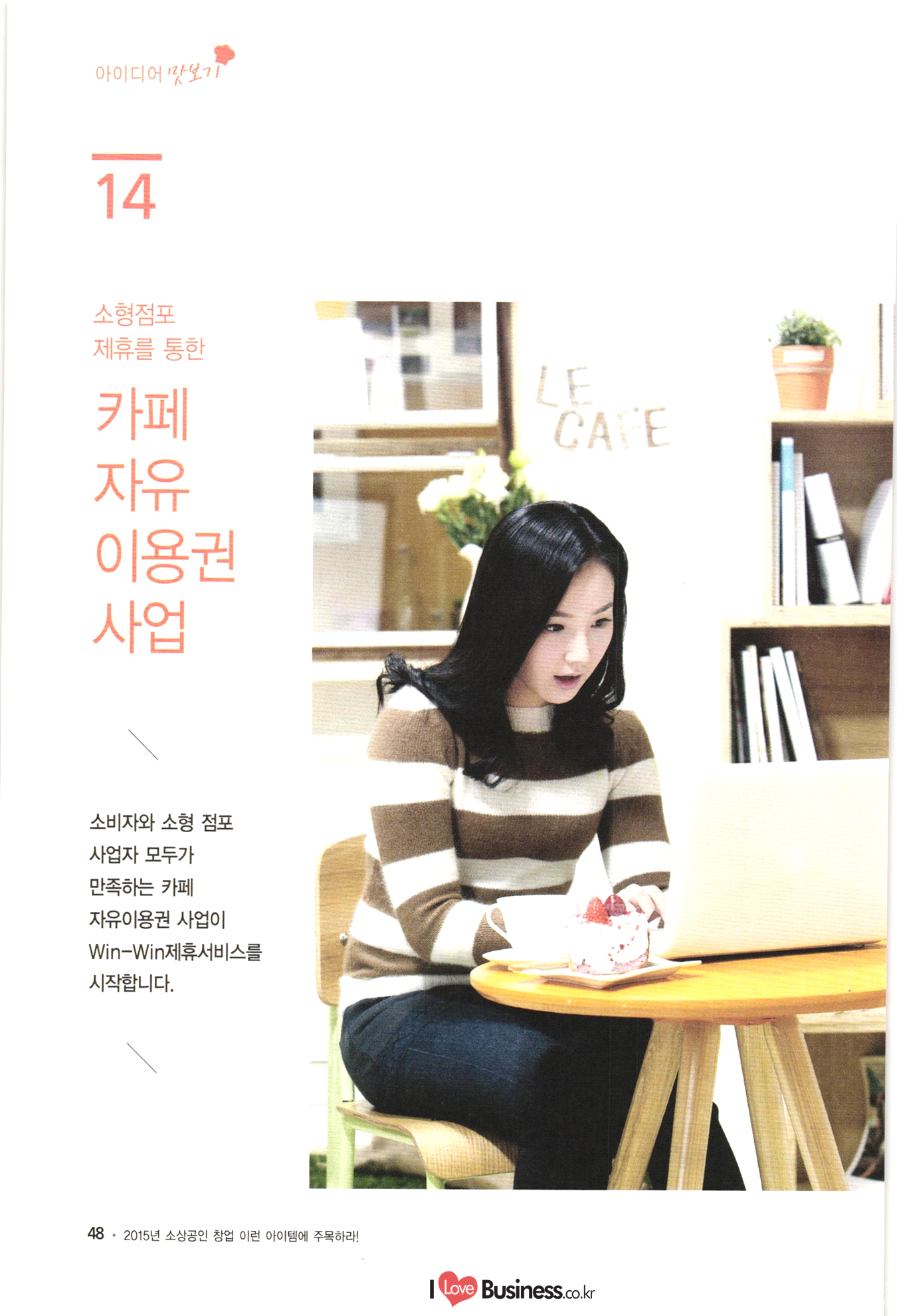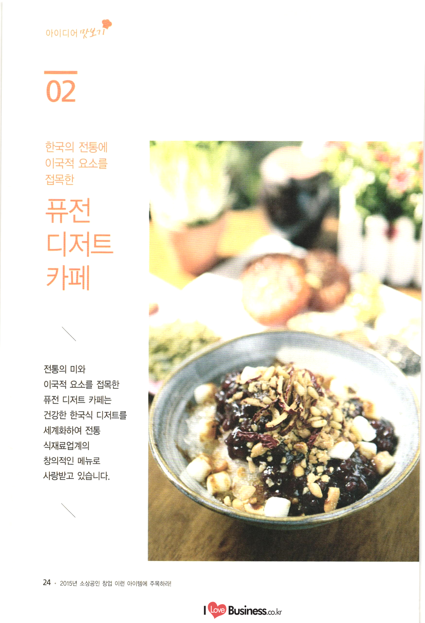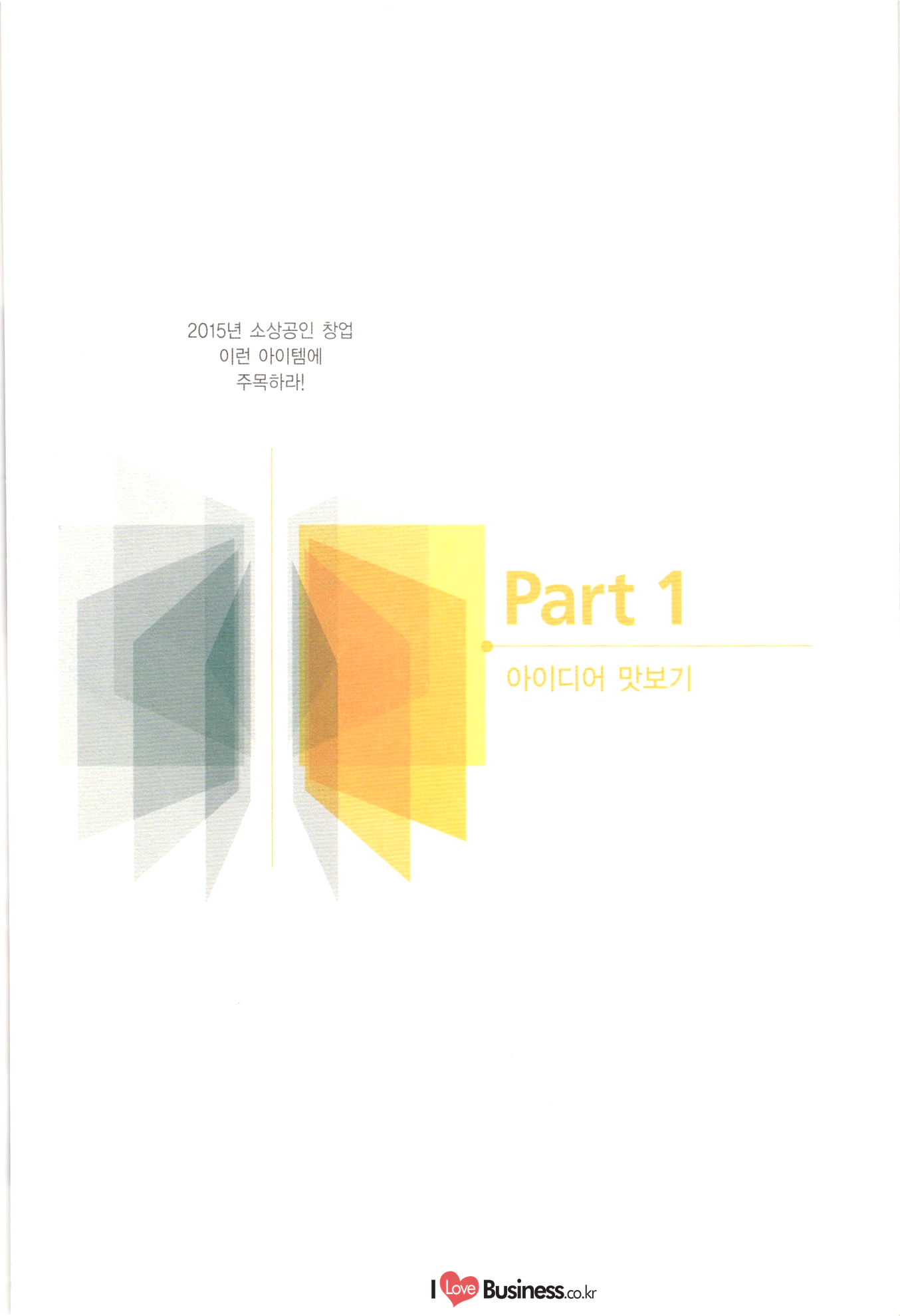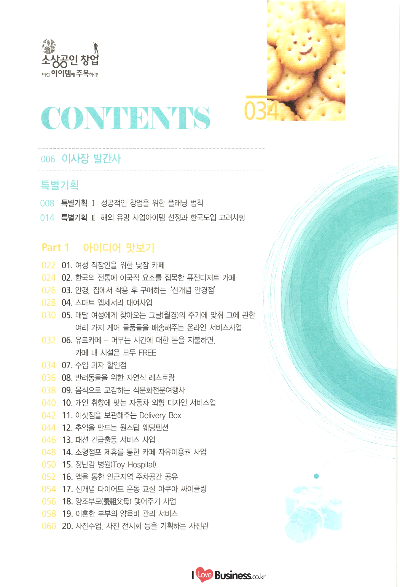 | 소상공인 창업 이런 아이템에 주목하라! CONTENTS BY 006 이사장 발간사 특별기획 008 특별기획 성공적인 창업을 위한 플래닝 법칙 1014 특별기획 III 해외 유망 사업아이템 선정과 한국도입 고려사항 Part 1 아이디어 맛보기 1022 01. 여성 직장인을 위한 낮잠 카페 1024 02. 한국의 전통에 이국적 요소를 접목한 퓨전디저트 카페 1026 03. 안경, 집에서 착용 후 구매하는 '신개념 안경점 1028 04. 스마트 앱세서리 대여사업 1030 05. 매달 여성에게 찾아오는 그날(월경)의 주기에 맞춰 그에 관한 여러 가지 케어 물품들을 배송해주는 온라인 서비스사업 1032 06. 유료카페 - 머무는 시간에 대한 돈을 지불하면, 카페 내 시설은 모두 FREE 1034 07. 수입 과자 할인점 1036 08. 반려동물을 위한 자연식 레스토랑 1038 09. 음식으로 교감하는 식문화전문여행사 1040 10. 개인 취향에 맞는 자동차 외형 디자인 서비스업 1042 11. 이삿짐을 보관해주는 Delivery Box 1044 12. 추억을 만드는 원스탑 웨딩펜션 046 13. 패션 긴급출동 서비스 사업 1048 14. 소형점포 제휴를 통한 카페 자유이용권 사업 1050 15. 장난감 병원(Toy Hospital) 1052 16. 앱을 통한 인근지역 주차공간 공유 1054 17. 신개념 다이어트 운동 교실 아쿠아 싸이클링 1056 18. 양조부모(養祖父母) 맺어주기 사업 1058 19. 이혼한 부부의 양육비 관리 서비스 1060 20. 사진수업, 사진 전시회 등을 기획하는 사진관 |