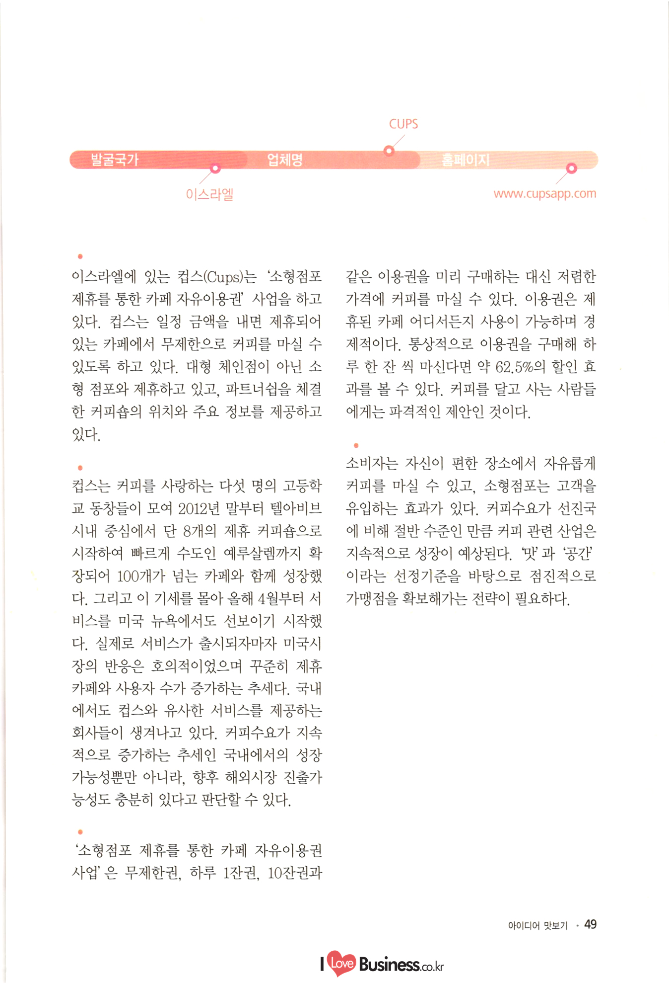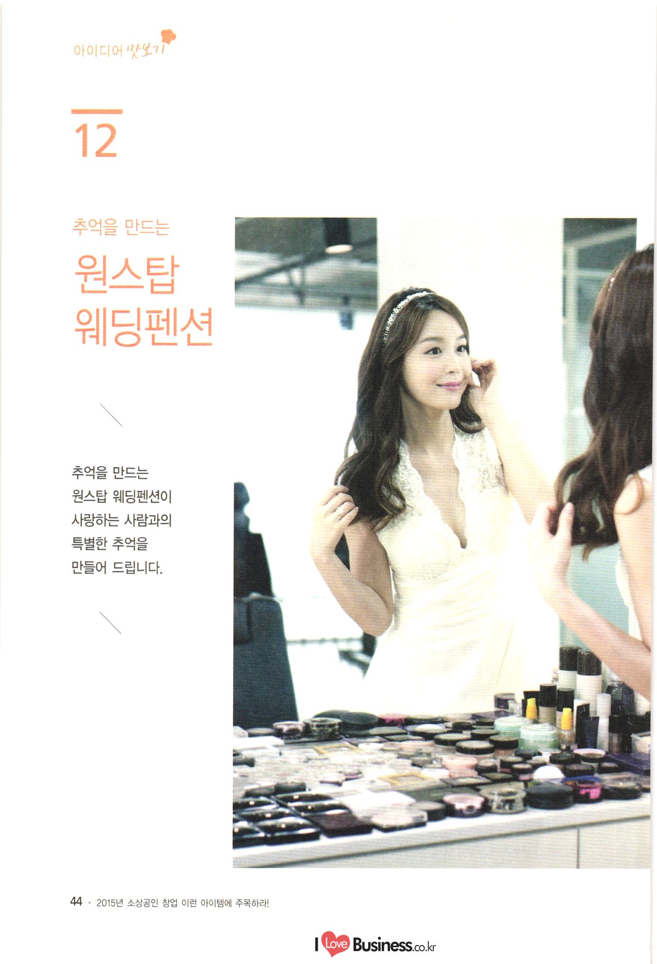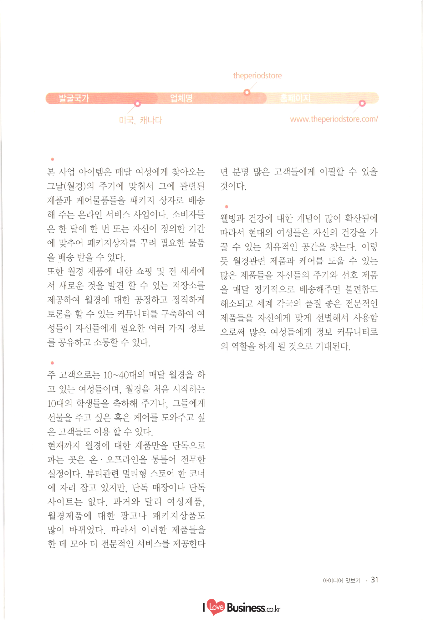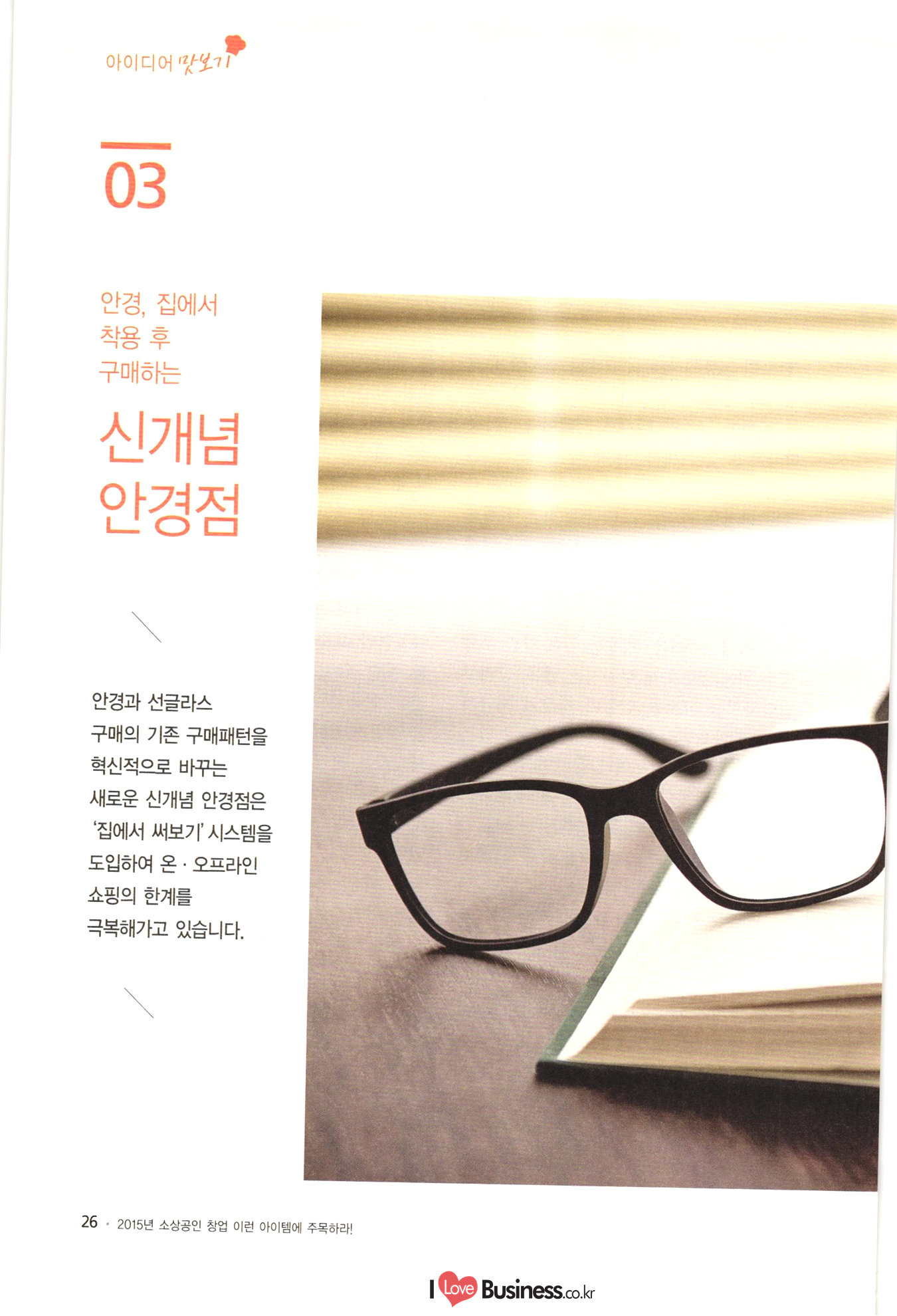 | 소상공인 창업 이런 아이템에 주목하라! CONTENTS BY 006 이사장 발간사 특별기획 008 특별기획 성공적인 창업을 위한 플래닝 법칙 1014 특별기획 III 해외 유망 사업아이템 선정과 한국도입 고려사항 Part 1 아이디어 맛보기 1022 01. 여성 직장인을 위한 낮잠 카페 1024 02. 한국의 전통에 이국적 요소를 접목한 퓨전디저트 카페 1026 03. 안경, 집에서 착용 후 구매하는 '신개념 안경점 1028 04. 스마트 앱세서리 대여사업 1030 05. 매달 여성에게 찾아오는 그날(월경)의 주기에 맞춰 그에 관한 여러 가지 케어 물품들을 배송해주는 온라인 서비스사업 1032 06. 유료카페 - 머무는 시간에 대한 돈을 지불하면, 카페 내 시설은 모두 FREE 1034 07. 수입 과자 할인점 1036 08. 반려동물을 위한 자연식 레스토랑 1038 09. 음식으로 교감하는 식문화전문여행사 1040 10. 개인 취향에 맞는 자동차 외형 디자인 서비스업 1042 11. 이삿짐을 보관해주는 Delivery Box 1044 12. 추억을 만드는 원스탑 웨딩펜션 046 13. 패션 긴급출동 서비스 사업 1048 14. 소형점포 제휴를 통한 카페 자유이용권 사업 1050 15. 장난감 병원(Toy Hospital) 1052 16. 앱을 통한 인근지역 주차공간 공유 1054 17. 신개념 다이어트 운동 교실 아쿠아 싸이클링 1056 18. 양조부모(養祖父母) 맺어주기 사업 1058 19. 이혼한 부부의 양육비 관리 서비스 1060 20. 사진수업, 사진 전시회 등을 기획하는 사진관 |
