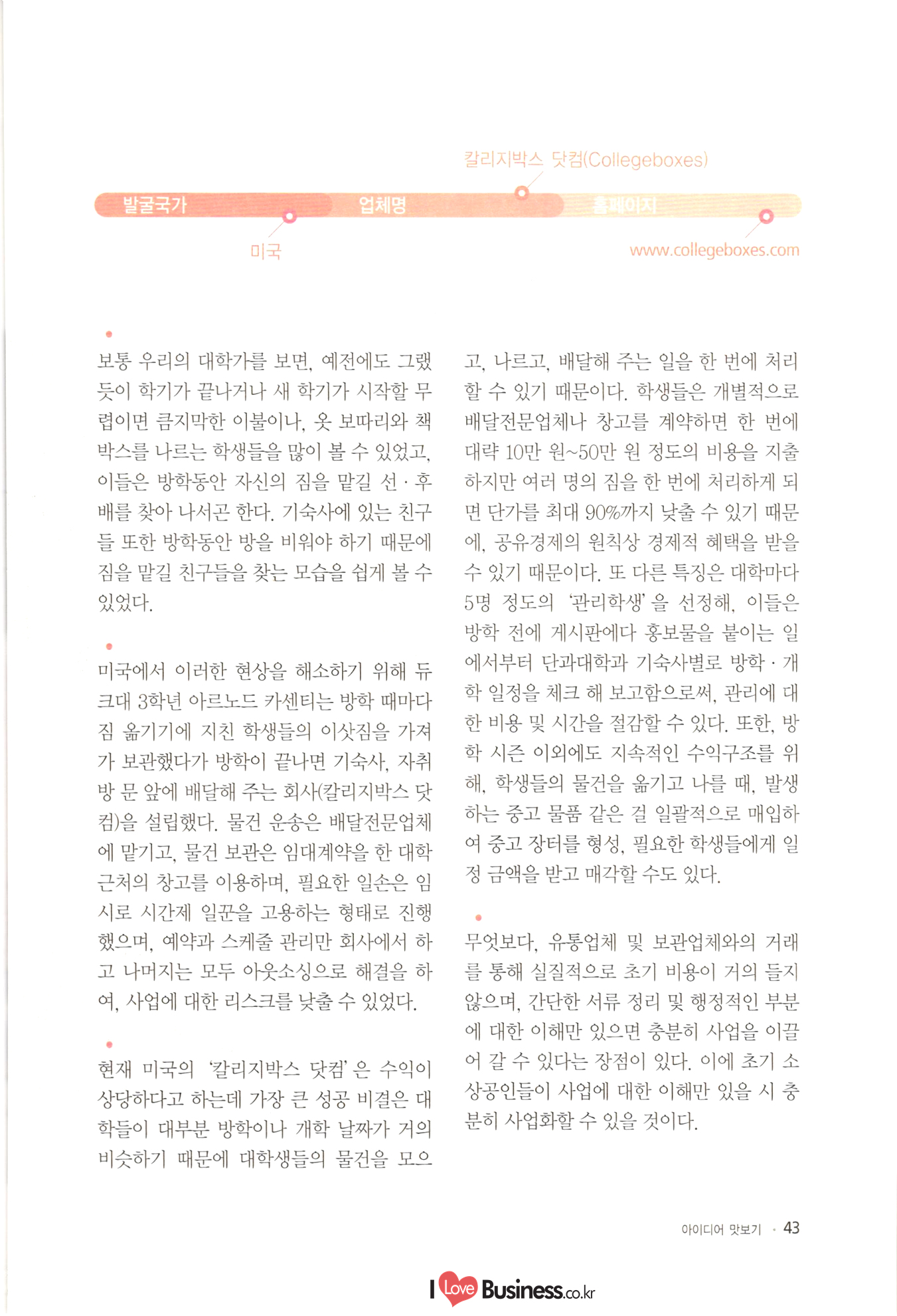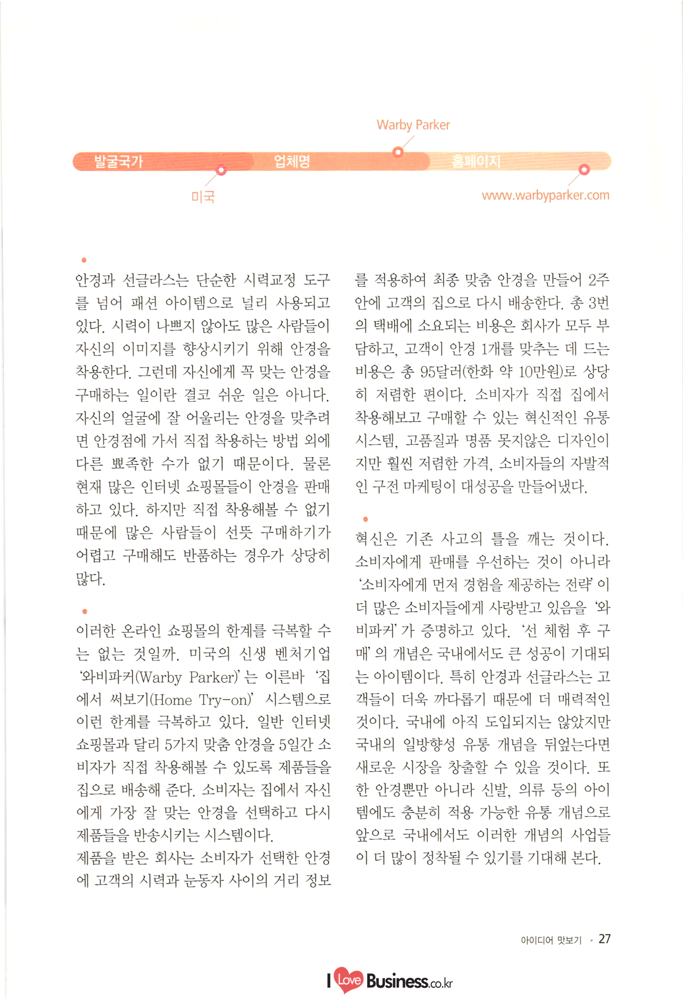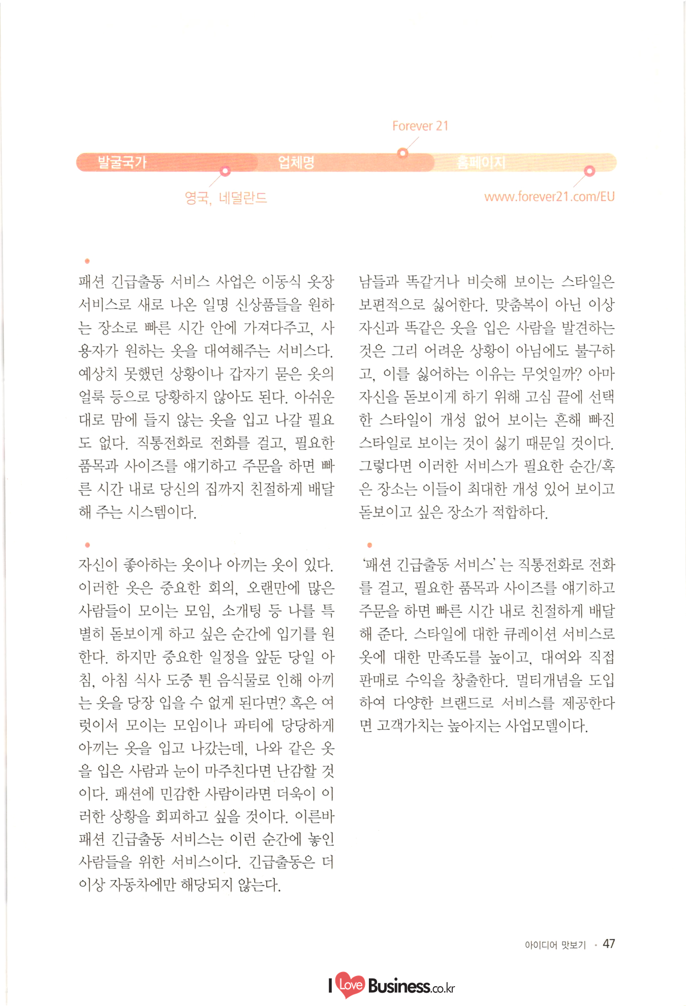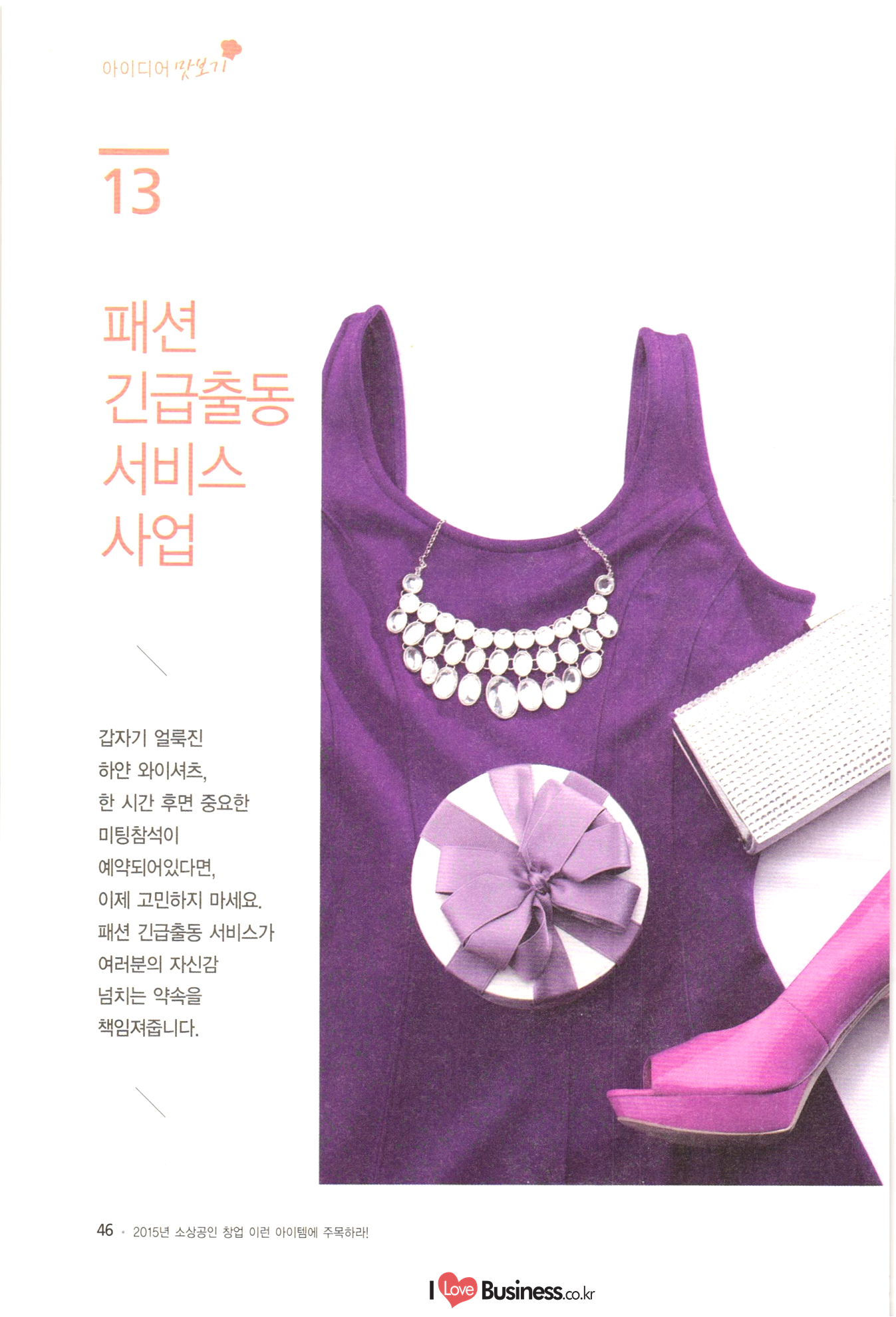 | 소상공인 창업 이런 아이템에 주목하라! CONTENTS BY 006 이사장 발간사 특별기획 008 특별기획 성공적인 창업을 위한 플래닝 법칙 1014 특별기획 III 해외 유망 사업아이템 선정과 한국도입 고려사항 Part 1 아이디어 맛보기 1022 01. 여성 직장인을 위한 낮잠 카페 1024 02. 한국의 전통에 이국적 요소를 접목한 퓨전디저트 카페 1026 03. 안경, 집에서 착용 후 구매하는 '신개념 안경점 1028 04. 스마트 앱세서리 대여사업 1030 05. 매달 여성에게 찾아오는 그날(월경)의 주기에 맞춰 그에 관한 여러 가지 케어 물품들을 배송해주는 온라인 서비스사업 1032 06. 유료카페 - 머무는 시간에 대한 돈을 지불하면, 카페 내 시설은 모두 FREE 1034 07. 수입 과자 할인점 1036 08. 반려동물을 위한 자연식 레스토랑 1038 09. 음식으로 교감하는 식문화전문여행사 1040 10. 개인 취향에 맞는 자동차 외형 디자인 서비스업 1042 11. 이삿짐을 보관해주는 Delivery Box 1044 12. 추억을 만드는 원스탑 웨딩펜션 046 13. 패션 긴급출동 서비스 사업 1048 14. 소형점포 제휴를 통한 카페 자유이용권 사업 1050 15. 장난감 병원(Toy Hospital) 1052 16. 앱을 통한 인근지역 주차공간 공유 1054 17. 신개념 다이어트 운동 교실 아쿠아 싸이클링 1056 18. 양조부모(養祖父母) 맺어주기 사업 1058 19. 이혼한 부부의 양육비 관리 서비스 1060 20. 사진수업, 사진 전시회 등을 기획하는 사진관 |