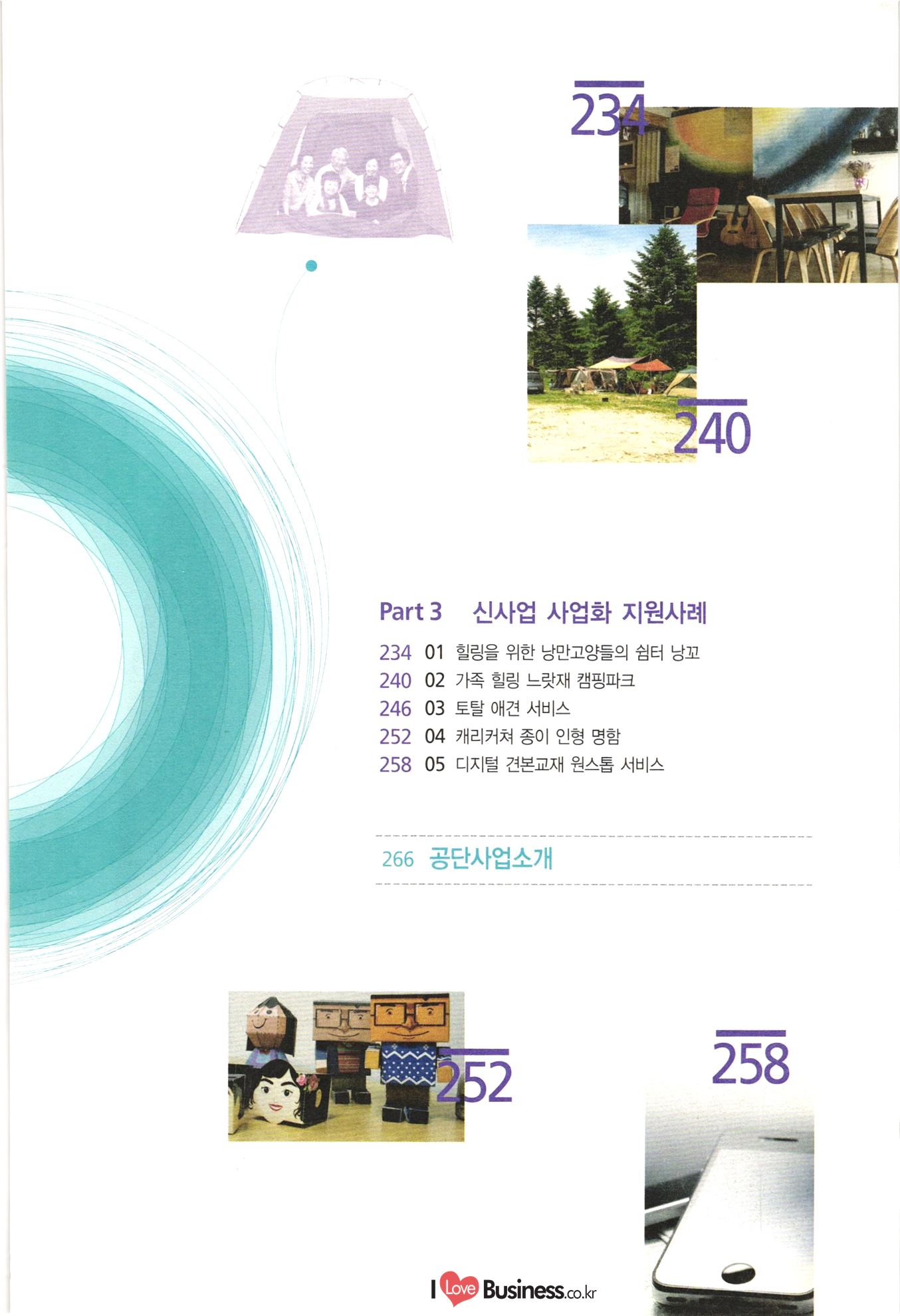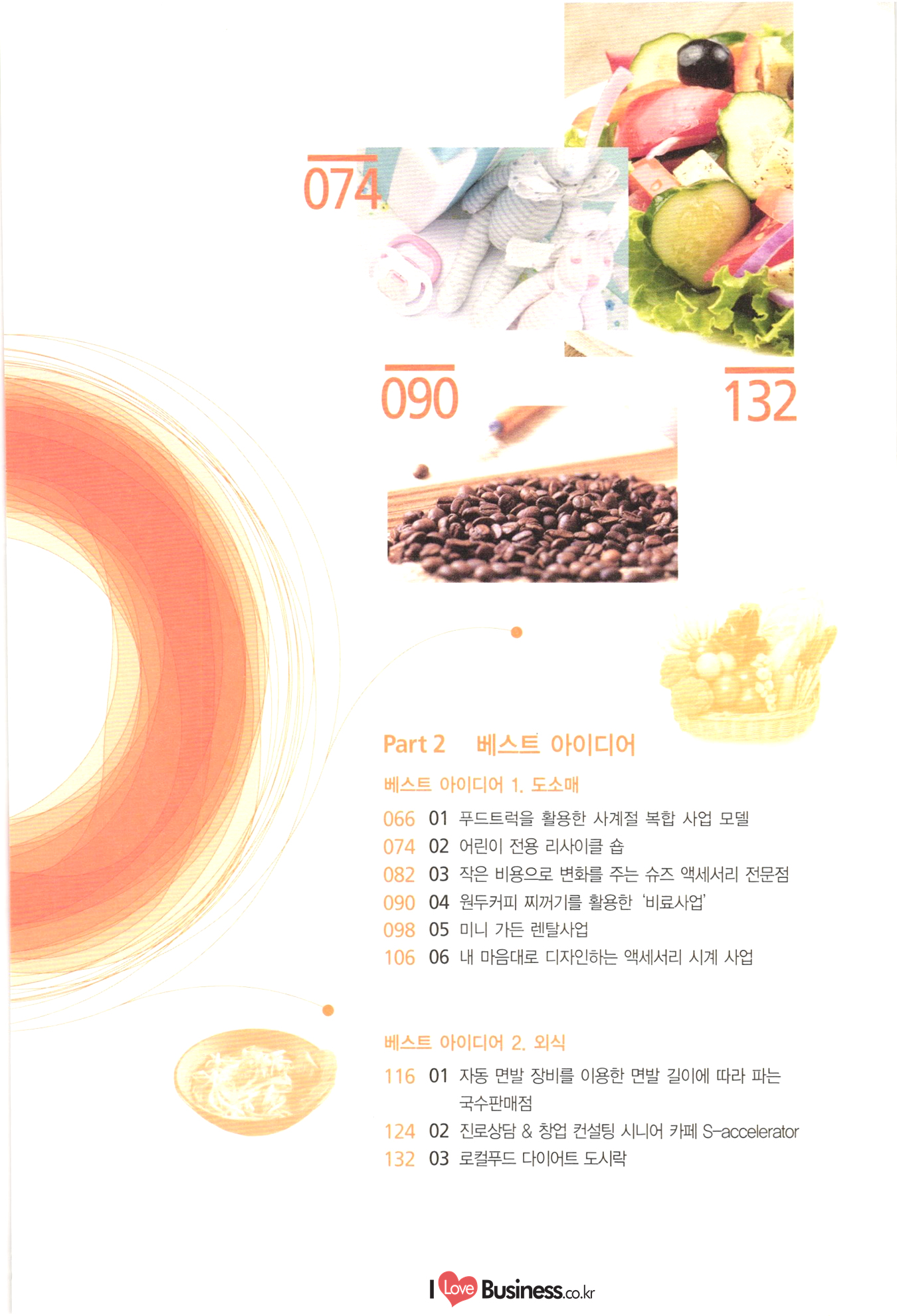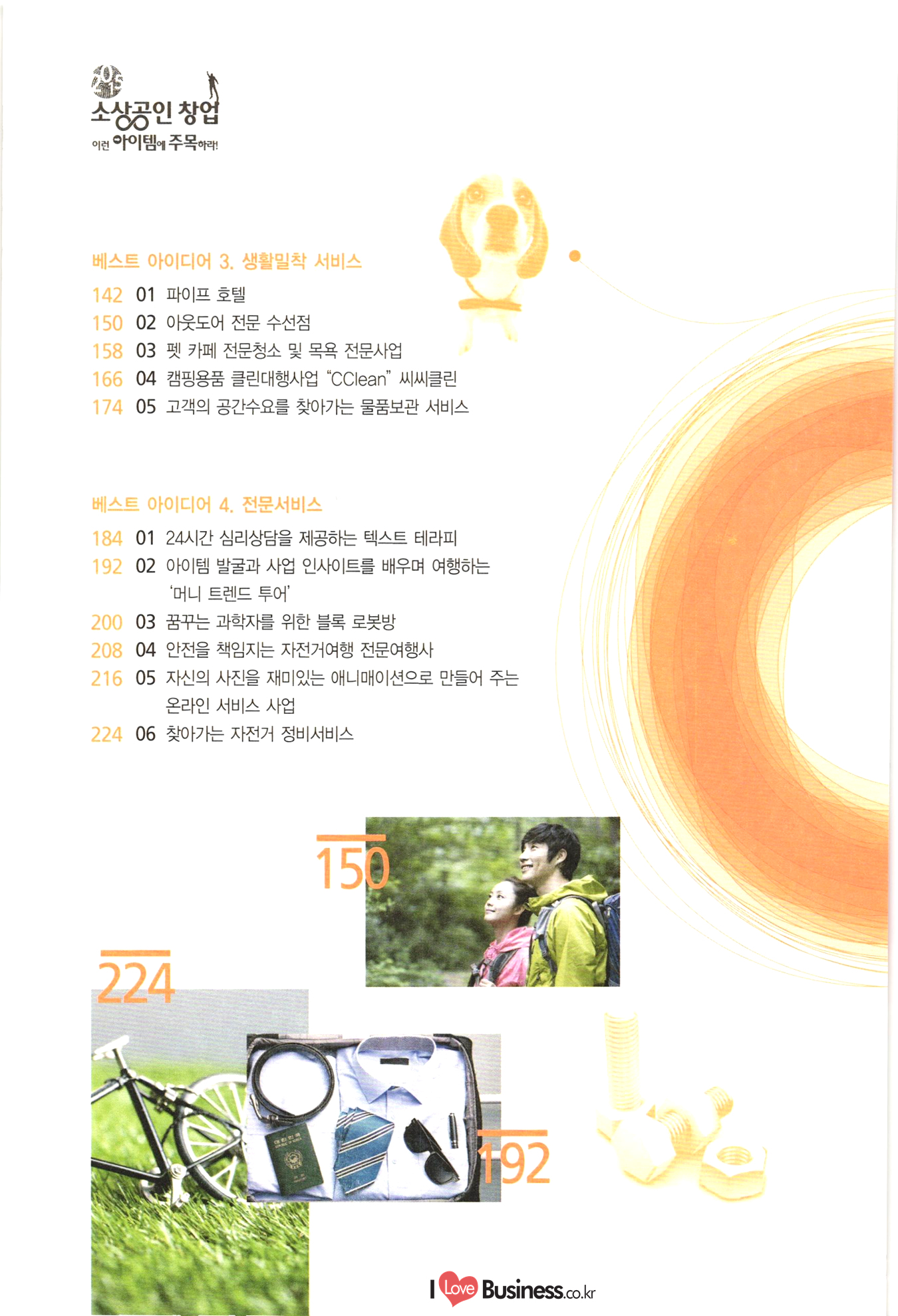 090 Part 2 베스트 아이디어 베스트 아이디어 1. 도소매 066 01 푸드트럭을 활용한 사계절 복합 사업 모델 1074 02 어린이 전용 리사이클 숍 082 03 작은 비용으로 변화를 주는 슈즈 액세서리 전문점 090 04 원두커피 찌꺼기를 활용한 비료사업' 098 05 미니 가든 렌탈사업 106 06 내 마음대로 디자인하는 액세서리 시계 사업 베스트 아이디어 2. 외식 116 01 자동 면발 장비를 이용한 면발 길이에 따라 파는 국수판매점 124 02 진로상담 & 창업 컨설팅 시니어 카페 S-accelerator 132 03 로컬푸드 다이어트 도시락 www.ILoveBusiness.co.kr 소상공인 창업 이런 아이템에 주목하라! 베스트 아이디어 3. 생활밀착 서비스 142 01 파이프 호텔 150 02 아웃도어 전문 수선점 158 03 펫 카페 전문청소 및 목욕 전문사업 166 04 캠핑용품 클린대행사업 “CClean” 씨씨클린 | 174 05 고객의 공간수요를 찾아가는 물품보관 서비스 베스트 아이디어 4. 전문서비스 184 01 24시간 심리상담을 제공하는 텍스트 테라피 192 02 아이템 발굴과 사업 인사이트를 배우며 여행하는 | '머니 트렌드 투어 200 03 꿈꾸는 과학자를 위한 블록 로봇방 208 04 안전을 책임지는 자전거여행 전문여행사 216 05 자신의 사진을 재미있는 애니매이션으로 만들어 주는 온라인 서비스 사업 224 06 찾아가는 자전거 정비서비스 Part 3 신사업 사업화 지원사례 234 01 힐링을 위한 낭만고양들의 쉼터 낭꼬 240 02 가족 힐링 느랏재 캠핑파크 246 03 토탈 애견 서비스 252 04 캐리커쳐 종이 인형 명함 | 258 05 디지털 견본교재 원스톱 서비스 266 공단사업소개 |