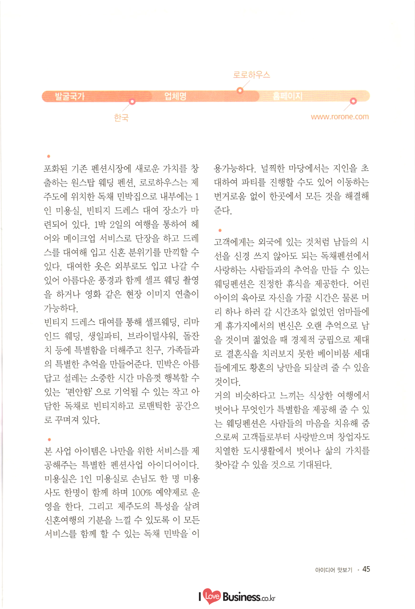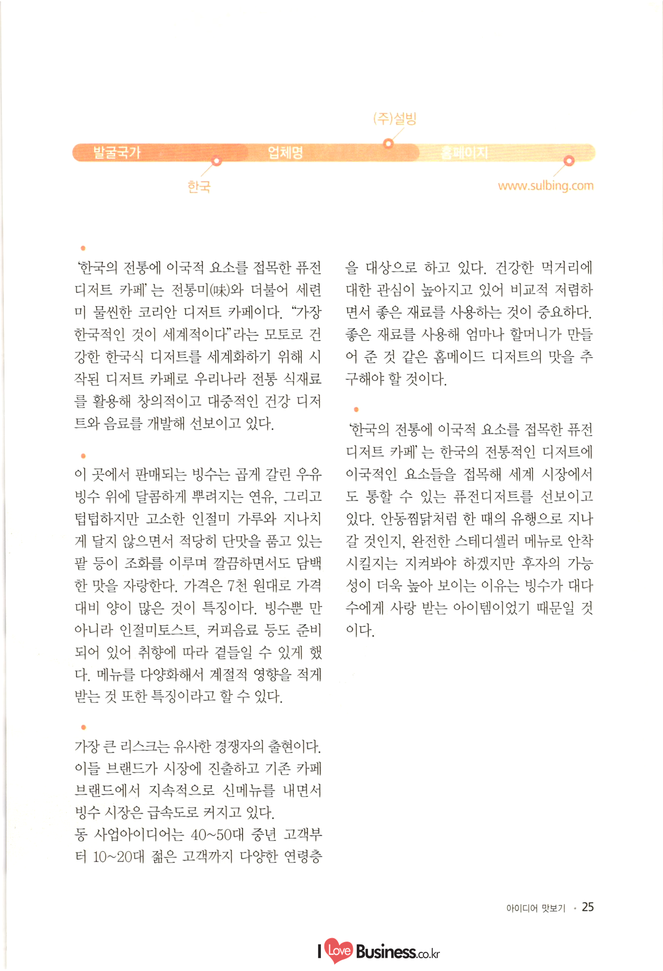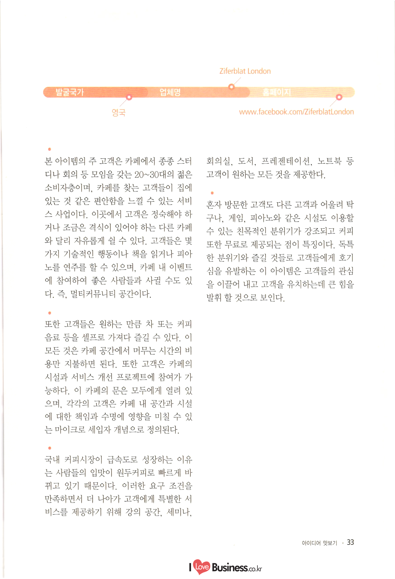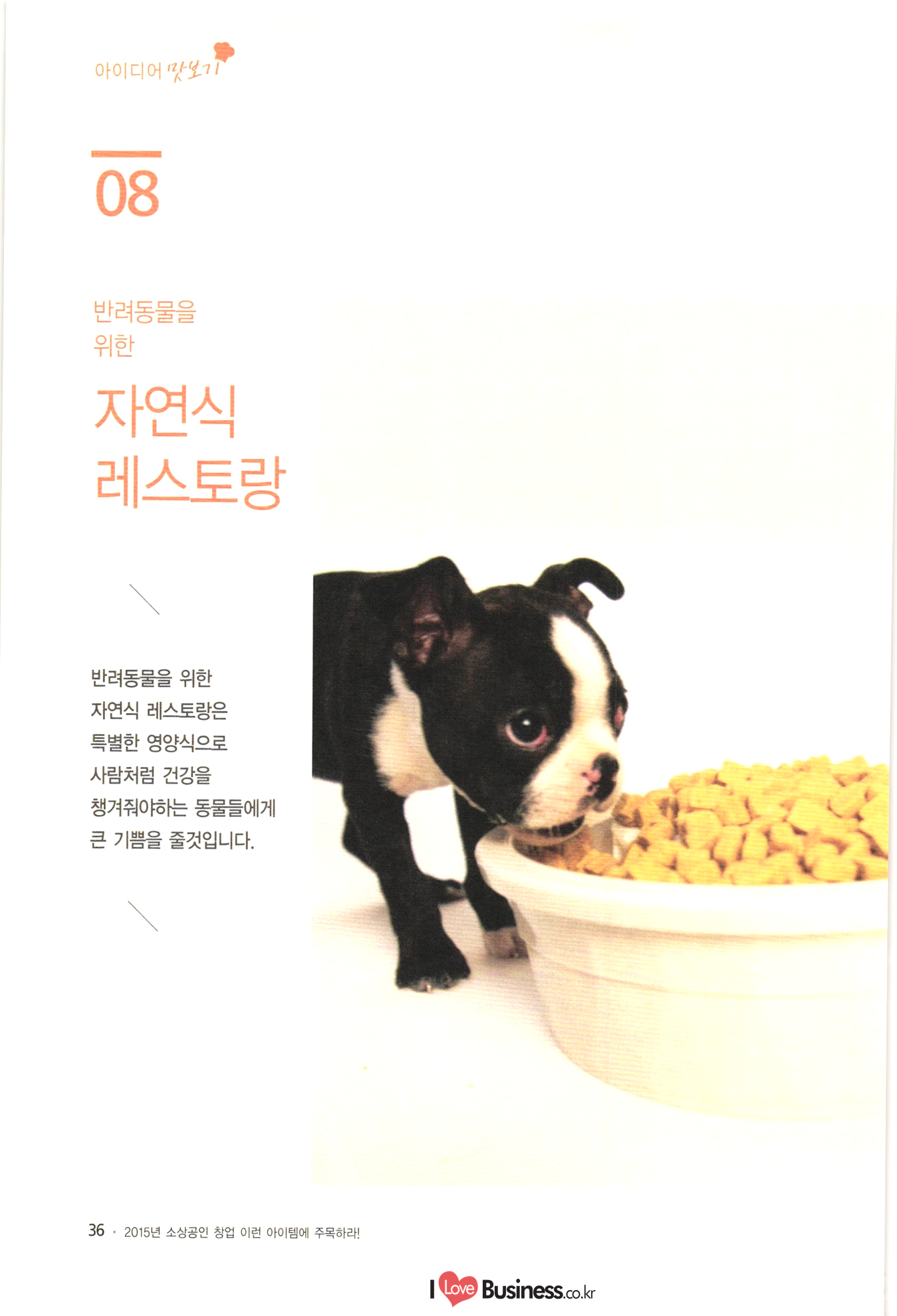 090 Part 2 베스트 아이디어 베스트 아이디어 1. 도소매 066 01 푸드트럭을 활용한 사계절 복합 사업 모델 1074 02 어린이 전용 리사이클 숍 082 03 작은 비용으로 변화를 주는 슈즈 액세서리 전문점 090 04 원두커피 찌꺼기를 활용한 비료사업' 098 05 미니 가든 렌탈사업 106 06 내 마음대로 디자인하는 액세서리 시계 사업 베스트 아이디어 2. 외식 116 01 자동 면발 장비를 이용한 면발 길이에 따라 파는 국수판매점 124 02 진로상담 & 창업 컨설팅 시니어 카페 S-accelerator 132 03 로컬푸드 다이어트 도시락 www.ILoveBusiness.co.kr 소상공인 창업 이런 아이템에 주목하라! 베스트 아이디어 3. 생활밀착 서비스 142 01 파이프 호텔 150 02 아웃도어 전문 수선점 158 03 펫 카페 전문청소 및 목욕 전문사업 166 04 캠핑용품 클린대행사업 “CClean” 씨씨클린 | 174 05 고객의 공간수요를 찾아가는 물품보관 서비스 베스트 아이디어 4. 전문서비스 184 01 24시간 심리상담을 제공하는 텍스트 테라피 192 02 아이템 발굴과 사업 인사이트를 배우며 여행하는 | '머니 트렌드 투어 200 03 꿈꾸는 과학자를 위한 블록 로봇방 208 04 안전을 책임지는 자전거여행 전문여행사 216 05 자신의 사진을 재미있는 애니매이션으로 만들어 주는 온라인 서비스 사업 224 06 찾아가는 자전거 정비서비스 Part 3 신사업 사업화 지원사례 234 01 힐링을 위한 낭만고양들의 쉼터 낭꼬 240 02 가족 힐링 느랏재 캠핑파크 246 03 토탈 애견 서비스 252 04 캐리커쳐 종이 인형 명함 | 258 05 디지털 견본교재 원스톱 서비스 266 공단사업소개 |