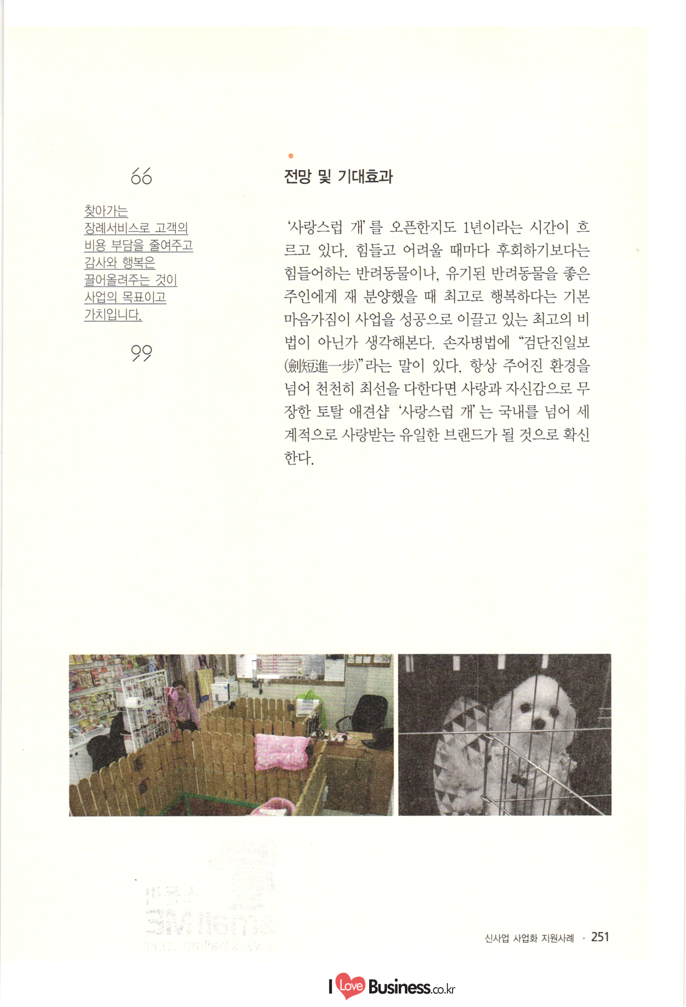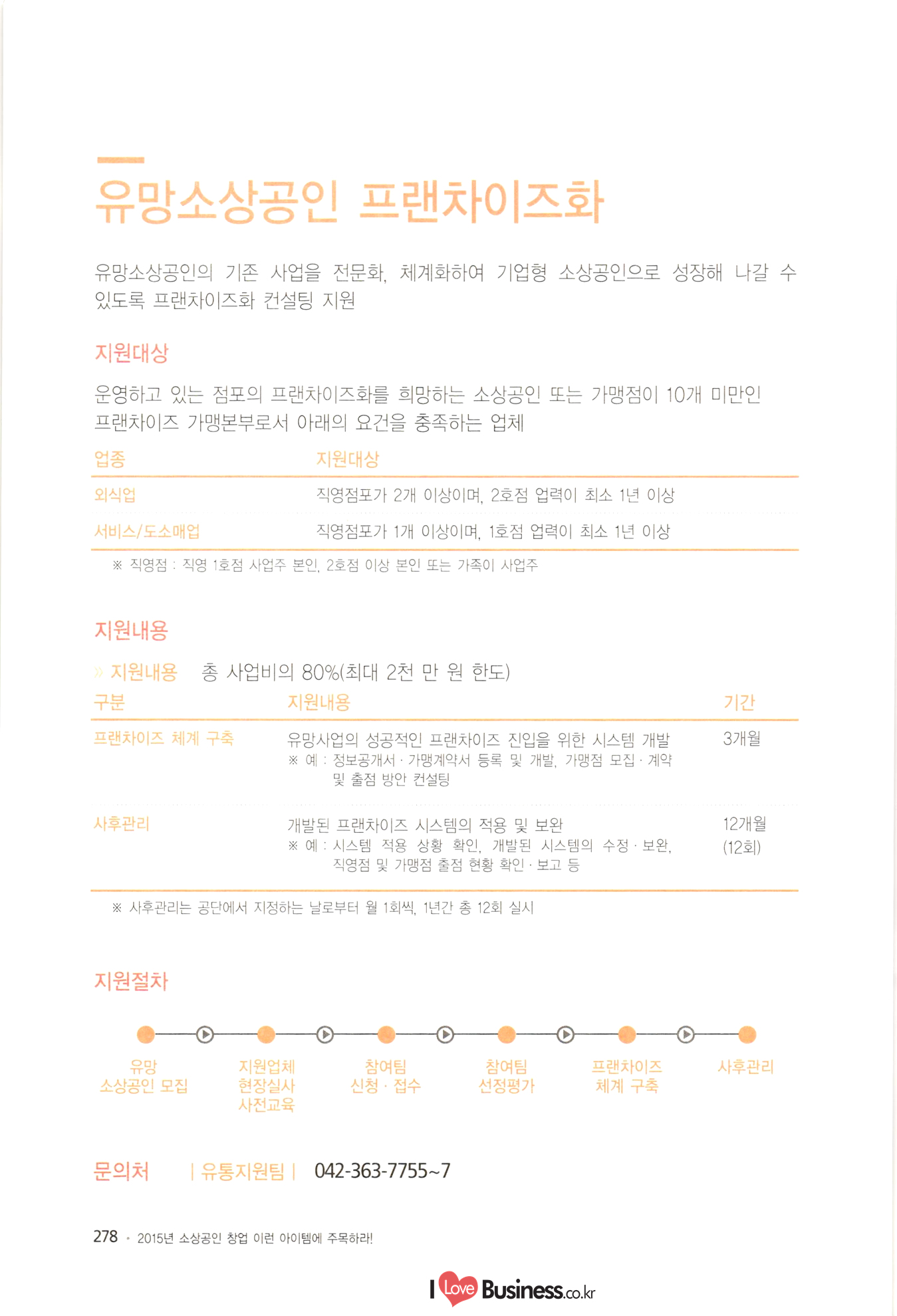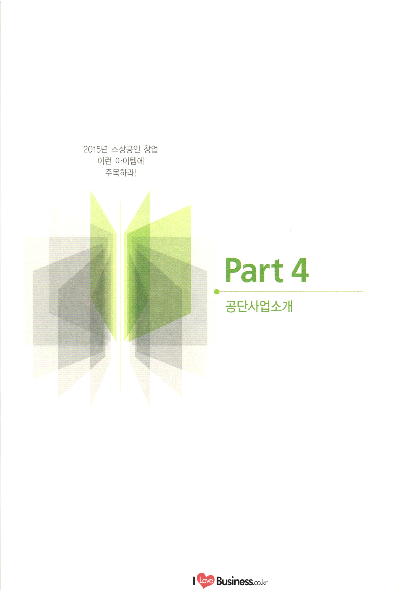 | 소상공인 창업 이런 아이템에 주목하라! CONTENTS BY 006 이사장 발간사 특별기획 008 특별기획 성공적인 창업을 위한 플래닝 법칙 1014 특별기획 III 해외 유망 사업아이템 선정과 한국도입 고려사항 Part 1 아이디어 맛보기 1022 01. 여성 직장인을 위한 낮잠 카페 1024 02. 한국의 전통에 이국적 요소를 접목한 퓨전디저트 카페 1026 03. 안경, 집에서 착용 후 구매하는 '신개념 안경점 1028 04. 스마트 앱세서리 대여사업 1030 05. 매달 여성에게 찾아오는 그날(월경)의 주기에 맞춰 그에 관한 여러 가지 케어 물품들을 배송해주는 온라인 서비스사업 1032 06. 유료카페 - 머무는 시간에 대한 돈을 지불하면, 카페 내 시설은 모두 FREE 1034 07. 수입 과자 할인점 1036 08. 반려동물을 위한 자연식 레스토랑 1038 09. 음식으로 교감하는 식문화전문여행사 1040 10. 개인 취향에 맞는 자동차 외형 디자인 서비스업 1042 11. 이삿짐을 보관해주는 Delivery Box 1044 12. 추억을 만드는 원스탑 웨딩펜션 046 13. 패션 긴급출동 서비스 사업 1048 14. 소형점포 제휴를 통한 카페 자유이용권 사업 1050 15. 장난감 병원(Toy Hospital) 1052 16. 앱을 통한 인근지역 주차공간 공유 1054 17. 신개념 다이어트 운동 교실 아쿠아 싸이클링 1056 18. 양조부모(養祖父母) 맺어주기 사업 1058 19. 이혼한 부부의 양육비 관리 서비스 1060 20. 사진수업, 사진 전시회 등을 기획하는 사진관 |