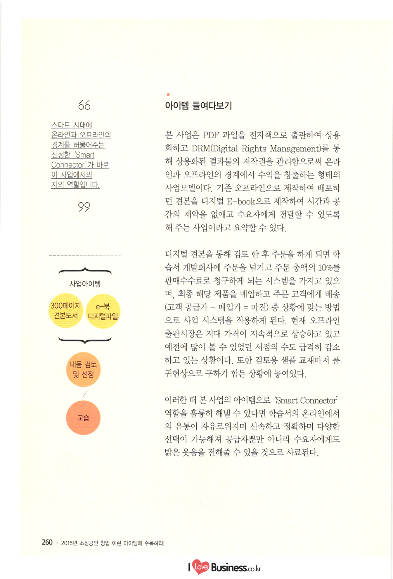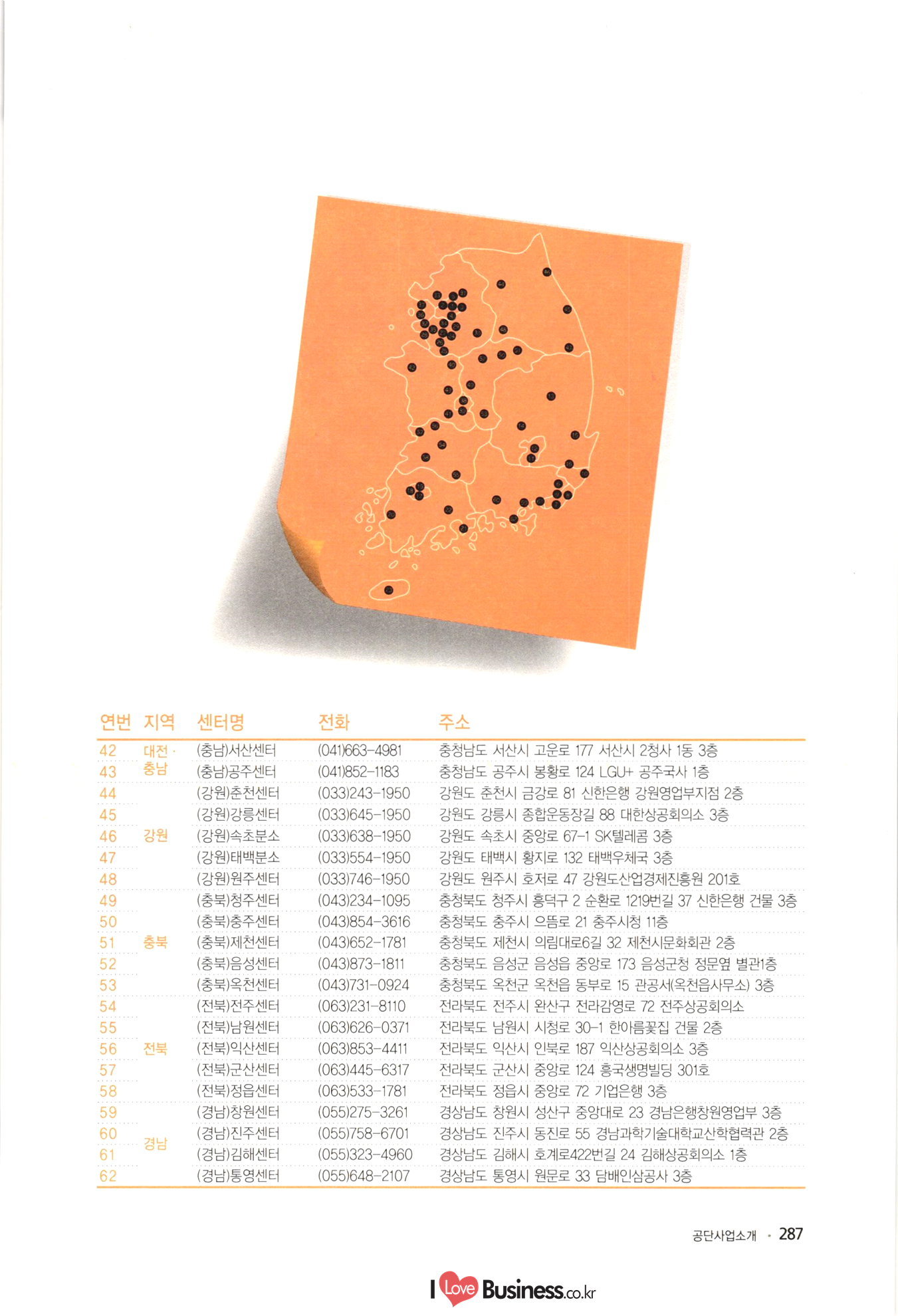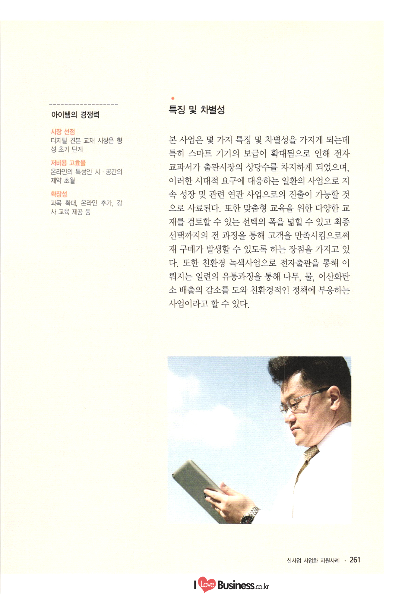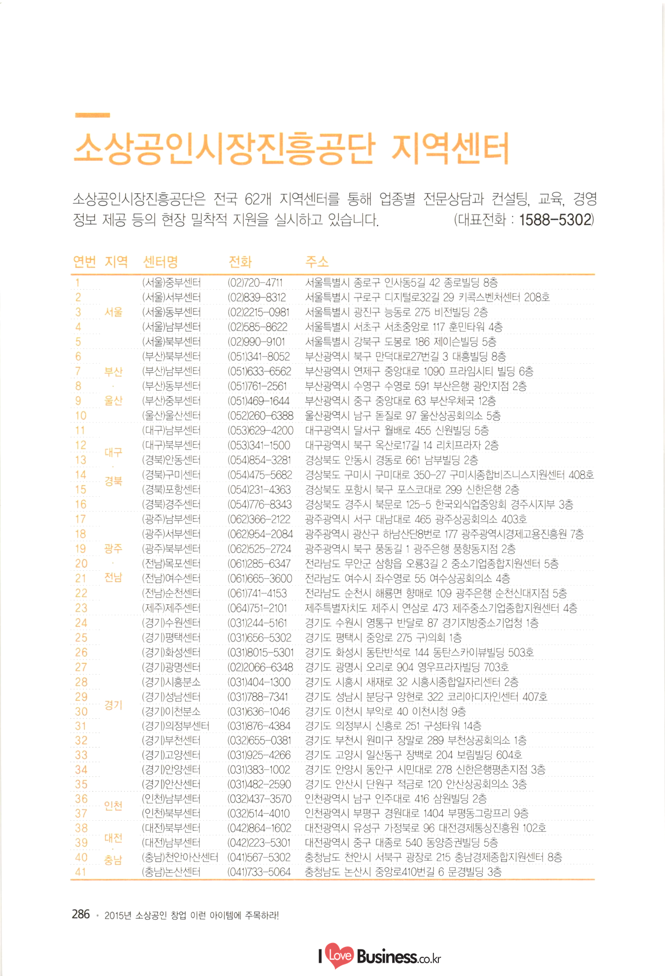 | 소상공인 창업 이런 아이템에 주목하라! CONTENTS BY 006 이사장 발간사 특별기획 008 특별기획 성공적인 창업을 위한 플래닝 법칙 1014 특별기획 III 해외 유망 사업아이템 선정과 한국도입 고려사항 Part 1 아이디어 맛보기 1022 01. 여성 직장인을 위한 낮잠 카페 1024 02. 한국의 전통에 이국적 요소를 접목한 퓨전디저트 카페 1026 03. 안경, 집에서 착용 후 구매하는 '신개념 안경점 1028 04. 스마트 앱세서리 대여사업 1030 05. 매달 여성에게 찾아오는 그날(월경)의 주기에 맞춰 그에 관한 여러 가지 케어 물품들을 배송해주는 온라인 서비스사업 1032 06. 유료카페 - 머무는 시간에 대한 돈을 지불하면, 카페 내 시설은 모두 FREE 1034 07. 수입 과자 할인점 1036 08. 반려동물을 위한 자연식 레스토랑 1038 09. 음식으로 교감하는 식문화전문여행사 1040 10. 개인 취향에 맞는 자동차 외형 디자인 서비스업 1042 11. 이삿짐을 보관해주는 Delivery Box 1044 12. 추억을 만드는 원스탑 웨딩펜션 046 13. 패션 긴급출동 서비스 사업 1048 14. 소형점포 제휴를 통한 카페 자유이용권 사업 1050 15. 장난감 병원(Toy Hospital) 1052 16. 앱을 통한 인근지역 주차공간 공유 1054 17. 신개념 다이어트 운동 교실 아쿠아 싸이클링 1056 18. 양조부모(養祖父母) 맺어주기 사업 1058 19. 이혼한 부부의 양육비 관리 서비스 1060 20. 사진수업, 사진 전시회 등을 기획하는 사진관 |