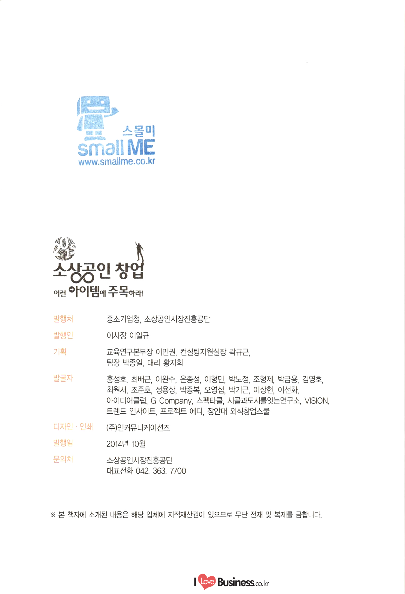 제 02 호 MAI 전 세계 시장을 조사하여 발굴한 알짜 신사업 아이디어를 테마별로 분류, 소자본 창업을 위한 관련업체 정보와 특징을 상세분석, 시장공략을 위한 전문가의 Tip을 알기 쉽게 수록 소상공인 창업 시장공략을 위한 전문가의 Tip을 알기 쉽게 수록 이런 아이템에 주목하라 CE Hom OTTI NGRITE | 10 중소기업청 2 0 소상공인시장진흥공단
