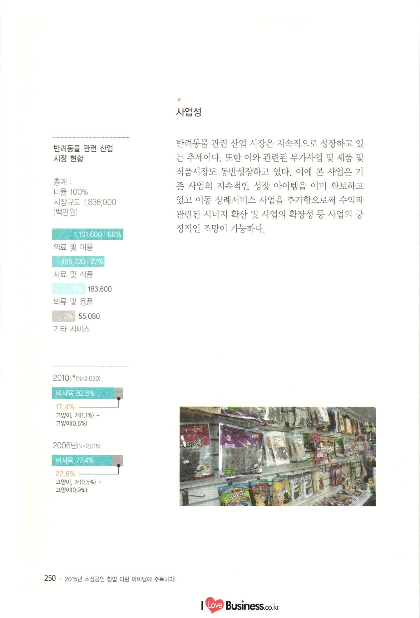 090 Part 2 베스트 아이디어 베스트 아이디어 1. 도소매 066 01 푸드트럭을 활용한 사계절 복합 사업 모델 1074 02 어린이 전용 리사이클 숍 082 03 작은 비용으로 변화를 주는 슈즈 액세서리 전문점 090 04 원두커피 찌꺼기를 활용한 비료사업' 098 05 미니 가든 렌탈사업 106 06 내 마음대로 디자인하는 액세서리 시계 사업 베스트 아이디어 2. 외식 116 01 자동 면발 장비를 이용한 면발 길이에 따라 파는 국수판매점 124 02 진로상담 & 창업 컨설팅 시니어 카페 S-accelerator 132 03 로컬푸드 다이어트 도시락 www.ILoveBusiness.co.kr 소상공인 창업 이런 아이템에 주목하라! 베스트 아이디어 3. 생활밀착 서비스 142 01 파이프 호텔 150 02 아웃도어 전문 수선점 158 03 펫 카페 전문청소 및 목욕 전문사업 166 04 캠핑용품 클린대행사업 “CClean” 씨씨클린 | 174 05 고객의 공간수요를 찾아가는 물품보관 서비스 베스트 아이디어 4. 전문서비스 184 01 24시간 심리상담을 제공하는 텍스트 테라피 192 02 아이템 발굴과 사업 인사이트를 배우며 여행하는 | '머니 트렌드 투어 200 03 꿈꾸는 과학자를 위한 블록 로봇방 208 04 안전을 책임지는 자전거여행 전문여행사 216 05 자신의 사진을 재미있는 애니매이션으로 만들어 주는 온라인 서비스 사업 224 06 찾아가는 자전거 정비서비스 Part 3 신사업 사업화 지원사례 234 01 힐링을 위한 낭만고양들의 쉼터 낭꼬 240 02 가족 힐링 느랏재 캠핑파크 246 03 토탈 애견 서비스 252 04 캐리커쳐 종이 인형 명함 | 258 05 디지털 견본교재 원스톱 서비스 266 공단사업소개 |