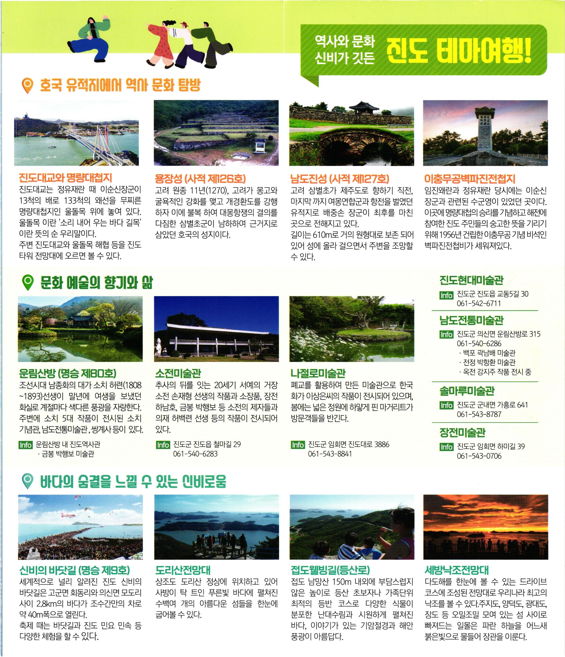 역사와 문화 지도 테마여행! 이 호국 유적지에어 역이 문화 탐방 진도대교와 명량대첩지 용장성 (사적 제26호) 남도진성 (사적 제27회) 이충무공벽파진전첩지 진도대교는 정유재란 때 이순신장군이 고려 원종 11년(1270), 고려가 몽고와 고려 삼별초가 제주도로 향하기 직전, 임진왜란과 정유재란 당시에는 이순신 13척의 배로 133척의 왜선을 무찌른 굴욕적인 강화를 맺고 개경환도를 강행 마지막 까지 여몽연합군과 항전을 벌였던 장군과 관련된 수군영이 있었던 곳이다. 명량대첩지인 울돌목 위에 놓여 있다. 하자 이에 불복 하여 대몽항쟁의 결의를 유적지로 배중손 장군이 최후를 마친 이곳에 명량대첩의 승리를 기념하고 해전에 울돌목 이란 '소리 내어 우는 바다 길목' 다짐한 삼별초군이 남하하여 근거지로 | 곳으로 전해지고 있다. 참여한 진도 주민들의 숭고한 뜻을 기리기 이란 뜻의 순 우리말이다. | 삼았던 호국의 성지이다. 길이는 610m로 거의 원형대로 보존되어 위해 1956년 건립한 이충무공 기념 비석인 주변 진도대교와 울돌목 해협 등을 진도 있어 성에 올라 걸으면서 주변을 조망할 벽파진전첩비가 세워져있다. 타워 전망대에 오르면 볼 수 있다. 수 있다. 이 문화 예술의 향기와 namestomom 진도현대미술관 Info 진도군 진도읍 교동5길 30 1061-542-6711 I m enteresomermaterest 000 WAN00 남도전통미술관 Info 진도군 의신면 운림산방로 315 061-540-6286 1. 백포 곽남배 미술관 · 전정 박항환 미술관 · 옥전 강지주 작품 전시 중 운림산방 (명승 제80호) 소전미술관 나절로미술관 조선시대 남종화의 대가 소치 허련(1808 추사의 뒤를 잇는 20세기 서예의 거장 폐교를 활용하여 만든 미술관으로 한국 ~1893)선생이 말년에 여생을 보냈던 소전 손재형 선생의 작품과 소장품, 장전 화가 이상은씨의 작품이 전시되어 있으며, 화실로 계절마다 색다른 풍광을 자랑한다. 하남호, 금봉 박행보 등 소전의 제자들과 봄에는 넓은 정원에 하얗게 핀 마거리트가 주변에 소치 5대 작품이 전시된 소치 의재 허백련 선생 등의 작품이 전시되어 방문객들을 반긴다. 기념관, 남도전통미술관, 쌍계사 등이 있다. | 있다. | Info 운림산방 내 진도역사관 Info 진도군 진도읍 철마길 29 Info 진도군 임회면 진도대로 3886 · 금봉 박행보 미술관 061-540-6283 1061-543-8841 솔마루미술관 Info 진도군 군내면 가흥로 641 061-543-8787 장전미술관 Info 진도군 임회면 하미길 39 061-543-0706 이 바다의 숨결을 느낄 수 있는 인비로움 신비의 바닷길 (명승 제9호) 도리산전망대 접도웰빙길(등산로) 세방낙조전망대 세계적으로 널리 알려진 진도 신비의 상조도 도리산 정상에 위치하고 있어 접도 남망산 150m 내외에 부담스럽지 다도해를 한눈에 볼 수 있는 드라이브 바닷길은 고군면 회동리와 의신면 모도리 사방이 탁 트인 푸른빛 바다에 펼쳐진 않은 높이로 등산 초보자나 가족단위 코스에 조성된 전망대로 우리나라 최고의 사이 2.8km의 바다가 조수간만의 차로 수백여 개의 아름다운 섬들을 한눈에 최적의 등반 코스로 다양한 식물이 낙조를 볼 수 있다.주지도, 양덕도, 광대도, 약 40m폭으로 열린다. 굽어볼 수 있다. 분포한 난대수림과 시원하게 펼쳐진 장도 등 오밀조밀 모여 있는 섬 사이로 축제 때는 바닷길과 진도 민요 민속 등 바다, 이야기가 있는 기암절경과 해안 빠져드는 일몰은 파란 하늘을 어느새 다양한 체험을 할 수 있다. 풍광이 아름답다. 붉은빛으로 물들어 장관을 이룬다. reture