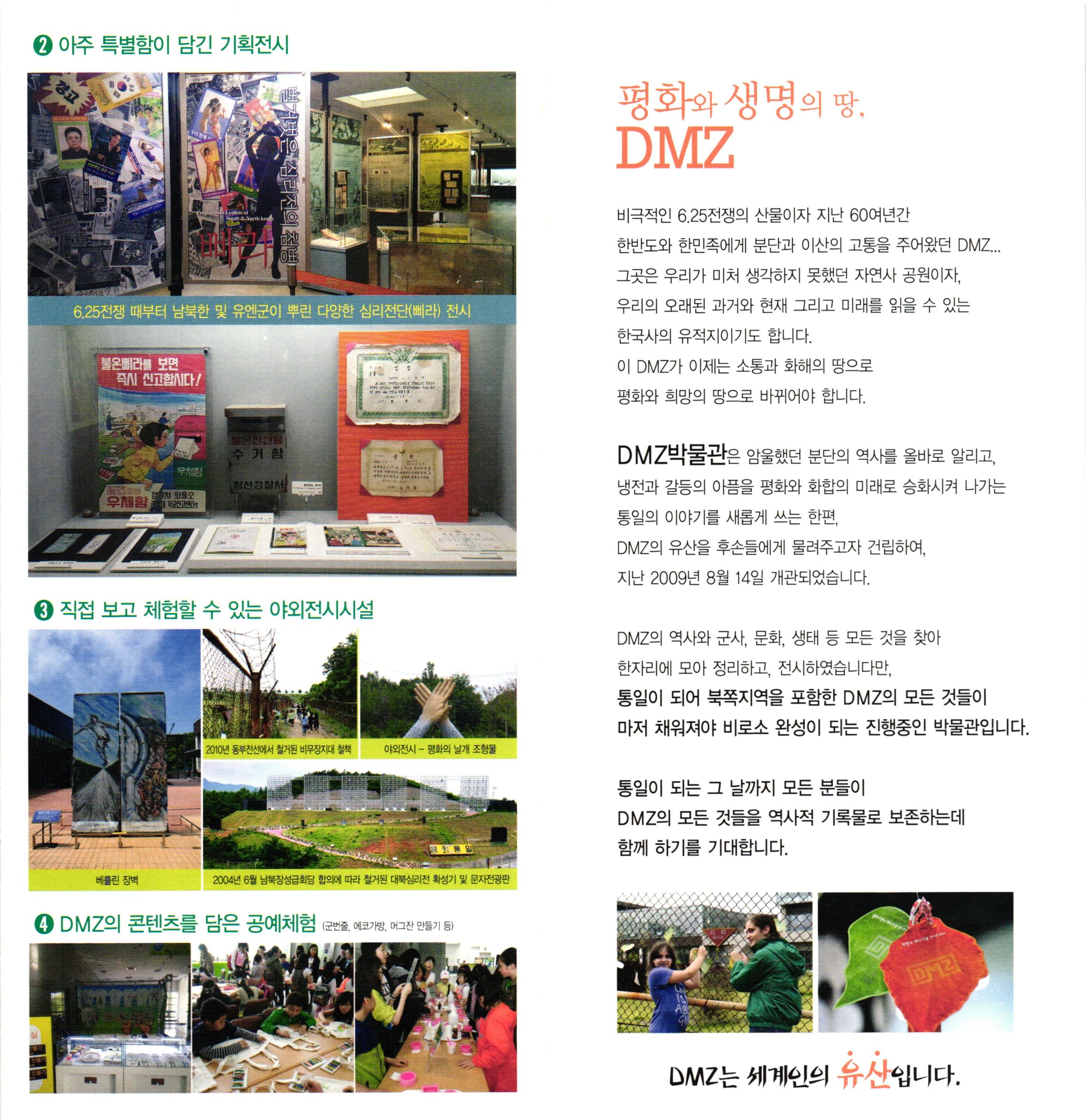 2 아주 특별함이 담긴 기획전시 평화와 생명의 땅, DMZ 벌거벗은 심리전의 첨병 attt 1 11 0 6.25전쟁 때부터 남북한 및 유엔군이 뿌린 다양한 심리전단(삐라) 전시 비극적인 6.25전쟁의 산물이자 지난 60여년간 한반도와 한민족에게 분단과 이산의 고통을 주어왔던 DMZ... 그곳은 우리가 미처 생각하지 못했던 자연사 공원이자, 우리의 오래된 과거와 현재 그리고 미래를 읽을 수 있는 한국사의 유적지이기도 합니다. 이 DMZ가 이제는 소통과 화해의 땅으로 평화와 희망의 땅으로 바뀌어야 합니다. 불온라를 보면, 적 진다. TA We MES AMA 도로는 경 출 의 mom DMZ박물관은 암울했던 분단의 역사를 올바로 알리고, 냉전과 갈등의 아픔을 평화와 화합의 미래로 승화시켜 나가는 통일의 이야기를 새롭게 쓰는 한편, DMZ의 유산을 후손들에게 물려주고자 건립하여, 지난 2009년 8월 14일 개관되었습니다. 3 직접 보고 체험할 수 있는 야외전시시설 DMZ의 역사와 군사, 문화, 생태 등 모든 것을 찾아 한자리에 모아 정리하고, 전시하였습니다만, 통일이 되어 북쪽지역을 포함한 DMZ의 모든 것들이 마저 채워져야 비로소 완성이 되는 진행중인 박물관입니다. 2010년 동부전선에서 철거된 비무장지대 철책 | 야외전시 - 평화의 날개 조형물 통일이 되는 그 날까지 모든 분들이 DMZ의 모든 것들을 역사적 기록물로 보존하는데 함께 하기를 기대합니다. 베를린 장벽 2004년 6월 남북장성급회담 합의에 따라 철거된 대북심리전 확성기 및 문자전광판 4 DMZ의 콘텐츠를 담은 공예체험 (군번줄, 에코가방, 머그잔 만들기 등) DMZ는 세계인의 유산입니다.