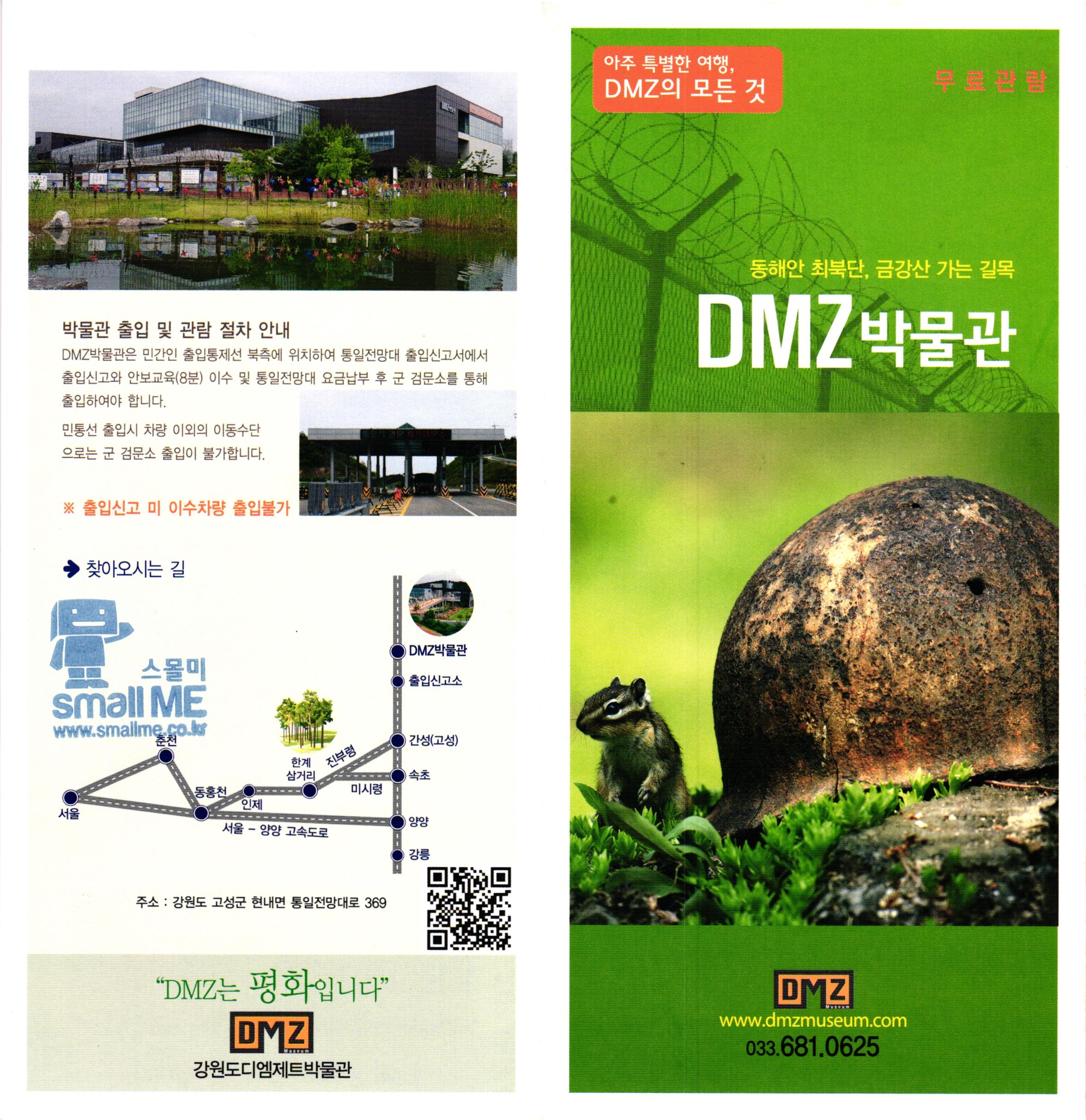 아주 특별한 여행, DMZ의 모든 것 동해안 최북단, 금강산 가는 길목 I A hrewerenter in he rese way new fromoney werener with DMZ박물관 박물관 출입 및 관람 절차 안내 DMZ박물관은 민간인 출입통제선 북측에 위치하여 통일전망대 출입신고서에서 출입신고와 안보교육(8분) 이수 및 통일전망대 요금납부 후 군 검문소를 통해 출입하여야 합니다. 민통선 출입시 차량 이외의 이동수단 으로는 군 검문소 출입이 불가합니다. ※ 출입신고 미 이수차량 출입불가 ○ 찾아오시는 길 ) DMZ박물관 출입신고소 ■ 간성(고성) 한계 삼거리, 속초 동홍천 - -- 미시령 - 인제 ... 서울 - -- - - - -- - - - - - -- - - - 양양 ) 서울 - 양양 고속도로 ○ 강릉 주소 : 강원도 고성군 현내면 통일전망대로 369 DMZ "DMZ는 평화입니다” DMZ www.dmzmuseum.com WON | 033,681.0625 강원도디엠제트박물관