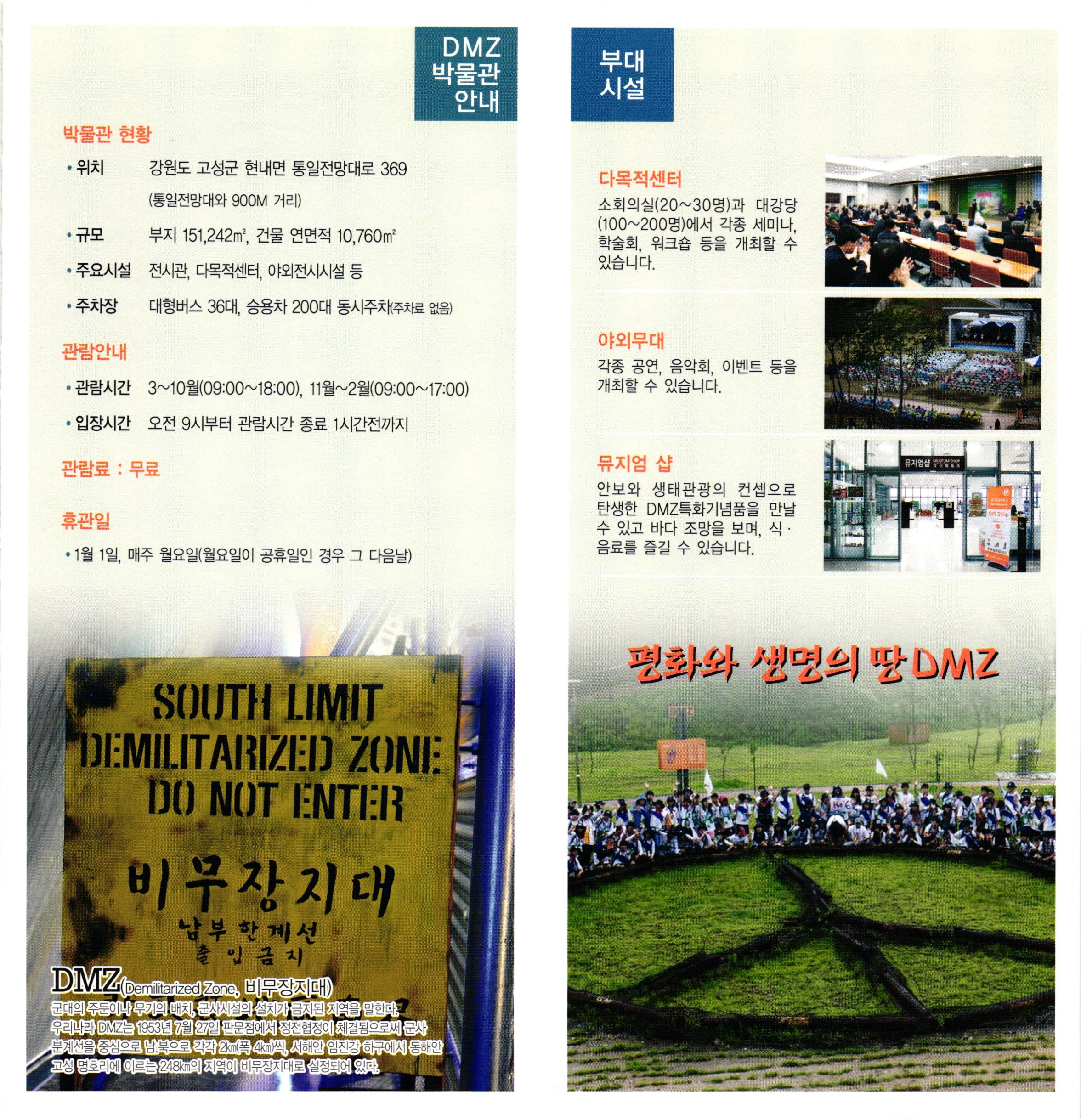 DMZ 박물관 안내 부대 시설 박물관 현황 • 위치 강원도 고성군 현내면 통일전망대로 369 (통일전망대와 900M 거리) 다목적센터 소회의실(20~30명)과 대강당 (100~200명)에서 각종 세미나, 학술회, 워크숍 등을 개최할 수 있습니다. · 규모 부지 151,242m2, 건물 연면적 10,760m2 · 주요시설 전시관, 다목적센터, 야외전시시설 등 · 주차장 대형버스 36대, 승용차 200대 동시주차(주차료 없음) 관람안내 야외무대 각종 공연, 음악회, 이벤트 등을 개최할 수 있습니다. · 관람시간 3~10월(09:00~18:00), 11월~2월(09:00~17:00) • 입장시간 오전 9시부터 관람시간 종료 1시간전까지 뮤지엄샵 Areus 관람료: 무료 뮤지엄 샵 안보와 생태관광의 컨셉으로 탄생한 DMZ특화기념품을 만날 수 있고 바다 조망을 보며, 식· 음료를 즐길 수 있습니다. GA 휴관일 • 1월 1일, 매주 월요일(월요일이 공휴일인 경우 그 다음날) 편화와 센면의 딸 DMZ SOUTH LIMIT DEMILITARIZED ZONE DO NOT ENTER 비무장지대 | 남부 한계선 1 | 출입금지 DMZ (Demilitarized Zone, PUTIH) 군대의 주문이나 무기의 배치, 군사시설의 설치가 금지된 지역을 말한다. 우리나라 DMZ는 1953년 7월 27일 판문점에서 정전협정이 체결됨으로써 군사 분계선을 중심으로 남북으로 각각 2m 폭 4m, 서해안 임진강 하구에서 동해안 - 고정 명호리에 이르는 248m의 지역이 비무장지대로 설정되어 있다.