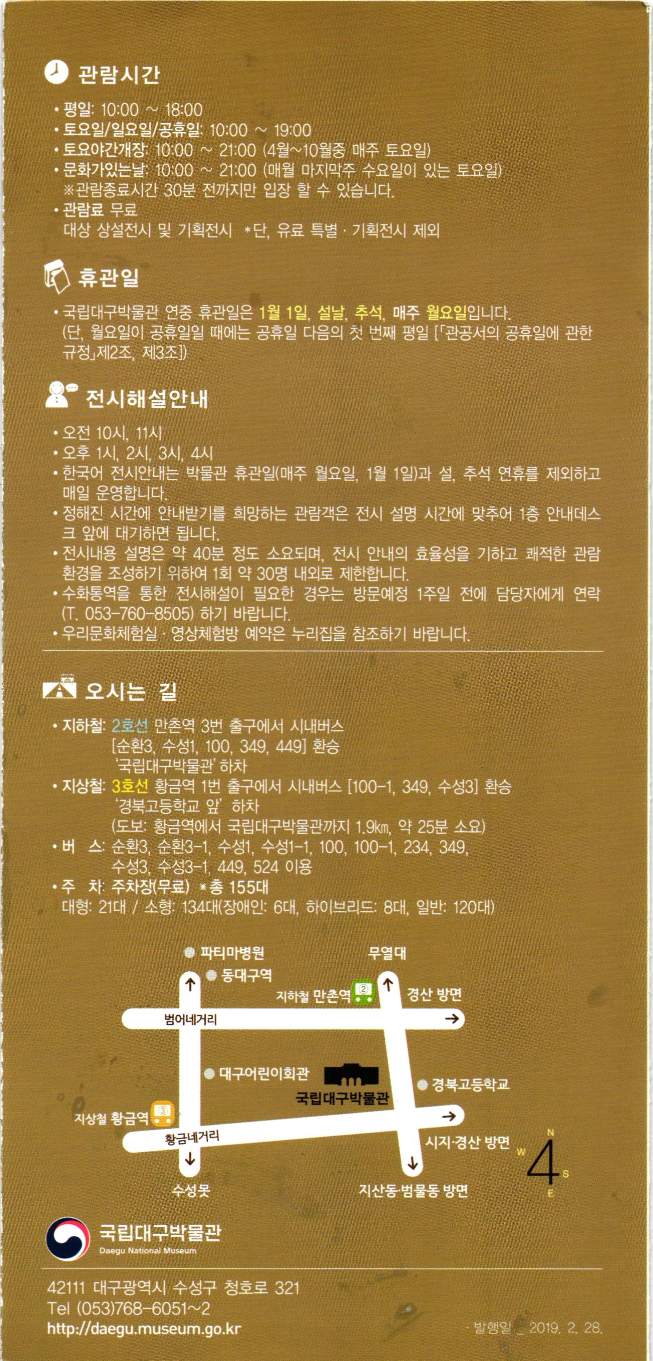 관람시간 • 평일: 10:00 ~ 18:00 • 토요일/일요일/공휴일: 10:00 ~ 19:00 • 토요야간개장: 10:00 ~ 21:00 (4월~10월중 매주 토요일) • 문화가있는날: 10:00 ~ 21:00 (매월 마지막주 수요일이 있는 토요일) | ※관람종료시간 30분 전까지만 입장 할 수 있습니다. • 관람료 무료 대상 상설전시 및 기획전시 *단, 유료 특별 · 기획전시 제외 휴관일 • 국립대구박물관 연중 휴관일은 1월 1일, 설날, 추석, 매주 월요일입니다. (단, 월요일이 공휴일일 때에는 공휴일 다음의 첫 번째 평일 [관공서의 공휴일에 관한 '규정」제2조, 제3조]) 2 전시해설안내 · 오전 10시, 11시 • 오후 1시, 2시, 3시, 4시 · 한국어 전시안내는 박물관 휴관일(매주 월요일, 1월 1일)과 설, 추석 연휴를 제외하고 매일 운영합니다. • 정해진 시간에 안내받기를 희망하는 관람객은 전시 설명 시간에 맞추어 1층 안내데스 크 앞에 대기하면 됩니다. • 전시내용 설명은 약 40분 정도 소요되며, 전시 안내의 효율성을 기하고 쾌적한 관람 환경을 조성하기 위하여 1회 약 30명 내외로 제한합니다. • 수화통역을 통한 전시해설이 필요한 경우는 방문예정 1주일 전에 담당자에게 연락 (T. 053-760~8505) 하기 바랍니다. • 우리문화체험실 · 영상체험방 예약은 누리집을 참조하기 바랍니다. 오시는 길 • 지하철: 2호선 만촌역 3번 출구에서 시내버스 [순환3, 수성1, 100, 349, 449] 환승 국립대구박물관 하차 • 지상철 3호선 황금역 1번 출구에서 시내버스 [100-1, 349, 수성3] 환승 '경북고등학교 앞 하차 (도보: 황금역에서 국립대구박물관까지 1.9km, 약 25분 소요) ·버 스: 순환3, 순환3-1, 수정, 수성1~1, 100, 100~1, 234, 349, | 수성3, 수성3-1, 449, 524 이용 · 주 차: 주차장(무료) 총 155 대 대형: 21대 / 소형: 134대(장애인: 6대, 하이브리드: 8대, 일반: 120대) ● 파티마병원 무열대 ● 동대구역 지하철 만촌역. 경산 방면 범어네거리 경북고등학교 대구어린이회관 국립대구박물관 지상철 황금역 이 황금네거리 시지 경산 방면 수성못 지산동 범물동 방면 국립대구박물관 Daegu National Museum 42111 대구광역시 수성구 청호로 321 | 'Tel (053)768-6051~21 http://daegu.museum.go.kr · 발행일 _ 2019. 2. 28.