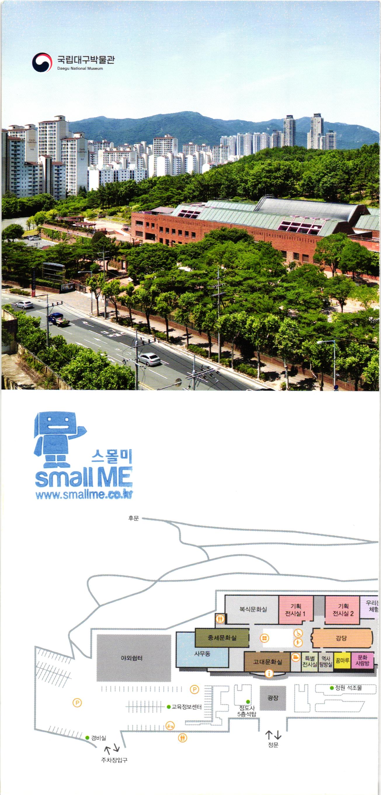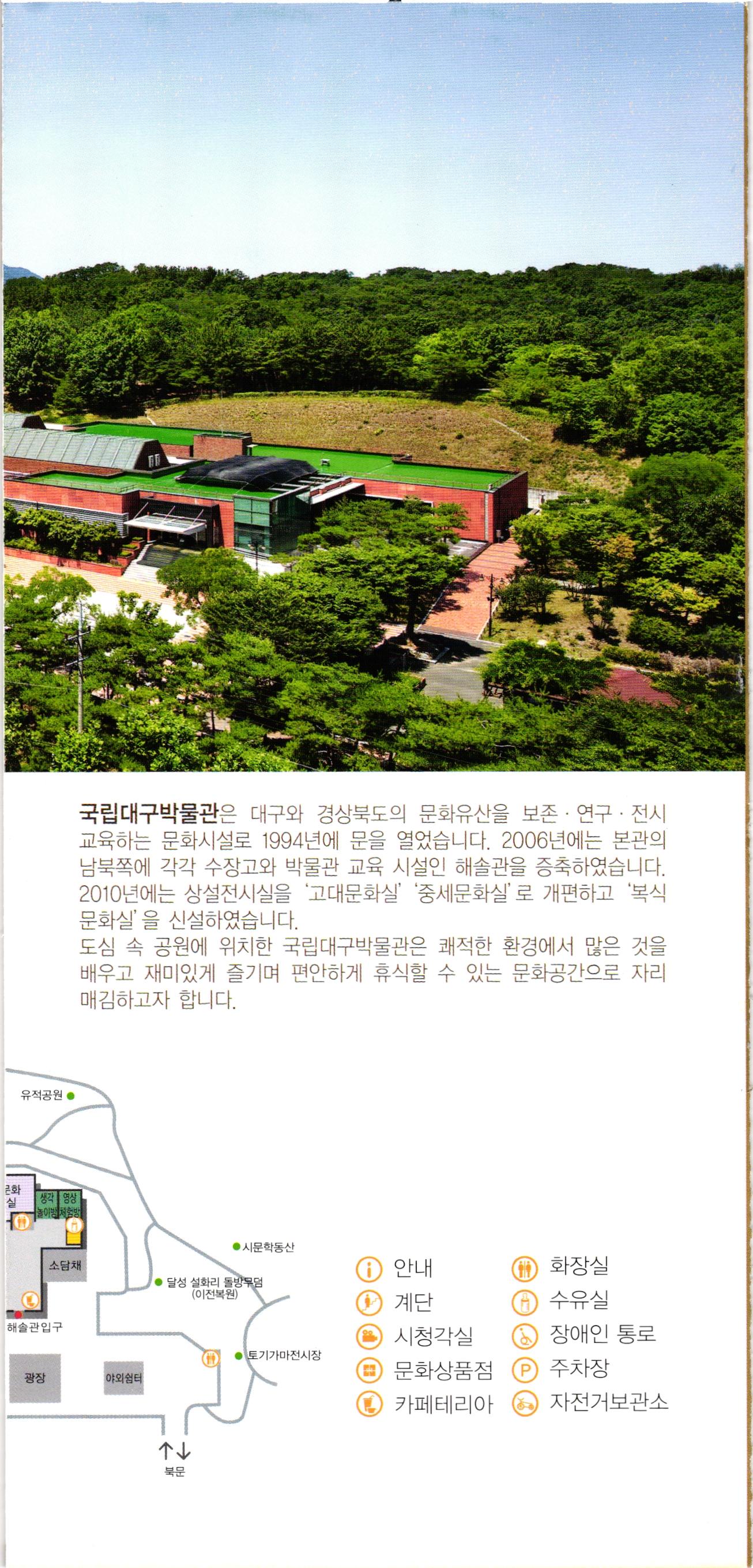 국립대구박물관은 대구와 경상북도의 문화유산을 보존·연구 · 전시 교육하는 문화시설로 1994년에 문을 열었습니다. 2006년에는 본관의 남북쪽에 각각 수장고와 박물관 교육 시설인 해솔관을 증축하였습니다. 2010년에는 상설전시실을 고대문화실' '중세문화실'로 개편하고 복식 문화실'을 신설하였습니다. 도심 속 공원에 위치한 국립대구박물관은 쾌적한 환경에서 많은 것을 배우고 재미있게 즐기며 편안하게 휴식할 수 있는 문화공간으로 자리 매김하고자 합니다. 유적공원 근화 놀이방 방 시문학동산 소담채 ) 남성 성 달성 설화리 돌방무덤 (이전복원) 1 계단 해솔관입구 1 안내 화장실 1 계단 6 수유실 시청각실 장애인 통로 문화상품점 주차장 1 카페테리아 6 자전거보관소 토기가마전시장 광장 야외쉼터, 북문