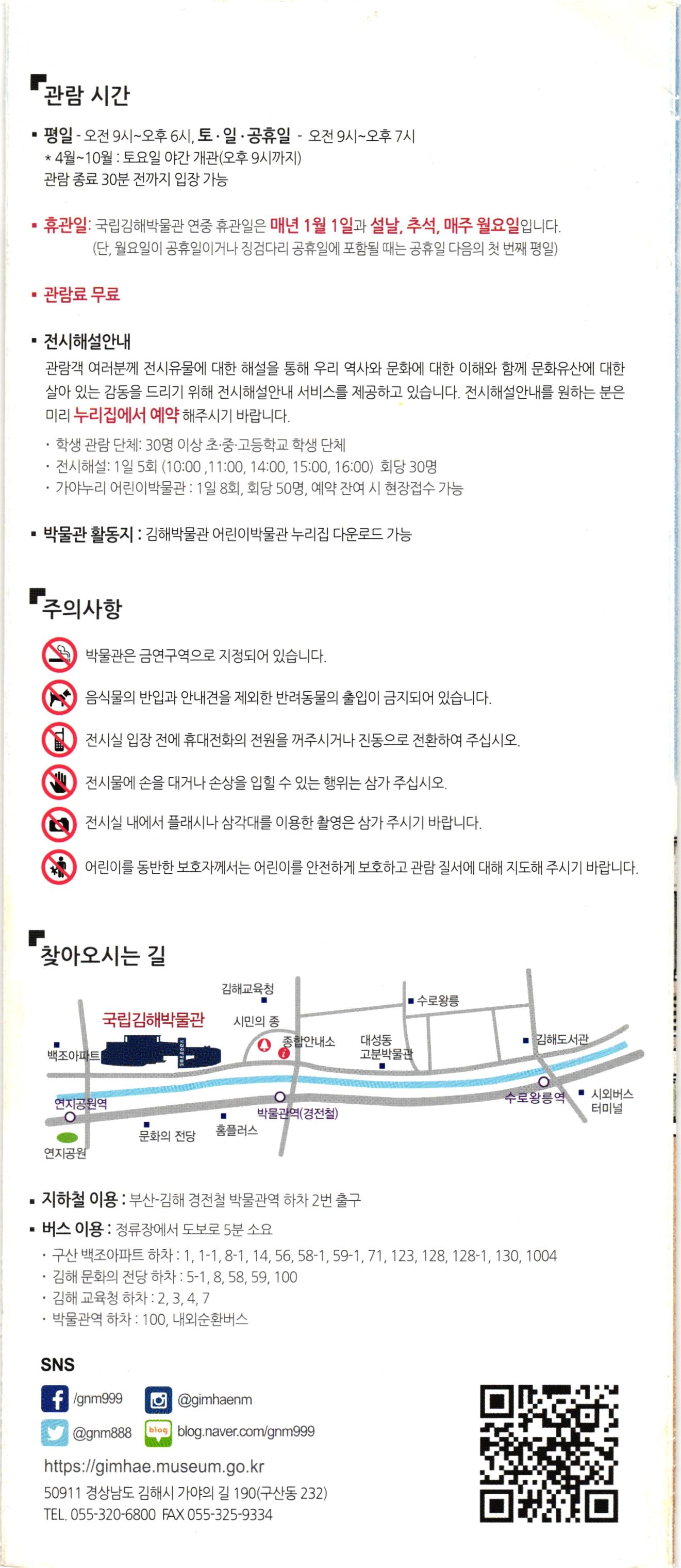 관람 시간 - 평일 - 오전 9시~오후 6시, 토·일·공휴일 - 오전 9시~오후 7시 * 4월~10월 : 토요일 야간 개관(오후 9시까지) 관람 종료 30분 전까지 입장 가능 - 휴관일: 국립김해박물관 연중 휴관일은 매년 1월 1일과 설날, 추석, 매주 월요일입니다. (단, 월요일이 공휴일이거나 징검다리 공휴일에 포함될 때는 공휴일 다음의 첫 번째 평일) - 관람료 무료 - 전시해설안내 관람객 여러분께 전시유물에 대한 해설을 통해 우리 역사와 문화에 대한 이해와 함께 문화유산에 대한 살아 있는 감동을 드리기 위해 전시해설안내 서비스를 제공하고 있습니다. 전시해설안내를 원하는 분은 미리 누리집에서 예약 해주시기 바랍니다. · 학생 관람 단체: 30명 이상 초·중·고등학교 학생 단체 · 전시해설: 1일 5회 (10:00 ,11:00, 14:00, 15:00, 16:00) 회당 30명 · 가야누리 어린이박물관 : 1일 8회, 회당 50명, 예약 잔여 시 현장접수 가능 ■ 박물관 활동지 : 김해박물관 어린이박물관 누리집 다운로드 가능 『주의사항 박물관은 금연구역으로 지정되어 있습니다. 음식물의 반입과 안내견을 제외한 반려동물의 출입이 금지되어 있습니다. 전시실 입장 전에 휴대전화의 전원을 꺼주시거나 진동으로 전환하여 주십시오. 전시물에 손을 대거나 손상을 입힐 수 있는 행위는 삼가 주십시오. 전시실 내에서 플래시나 삼각대를 이용한 촬영은 삼가 주시기 바랍니다. 어린이를 동반한 보호자께서는 어린이를 안전하게 보호하고 관람 질서에 대해 지도해 주시기 바랍니다. 찾아오시는 길 김해교육청 수로왕릉 국립김해박물관 시민의 종 ○ 종합안내소 대성동 고분박물관 ■ 김해도서관 | 아파 백조아파트 연지공원역 수로왕릉역 - 시외버스 터미널 0 박물관역(경전철) 홈플러스 문화의 전당 연지공원 - 지하철 이용 : 부산-김해 경전철 박물관역 하차 2번 출구 - 버스 이용 : 정류장에서 도보로 5분 소요 · 구산 백조아파트 하차 : 1, 1-1, 8-1, 14, 56, 58-1, 59-1, 71, 123, 128, 128-1, 130, 1004 · 김해 문화의 전당 하차 : 5-1, 8, 58, 59, 100 · 김해 교육청 하차 : 2, 3, 4, 7 · 박물관역 하차 : 100, 내외순환버스 SNS fgnm999 @gimhaenm y @gnm888 blog blog.naver.com/gnm999 https://gimhae.museum.go.kr 50911 경상남도 김해시 가야의 길 190(구산동 232) TEL. 055-320-6800 FAX 055-325-9334