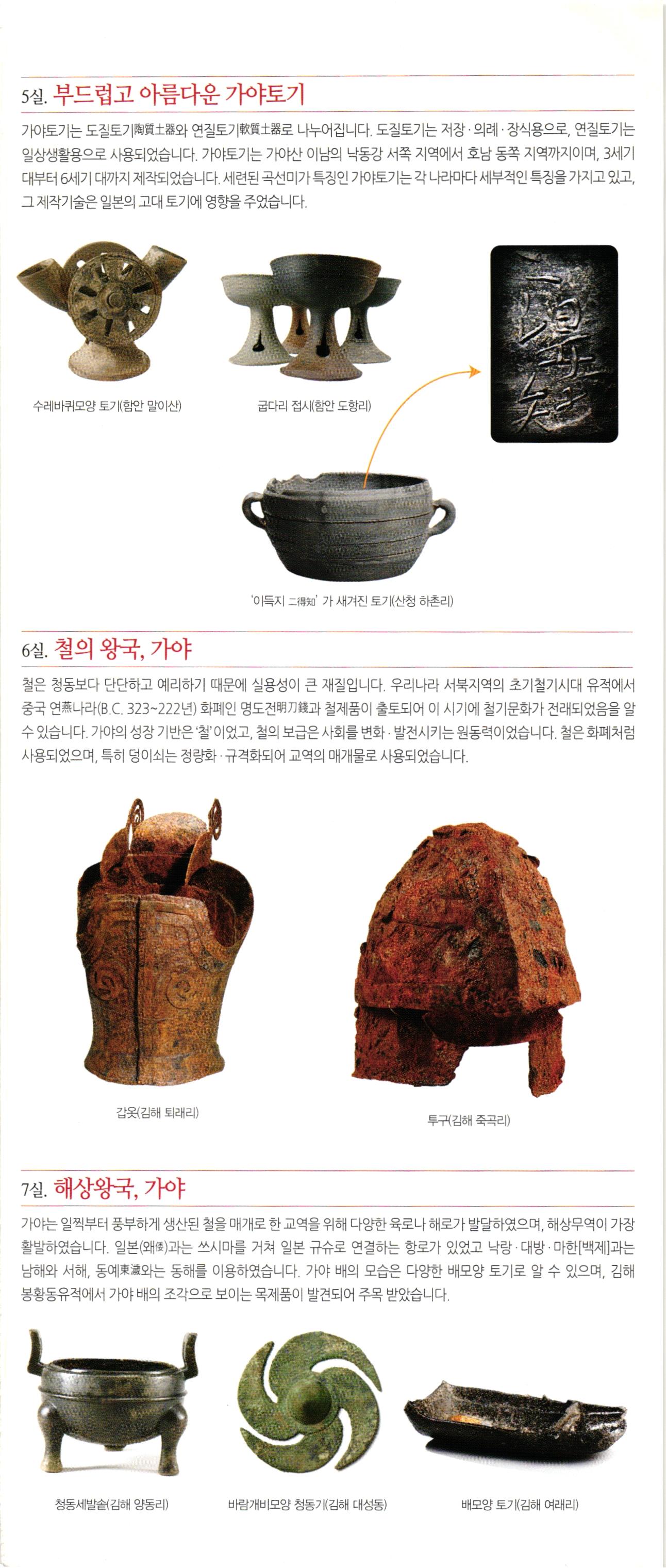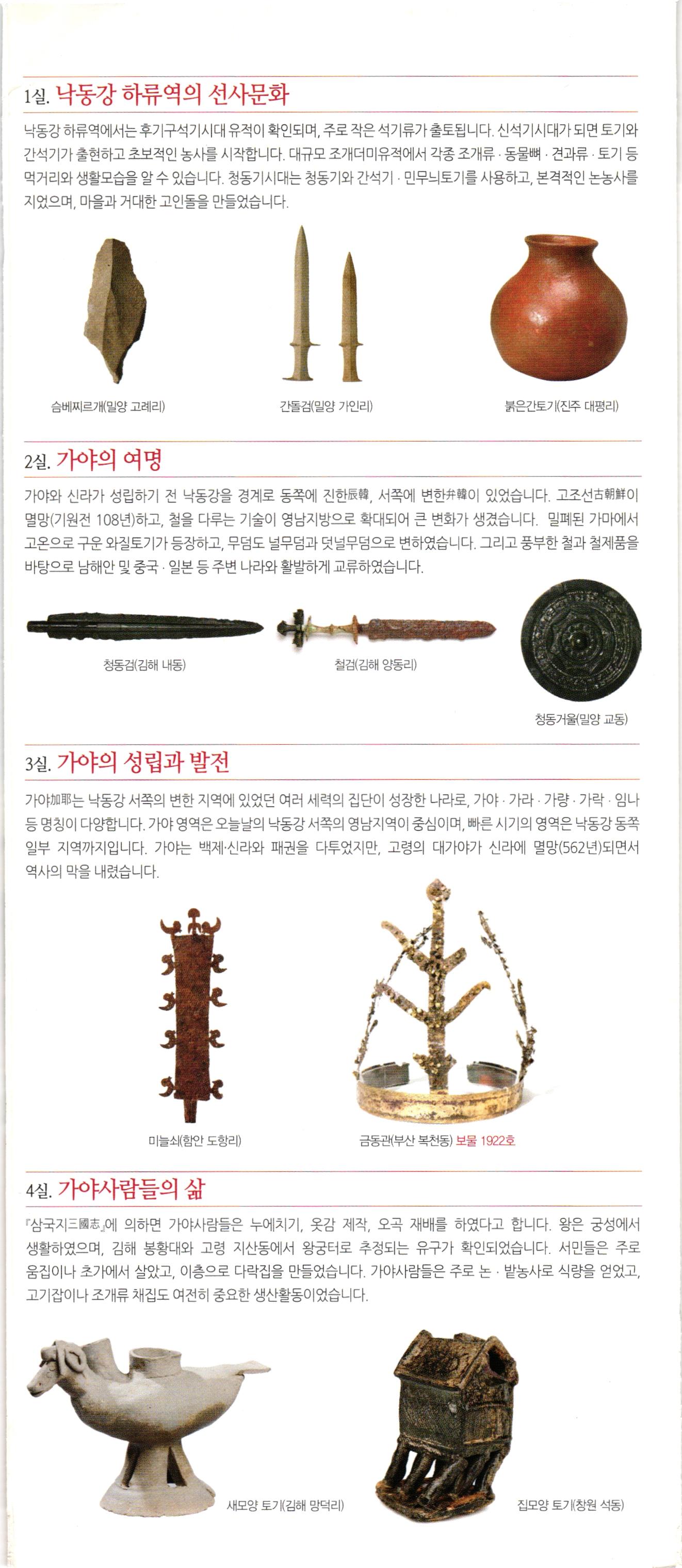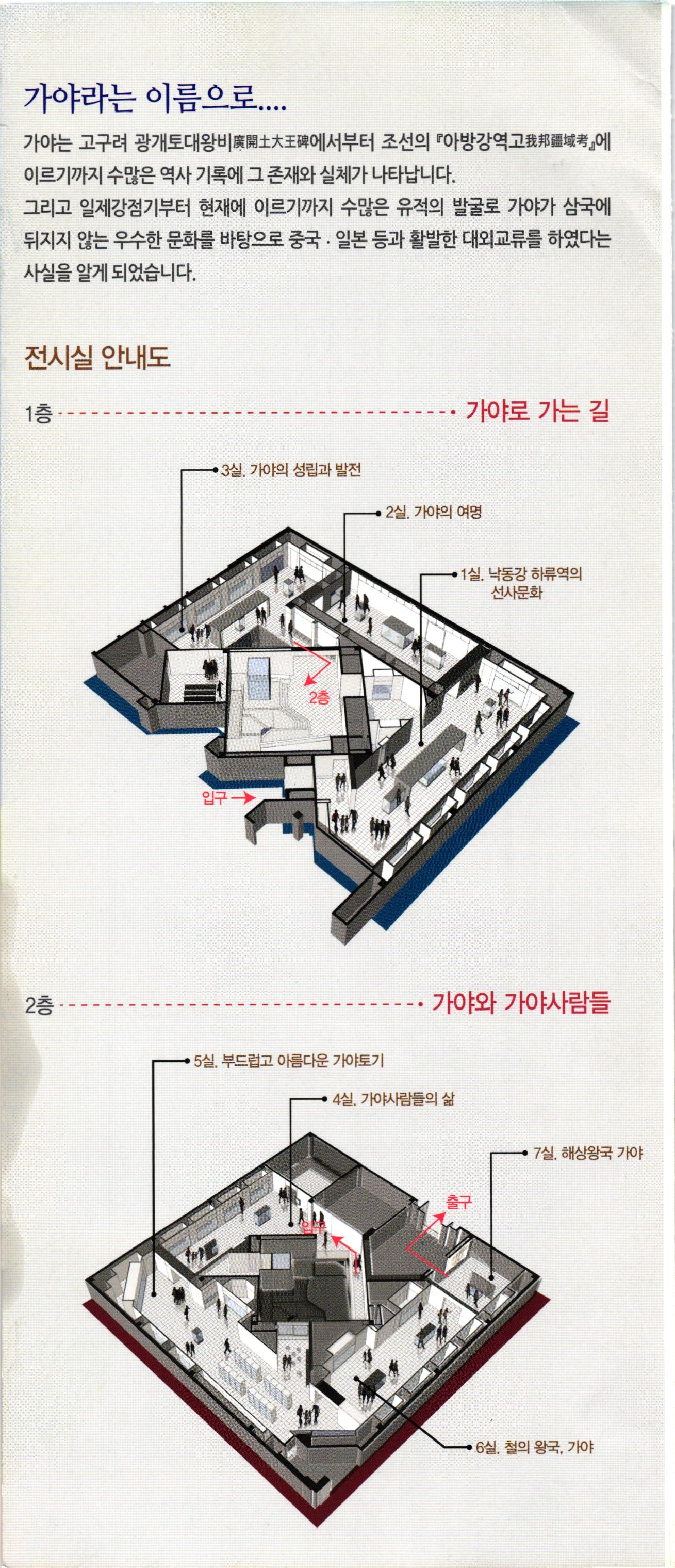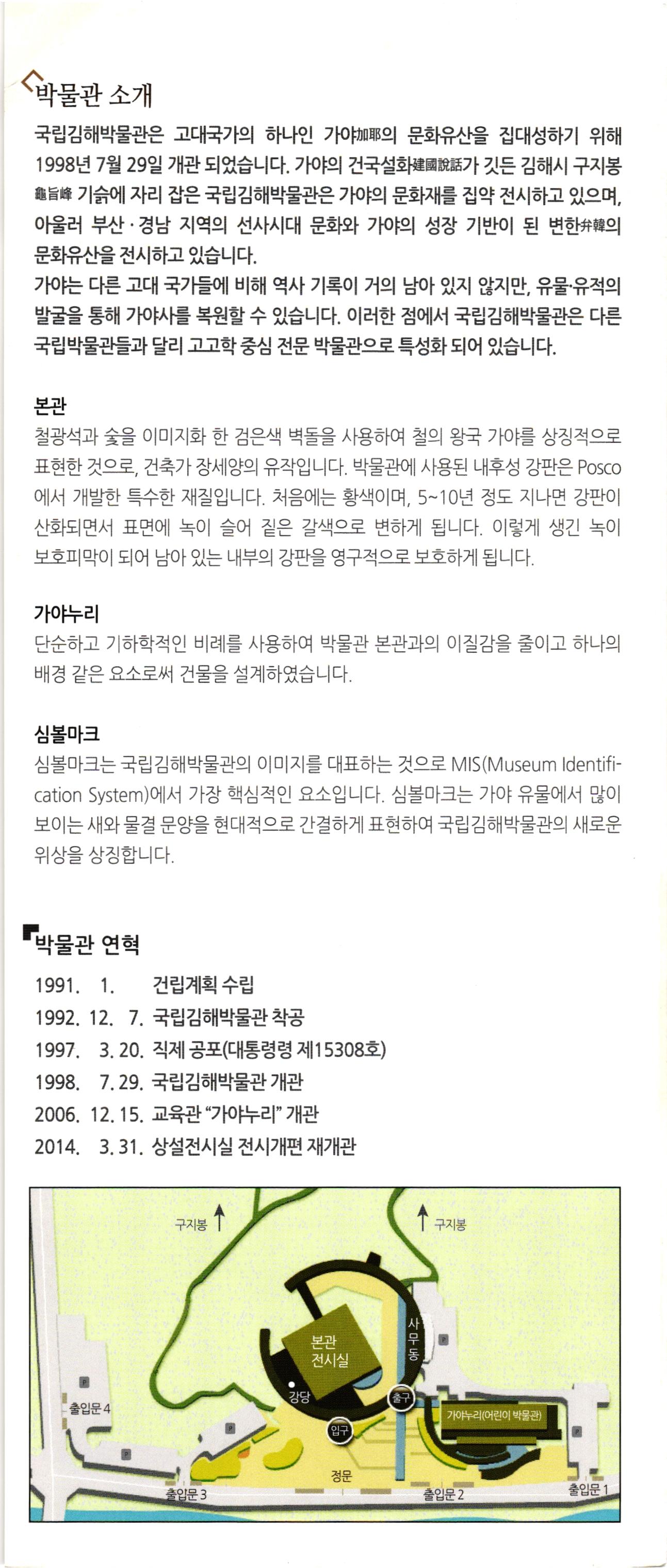박물관 소개 국립김해박물관은 고대국가의 하나인 가야加耶의 문화유산을 집대성하기 위해 1998년 7월 29일 개관 되었습니다. 가야의 건국설화建國說話가 깃든 김해시 구지봉 龜旨峰 기슭에 자리 잡은 국립김해박물관은 가야의 문화재를 집약 전시하고 있으며, 아울러 부산·경남 지역의 선사시대 문화와 가야의 성장 기반이 된 변한弁韓의 문화유산을 전시하고 있습니다. 가야는 다른 고대 국가들에 비해 역사 기록이 거의 남아 있지 않지만, 유물·유적의 발굴을 통해 가야사를 복원할 수 있습니다. 이러한 점에서 국립김해박물관은 다른 국립박물관들과 달리 고고학 중심 전문 박물관으로 특성화 되어 있습니다. 본관 철광석과 숯을 이미지화 한 검은색 벽돌을 사용하여 철의 왕국 가야를 상징적으로 표현한 것으로, 건축가 장세양의 유작입니다. 박물관에 사용된 내후성 강판은 Posco 에서 개발한 특수한 재질입니다. 처음에는 황색이며, 5~10년 정도 지나면 강판이 산화되면서 표면에 녹이 슬어 짙은 갈색으로 변하게 됩니다. 이렇게 생긴 녹이 보호피막이 되어 남아 있는 내부의 강판을 영구적으로 보호하게 됩니다. 가야누리 단순하고 기하학적인 비례를 사용하여 박물관 본관과의 이질감을 줄이고 하나의 배경 같은 요소로써 건물을 설계하였습니다. 심볼마크 심볼마크는 국립김해박물관의 이미지를 대표하는 것으로 MIS(Museum Identification System)에서 가장 핵심적인 요소입니다. 심볼마크는 가야 유물에서 많이 보이는 새와 물결 문양을 현대적으로 간결하게 표현하여 국립김해박물관의 새로운 위상을 상징합니다. 박물관 연혁 1991. 1. 건립계획 수립 1992. 12. 7. 국립김해박물관 착공 1997. 3. 20. 직제 공포(대통령령 제15308호) 1998. 7.29. 국립김해박물관 개관 2006. 12.15. 교육관 “가야누리” 개관 2014. 3.31. 상설전시실 전시개편 재개관 구지봉 | | 구지봉 | 사 본관 전시실 무 동 출구 출입문 4 가야누리어린이 박물관) 입구 정문 출입문 3 출입문 2 출입문 1