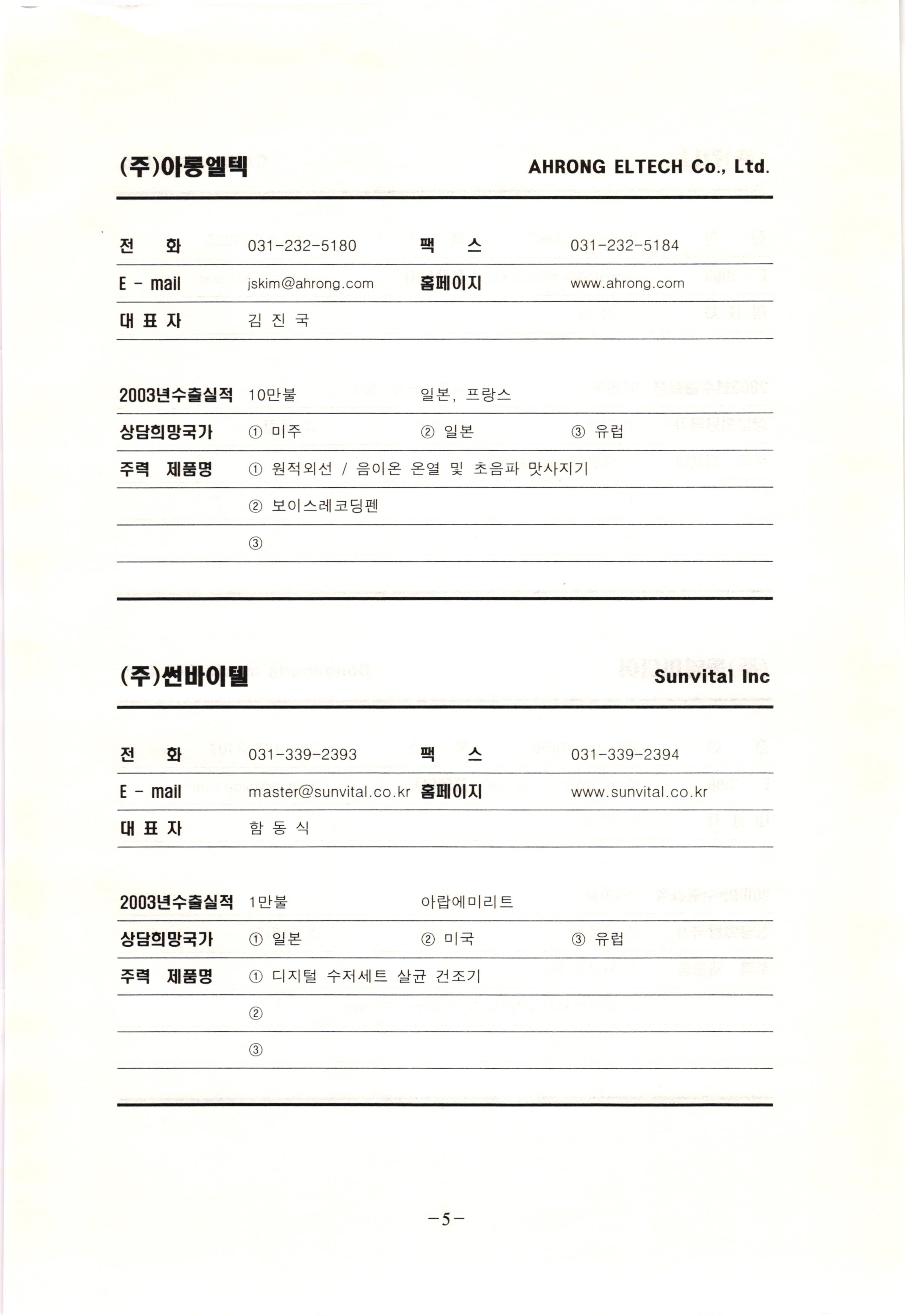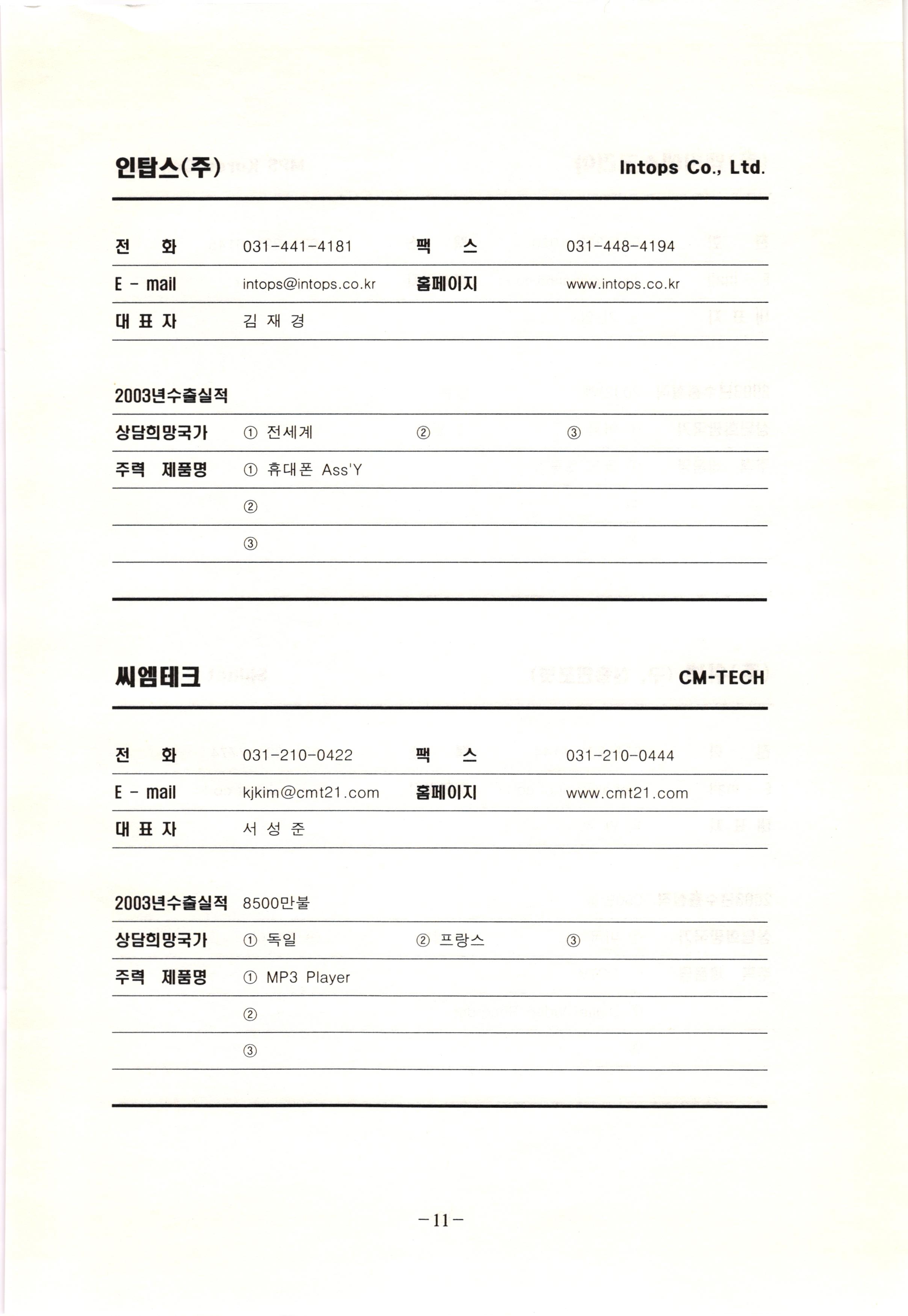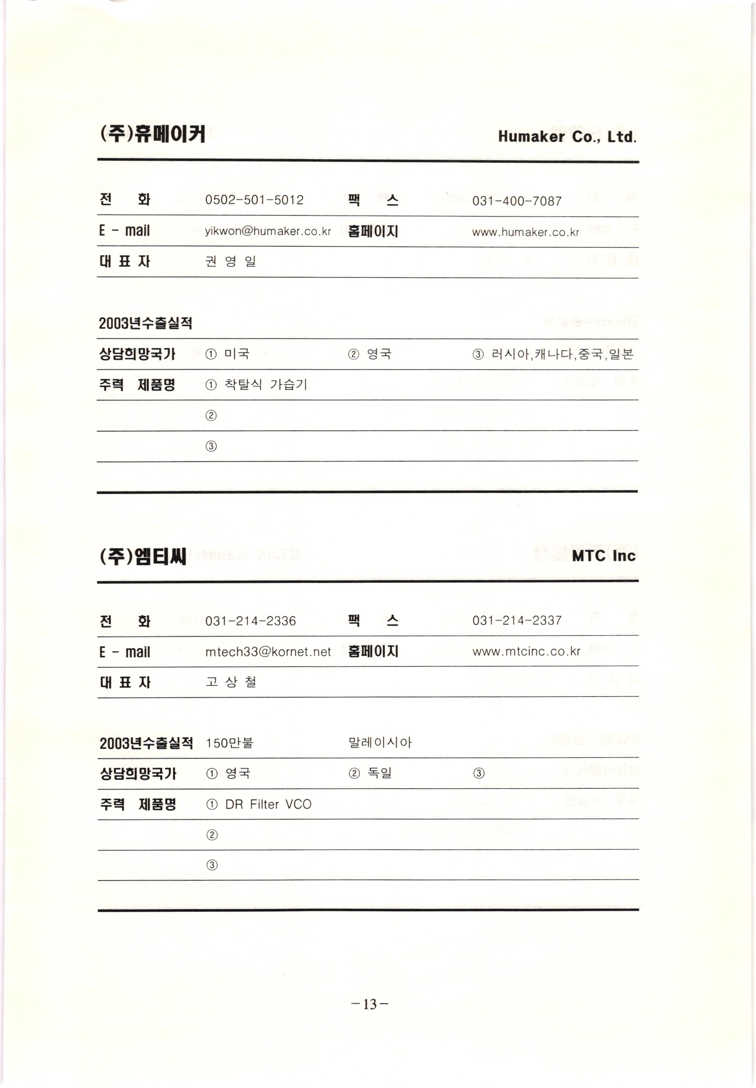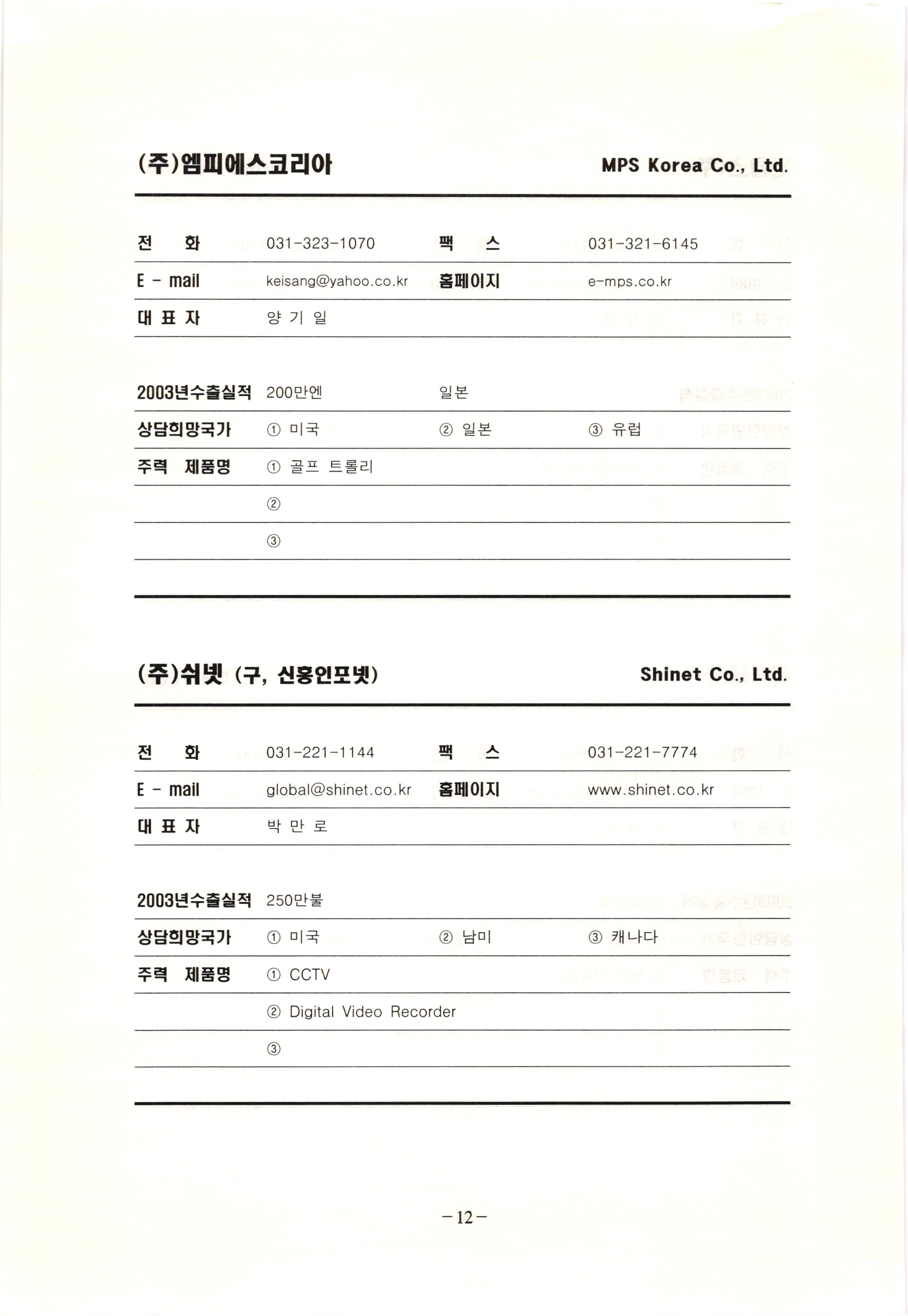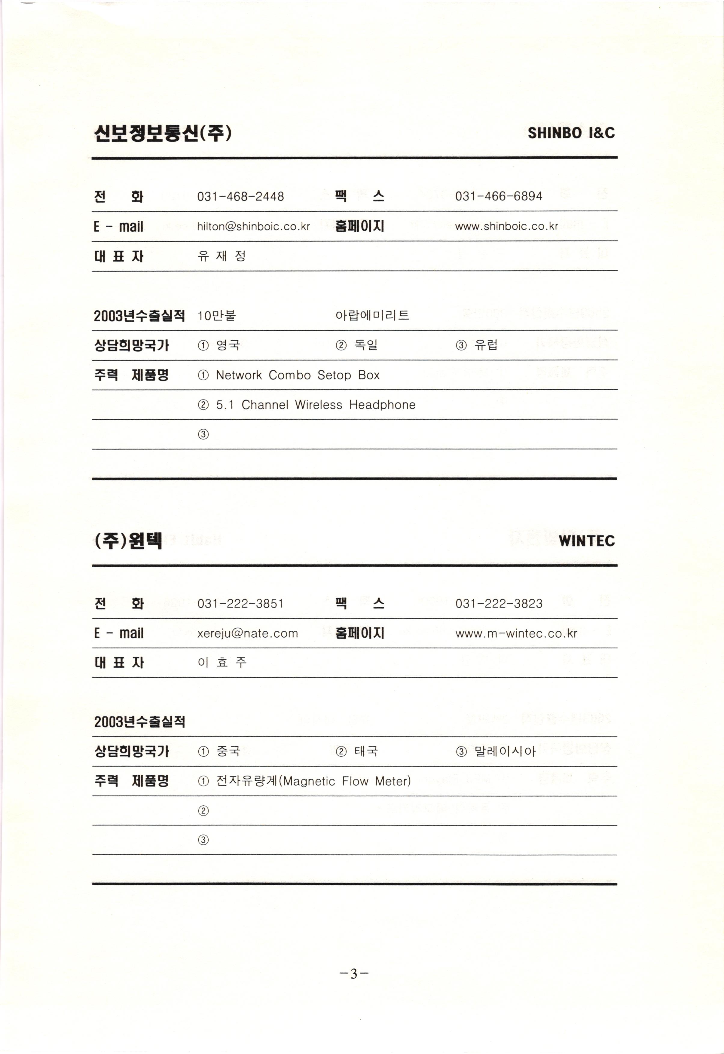 신보정보통신(주) SHINBO I&C 전 화 031-468-2448 팩 스 031-466-6894 E - mail hilton@shinboic.co.kr 홈페이지 www.shinboic.co.kr 대표자 유 재정 2003년수출실적 10만불 | 아랍에미리트 상담희망국가 1 영국 2 독일 3 유럽 주력 제품명 1 Network Combo Setop Box 2 5.1 Channel Wireless Headphone (주)원텍 WINTEC 전 화 팩 031-222-3823 2 031-222-3851 xereju@nate.com 스 홈페이지 E - mail www.m-wintec.co.kr 대표자 이 효주 2003년수출실적 상담희망국가 1 중국 2 태국 3 말레이시아 주력 제품명 1 전자유량계(Magnetic Flow Meter) -3