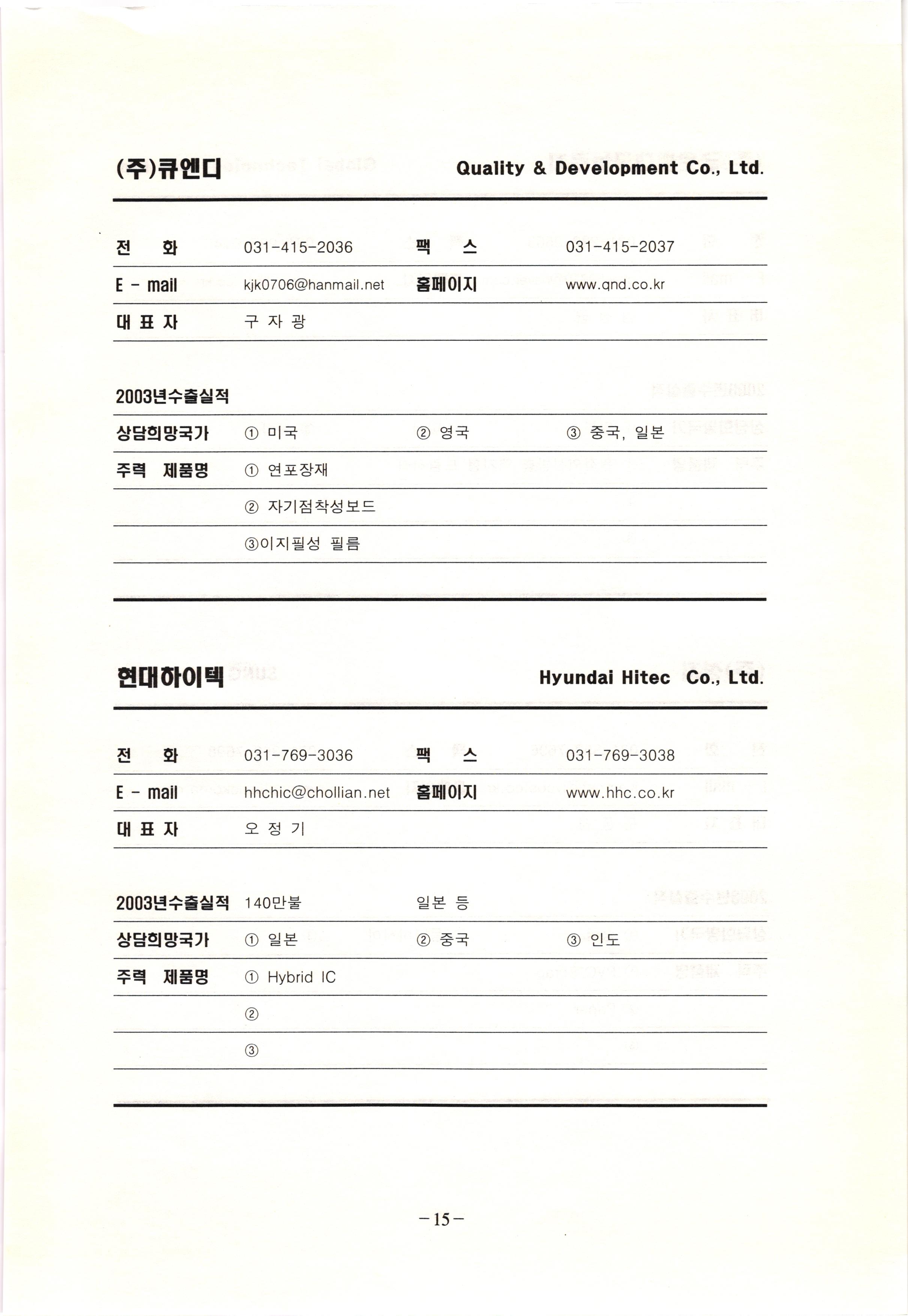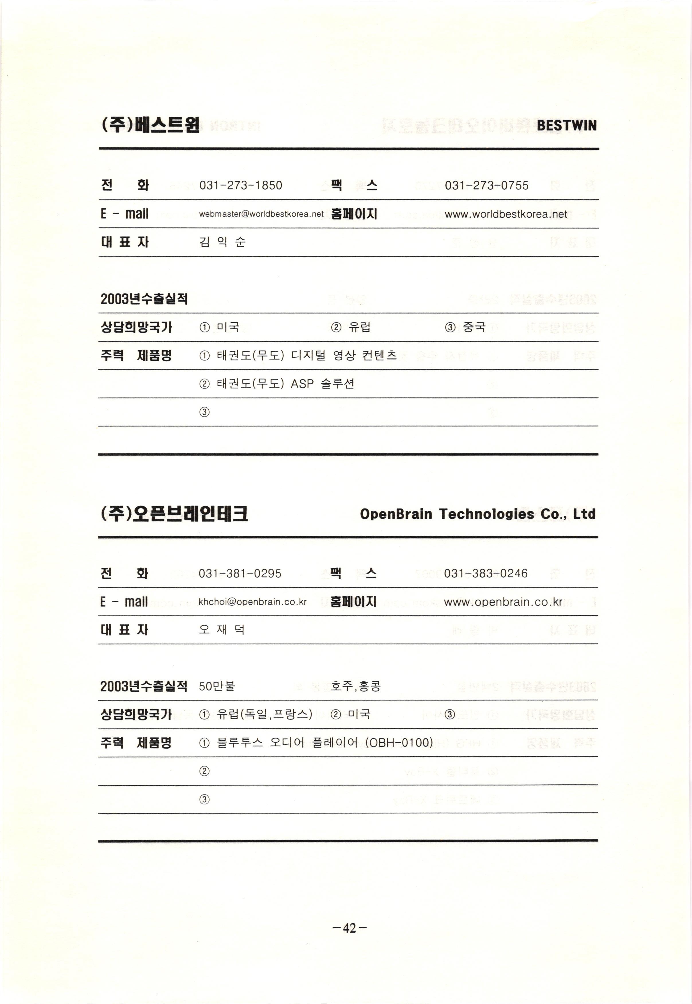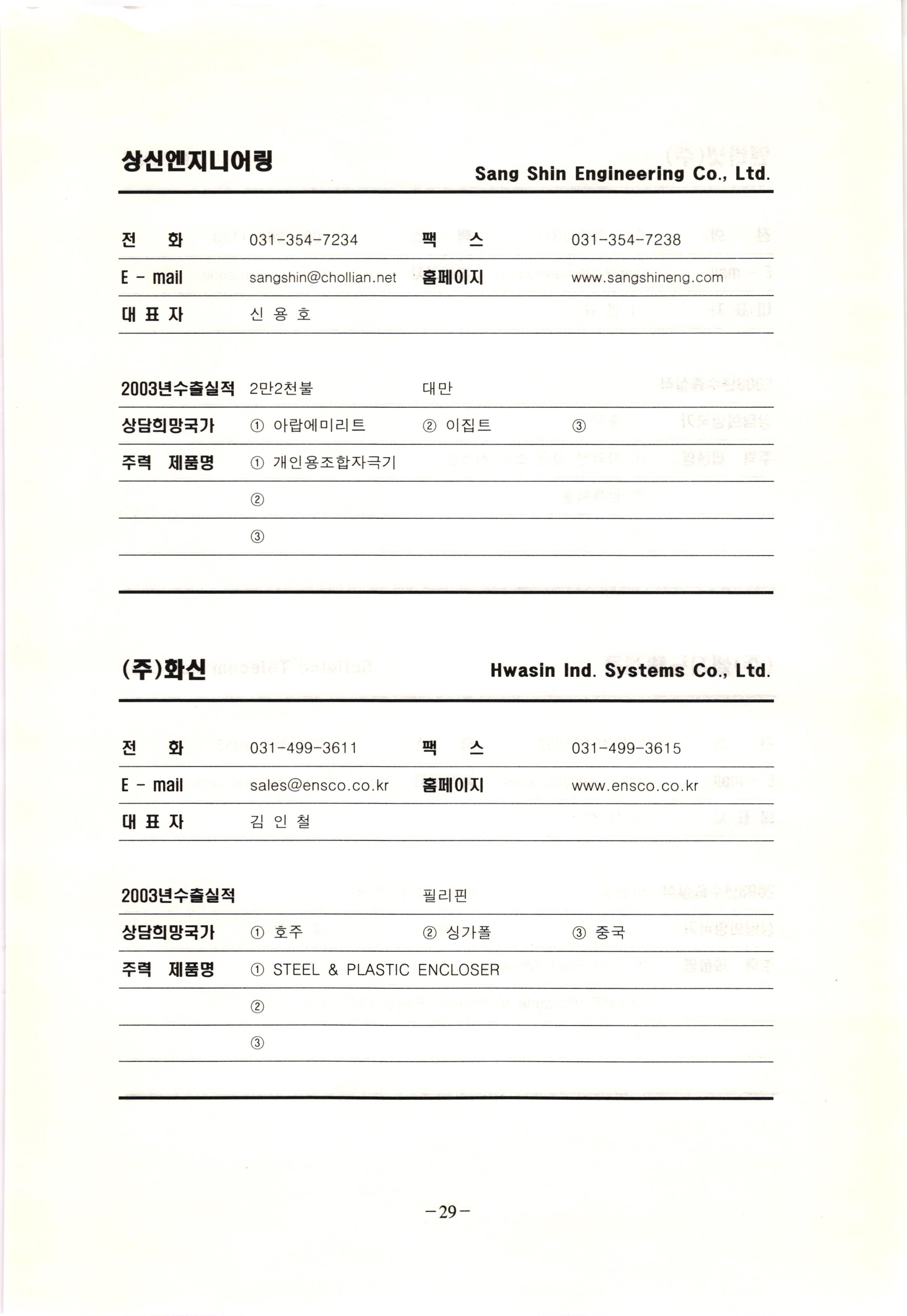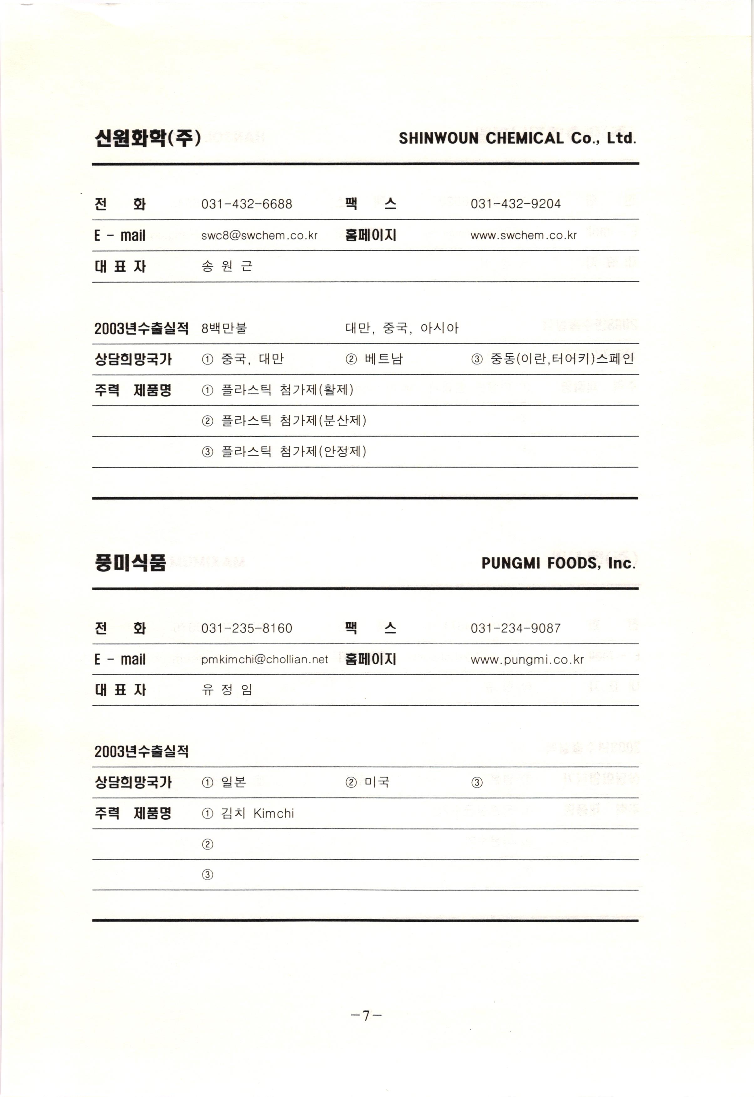 신보정보통신(주) SHINBO I&C 전 화 031-468-2448 팩 스 031-466-6894 E - mail hilton@shinboic.co.kr 홈페이지 www.shinboic.co.kr 대표자 유 재정 2003년수출실적 10만불 | 아랍에미리트 상담희망국가 1 영국 2 독일 3 유럽 주력 제품명 1 Network Combo Setop Box 2 5.1 Channel Wireless Headphone (주)원텍 WINTEC 전 화 팩 031-222-3823 2 031-222-3851 xereju@nate.com 스 홈페이지 E - mail www.m-wintec.co.kr 대표자 이 효주 2003년수출실적 상담희망국가 1 중국 2 태국 3 말레이시아 주력 제품명 1 전자유량계(Magnetic Flow Meter) -3