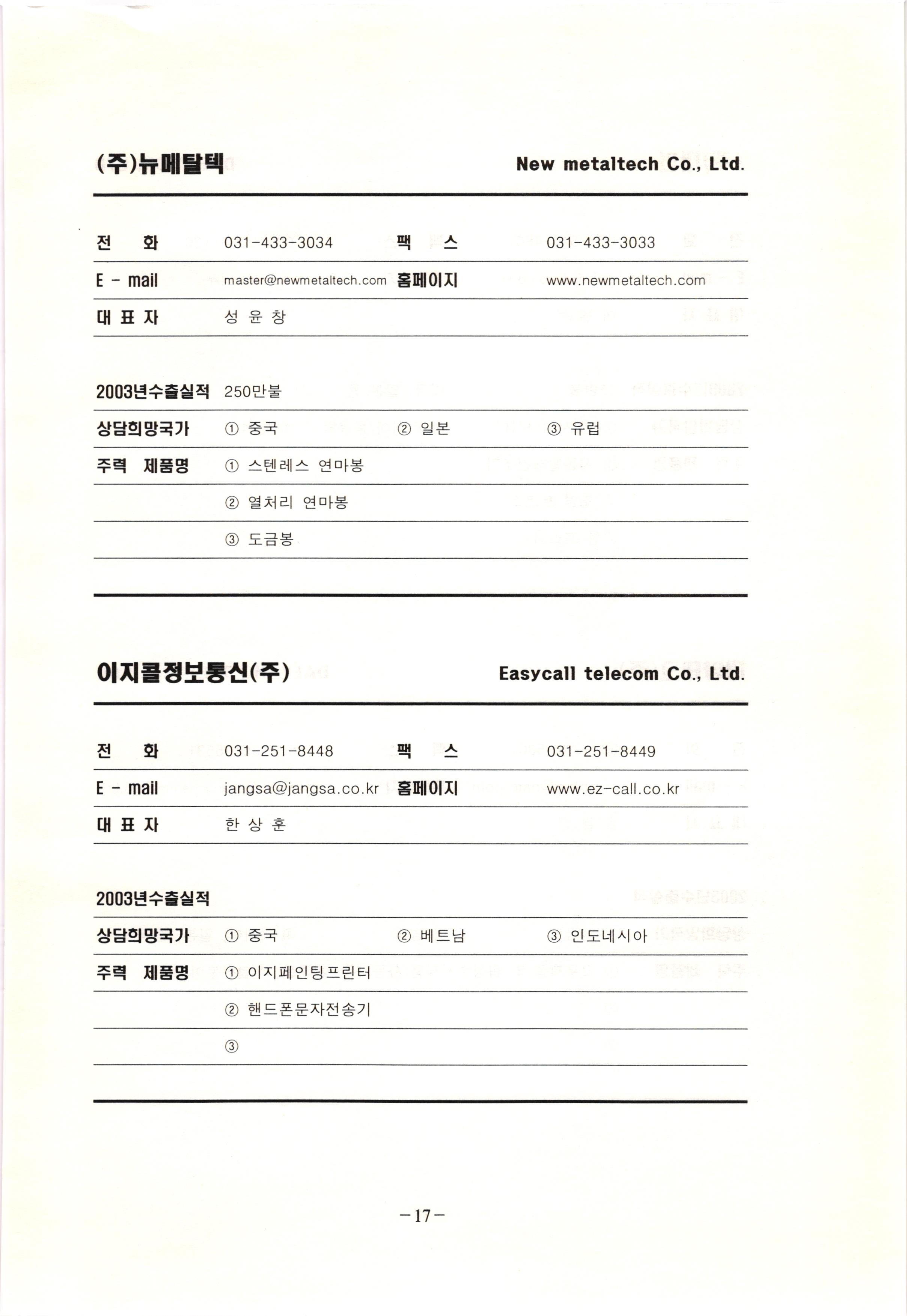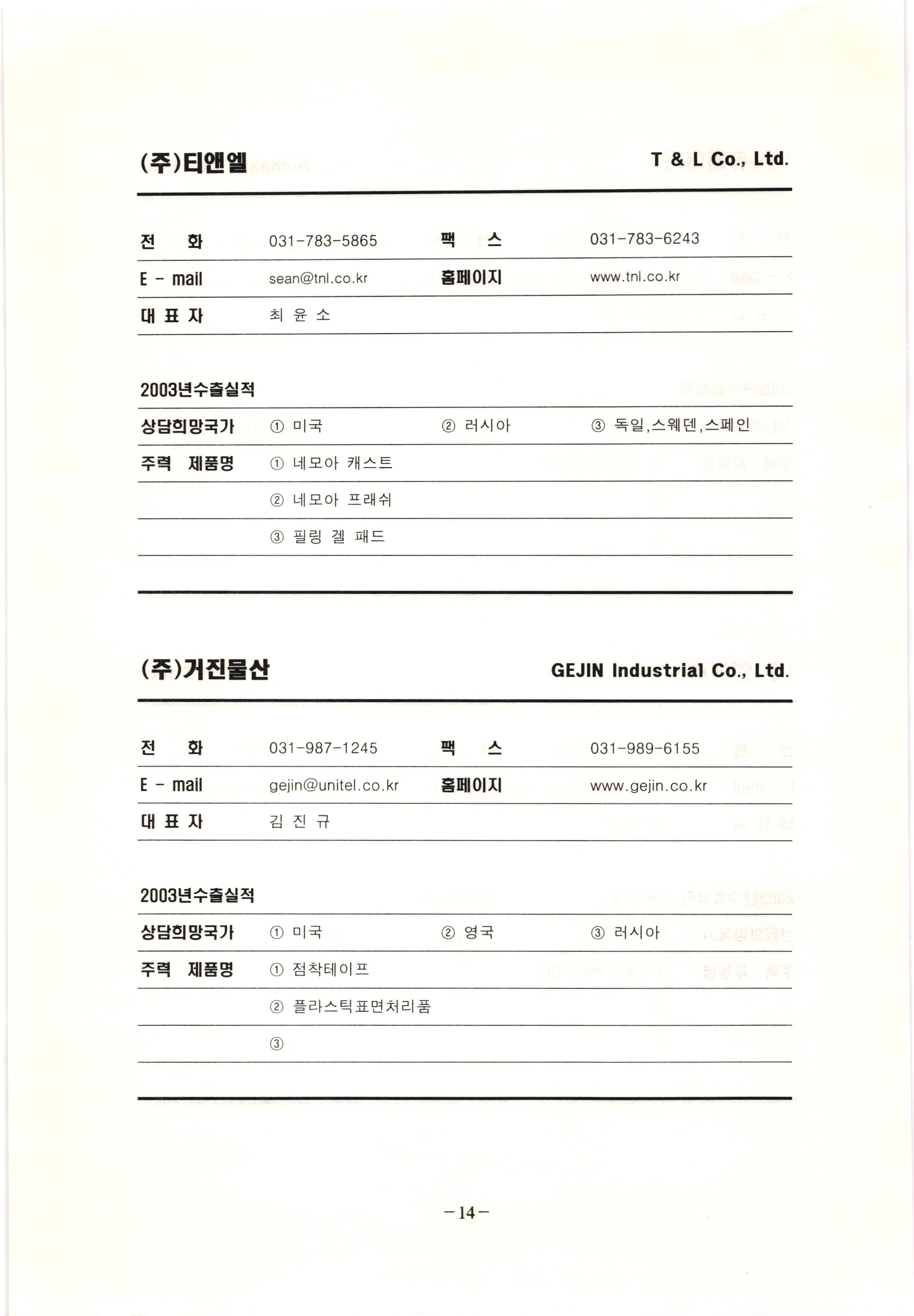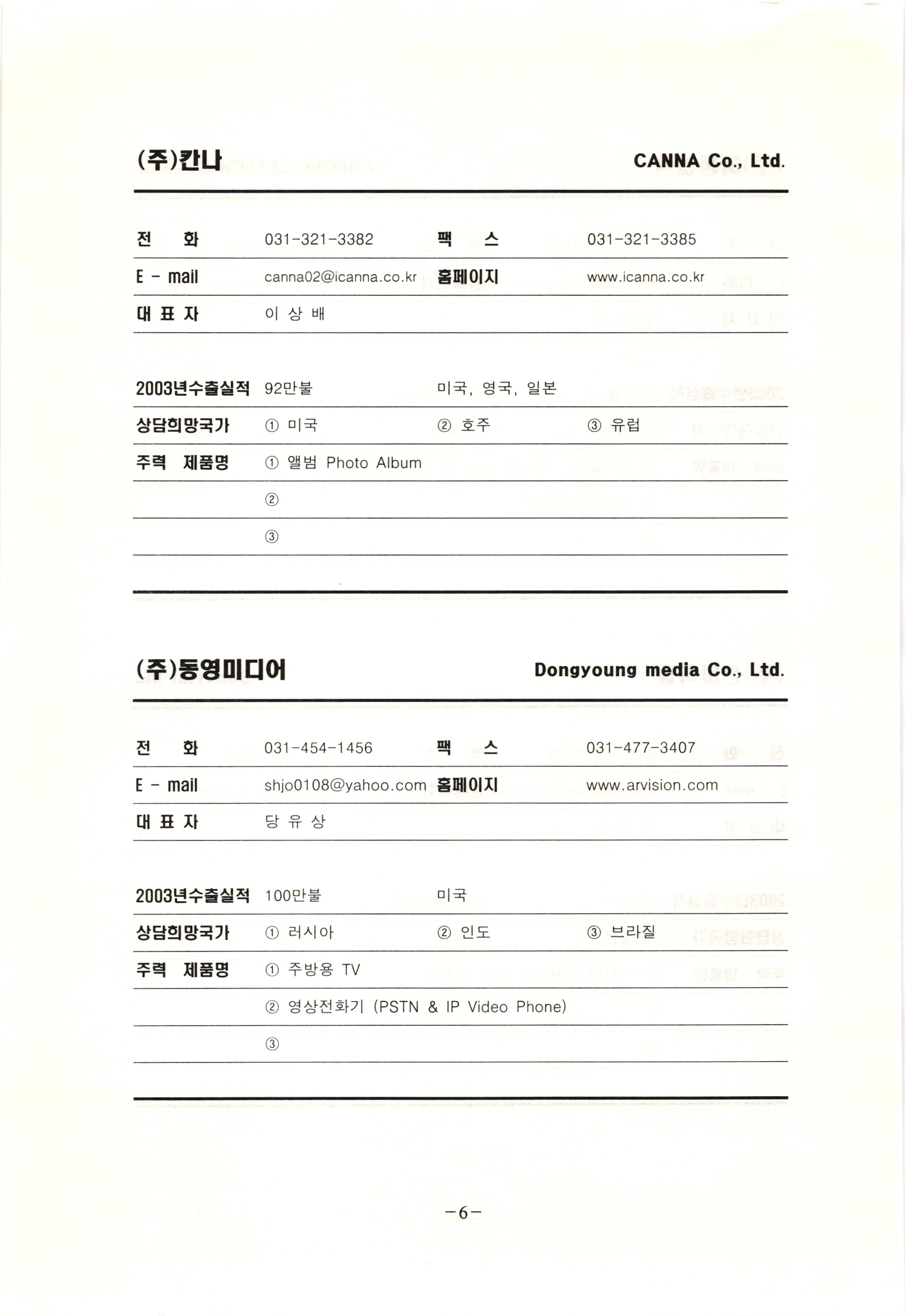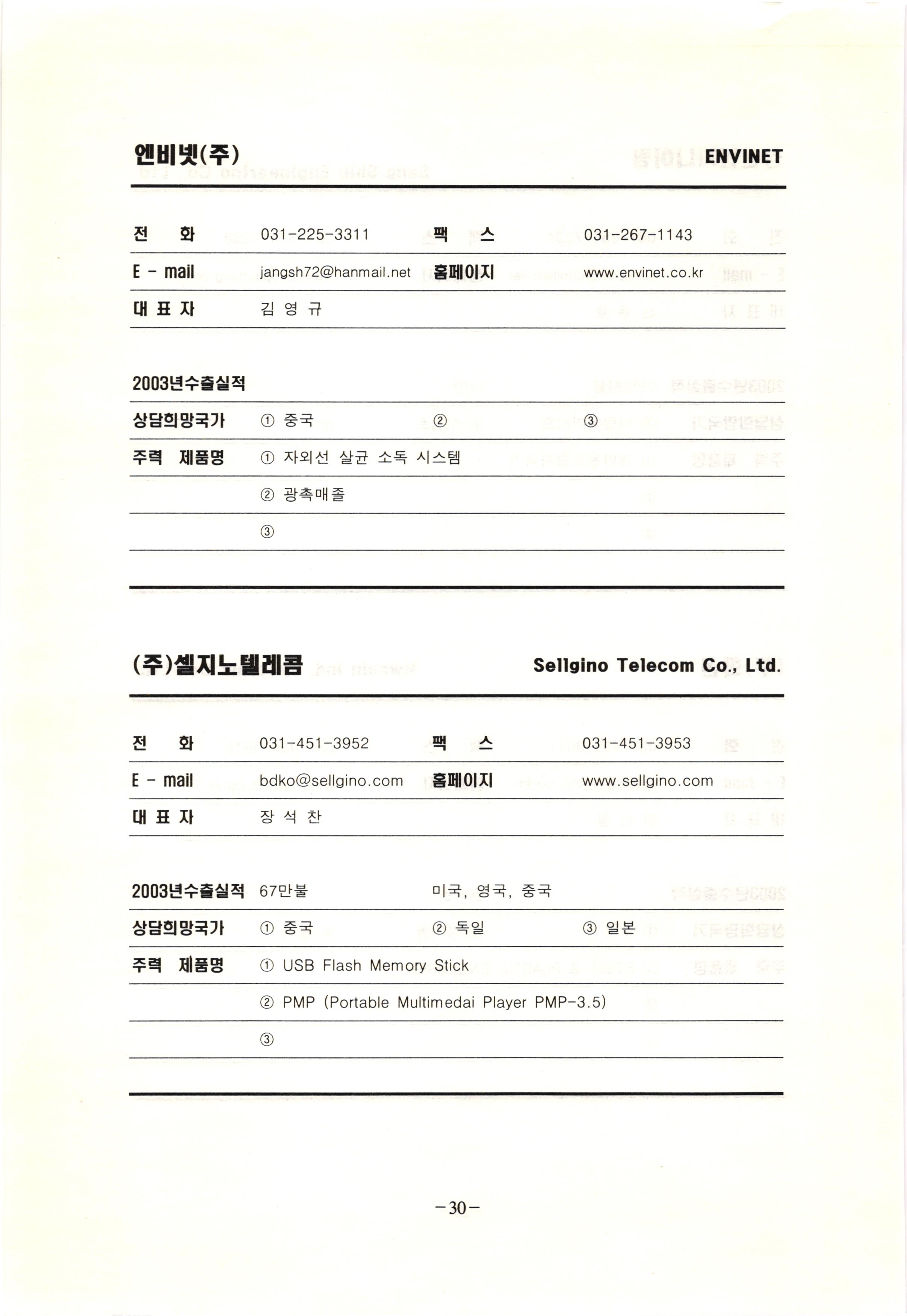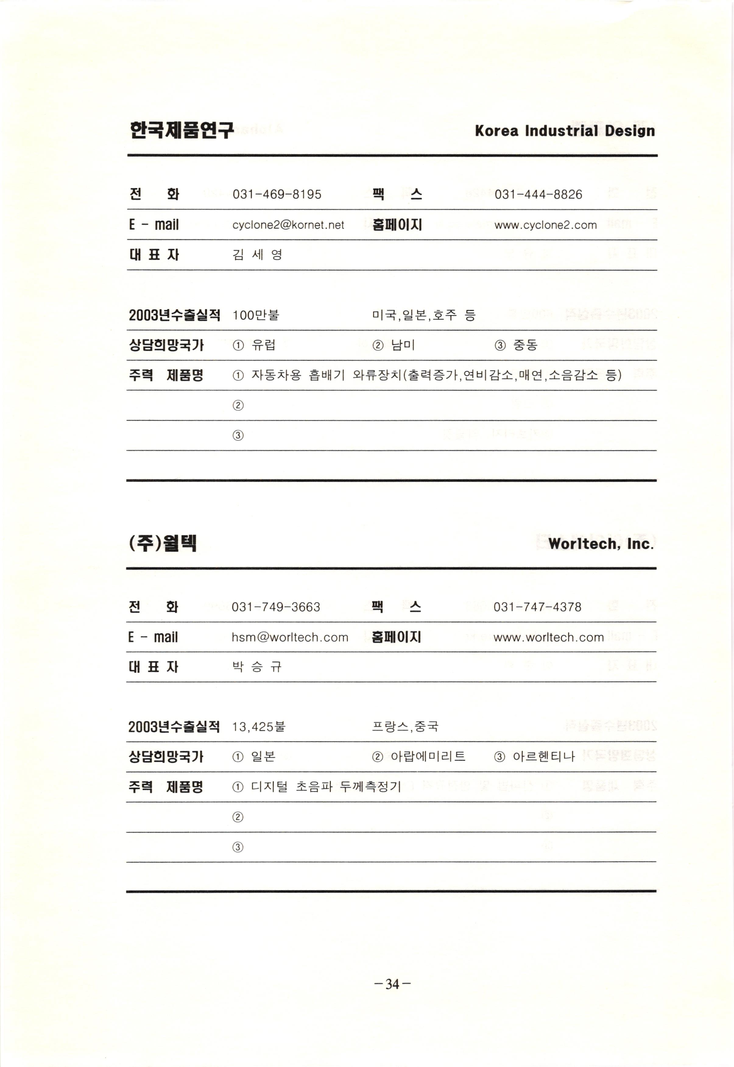 신보정보통신(주) SHINBO I&C 전 화 031-468-2448 팩 스 031-466-6894 E - mail hilton@shinboic.co.kr 홈페이지 www.shinboic.co.kr 대표자 유 재정 2003년수출실적 10만불 | 아랍에미리트 상담희망국가 1 영국 2 독일 3 유럽 주력 제품명 1 Network Combo Setop Box 2 5.1 Channel Wireless Headphone (주)원텍 WINTEC 전 화 팩 031-222-3823 2 031-222-3851 xereju@nate.com 스 홈페이지 E - mail www.m-wintec.co.kr 대표자 이 효주 2003년수출실적 상담희망국가 1 중국 2 태국 3 말레이시아 주력 제품명 1 전자유량계(Magnetic Flow Meter) -3