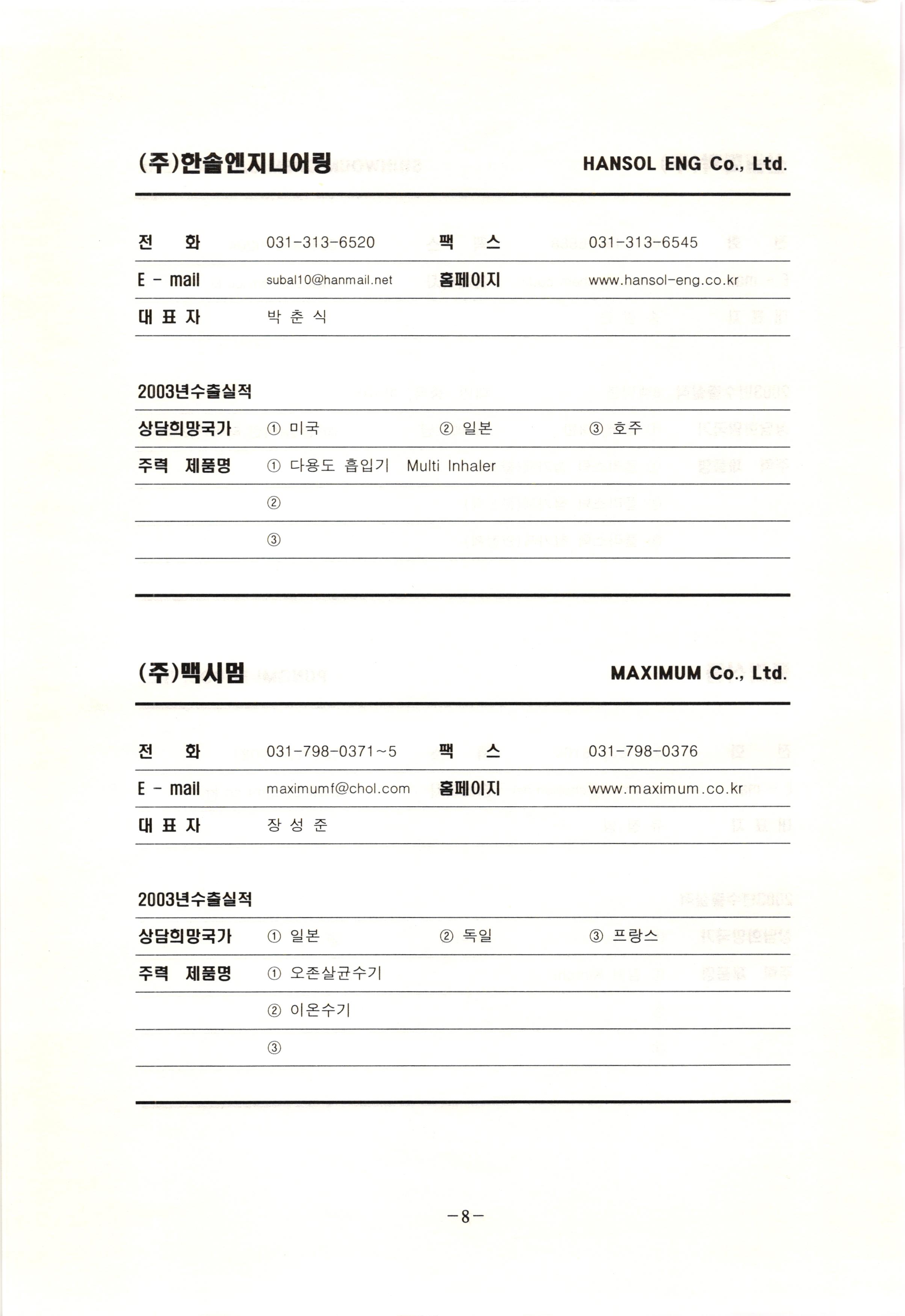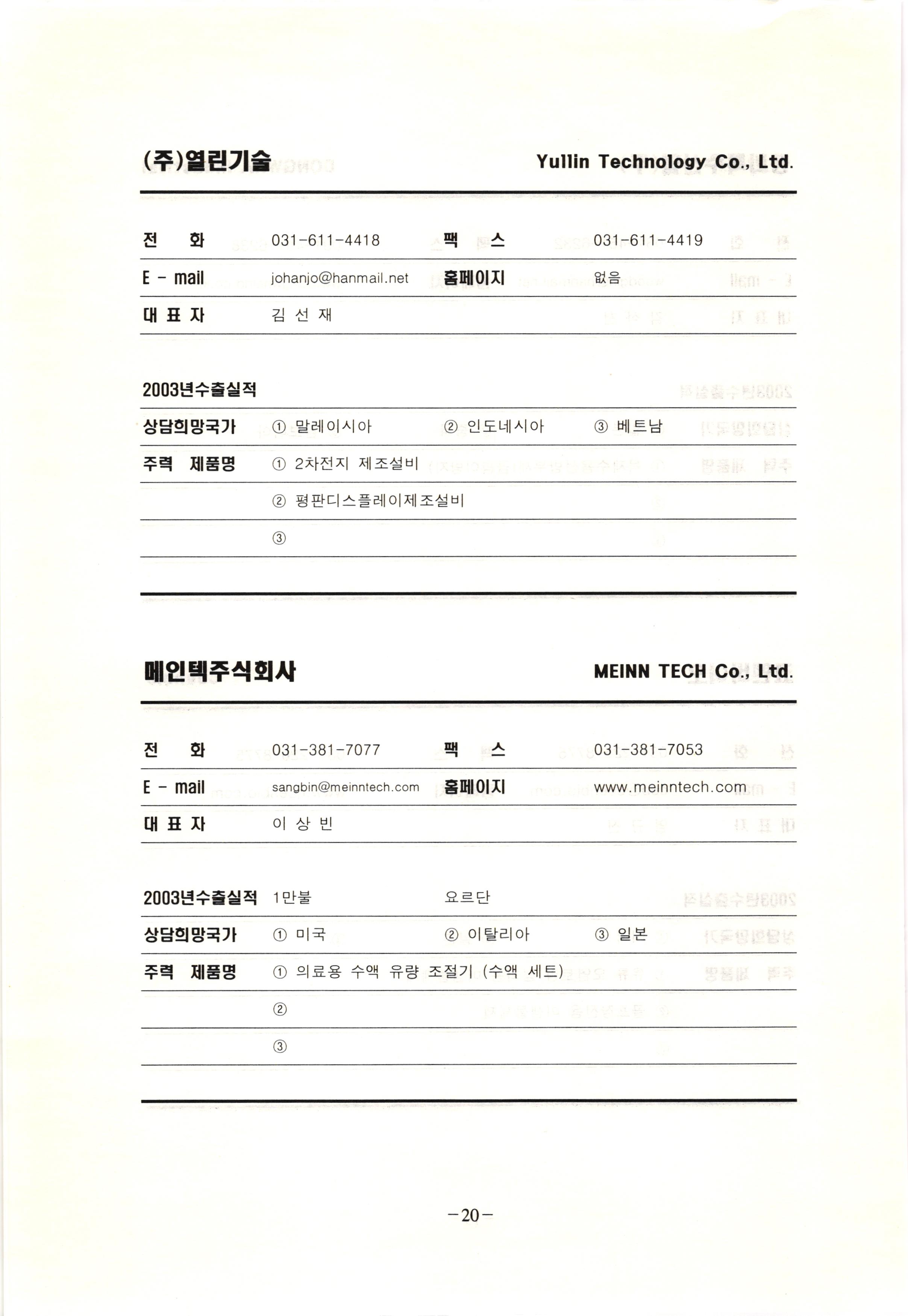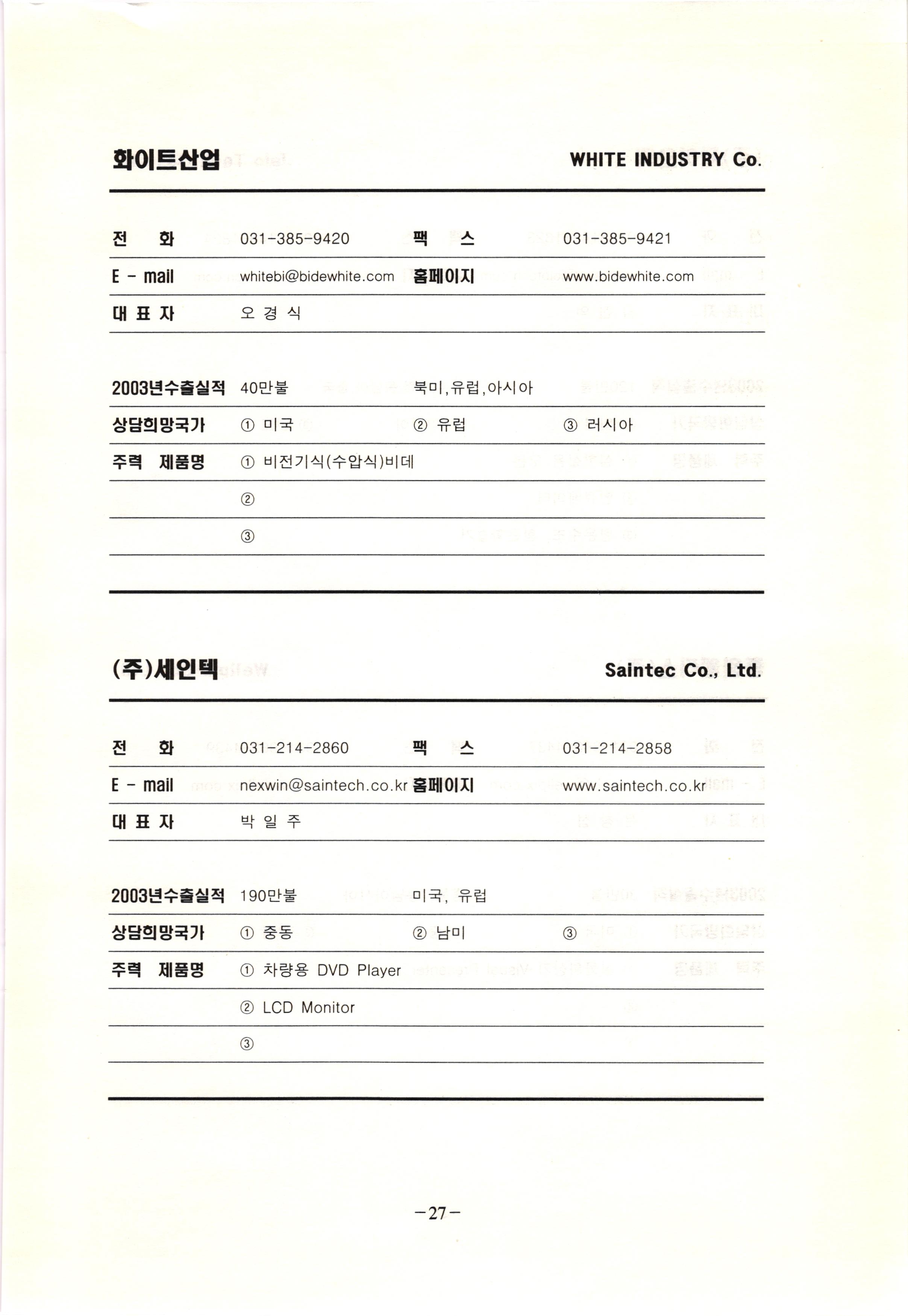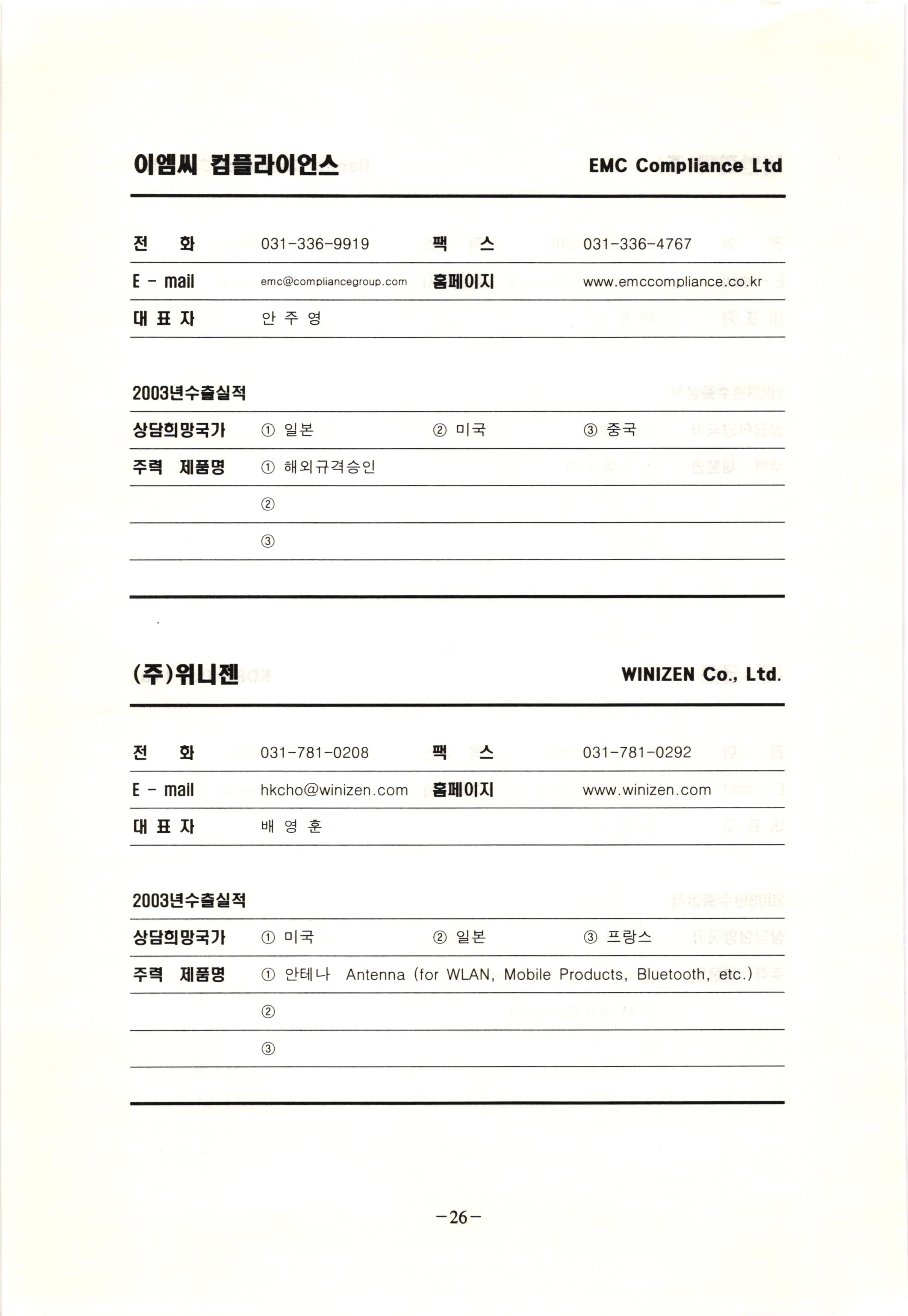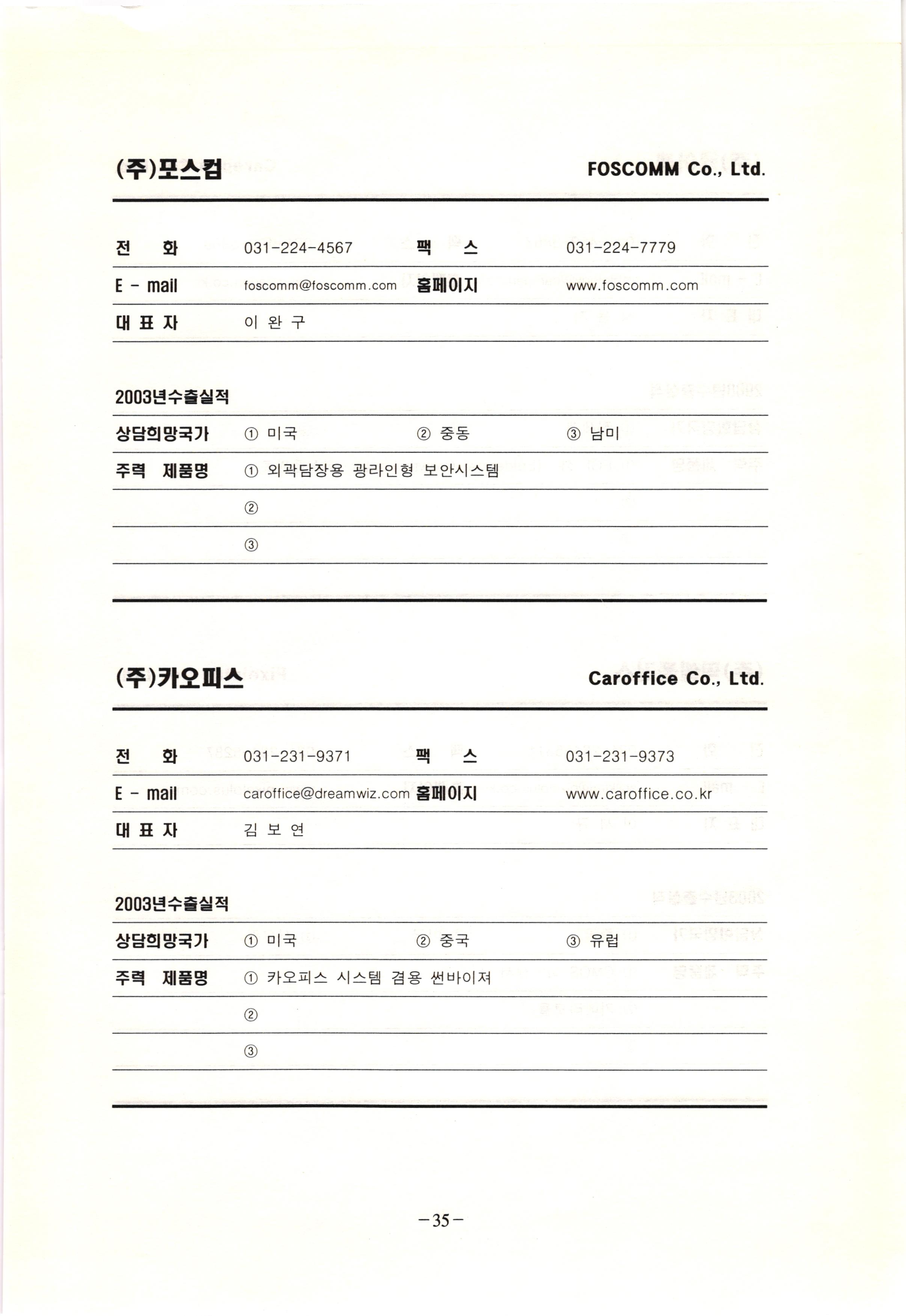 신보정보통신(주) SHINBO I&C 전 화 031-468-2448 팩 스 031-466-6894 E - mail hilton@shinboic.co.kr 홈페이지 www.shinboic.co.kr 대표자 유 재정 2003년수출실적 10만불 | 아랍에미리트 상담희망국가 1 영국 2 독일 3 유럽 주력 제품명 1 Network Combo Setop Box 2 5.1 Channel Wireless Headphone (주)원텍 WINTEC 전 화 팩 031-222-3823 2 031-222-3851 xereju@nate.com 스 홈페이지 E - mail www.m-wintec.co.kr 대표자 이 효주 2003년수출실적 상담희망국가 1 중국 2 태국 3 말레이시아 주력 제품명 1 전자유량계(Magnetic Flow Meter) -3