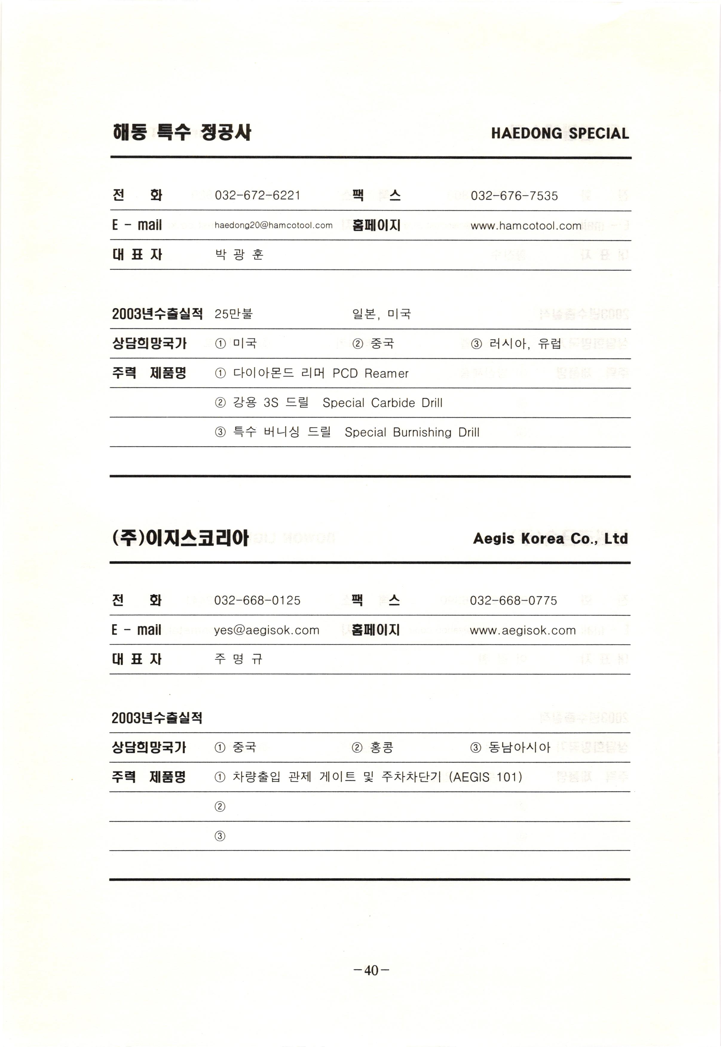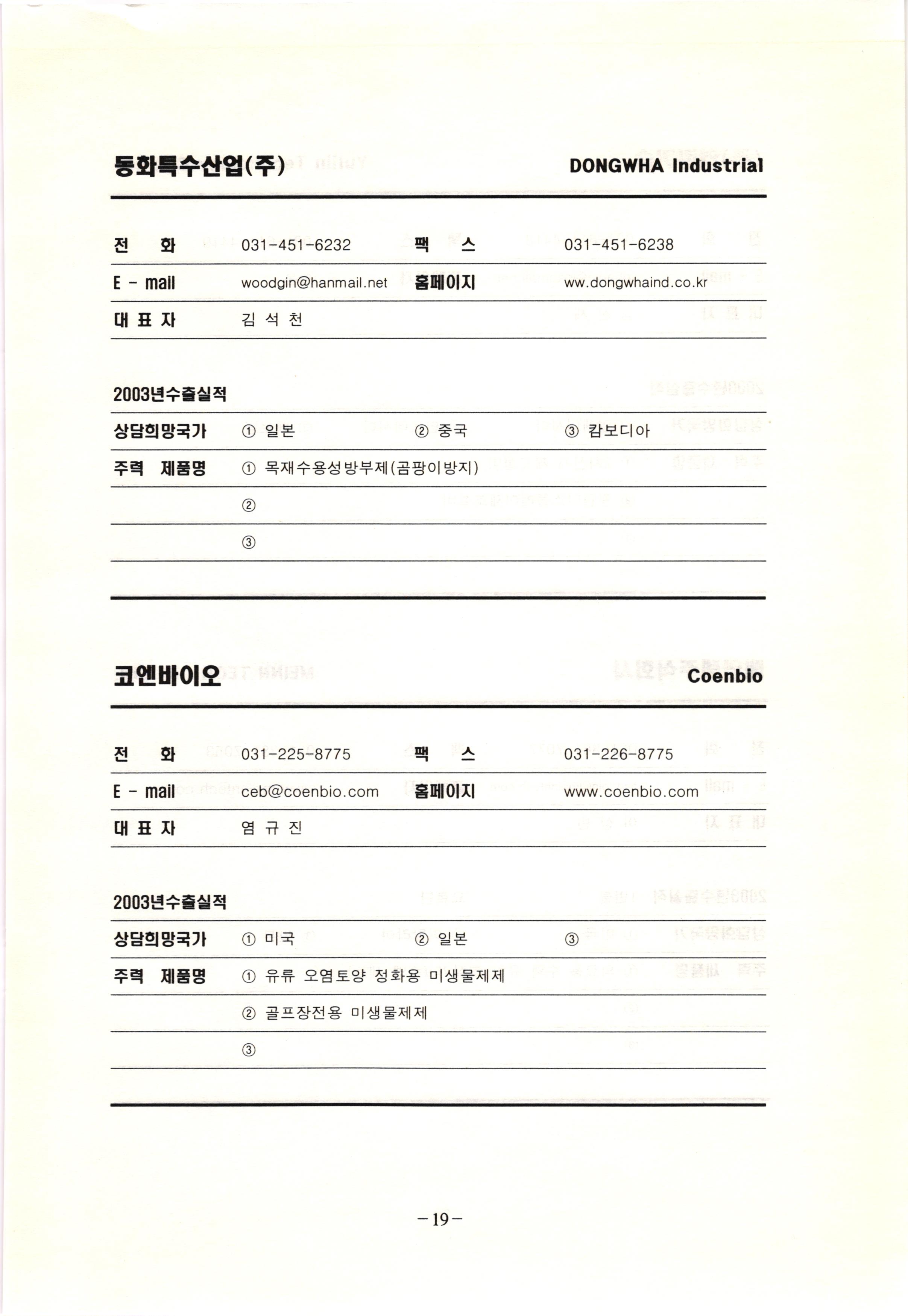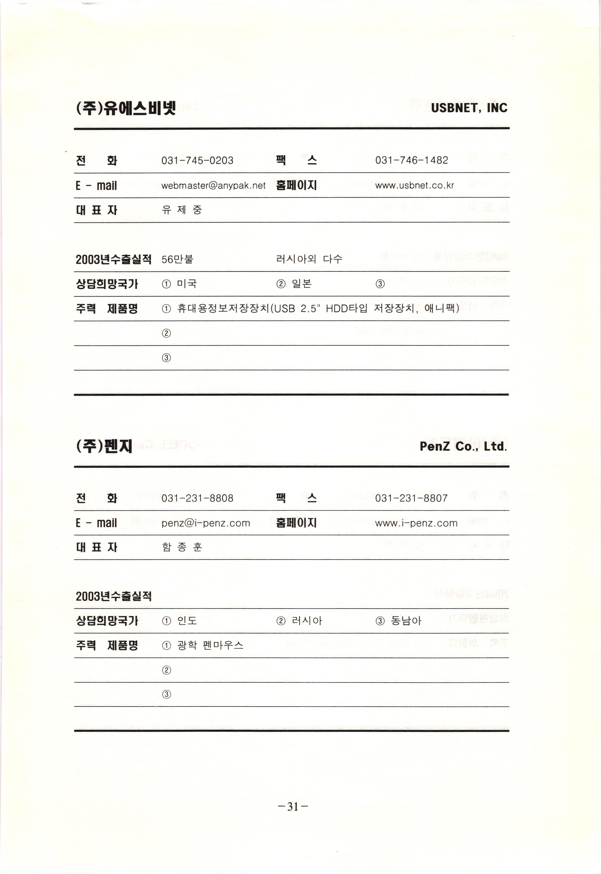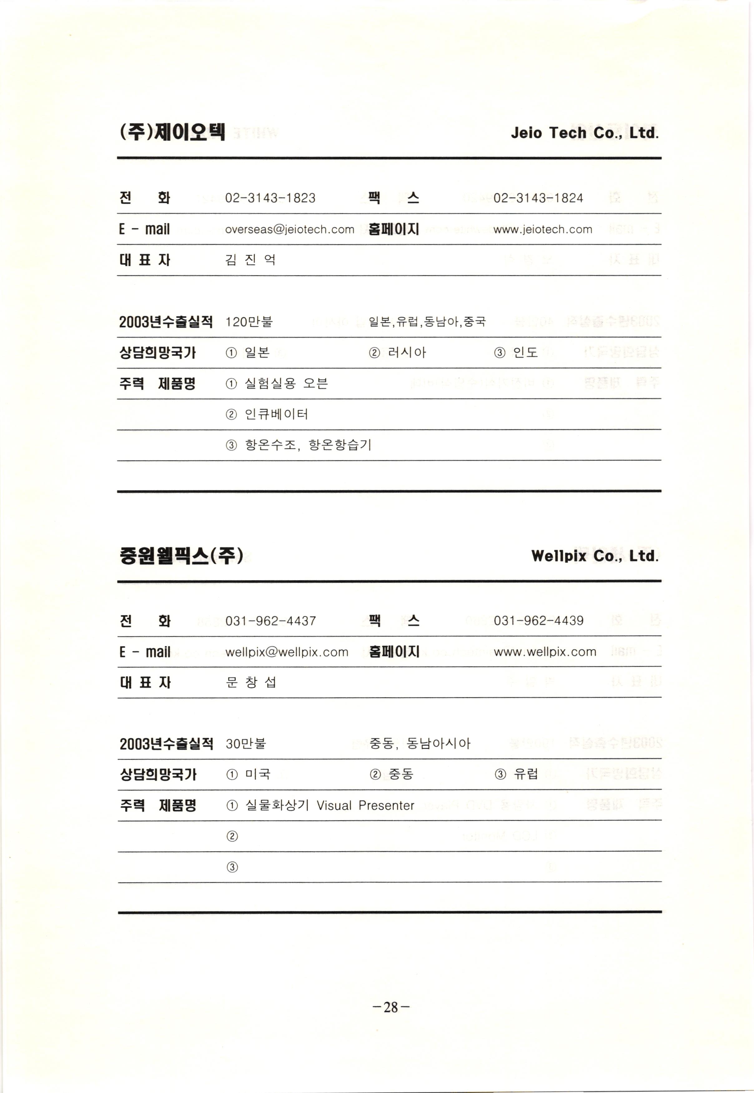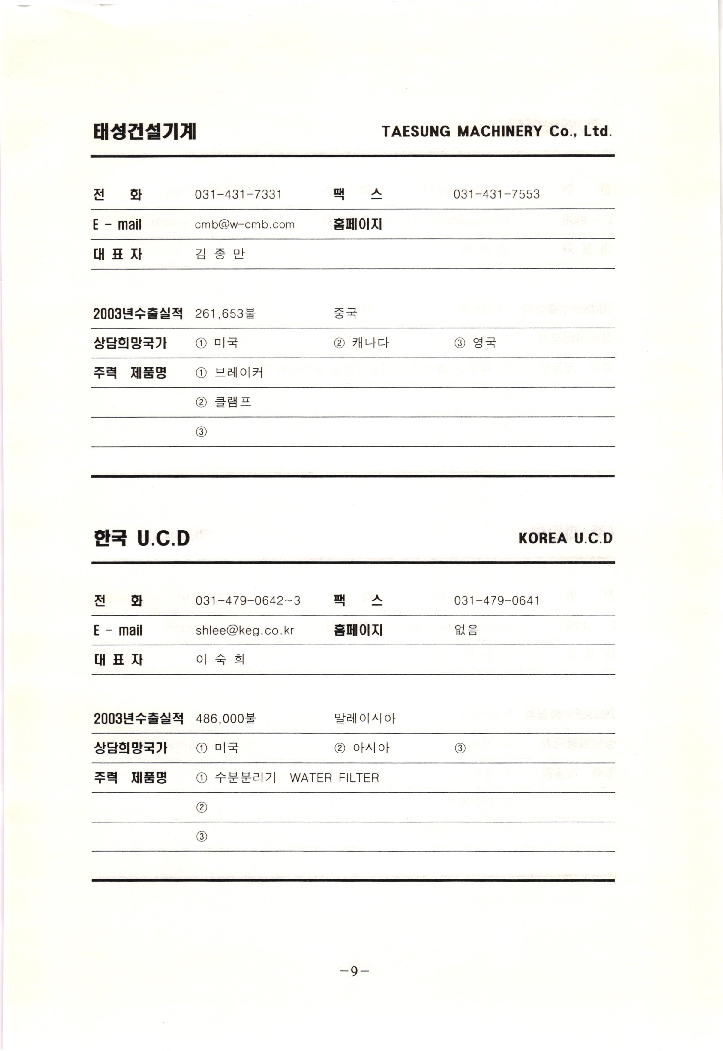 신보정보통신(주) SHINBO I&C 전 화 031-468-2448 팩 스 031-466-6894 E - mail hilton@shinboic.co.kr 홈페이지 www.shinboic.co.kr 대표자 유 재정 2003년수출실적 10만불 | 아랍에미리트 상담희망국가 1 영국 2 독일 3 유럽 주력 제품명 1 Network Combo Setop Box 2 5.1 Channel Wireless Headphone (주)원텍 WINTEC 전 화 팩 031-222-3823 2 031-222-3851 xereju@nate.com 스 홈페이지 E - mail www.m-wintec.co.kr 대표자 이 효주 2003년수출실적 상담희망국가 1 중국 2 태국 3 말레이시아 주력 제품명 1 전자유량계(Magnetic Flow Meter) -3