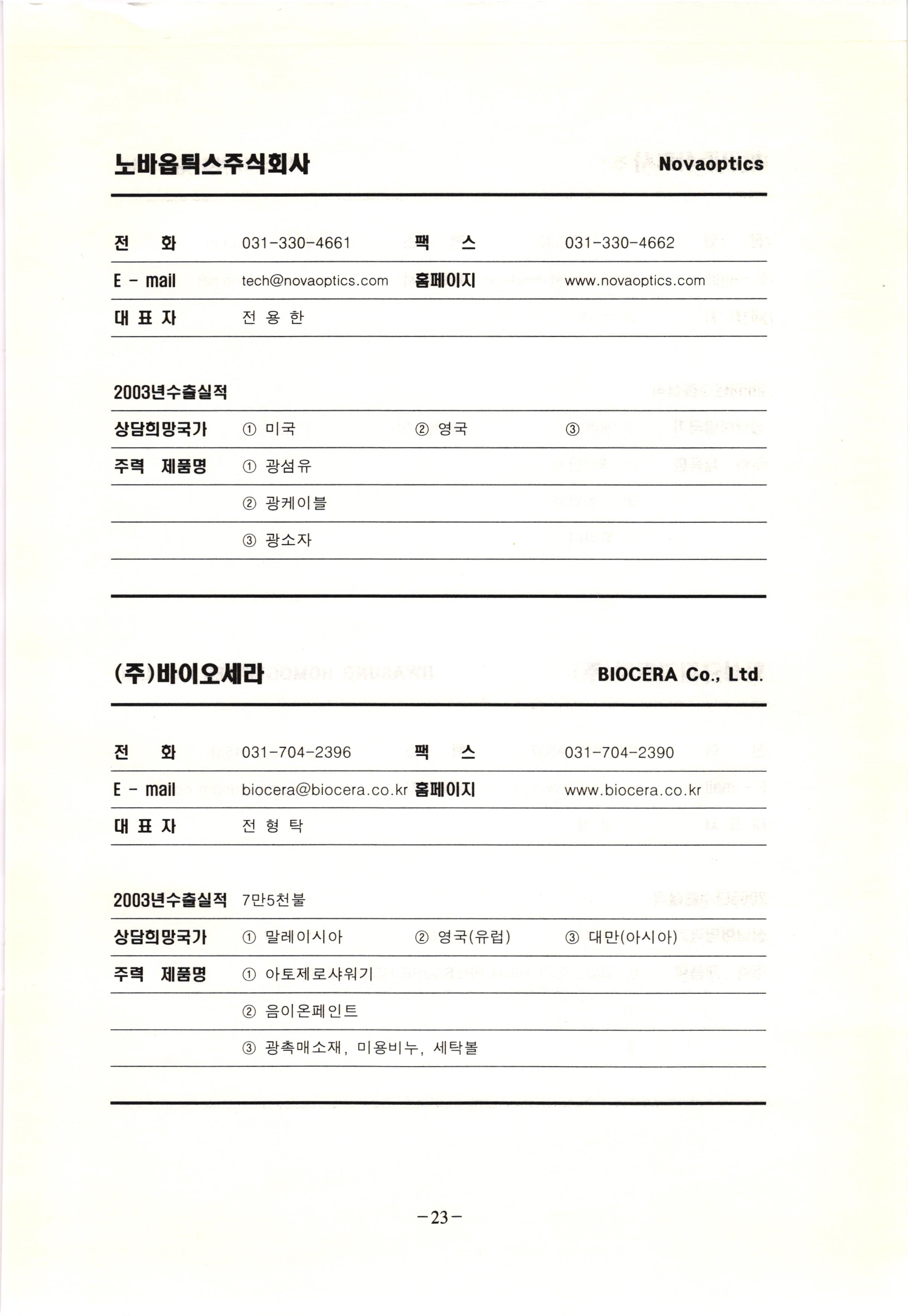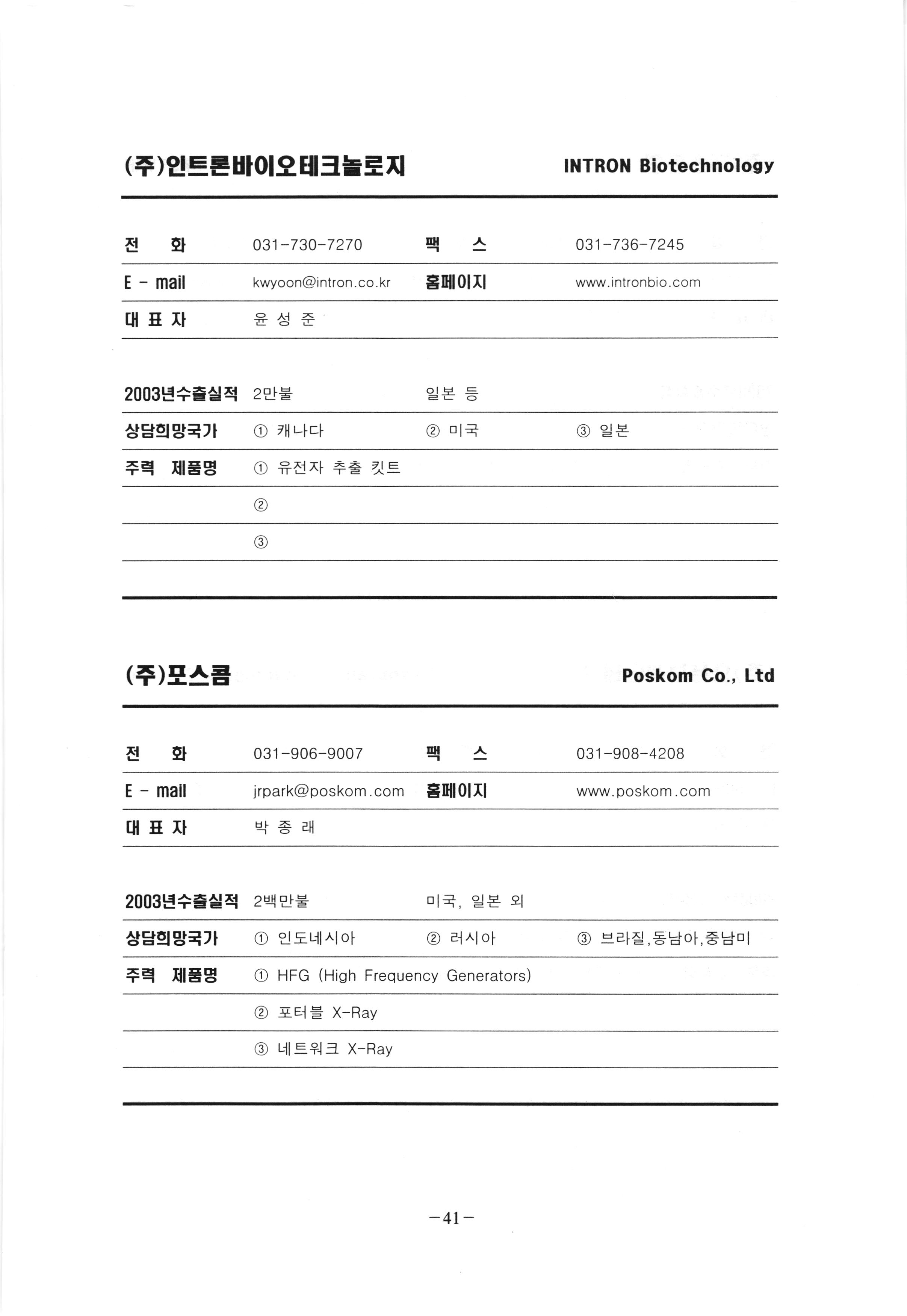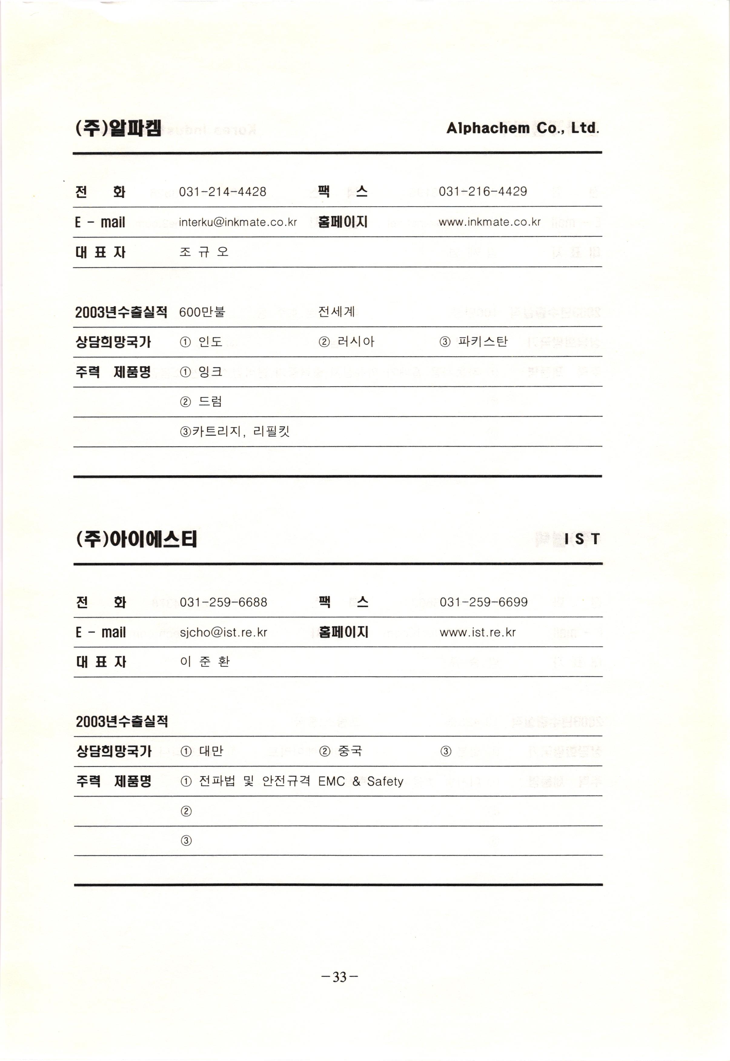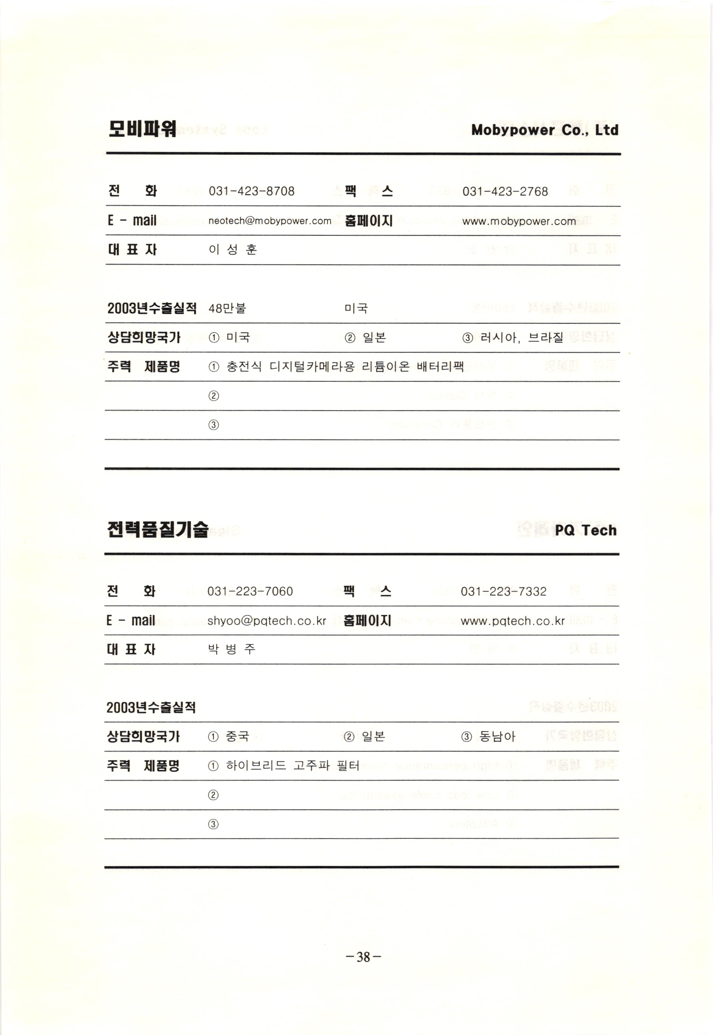 신보정보통신(주) SHINBO I&C 전 화 031-468-2448 팩 스 031-466-6894 E - mail hilton@shinboic.co.kr 홈페이지 www.shinboic.co.kr 대표자 유 재정 2003년수출실적 10만불 | 아랍에미리트 상담희망국가 1 영국 2 독일 3 유럽 주력 제품명 1 Network Combo Setop Box 2 5.1 Channel Wireless Headphone (주)원텍 WINTEC 전 화 팩 031-222-3823 2 031-222-3851 xereju@nate.com 스 홈페이지 E - mail www.m-wintec.co.kr 대표자 이 효주 2003년수출실적 상담희망국가 1 중국 2 태국 3 말레이시아 주력 제품명 1 전자유량계(Magnetic Flow Meter) -3