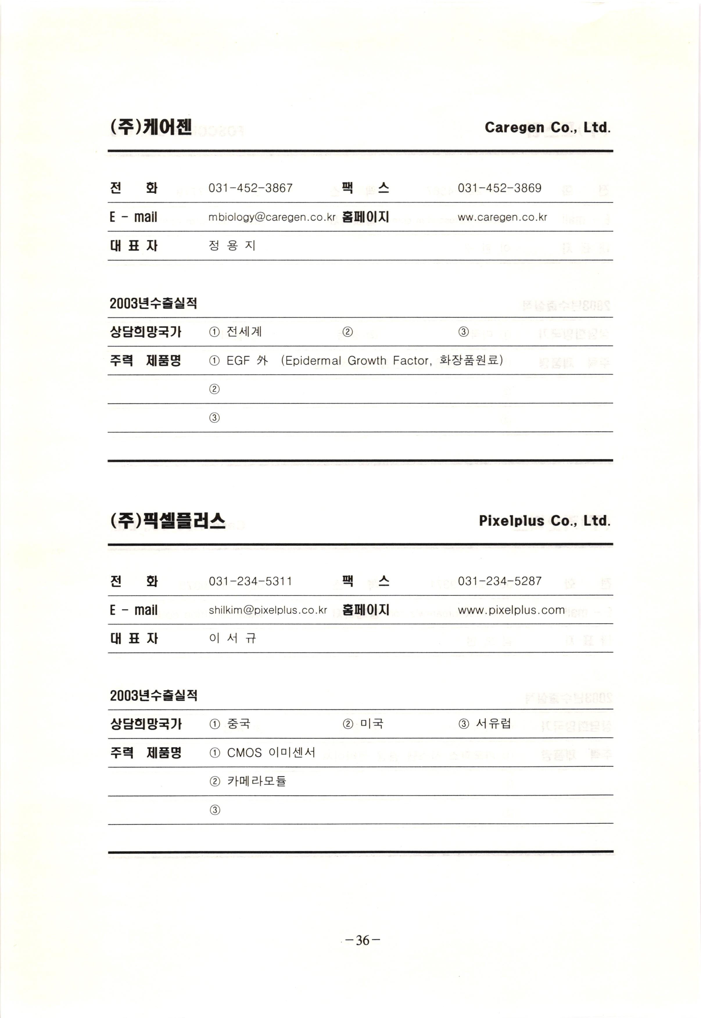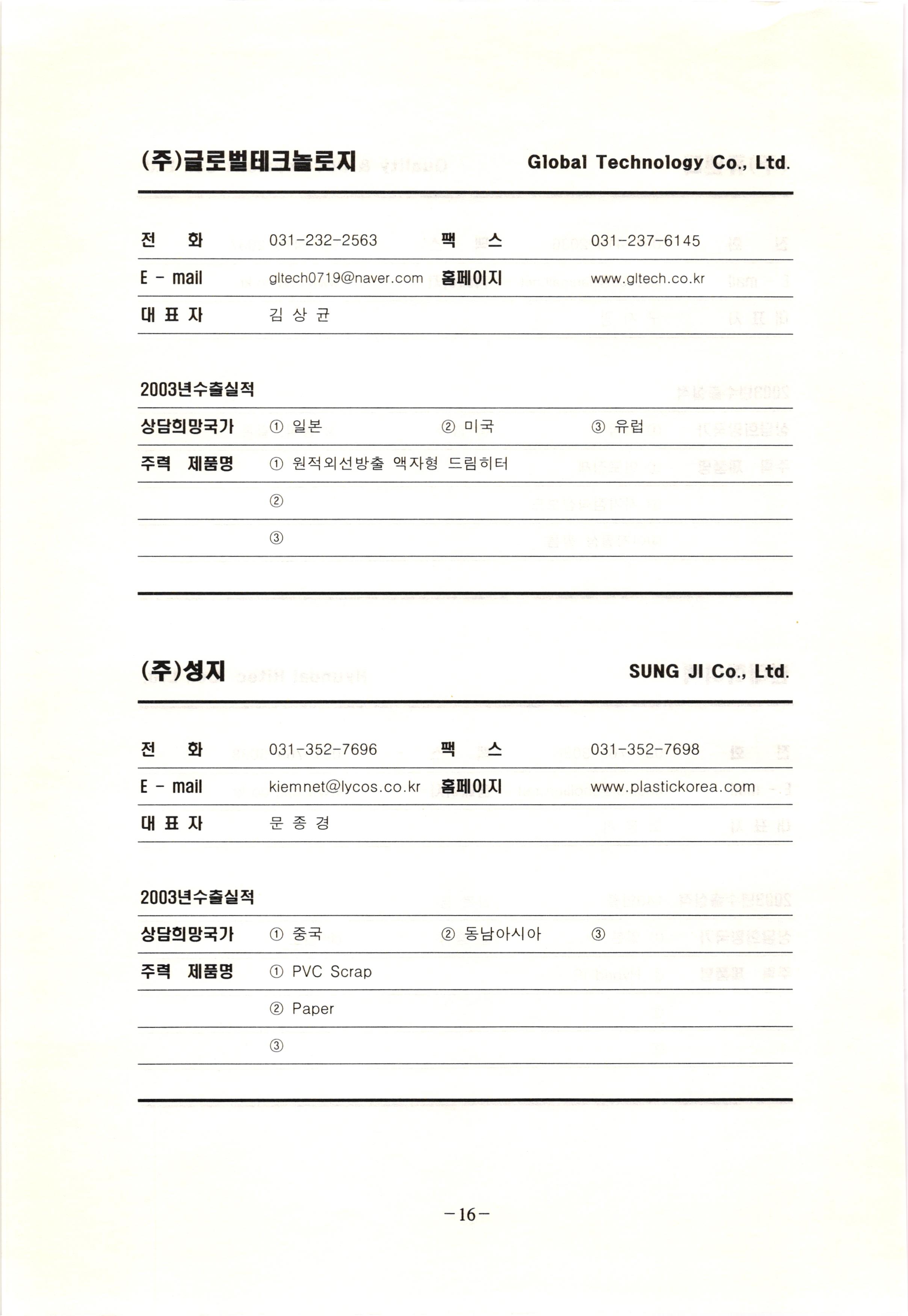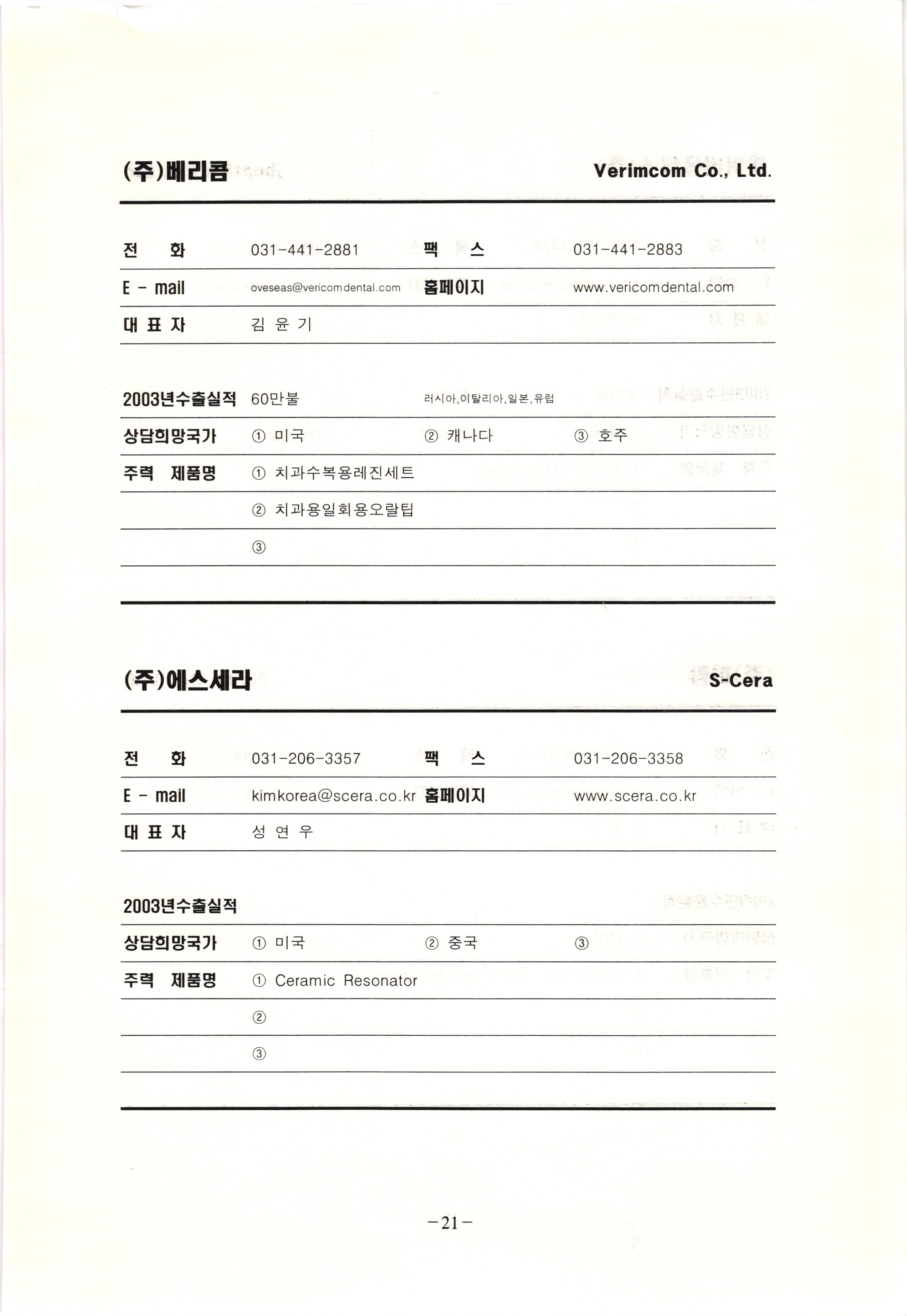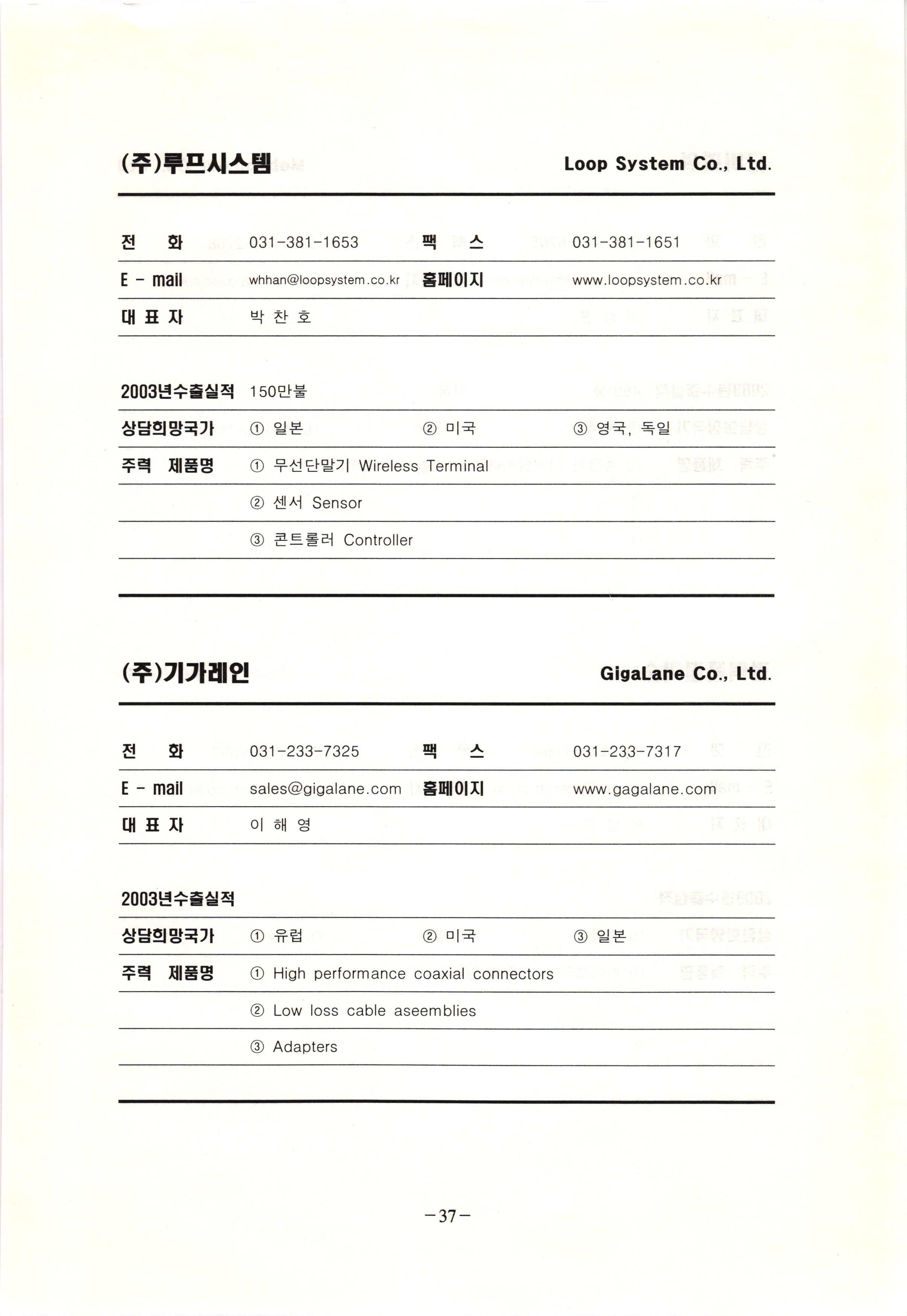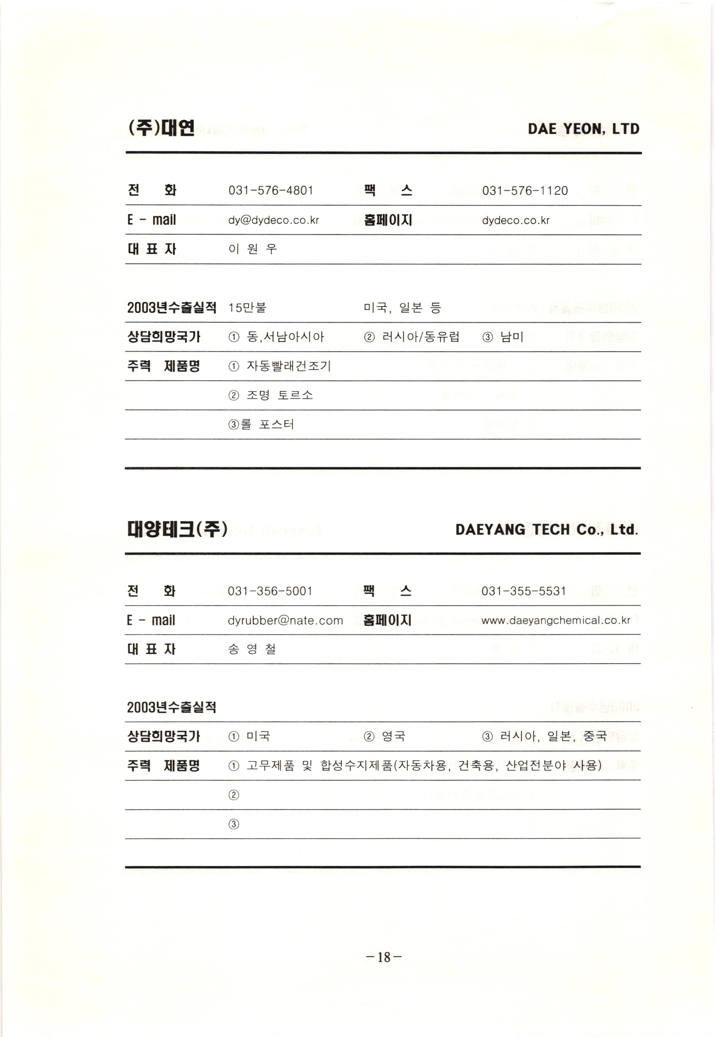 신보정보통신(주) SHINBO I&C 전 화 031-468-2448 팩 스 031-466-6894 E - mail hilton@shinboic.co.kr 홈페이지 www.shinboic.co.kr 대표자 유 재정 2003년수출실적 10만불 | 아랍에미리트 상담희망국가 1 영국 2 독일 3 유럽 주력 제품명 1 Network Combo Setop Box 2 5.1 Channel Wireless Headphone (주)원텍 WINTEC 전 화 팩 031-222-3823 2 031-222-3851 xereju@nate.com 스 홈페이지 E - mail www.m-wintec.co.kr 대표자 이 효주 2003년수출실적 상담희망국가 1 중국 2 태국 3 말레이시아 주력 제품명 1 전자유량계(Magnetic Flow Meter) -3