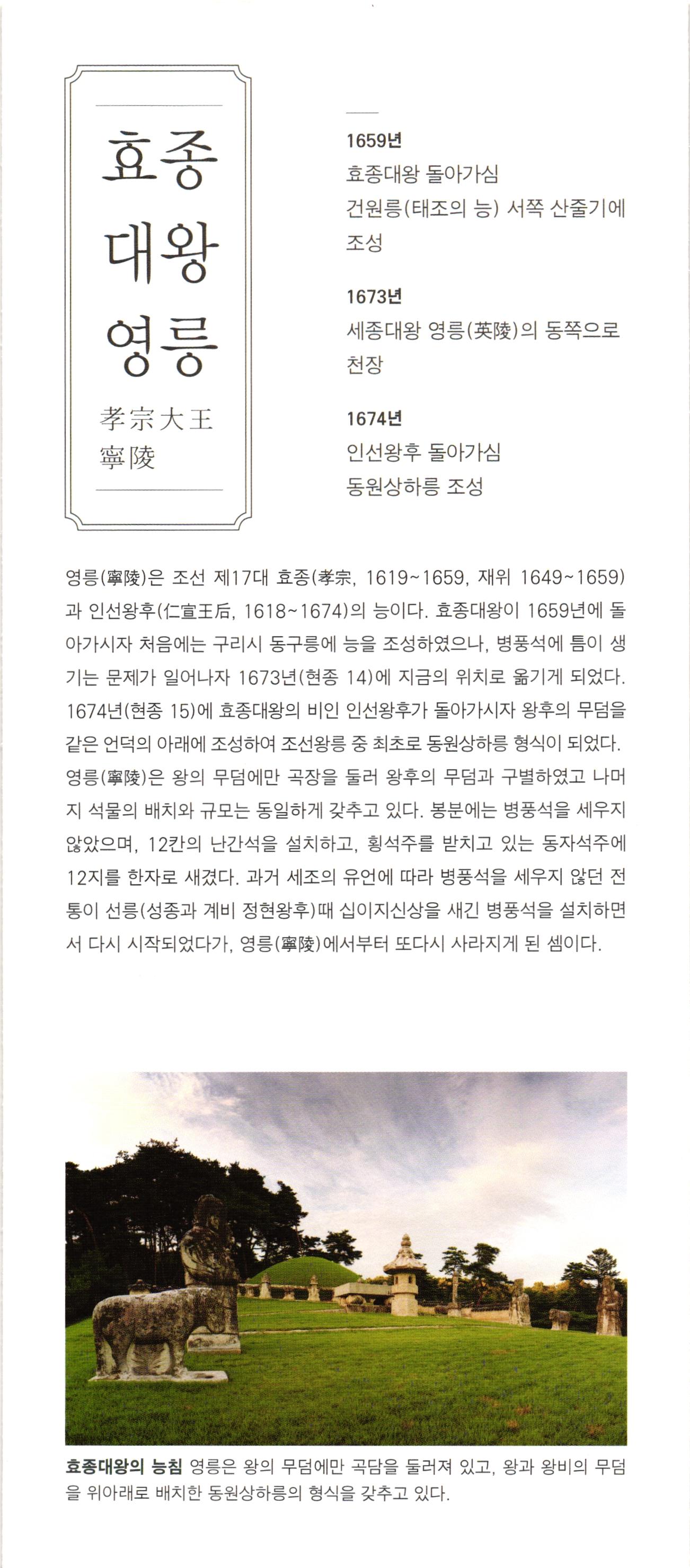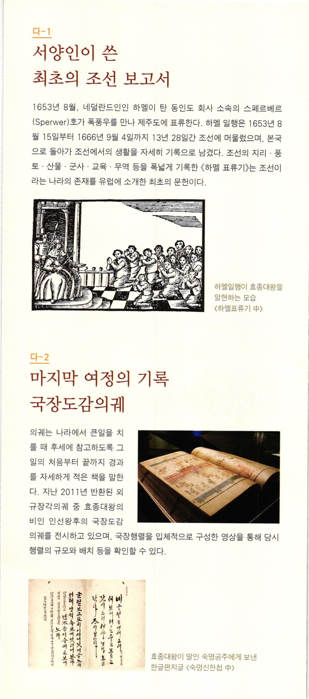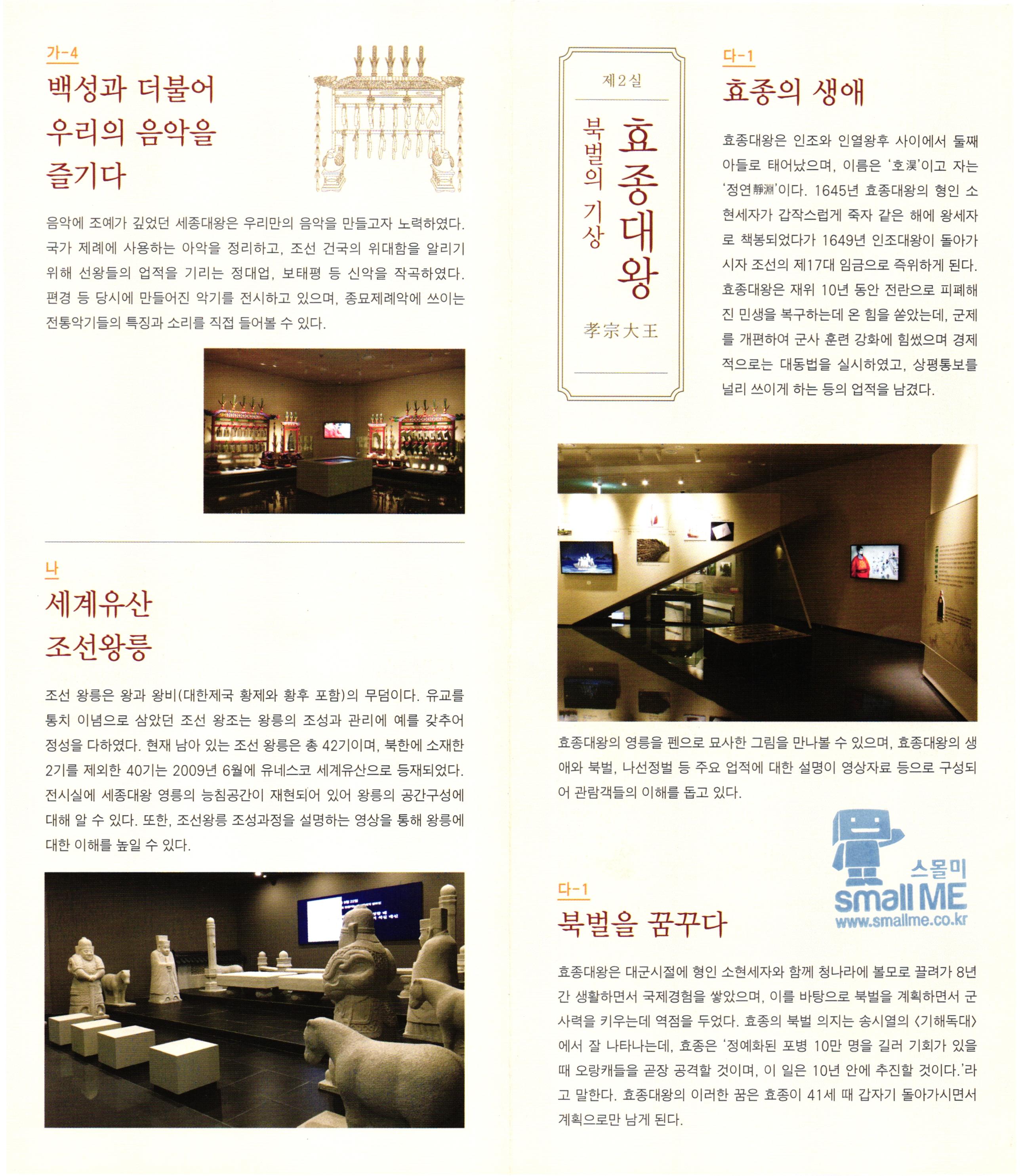 다-1 제2실 효종의 생애 가-4 백성과 더불어 우리의 음악을 즐기다. 북벌의 기상 음악에 조예가 깊었던 세종대왕은 우리만의 음악을 만들고자 노력하였다. 국가 제례에 사용하는 아악을 정리하고, 조선 건국의 위대함을 알리기 위해 선왕들의 업적을 기리는 정대업, 보태평 등 신악을 작곡하였다. 편경 등 당시에 만들어진 악기를 전시하고 있으며, 종묘제례악에 쓰이는 전통악기들의 특징과 소리를 직접 들어볼 수 있다. 효종대왕 효종대왕은 인조와 인열왕후 사이에서 둘째 아들로 태어났으며, 이름은 ' 호이고 자는 '정연靜淵'이다. 1645년 효종대왕의 형인 소 현세자가 갑작스럽게 죽자 같은 해에 왕세자 로 책봉되었다가 1649년 인조대왕이 돌아가 시자 조선의 제17대 임금으로 즉위하게 된다. 효종대왕은 재위 10년 동안 전란으로 피폐해 진 민생을 복구하는데 온 힘을 쏟았는데, 군제 를 개편하여 군사 훈련 강화에 힘썼으며 경제 적으로는 대동법을 실시하였고, 상평통보를 널리 쓰이게 하는 등의 업적을 남겼다. 孝宗大王, - 세계유산 조선왕릉 조선 왕릉은 왕과 왕비(대한제국 황제와 황후 포함)의 무덤이다. 유교를 통치 이념으로 삼았던 조선 왕조는 왕릉의 조성과 관리에 예를 갖추어 정성을 다하였다. 현재 남아 있는 조선 왕릉은 총 42기이며, 북한에 소재한 2기를 제외한 40기는 2009년 6월에 유네스코 세계유산으로 등재되었다. 전시실에 세종대왕 영릉의 능침공간이 재현되어 있어 왕릉의 공간구성에 대해 알 수 있다. 또한, 조선왕릉 조성과정을 설명하는 영상을 통해 왕릉에 대한 이해를 높일 수 있다. 효종대왕의 영릉을 펜으로 묘사한 그림을 만나볼 수 있으며, 효종대왕의 생 애와 북벌, 나선정벌 등 주요 업적에 대한 설명이 영상자료 등으로 구성되 어 관람객들의 이해를 돕고 있다. 다-1 북벌을 꿈꾸다. 고 스몰미 small ME www.smallme.co.kr 효종대왕은 대군시절에 형인 소현세자와 함께 청나라에 볼모로 끌려가 8년 간 생활하면서 국제경험을 쌓았으며, 이를 바탕으로 북벌을 계획하면서 군 사력을 키우는데 역점을 두었다. 효종의 북벌 의지는 송시열의 〈기해독대〉 에서 잘 나타나는데, 효종은 '정예화된 포병 10만 명을 길러 기회가 있을 때 오랑캐들을 곧장 공격할 것이며, 이 일은 10년 안에 추진할 것이다.'라 고 말한다. 효종대왕의 이러한 꿈은 효종이 41세 때 갑자기 돌아가시면서 계획으로만 남게 된다.