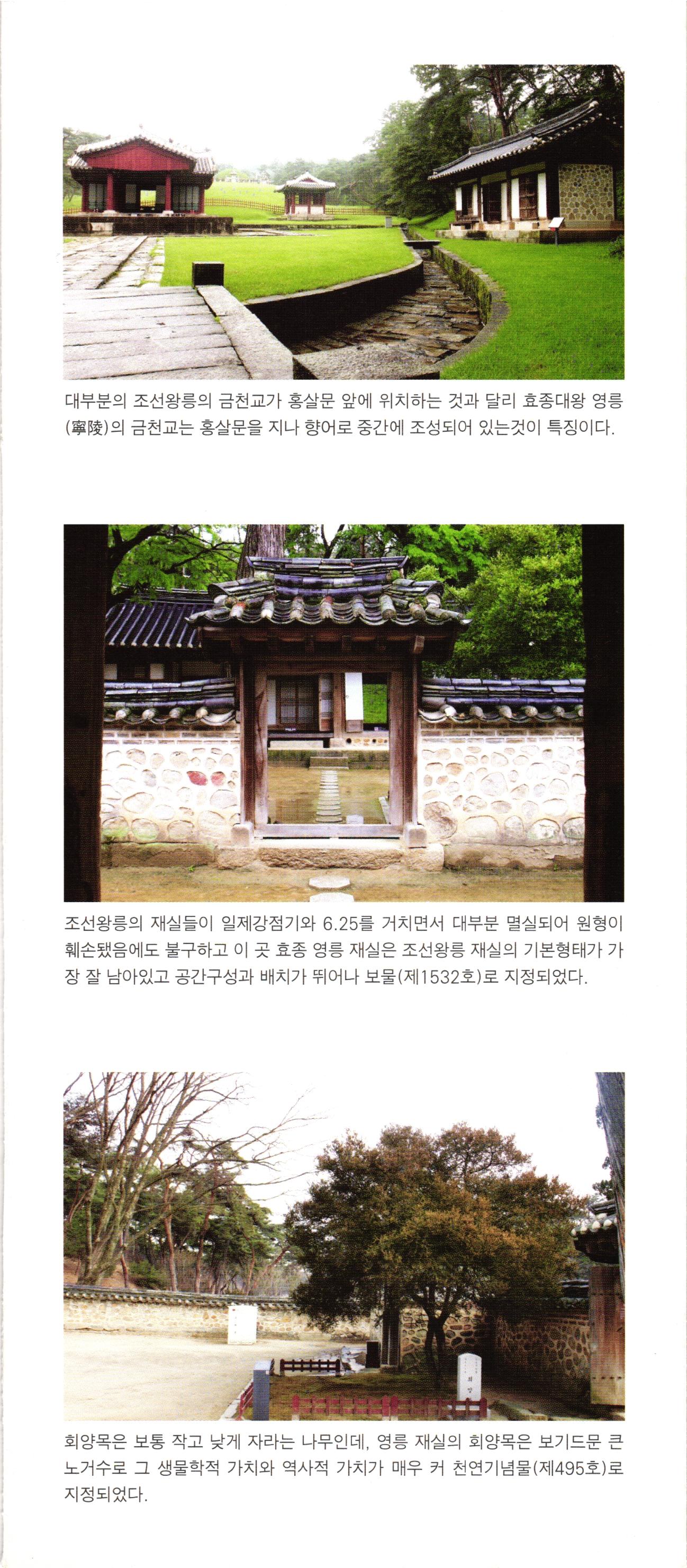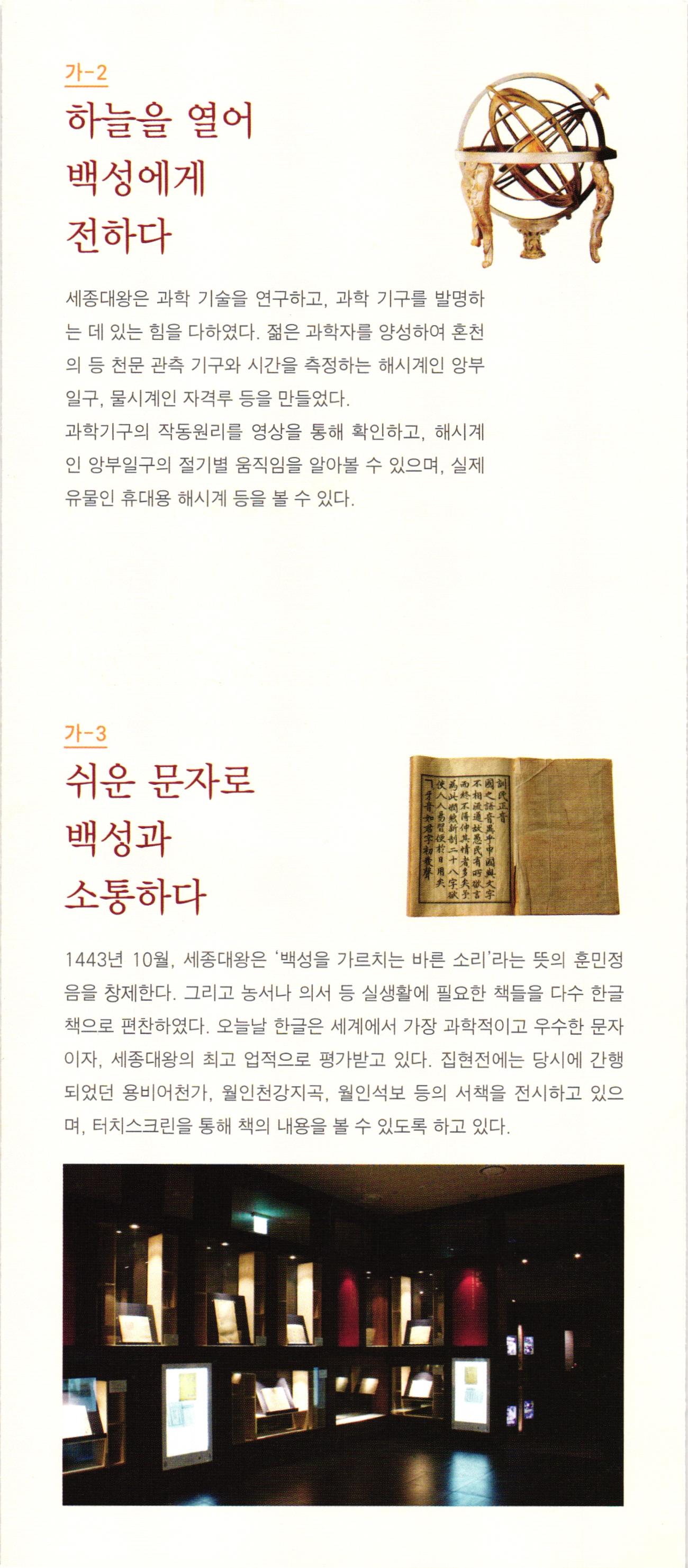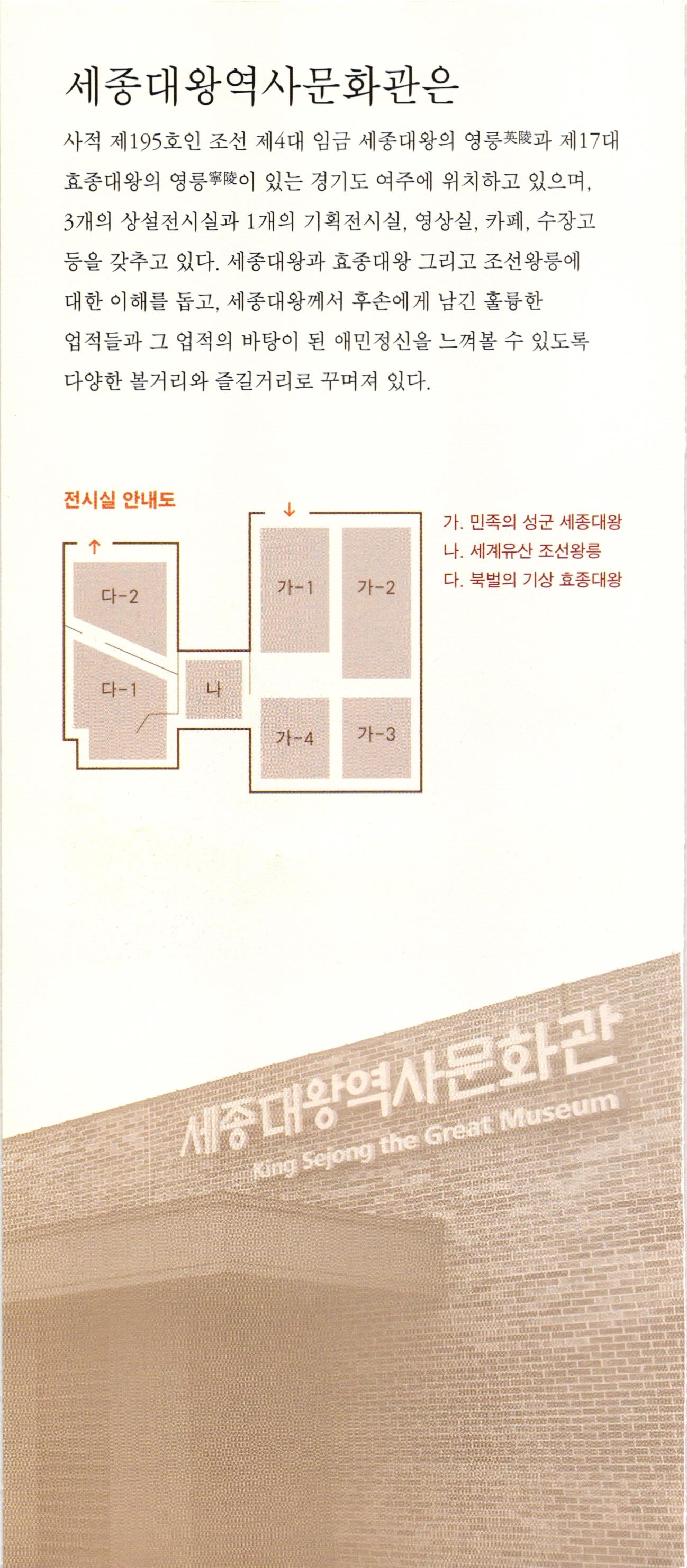 다-1 제2실 효종의 생애 가-4 백성과 더불어 우리의 음악을 즐기다. 북벌의 기상 음악에 조예가 깊었던 세종대왕은 우리만의 음악을 만들고자 노력하였다. 국가 제례에 사용하는 아악을 정리하고, 조선 건국의 위대함을 알리기 위해 선왕들의 업적을 기리는 정대업, 보태평 등 신악을 작곡하였다. 편경 등 당시에 만들어진 악기를 전시하고 있으며, 종묘제례악에 쓰이는 전통악기들의 특징과 소리를 직접 들어볼 수 있다. 효종대왕 효종대왕은 인조와 인열왕후 사이에서 둘째 아들로 태어났으며, 이름은 ' 호이고 자는 '정연靜淵'이다. 1645년 효종대왕의 형인 소 현세자가 갑작스럽게 죽자 같은 해에 왕세자 로 책봉되었다가 1649년 인조대왕이 돌아가 시자 조선의 제17대 임금으로 즉위하게 된다. 효종대왕은 재위 10년 동안 전란으로 피폐해 진 민생을 복구하는데 온 힘을 쏟았는데, 군제 를 개편하여 군사 훈련 강화에 힘썼으며 경제 적으로는 대동법을 실시하였고, 상평통보를 널리 쓰이게 하는 등의 업적을 남겼다. 孝宗大王, - 세계유산 조선왕릉 조선 왕릉은 왕과 왕비(대한제국 황제와 황후 포함)의 무덤이다. 유교를 통치 이념으로 삼았던 조선 왕조는 왕릉의 조성과 관리에 예를 갖추어 정성을 다하였다. 현재 남아 있는 조선 왕릉은 총 42기이며, 북한에 소재한 2기를 제외한 40기는 2009년 6월에 유네스코 세계유산으로 등재되었다. 전시실에 세종대왕 영릉의 능침공간이 재현되어 있어 왕릉의 공간구성에 대해 알 수 있다. 또한, 조선왕릉 조성과정을 설명하는 영상을 통해 왕릉에 대한 이해를 높일 수 있다. 효종대왕의 영릉을 펜으로 묘사한 그림을 만나볼 수 있으며, 효종대왕의 생 애와 북벌, 나선정벌 등 주요 업적에 대한 설명이 영상자료 등으로 구성되 어 관람객들의 이해를 돕고 있다. 다-1 북벌을 꿈꾸다. 고 스몰미 small ME www.smallme.co.kr 효종대왕은 대군시절에 형인 소현세자와 함께 청나라에 볼모로 끌려가 8년 간 생활하면서 국제경험을 쌓았으며, 이를 바탕으로 북벌을 계획하면서 군 사력을 키우는데 역점을 두었다. 효종의 북벌 의지는 송시열의 〈기해독대〉 에서 잘 나타나는데, 효종은 '정예화된 포병 10만 명을 길러 기회가 있을 때 오랑캐들을 곧장 공격할 것이며, 이 일은 10년 안에 추진할 것이다.'라 고 말한다. 효종대왕의 이러한 꿈은 효종이 41세 때 갑자기 돌아가시면서 계획으로만 남게 된다.