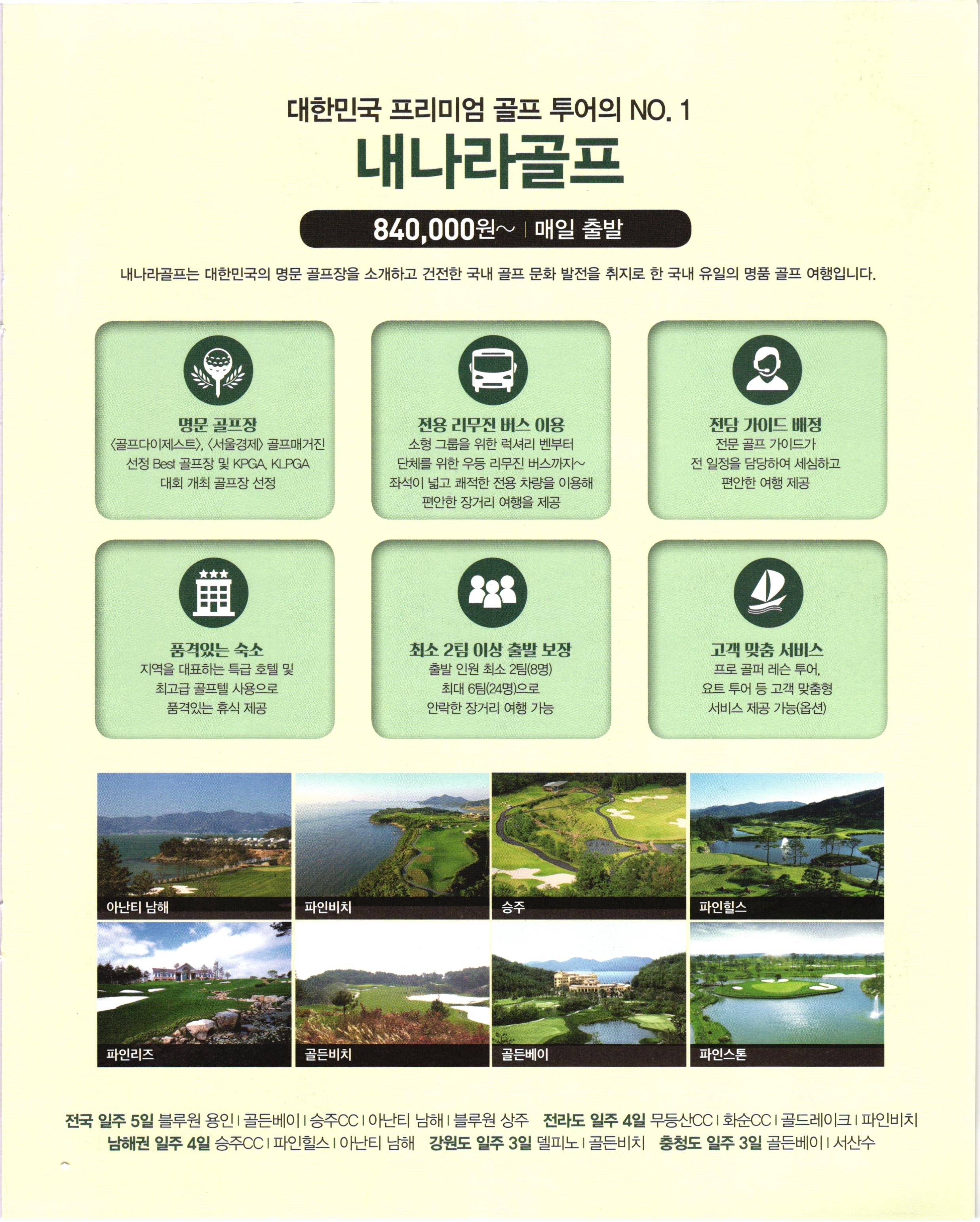 대한민국 프리미엄 골프 투어의 NO. 1 내나라골프 840,000원~ 이 매일 출발 내나라골프는 대한민국의 명문 골프장을 소개하고 건전한 국내 골프 문화 발전을 취지로 한 국내 유일의 명품 골프 여행입니다. 명문 골프장 골프다이제스트〉, 〈서울경제 골프매거진 선정 Best 골프장 및 KPGA, KLPGA 대회 개최 골프장 선정 전용 리무진 버스 이용 소형 그룹을 위한 럭셔리 벤부터 단체를 위한 우등 리무진 버스까지~ 좌석이 넓고 쾌적한 전용 차량을 이용해 편안한 장거리 여행을 제공 전담 가이드 배정 전문 골프 가이드가 전 일정을 담당하여 세심하고 편안한 여행 제공 품격있는 숙소 지역을 대표하는 특급 호텔 및 최고급 골프텔 사용으로 품격있는 휴식 제공 최소 2팀 이상 출발 보장 출발 인원 최소 2팀(8명) 최대 6팀(24명)으로 안락한 장거리 여행 가능 고객 맞춤 세비스 프로 골퍼 레슨 투어, 요트 투어 등 고객 맞춤형 서비스 제공 가능(옵션) 아난티 남해 파인비치 승주 파인힐스 파인리즈 골든비치 골든베이 파인스톤 전국 일주 5일 블루원 용인 | 골든베이 |승주CCI 아난티 남해 블루원 상주 전라도 일주 4일 무등산CCI 화순CCI 골드레이크 | 파인비치 남해권 일주 4일 승주CC | 파인힐스 아난티 남해 강원도 일주 3일 델피노 골든비치 충청도 일주 3일 골든베이 | 서산수