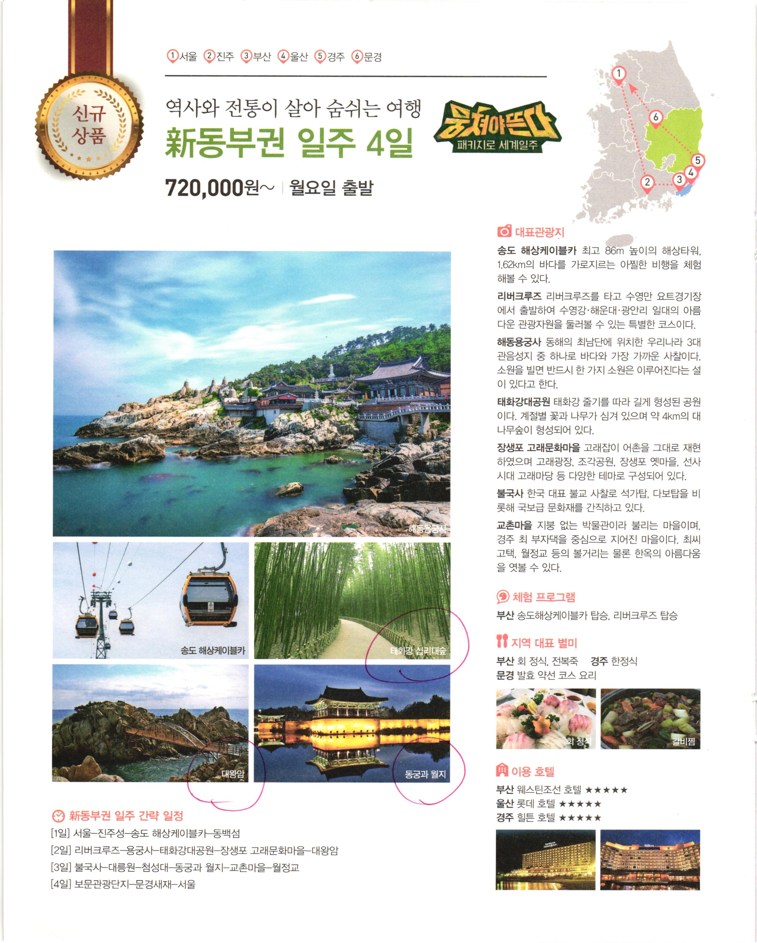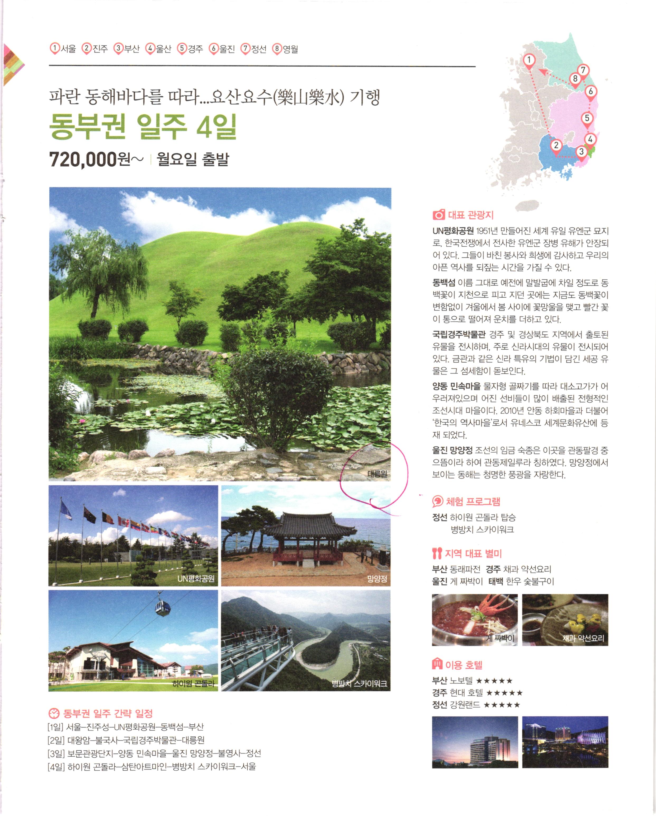 1 서울 2 진주 3부산 4울산 5경주 울진 1 정선 6 영월 파란 동해바다를 따라...요산요수(樂山樂水) 기행 동부권 일주 4일 720,000원~ 월요일 출발 이 대표 관광지 UN평화공원 1951년 만들어진 세계 유일 유엔군 묘지 로, 한국전쟁에서 전사한 유엔군 장병 유해가 안장되 어 있다. 그들이 바친 봉사와 희생에 감사하고 우리의 아픈 역사를 되짚는 시간을 가질 수 있다. 동백섬 이름 그대로 예전에 말발굽에 차일 정도로 동 백꽃이 지천으로 피고 지던 곳에는 지금도 동백꽃이 변함없이 겨울에서 봄 사이에 꽃망울을 맺고 빨간 꽃 이 통으로 떨어져 운치를 더하고 있다. 국립경주박물관 경주 및 경상북도 지역에서 출토된 유물을 전시하며, 주로 신라시대의 유물이 전시되어 있다. 금관과 같은 신라 특유의 기법이 담긴 세공 유 물은 그 섬세함이 돋보인다. 양동 민속마을 물자형 골짜기를 따라 대소고가가 어 우러져있으며 어진 선비들이 많이 배출된 전형적인 조선시대 마을이다. 2010년 안동 하회마을과 더불어 '한국의 역사마을'로서 유네스코 세계문화유산에 등 재 되었다. 울진 망양정 조선의 임금 숙종은 이곳을 관동팔경 중 으뜸이라 하여 관동제일루라 칭하였다. 망양정에서 보이는 동해는 청명한 풍광을 자랑한다. 대릉원 이 체험 프로그램 정선 하이원 곤돌라 탑승 병방치 스카이워크 Y 지역 대표 별미 부산 동래파전 경주 채과 약선요리 울진 게 짜박이 태백 한우 숯불구이 UN평화공원 망양정 게 짜박이 채과 약선요리 하이원 곤돌라 병방치 스카이워크 이용 호텔 부산 노보텔 ★★★★★ 경주 현대 호텔 ★★★★★ 정선 강원랜드 ★★★★★ I 동부권 일주 간략 일정 [1일] 서울 진주성-UN평화공원 동백섬 부산 [2일] 대왕암 불국사 국립경주박물관 대릉원 [3일] 보문관광단지 양동 민속마을 울진 망양정 불영사 정선 [4일] 하이원 곤돌라 삼탄아트마인 병방치 스카이워크-서울