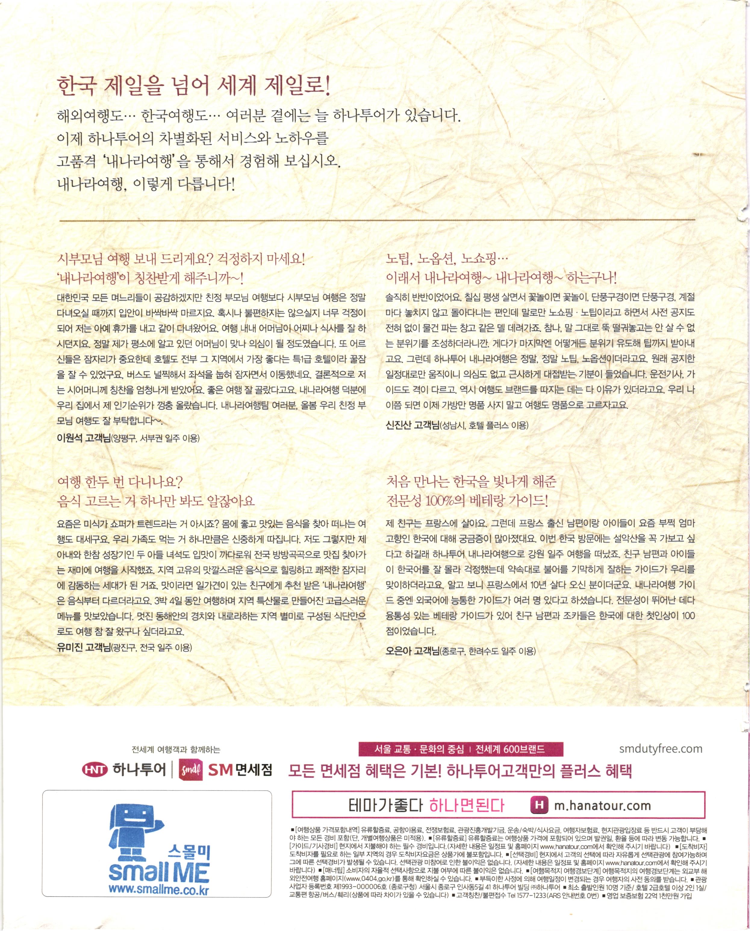 한국 제일을 넘어 세계 제일로!! 해외여행도... 한국여행도... 여러분 곁에는 늘 하나투어가 있습니다. 이제 하나투어의 차별화된 서비스와 노하우를 고품격 '내나라여행'을 통해서 경험해 보십시오. 내나라여행, 이렇게 다릅니다! 시부모님 여행 보내 드리게요? 걱정하지 마세요! '내나라여행이 칭찬받게 해주니까~! 대한민국 모든 며느리들이 공감하겠지만 친정 부모님 여행보다 시부모님 여행은 정말 다녀오실 때까지 입안이 바싹바싹 마르지요. 혹시나 불편하지는 않으실지 너무 걱정이 되어 저는 아예 휴가를 내고 같이 다녀왔어요. 여행 내내 어머님이 어찌나 식사를 잘 하 시던지요. 정말 제가 평소에 알고 있던 어머님이 맞나 의심이 될 정도였습니다. 또 어르 신들은 잠자리가 중요한데 호텔도 전부 그 지역에서 가장 좋다는 특급 호텔이라 꿀잠 을 잘 수 있었구요, 버스도 널찍해서 좌석을 눕혀 잠자면서 이동했네요. 결론적으로 저 는 시어머니께 칭찬을 엄청나게 받았어요. 좋은 여행 잘 골랐다고요. 내나라여행 덕분에 우리 집에서 제 인기순위가 껑충 올랐습니다. 내나라여행팀 여러분, 올봄 우리 친정부 모님 여행도 잘 부탁합니다~. 이원석 고객님(양평구, 서부권 일주 이용) 노팁, 노옵션, 노쇼핑... 이래서 내나라여행~ 내나라여행~ 하는구나! 솔직히 반반이었어요. 칠십 평생 살면서 꽃놀이면 꽃놀이, 단풍구경이면 단풍구경, 계절 마다 놓치지 않고 돌아다니는 편인데 말로만 노쇼핑 · 노팁이라고 하면서 사전 공지도 전혀 없이 물건 파는 창고 같은 델 데려가죠. 참나, 말 그대로 뚝 떨궈놓고는 안 살 수 없 는 분위기를 조성하더라니깐. 게다가 마지막엔 어떻게든 분위기 유도해 팁까지 받아내 고요. 그런데 하나투어 내나라여행은 정말, 정말 노팁, 노옵션이더라고요. 원래 공지한 일정대로만 움직이니 의심도 없고 근사하게 대접받는 기분이 들었습니다. 운전기사, 가 이드도 격이 다르고, 역시 여행도 브랜드를 따지는 데는 다 이유가 있더라고요. 우리 나 이쯤 되면 이제 가방만 명품 사지 말고 여행도 명품으로 고르자고요. 신진산 고객님(성남시, 호텔 플러스 이용) 여행 한두 번 다니나요? 음식 고르는 거 하나만 봐도 알잖아요 요즘은 미식가 쇼퍼가 트렌드라는 거 아시죠? 몸에 좋고 맛있는 음식을 찾아 떠나는 여 행도 대세구요. 우리 가족도 먹는 거 하나만큼은 신중하게 따집니다. 저도 그렇지만 제 1 아내와 한참 성장기인 두 아들 녀석도 입맛이 까다로워 전국 방방곡곡으로 맛집 찾아가 는 재미에 여행을 시작했죠. 지역 고유의 맛깔스러운 음식으로 힐링하고 쾌적한 잠자리 에 감동하는 세대가 된 거죠. 맛이라면 일가견이 있는 친구에게 추천 받은 '내나라여행' 은 음식부터 다르더라고요. 3박 4일 동안 여행하며 지역 특산물로 만들어진 고급스러운 메뉴를 맛보았습니다. 멋진 동해안의 경치와 내로라하는 지역 별미로 구성된 식단만으 로도 여행 참 잘 왔구나 싶더라고요. 유미진 고객님(광진구, 전국 일주 이용) 처음 만나는 한국을 빛나게 해준 전문성 100%의 베테랑 가이드! 제 친구는 프랑스에 살아요. 그런데 프랑스 출신 남편이랑 아이들이 요즘 부쩍 엄마 고향인 한국에 대해 궁금증이 많아졌대요. 이번 한국 방문에는 설악산을 꼭 가보고 싶 다고 하길래 하나투어 내나라여행으로 강원 일주 여행을 떠났죠. 친구 남편과 아이들 이 한국어를 잘 몰라 걱정했는데 약속대로 불어를 기막히게 잘하는 가이드가 우리를 맞이하더라고요. 알고 보니 프랑스에서 10년 살다 오신 분이더군요. 내나라여행 가이 드 중엔 외국어에 능통한 가이드가 여러 명 있다고 하셨습니다. 전문성이 뛰어난 데다 융통성 있는 베테랑 가이드가 있어 친구 남편과 조카들은 한국에 대한 첫인상이 100 점이었습니다. 오은아 고객님(종로구, 한려수도 일주 이용) 전세계 여행객과 함께하는 서울 교통·문화의 중심 | 전세계 600브랜드 | HWND 하나투어 | Smill SM면세점 | smdutyfree.com 모든 면세점 혜택은 기본! 하나투어고객만의 플러스 혜택 테마가좋다. 하나면된다. H m.hanatour.com 고 스몰미 Small ME [여행상품 가격포함내역] 유류할증료, 공항이용료, 전쟁보험료, 관광진흥개발기금, 운송/숙박/식사요금, 여행자보험료, 현지관광입장료 등 반드시 고객이 부담해 야 하는 모든 경비 포함(단, 개별여행상품은 미적용), 유류할증료] 유류할증료는 여행상품 가격에 포함되어 있으며 발권일, 환율 등에 따라 변동 가능합니다. [가이드 기사경비] 현지에서 지불해야 하는 필수 경비입니다. (자세한 내용은 일정표 및 홈페이지 www.hanatour.com에서 확인해 주시기 바랍니다) [도착비자] 도착비자를 필요로 하는 일부 지역의 경우 도착비자요금은 상품가에 불포함입니다. [선택 그에 따른 선택경비가 발생될 수 있습니다. 선택관광 미참여로 인한 불이익은 없습니다. (자세한 내용은 일정표 및 홈페이지 www.hanatour.com에서 확인해 주시기 바랍니다) [매너팁] 소비자의 자율적 선택사항으로 지불 여부에 따른 불이익은 없습니다. [여행목적지 여행경보단계] 여행목적지의 여행경보단계는 외교부 해 부득이한 사정에 의해 여행일정이 변경되는 경우 여행자의 