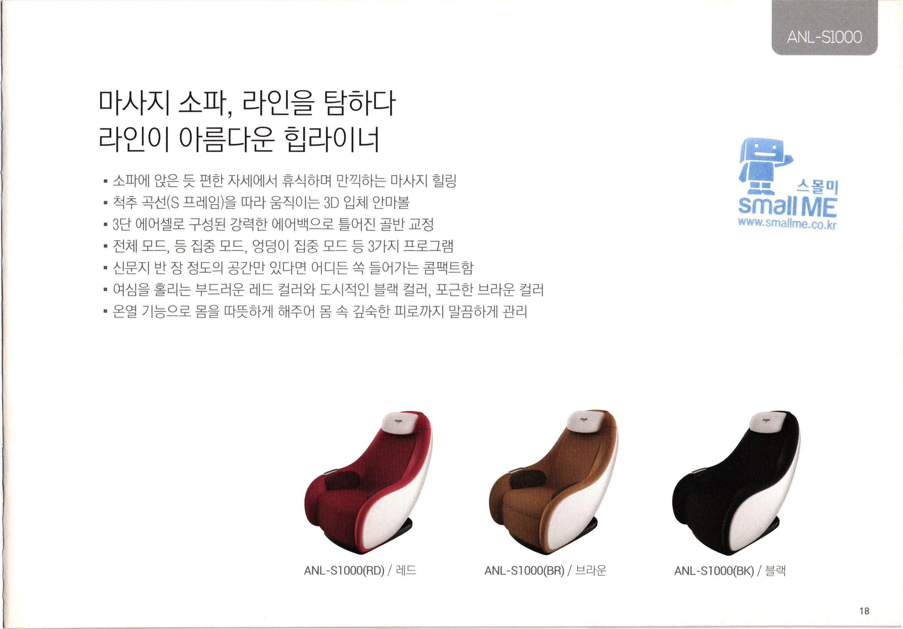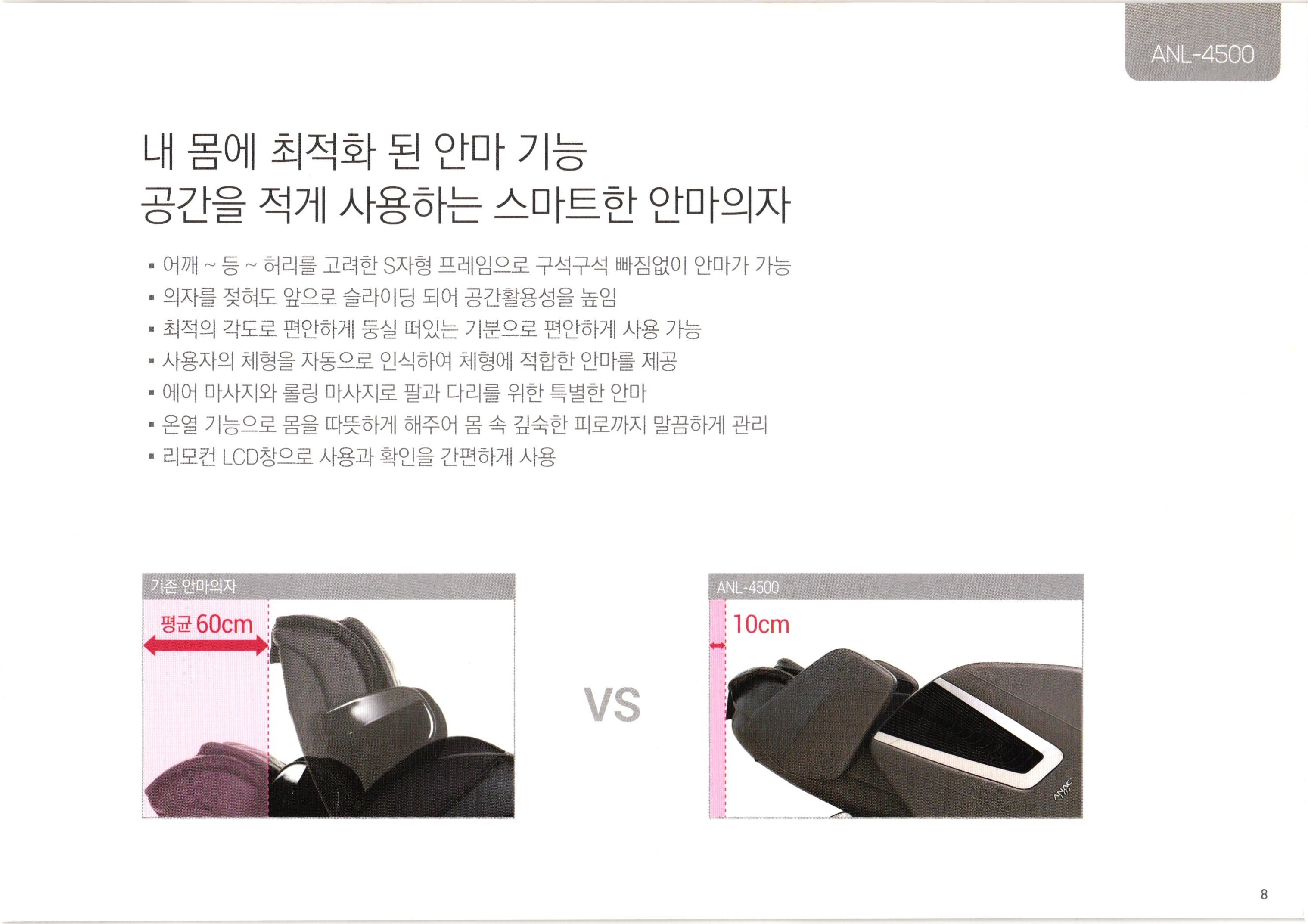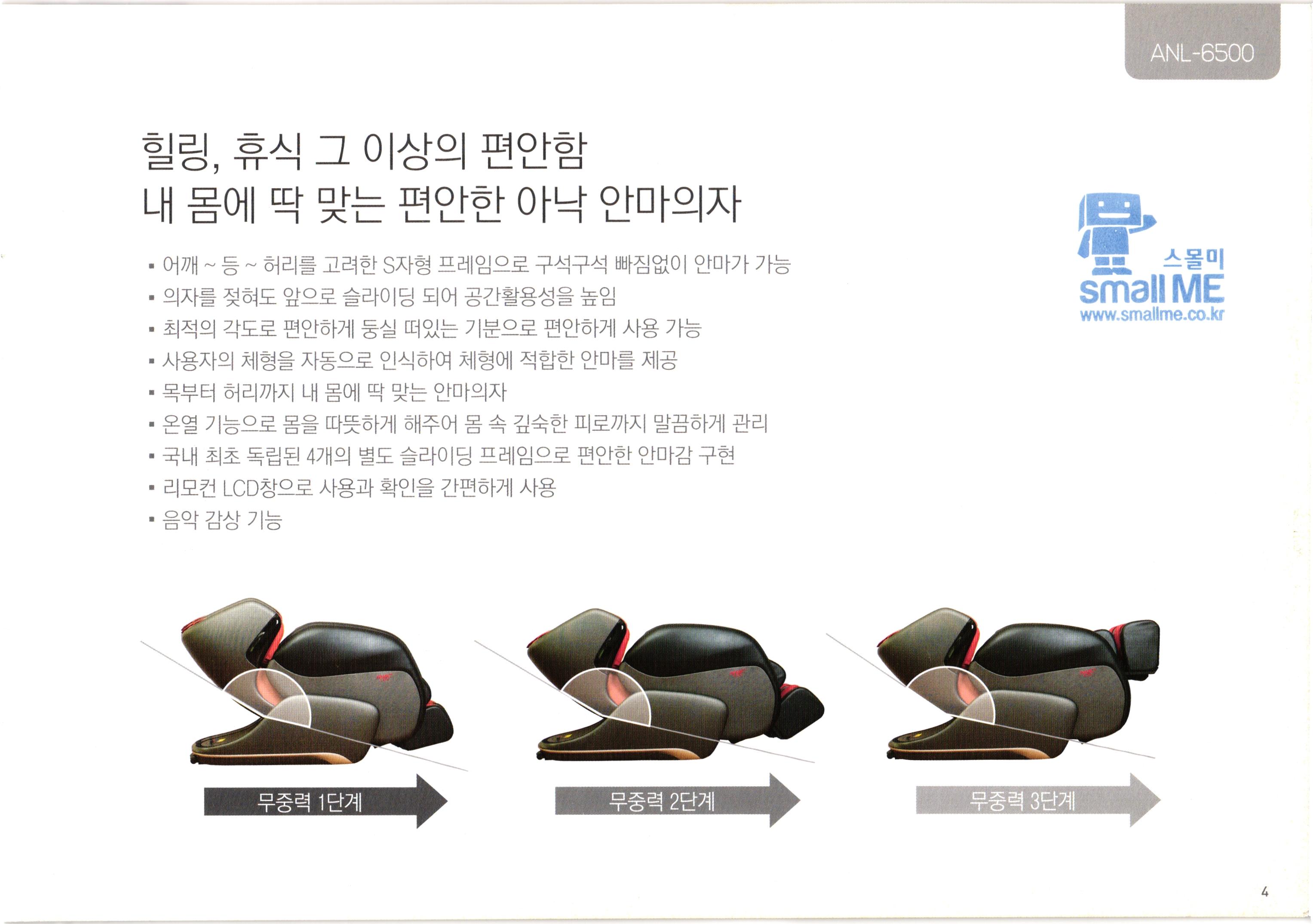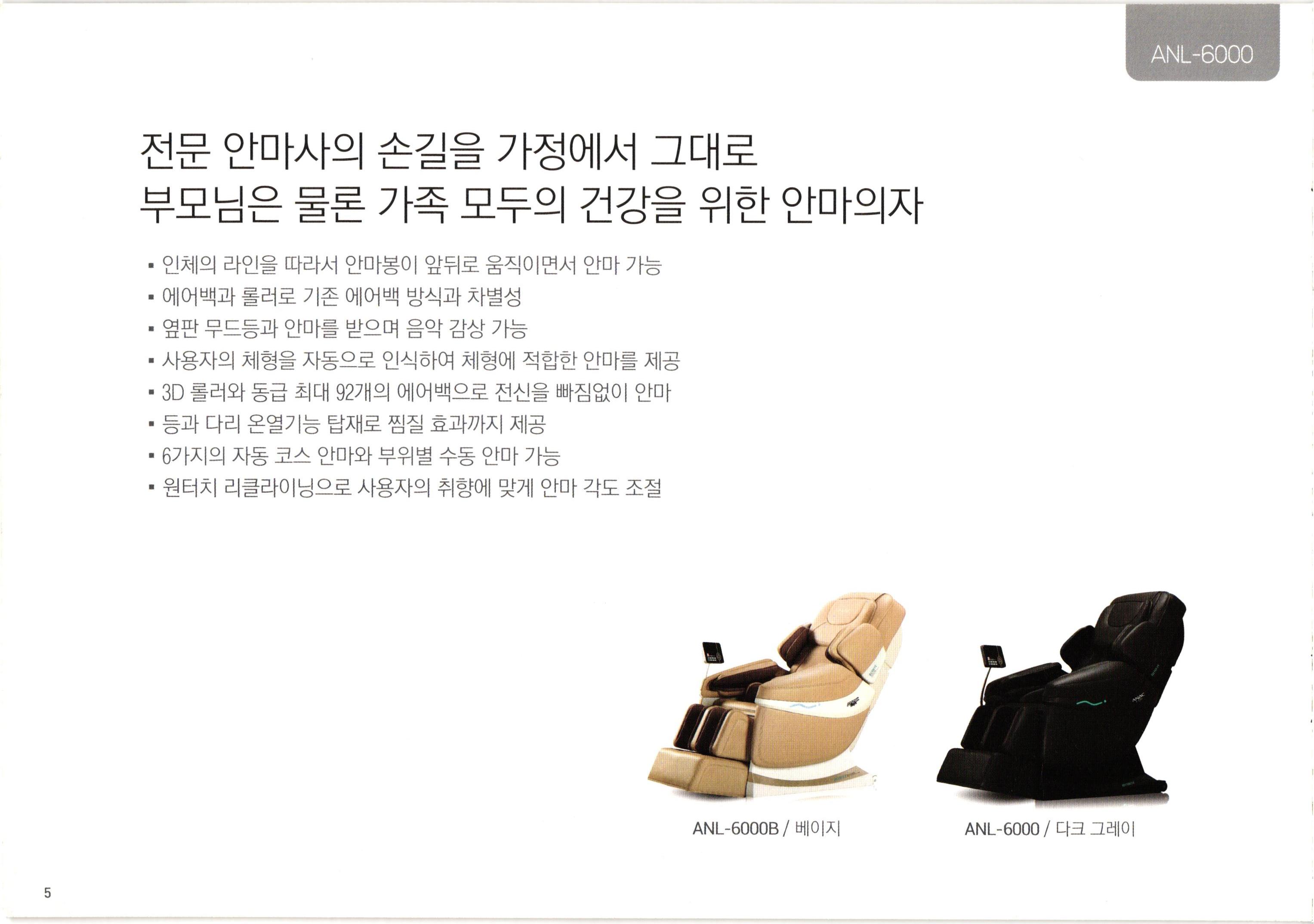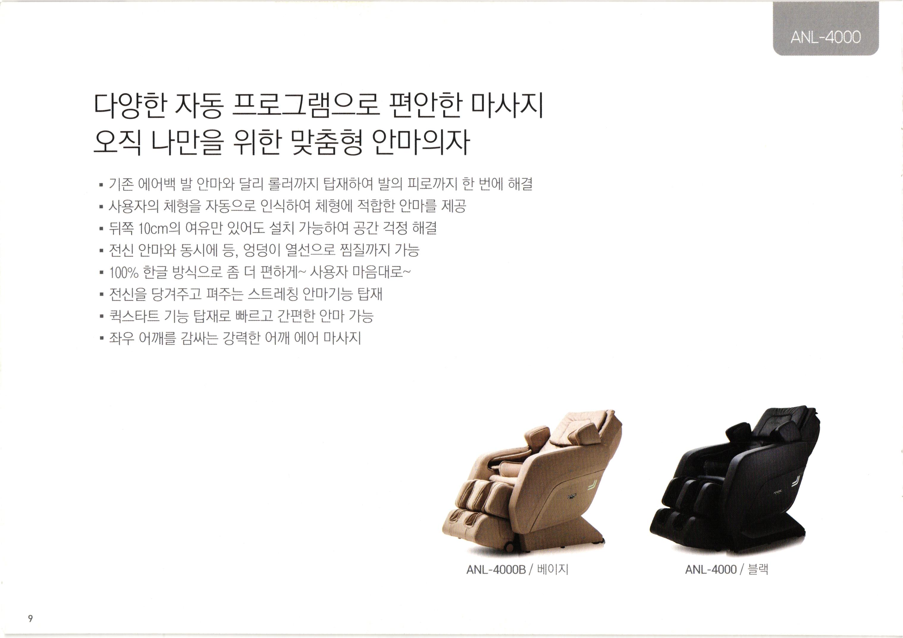 ANL-4000 inlina 다양한 자동 프로그램으로 편안한 마사지 오직 나만을 위한 맞춤형 안마의자 - 기존 에어백 발 안마와 달리 롤러까지 탑재하여 발의 피로까지 한 번에 해결 - 사용자의 체형을 자동으로 인식하여 체형에 적합한 안마를 제공 - 뒤쪽 10cm의 여유만 있어도 설치 가능하여 공간 걱정 해결 ■ 전신 안마와 동시에 등, 엉덩이 열선으로 찜질까지 가능 - 100% 한글 방식으로 좀 더 편하게~ 사용자 마음대로~ ■ 전신을 당겨주고 펴주는 스트레칭 안마기능 탑재 - 퀵스타트 기능 탑재로 빠르고 간편한 안마 가능 - 좌우 어깨를 감싸는 강력한 어깨 에어 마사지 ANL-4000B / HOLTI ANL-4000 / 블랙