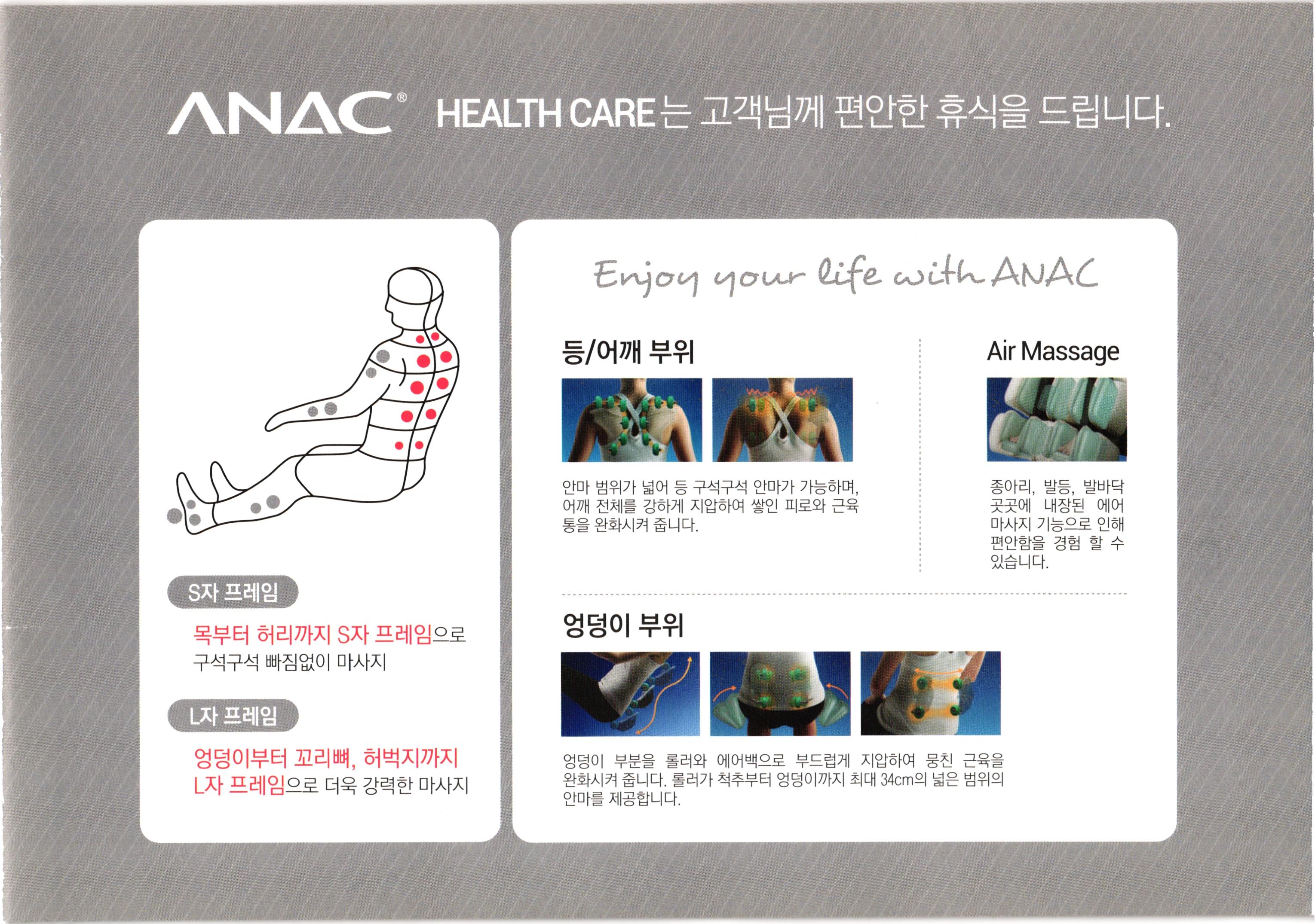 | 우리 가족의 피로, ANAC 안마의자가 해결해 드립니다. 당신을 위한 안마의자, 이런분들께 추천합니다. 온 몸 안 쑤신 곳이 없다는 부모님, 매일 야근에 지치는 남편, 입시와 취업 준비로 힘든 아들, 높은 힐에 다리가 혹사 당하는 딸, 반복되는 가사 노동에 시달리는 주부를 위해 ANAC 프리미엄 안마의자가 우리 가족의 피로를 날려 버립니다.