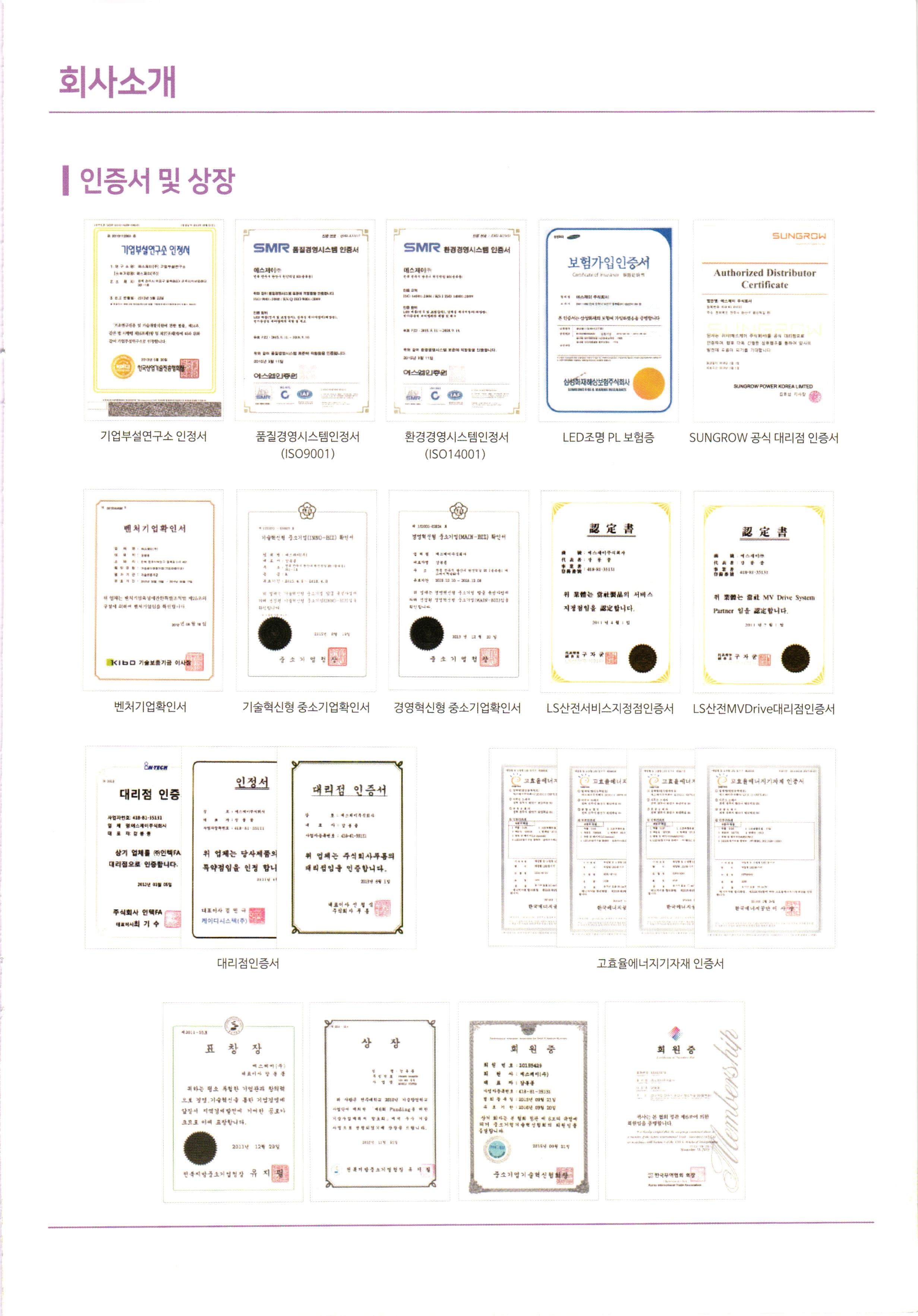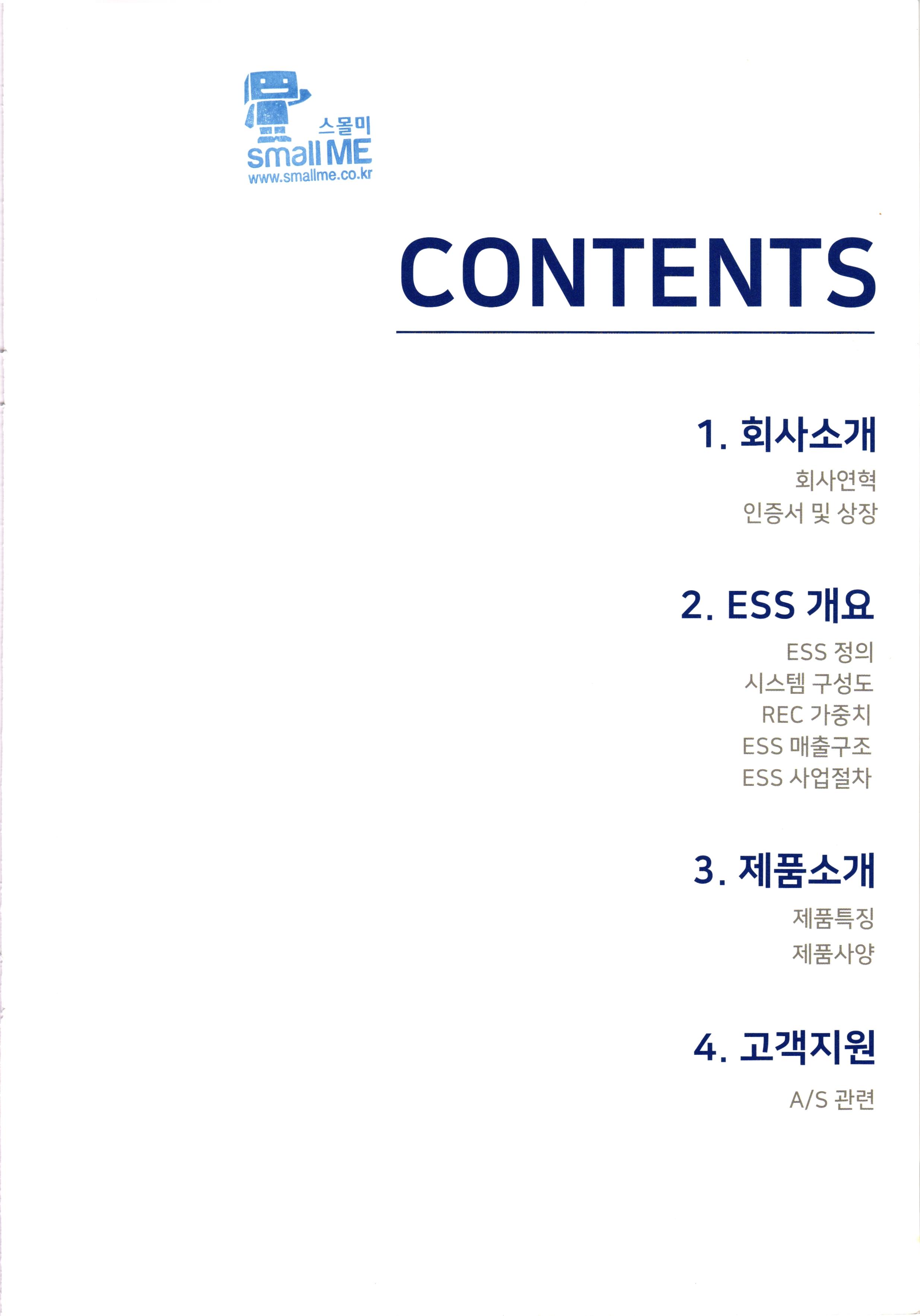 on 스몰미 small ME www.smallme.co.kr CONTENTS 1. 회사소개 회사연혁 인증서 및 상장 2. ESS 개요.. ESS 정의 시스템 구성도 | REC 가중치 ESS 매출구조 ESS 사업절차 3. 제품소개 제품특징 제품사양 4. 고객지원 A/S 관련 www Zu Elr NE chezy www www. CES The New Energy Partner TEL 1522-2221 E-mail sjis@sjcoltd.net www.sjcoltd.net