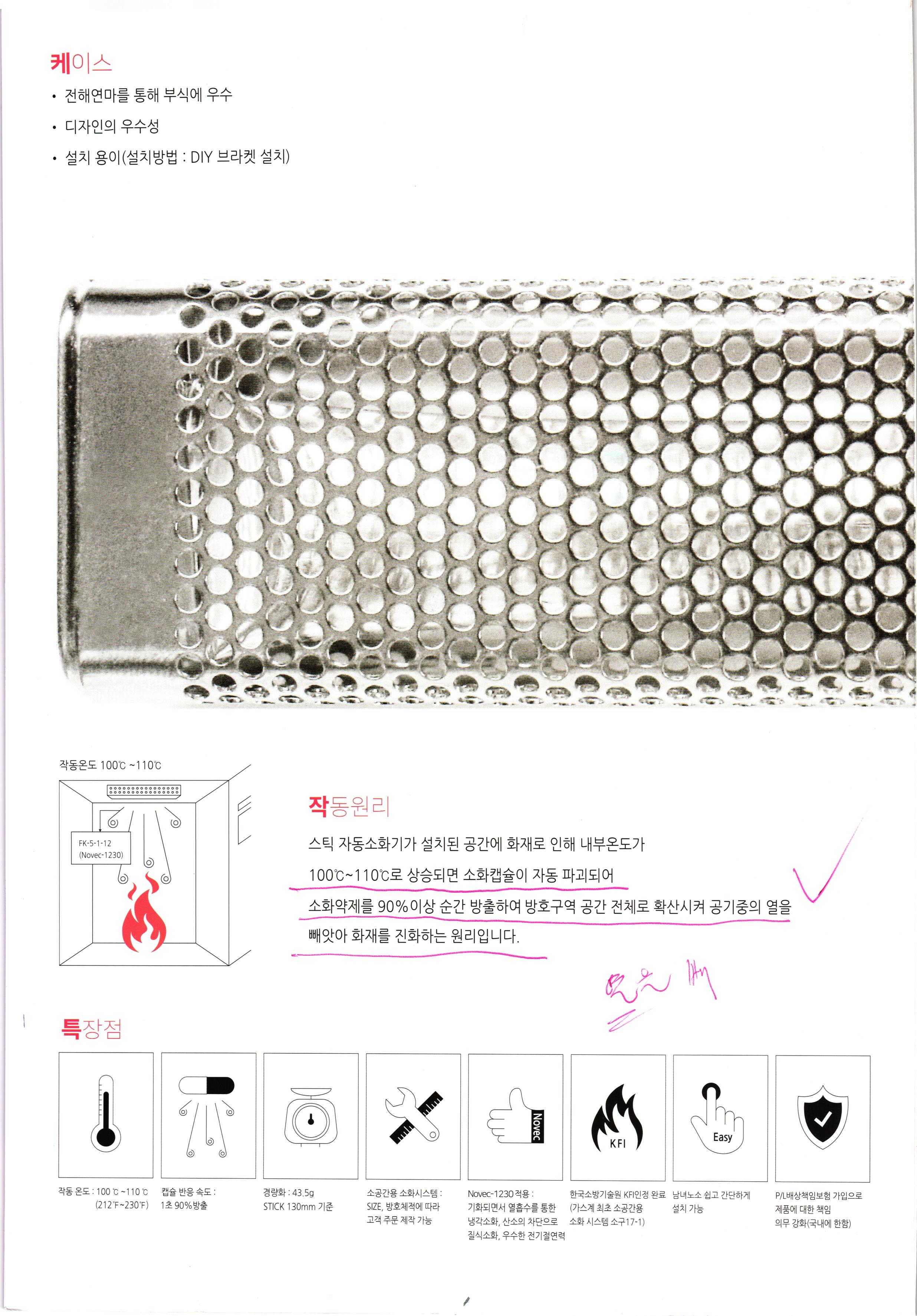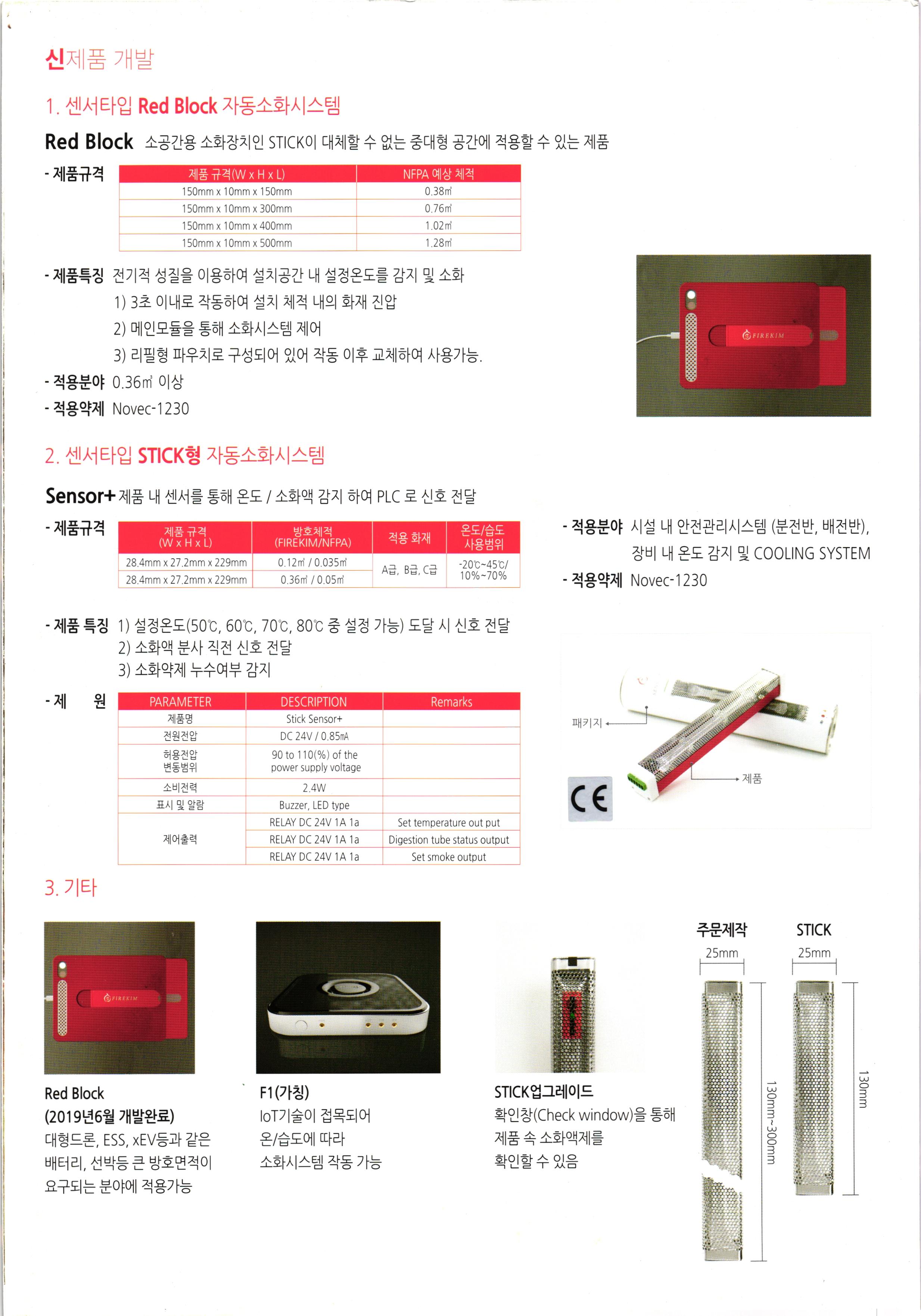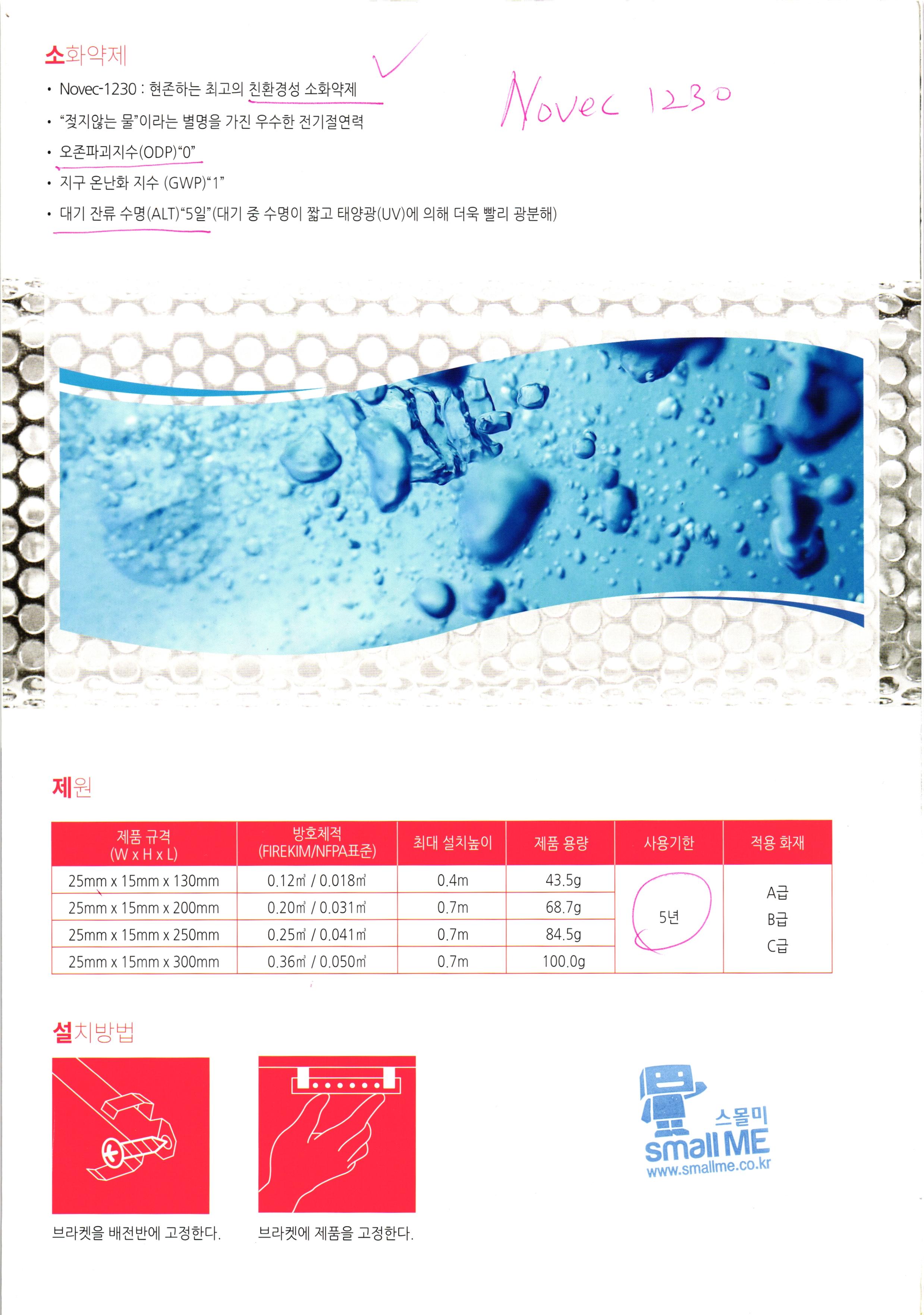 FIREKIM 자동 소화 시스템 " STICK' 기준의 소화 시스템입니다. FIREKIM "STICK”은 세상에서 가장 앞서가는 새로운 DESIGN AWARD 2019 | 스몰미 small ME www.smallme.co.kr @ FIRERIME 소화약제 • Novec-1230 : 현존하는 최고의 친환경성 소화약제 · “젖지않는 물”이라는 별명을 가진 우수한 전기절연력 · 오존파괴지수(ODP)“0” 1ec1230 • 지구 온난화 지수 (GWP)“1” · 대기 잔류 수명(ALT)“5일” (대기 중 수명이 짧고 태양광(UV)에 의해 더욱 빨리 광분해) 제원 제품 규격, (WxHxL) 방호체적 (FIREKIM/NFPAHZ) 최대 설치높이 제품 용량 | 사용기한 적용 화재 10.4m 43.5g 25mm x 15mm x 130mm | 25mm x 15mm x 200mm | | 25mm x 15mm x 250mm 25mm x 15mm x 300mm | 0.12m2 / 0.018m2 ) 0.20m / 0.031m2 | | 0.25m2 / 0.041m2 0.36m2 / 0.050m2 5년 10.7m 0.7m 10.7m 68.7g 84.5g 100.0g 급 급급 설치방법 1 스몰미 small ME www.smallme.co.kr 브라켓을 배전반에 고정한다. 브라켓에 제품을 고정한다.