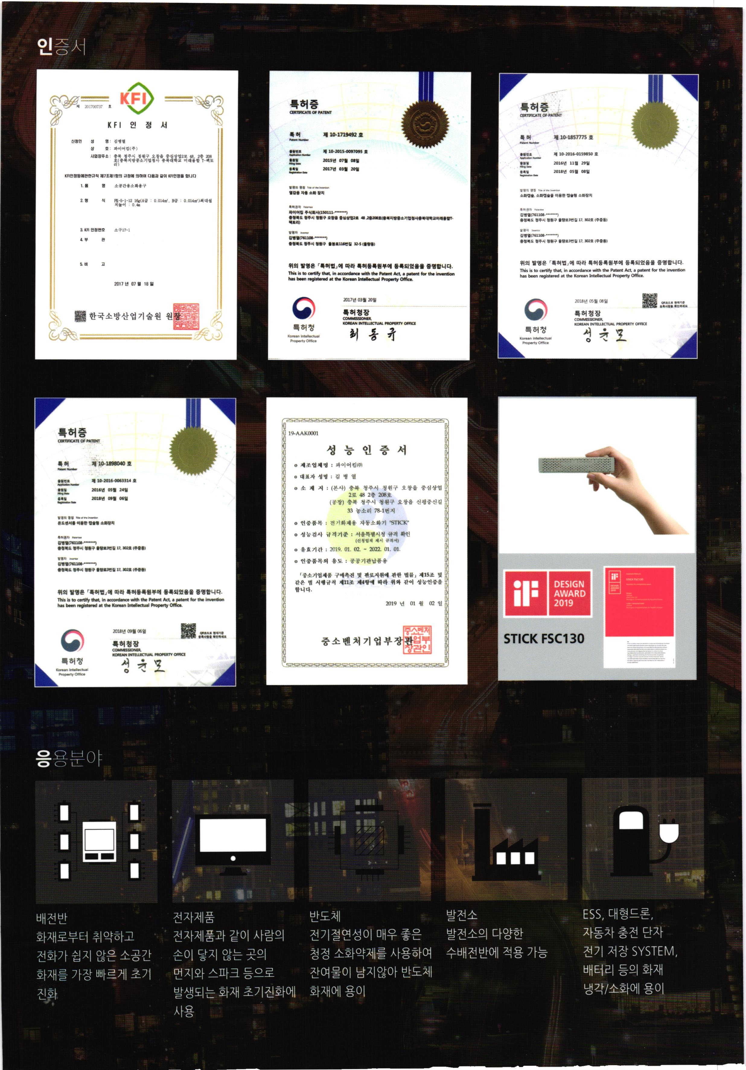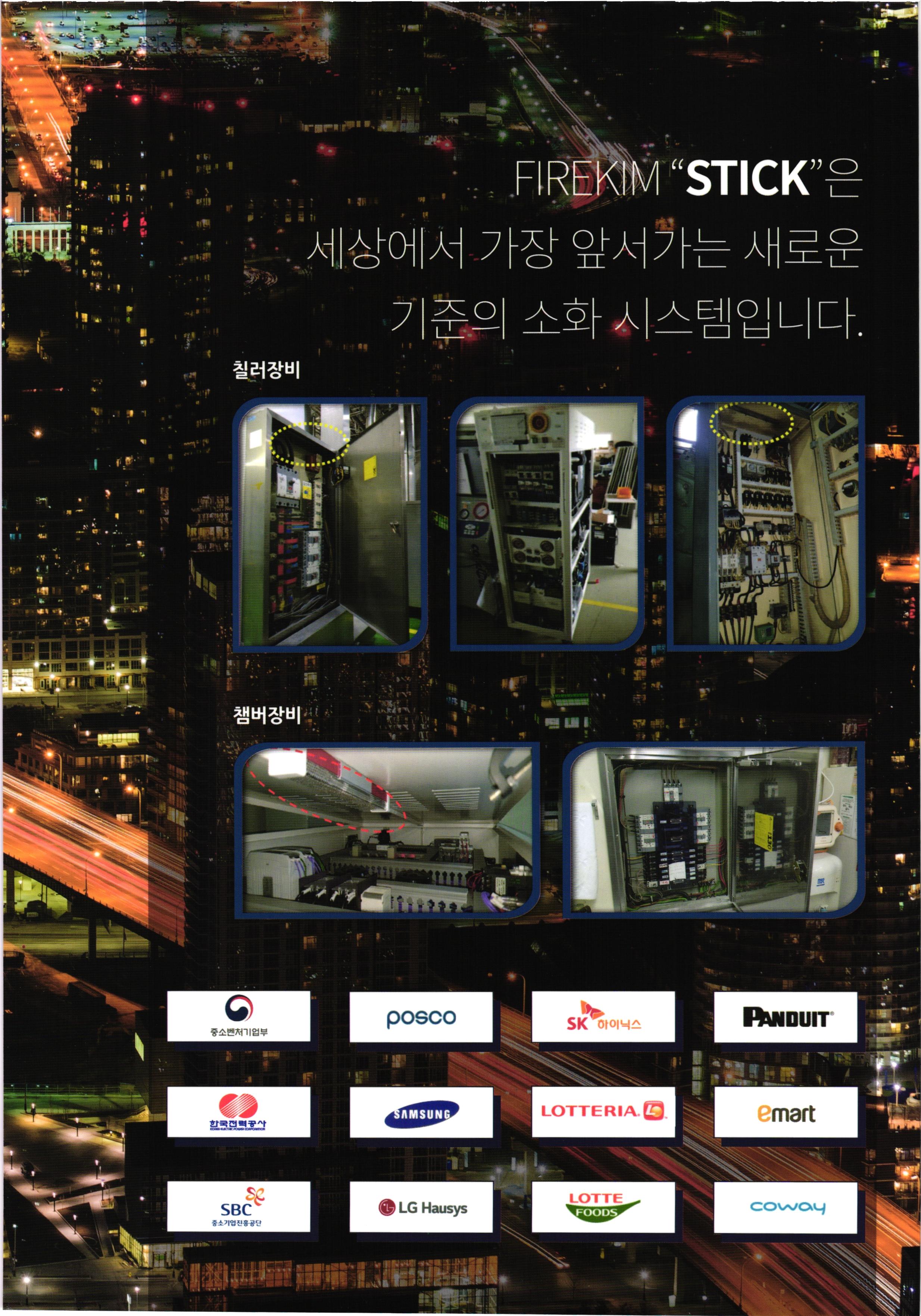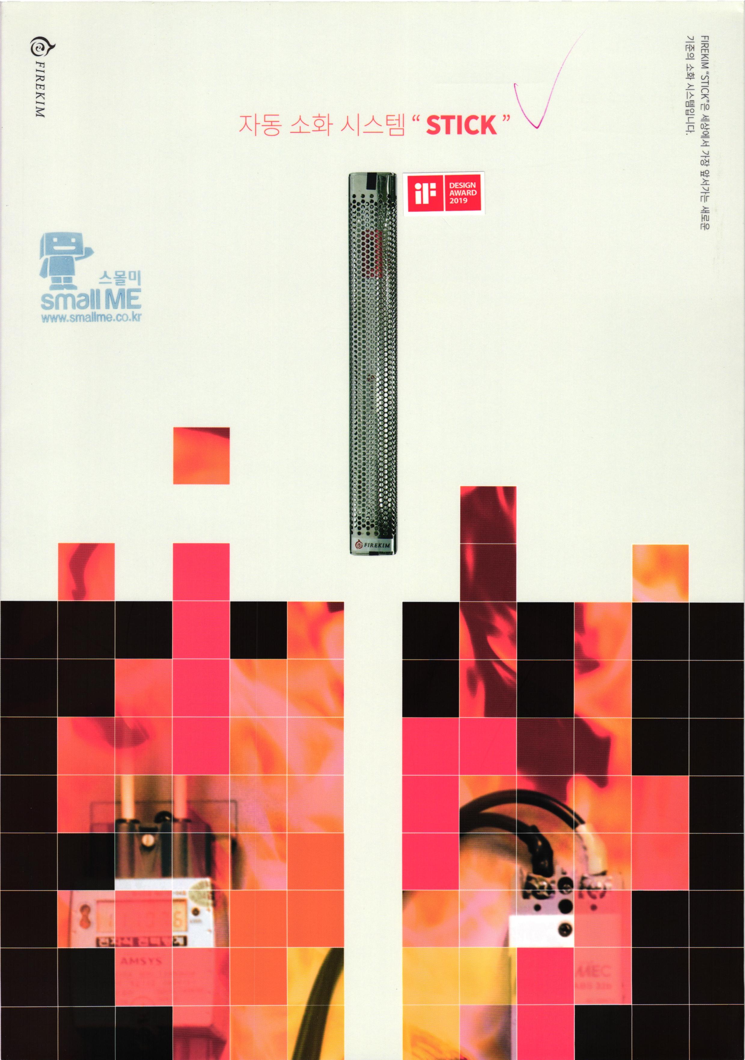 FIREKIM 자동 소화 시스템 " STICK' 기준의 소화 시스템입니다. FIREKIM "STICK”은 세상에서 가장 앞서가는 새로운 DESIGN AWARD 2019 | 스몰미 small ME www.smallme.co.kr @ FIRERIME 소화약제 • Novec-1230 : 현존하는 최고의 친환경성 소화약제 · “젖지않는 물”이라는 별명을 가진 우수한 전기절연력 · 오존파괴지수(ODP)“0” 1ec1230 • 지구 온난화 지수 (GWP)“1” · 대기 잔류 수명(ALT)“5일” (대기 중 수명이 짧고 태양광(UV)에 의해 더욱 빨리 광분해) 제원 제품 규격, (WxHxL) 방호체적 (FIREKIM/NFPAHZ) 최대 설치높이 제품 용량 | 사용기한 적용 화재 10.4m 43.5g 25mm x 15mm x 130mm | 25mm x 15mm x 200mm | | 25mm x 15mm x 250mm 25mm x 15mm x 300mm | 0.12m2 / 0.018m2 ) 0.20m / 0.031m2 | | 0.25m2 / 0.041m2 0.36m2 / 0.050m2 5년 10.7m 0.7m 10.7m 68.7g 84.5g 100.0g 급 급급 설치방법 1 스몰미 small ME www.smallme.co.kr 브라켓을 배전반에 고정한다. 브라켓에 제품을 고정한다.