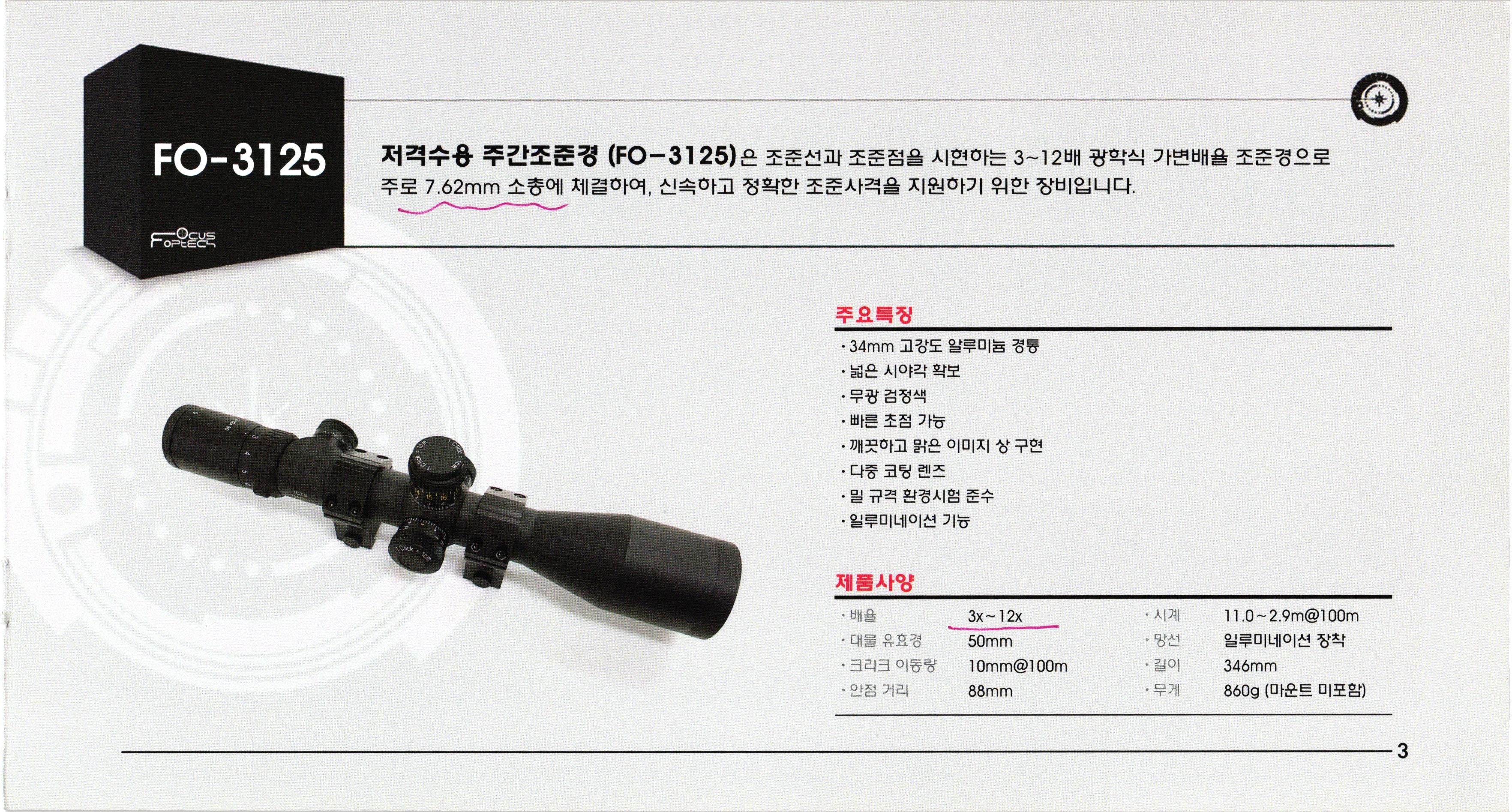 wowwowwanests needsoo N FO-3125 | 저격수용 주간조준경 (FO- 3125)은 조준선과 조준점을 시현하는 3~12배 광학식 가변배율 조준경으로 주로 7.62mm 소총에 체결하여, 신속하고 정확한 조준사격을 지원하기 위한 장비입니다. 주요특징 · 34mm 고강도 알루미늄 경통 · 넓은 시야각 확보 무광 검청색 빠른 초점 가능 ·깨끗하고 맑은 이미지 장 구현 ·다중 코팅 렌즈 ·밀 규격 환경시험 준수 · 일루미네이션 기능 WW 제품사양 · 배율 ・대물 유효경 ·크리크 이동량 ·안점 거리 3x~12x 50mm 10mm@100m 88mm · 시계 · 망전 길이 · 무게 : 11.0~2.9m@100m 일루미네이션 장착 346mm 8609 (마운트 미포함)
