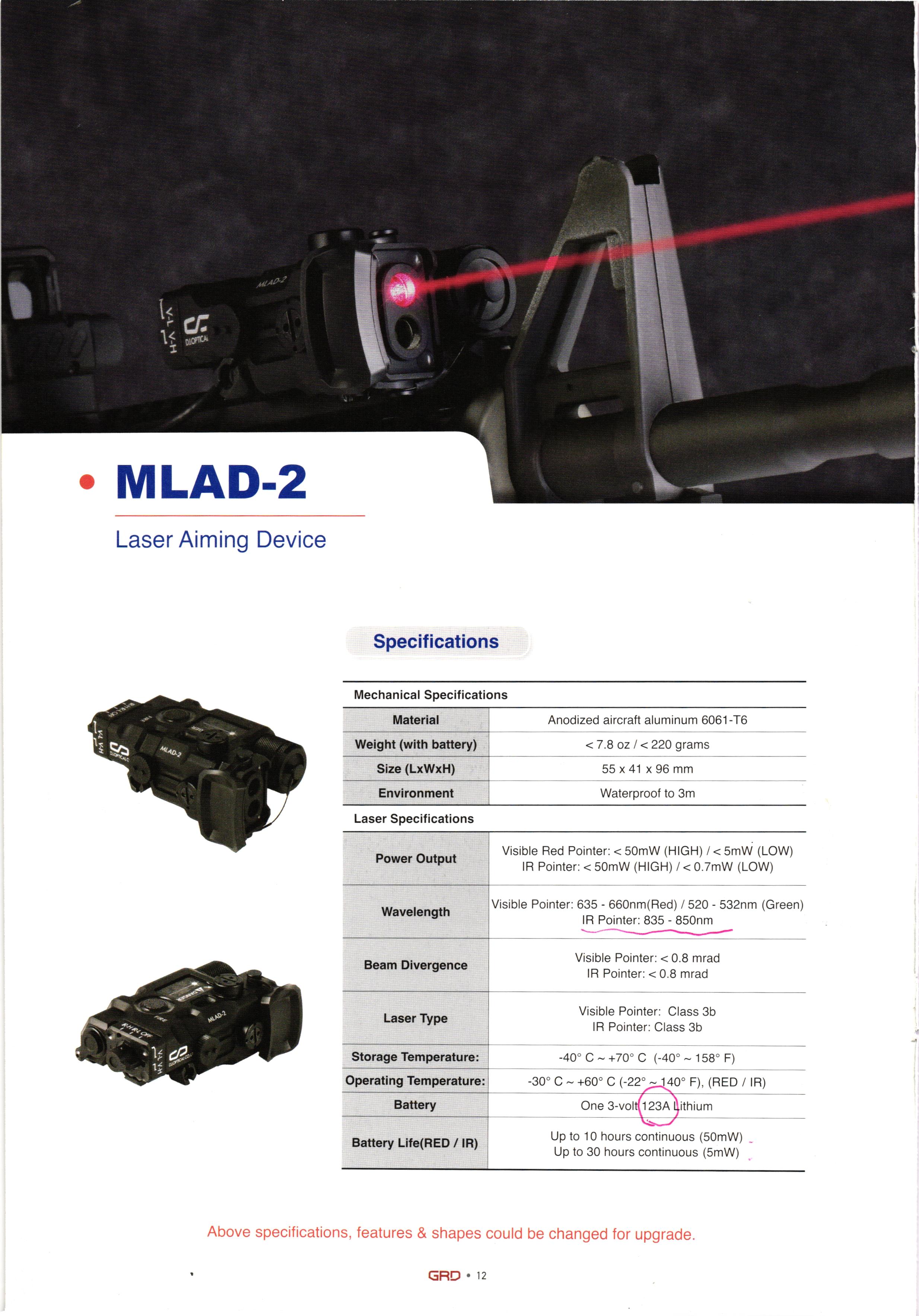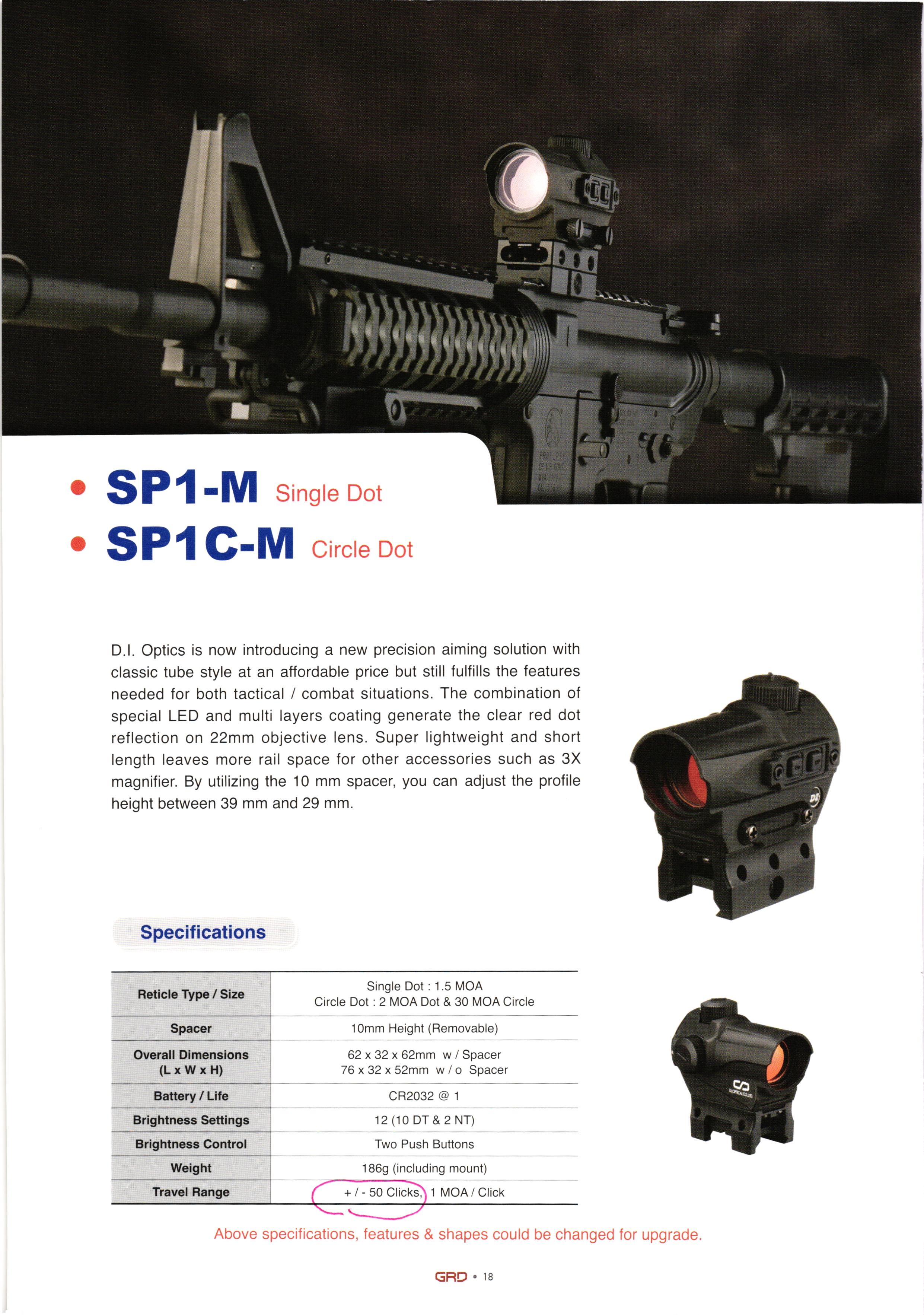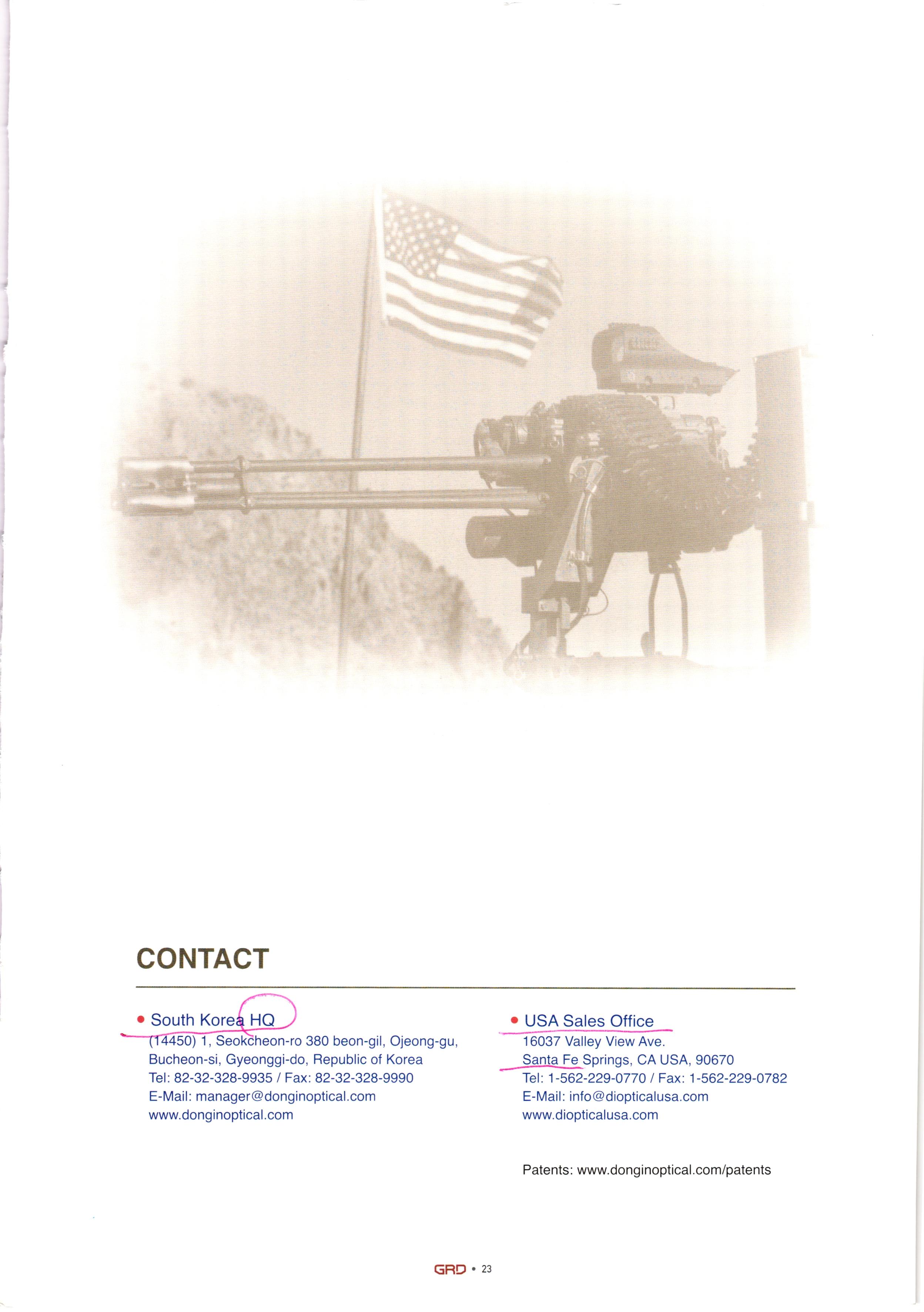www GRD IS A D.I. OPTICAL COMPANY. GRD D.I. OPTICAL has evolved into a defense venture company, marketing proprietary rifle and machine gun optics to the military and law enforcement sectors. D.I. OPTICAL sights are specially designed and built for use in the tactical area. Allowing for situational awareness, rapid target acquisition and target transition, without any degradation of accuracy. Der ww TE 4959 D.I. OPTICAL's machine gun optics features: Night Vision Device (NVD) compatible, wide field of view, ballistic compensation, unlimited eye relief with various levels of LED brightness control. D.I. OPTICAL continuously strive for making high-end quality products to the customers. WER WW OSBE ON Contents 1. Standard features of Machine Gun optics 2. Thermal Red Dot Sight for Machine Gun (DTS100) 3. Dot Sights for Machine Guns (DCL120, DCL110, DCL110AD-3X, DCL100, DCL401, DMK19) 4. Laser Aiming Device (MLAD-2) 5. Standard features on all AR Dot Sights 6. Dot Sights for Small Firearms (DCL30, DCL30C, DCL23, T3N, T3S, SP1-M, SP1C-M, ODL2A, MDS17, 3X-PID) 7. Operation Performance (Environmental Test) GRD • 2