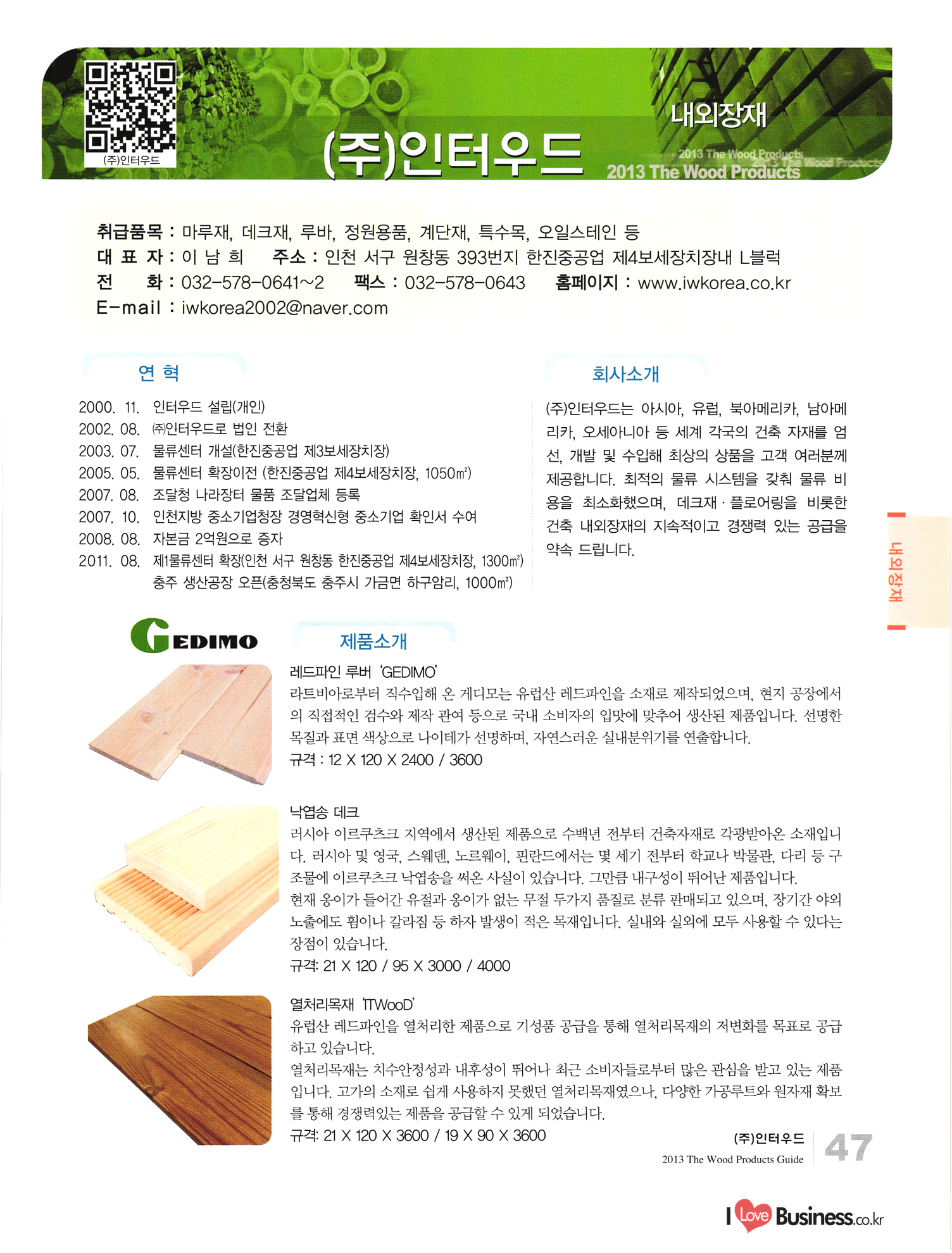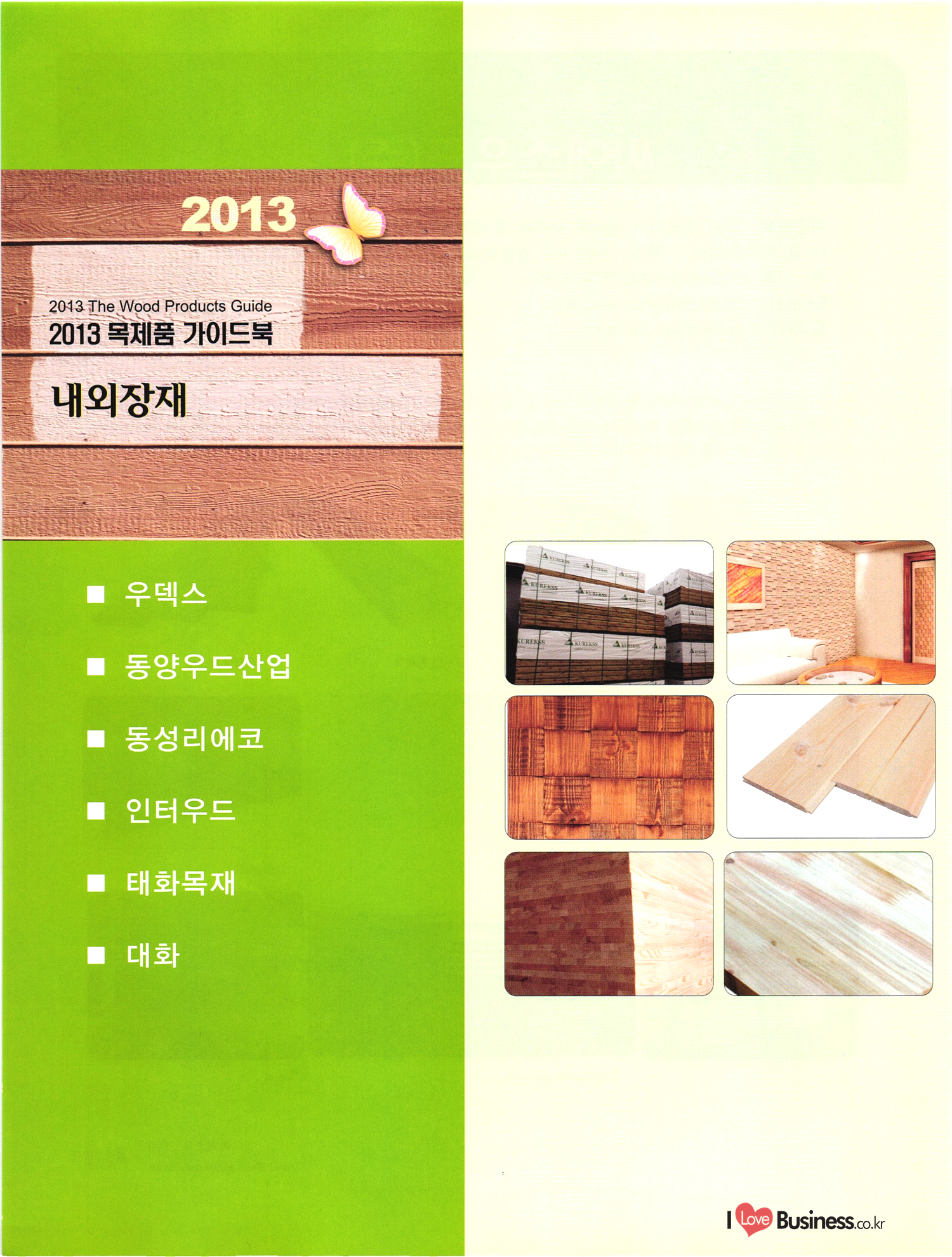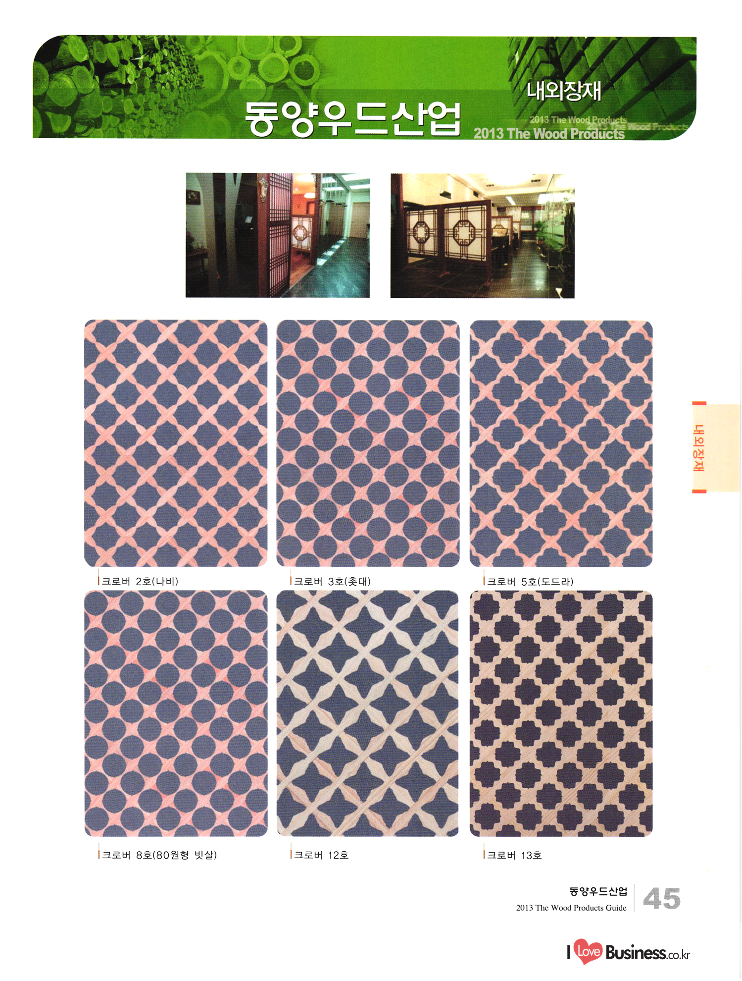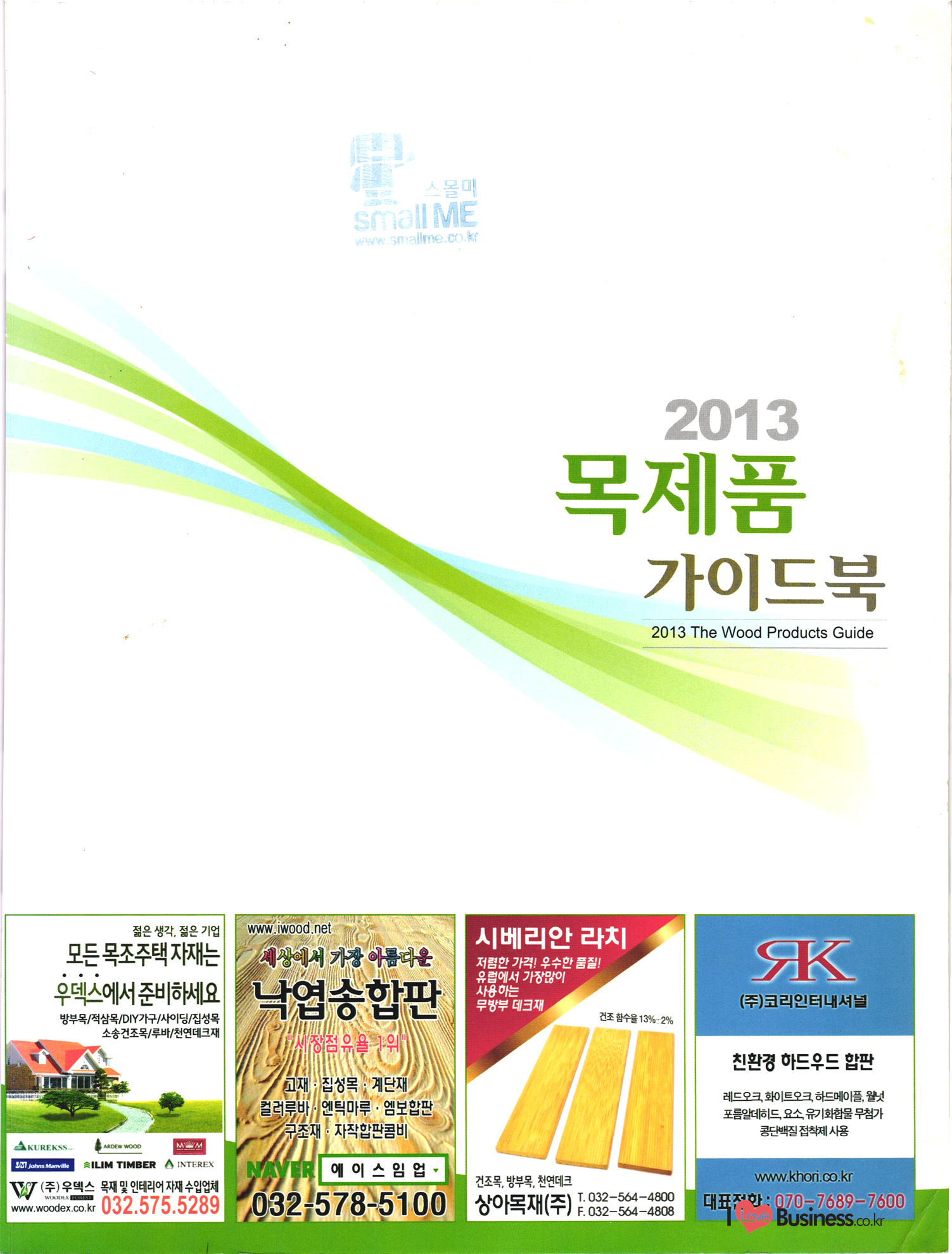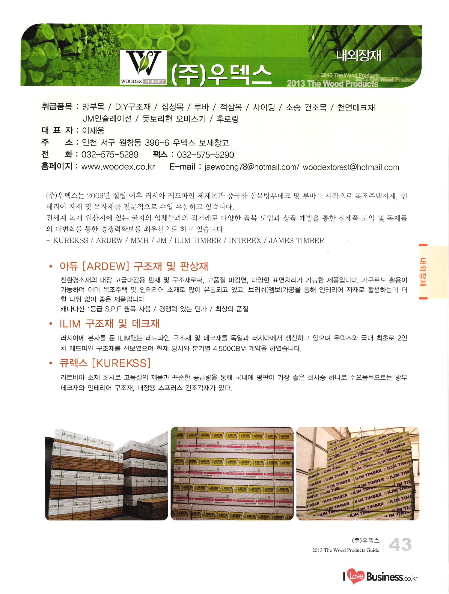 2013 목제품 가이드북 2013 The Wood Products Guide 젊은 생각, 젊은 기업 www.iwood.net 시베리안 라치 ЯК 모든 목조주택자재는 | 세상에서 가장 아름다운 우스에서 준비하세요 TIME 시장점유율 1위에 저렴한 가격! 우수한 품질! 유럽에서 가장많이 사용하는 무방부 데크재 건조 함수율 13% 2% (주)코리인터내셔널 방부목 적삼목/DIY가구/사이딩/집성목 소송건조목/루바/천연데크재 친환경 하드우드 합판 레드오크 화이트오크 하드메이플, 월넛 포름알데히드, 요소 유기화합물 무첨가 콩단백질 접착제 사용 고재 · 집정복 · 계단재 컬려루바 · 엔틱마루 · 엠보합판 구조재 · 자작합판콤비 NAVTR) 에 이 스 임 업 , 건조목, 방부목, 천연데크 032-578-5100 | 상아목재(주) : 032-564-4808 AKUREKSS ARDEW WOOD MWM ILIM TIMBER INTEREX VIT (주) 우덱스 목재 및 인테리어 자재 수입업체 www.woodex.co.kr 032.575.5289 IM Johns Manville WOODEX www.khori.co.kr 대표전하 : 070-7689-7600 C.