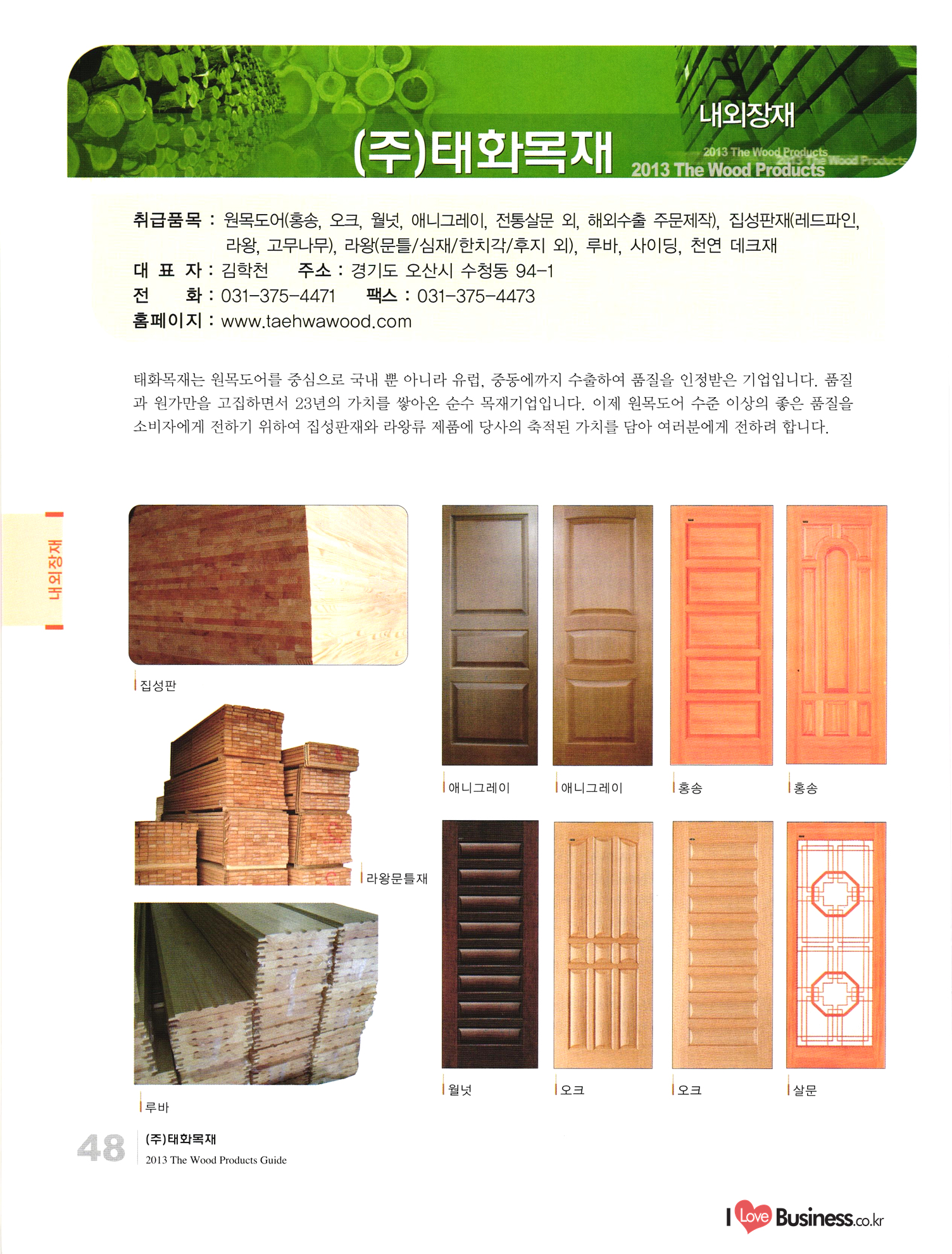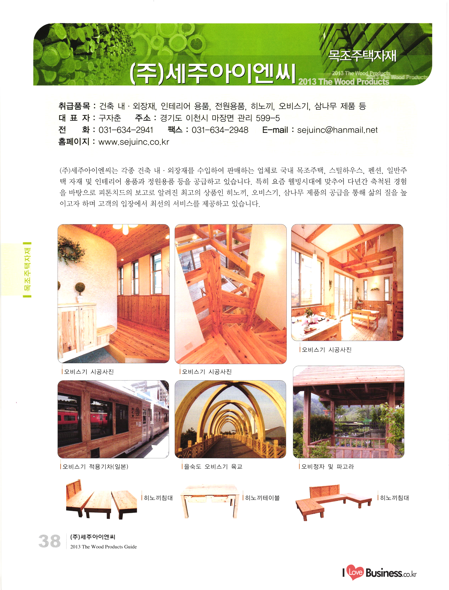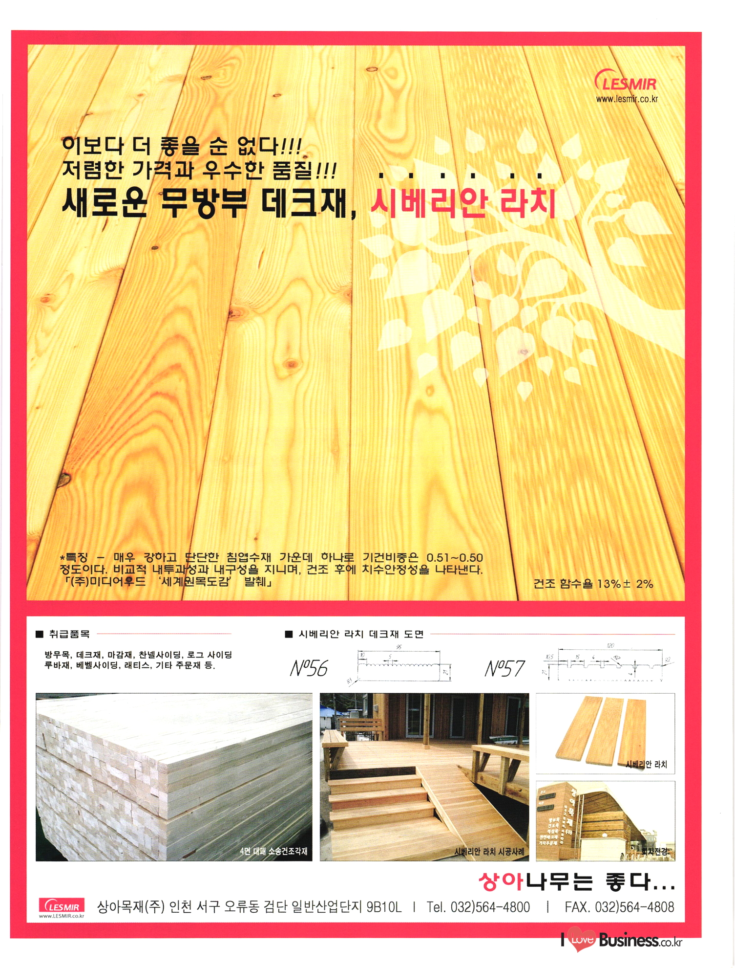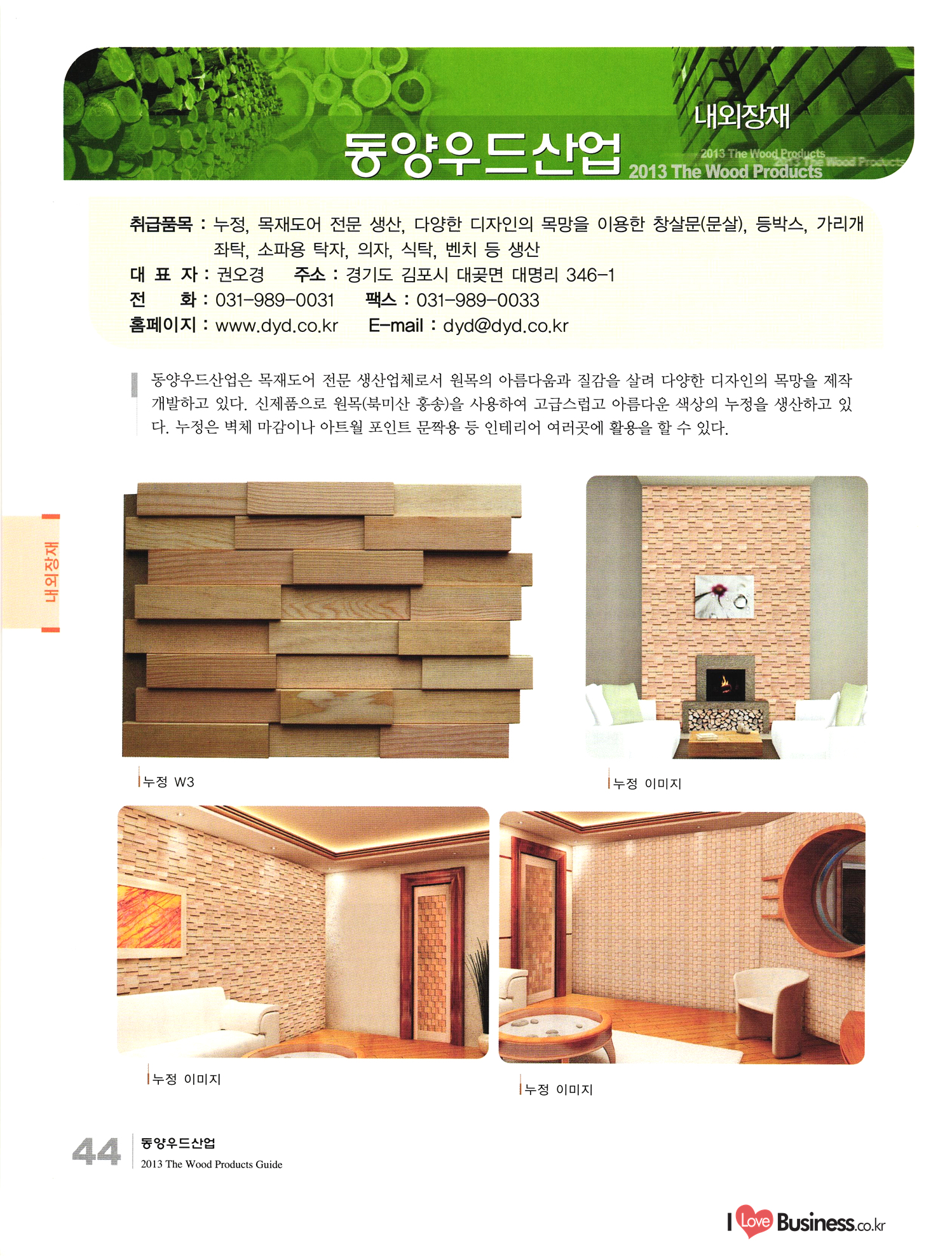 2013 목제품 가이드북 2013 The Wood Products Guide 젊은 생각, 젊은 기업 www.iwood.net 시베리안 라치 ЯК 모든 목조주택자재는 | 세상에서 가장 아름다운 우스에서 준비하세요 TIME 시장점유율 1위에 저렴한 가격! 우수한 품질! 유럽에서 가장많이 사용하는 무방부 데크재 건조 함수율 13% 2% (주)코리인터내셔널 방부목 적삼목/DIY가구/사이딩/집성목 소송건조목/루바/천연데크재 친환경 하드우드 합판 레드오크 화이트오크 하드메이플, 월넛 포름알데히드, 요소 유기화합물 무첨가 콩단백질 접착제 사용 고재 · 집정복 · 계단재 컬려루바 · 엔틱마루 · 엠보합판 구조재 · 자작합판콤비 NAVTR) 에 이 스 임 업 , 건조목, 방부목, 천연데크 032-578-5100 | 상아목재(주) : 032-564-4808 AKUREKSS ARDEW WOOD MWM ILIM TIMBER INTEREX VIT (주) 우덱스 목재 및 인테리어 자재 수입업체 www.woodex.co.kr 032.575.5289 IM Johns Manville WOODEX www.khori.co.kr 대표전하 : 070-7689-7600 C.