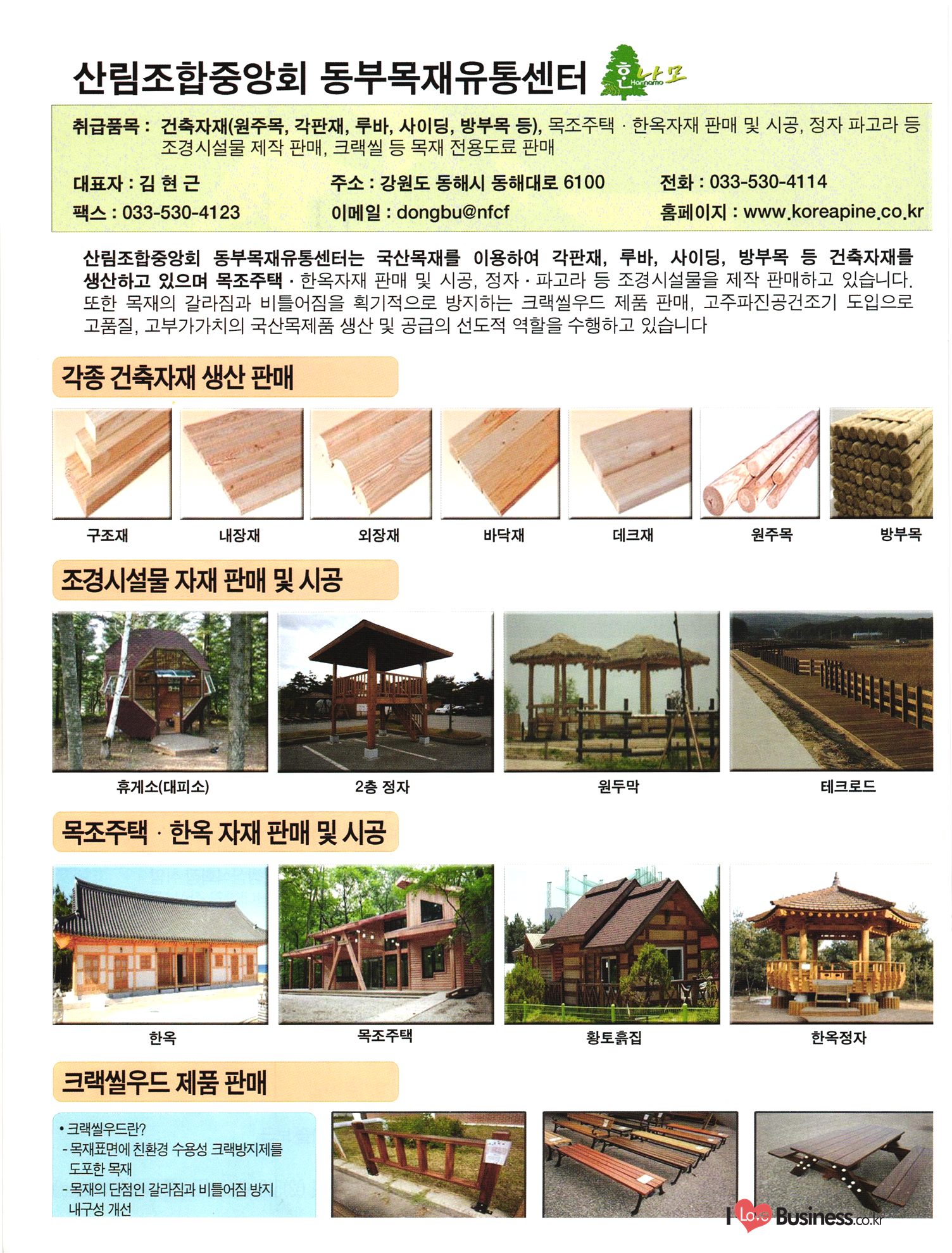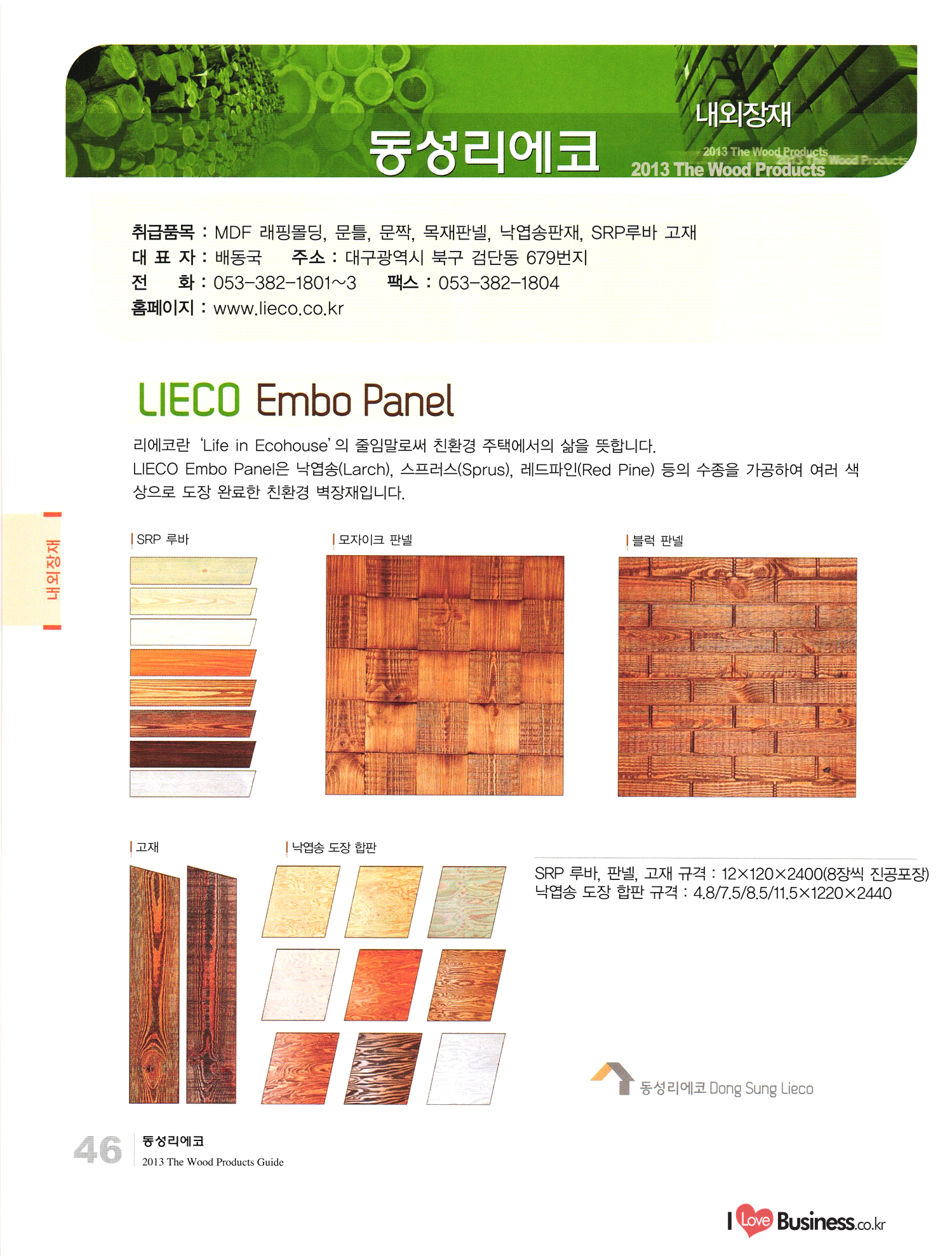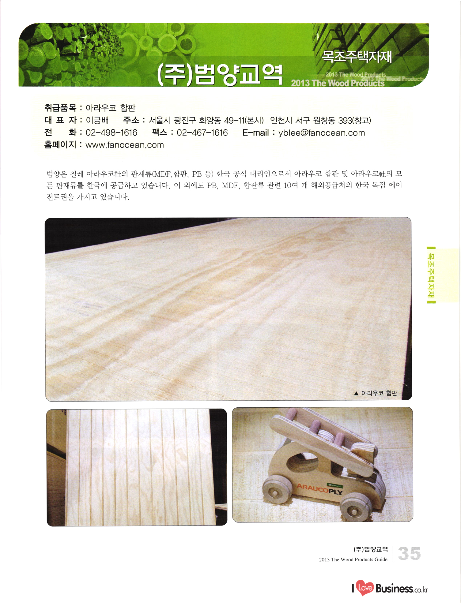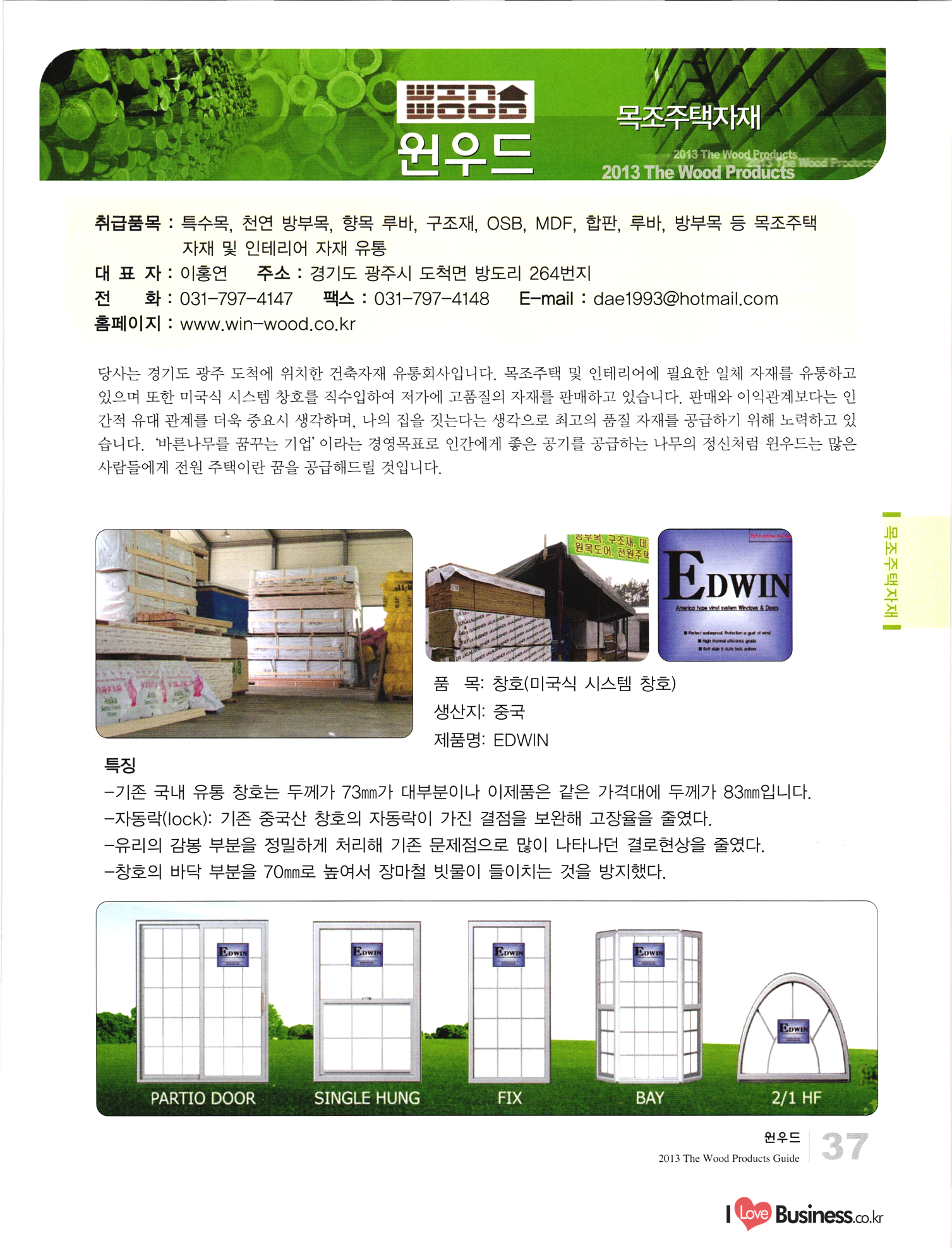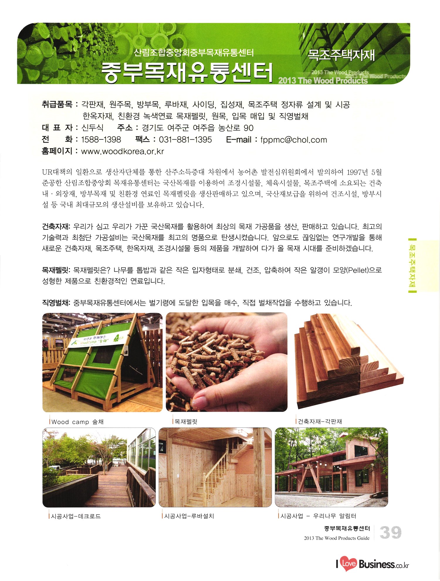 2013 목제품 가이드북 2013 The Wood Products Guide 젊은 생각, 젊은 기업 www.iwood.net 시베리안 라치 ЯК 모든 목조주택자재는 | 세상에서 가장 아름다운 우스에서 준비하세요 TIME 시장점유율 1위에 저렴한 가격! 우수한 품질! 유럽에서 가장많이 사용하는 무방부 데크재 건조 함수율 13% 2% (주)코리인터내셔널 방부목 적삼목/DIY가구/사이딩/집성목 소송건조목/루바/천연데크재 친환경 하드우드 합판 레드오크 화이트오크 하드메이플, 월넛 포름알데히드, 요소 유기화합물 무첨가 콩단백질 접착제 사용 고재 · 집정복 · 계단재 컬려루바 · 엔틱마루 · 엠보합판 구조재 · 자작합판콤비 NAVTR) 에 이 스 임 업 , 건조목, 방부목, 천연데크 032-578-5100 | 상아목재(주) : 032-564-4808 AKUREKSS ARDEW WOOD MWM ILIM TIMBER INTEREX VIT (주) 우덱스 목재 및 인테리어 자재 수입업체 www.woodex.co.kr 032.575.5289 IM Johns Manville WOODEX www.khori.co.kr 대표전하 : 070-7689-7600 C.